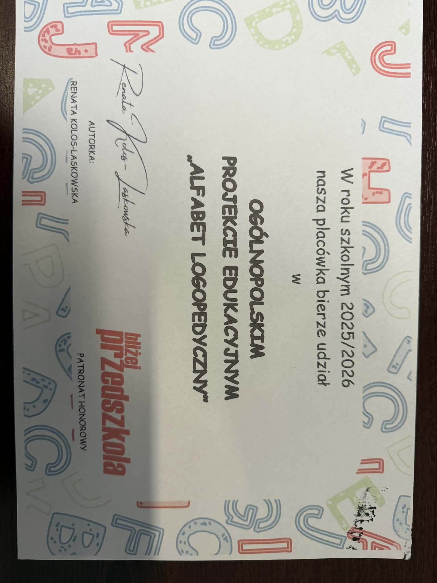 W grupie I, II oraz III w oddziale zlokalizowanym przy ulicy Jana Zamoyskiego 1 w Kutnie w roku szkolnym 2025/2026 w ramach profilaktyki logopedycznej będzie realizowany Ogólnopolski Projekt Edukacyjny "Alfabet Logopedyczny" autorstwa mgr Renaty Kolos - Laskowskiej. Głównym celem projektu jest dbanie o właściwą stymulację rozwoju mowy oraz wdrażanie profilaktyki logopedycznej. W ramach realizacji projektu będą prowadzone zadania wpływające na podniesienie sprawności aparatu artykulacyjnego, usprawnianie aparatu oddechowego, poszerzanie słownictwa czynnego i biernego, ćwiczenie umiejętności rozumienia, uwagi słuchowej oraz koncentracji na wykonywanym zadaniu, rozwijanie słuchu fonematycznego, poczucia rytmu, podnoszenie sprawności w zakresie motoryki, doskonalenie percepcji i pamięci słuchowej, kształcenie wrażliwości słuchowej.