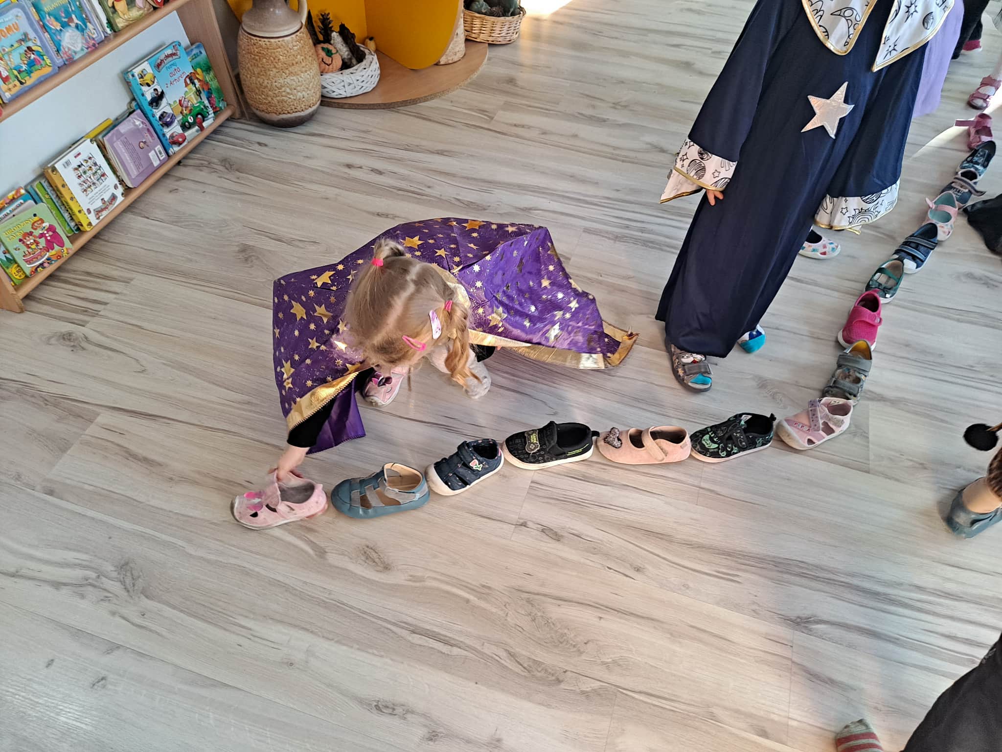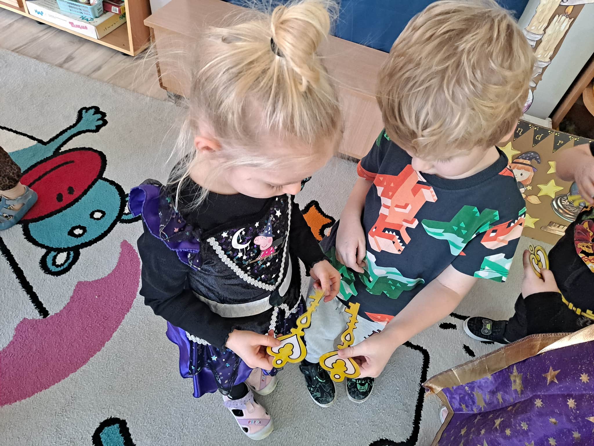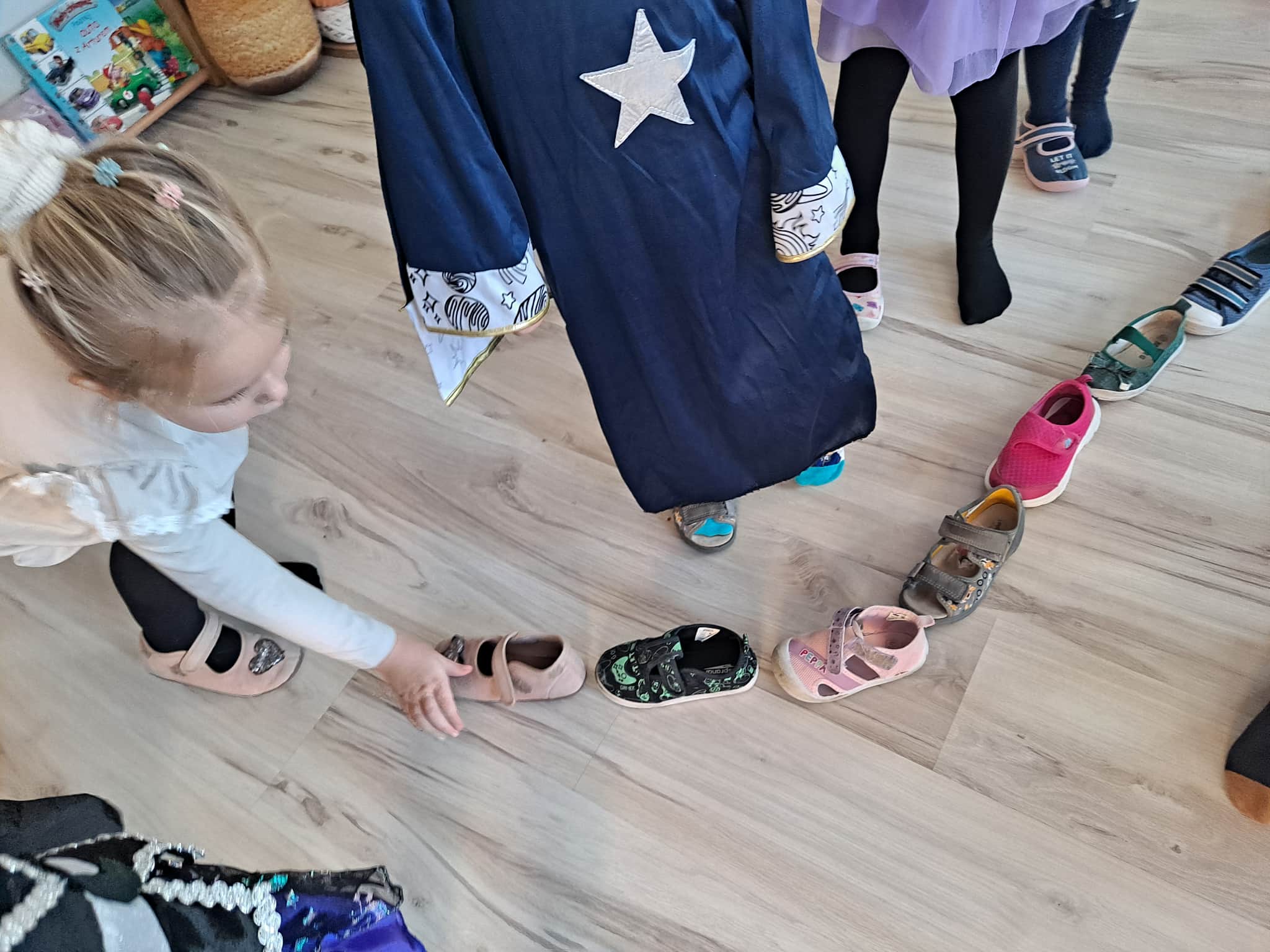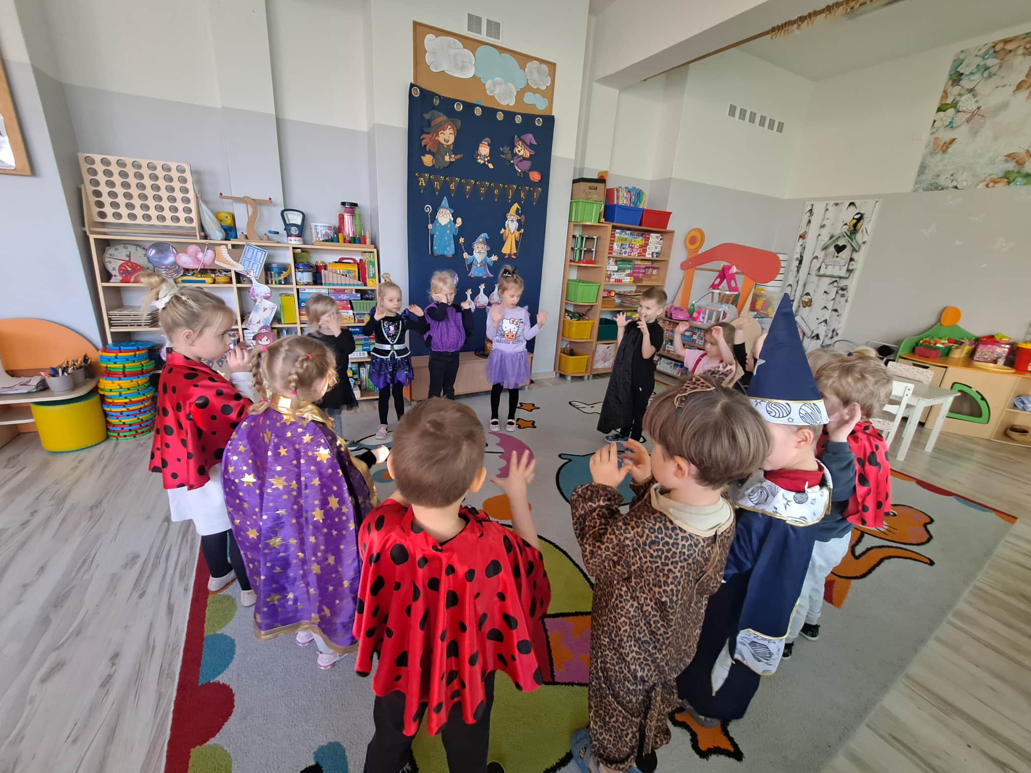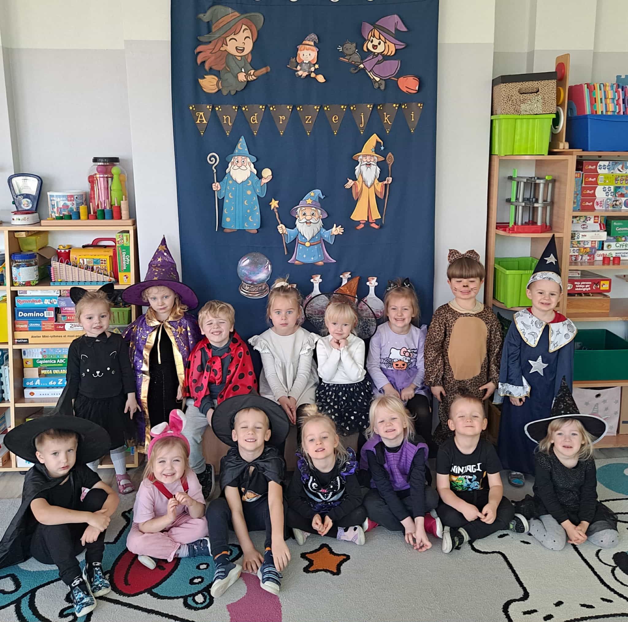 Dzieci przyszły przebrane za czarodziei i czarownice, dzięki czemu już od rana w sali unosił się wyjątkowy, bajkowy klimat. Spotkanie rozpoczęliśmy od krótkiego filmu edukacyjnego, z którego przedszkolaki dowiedziały się, czym są Andrzejki, skąd wzięła się ta tradycja oraz jakie zwyczaje jej towarzyszą.