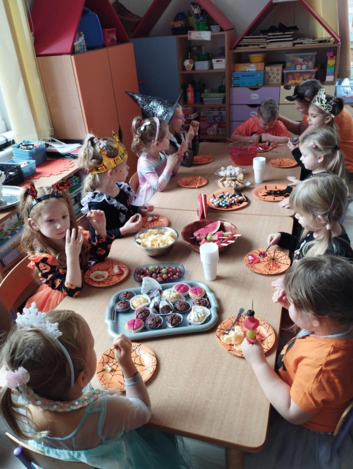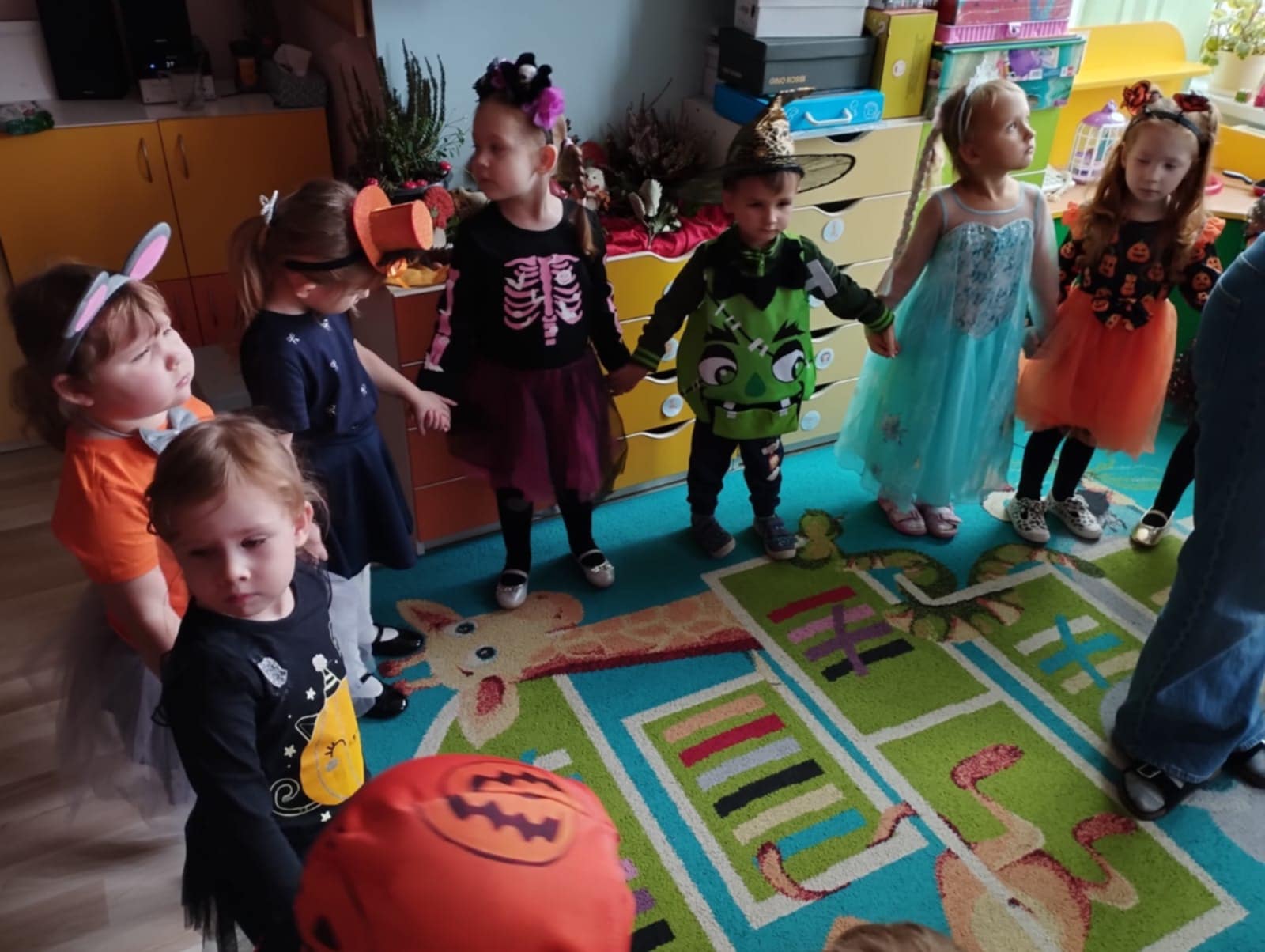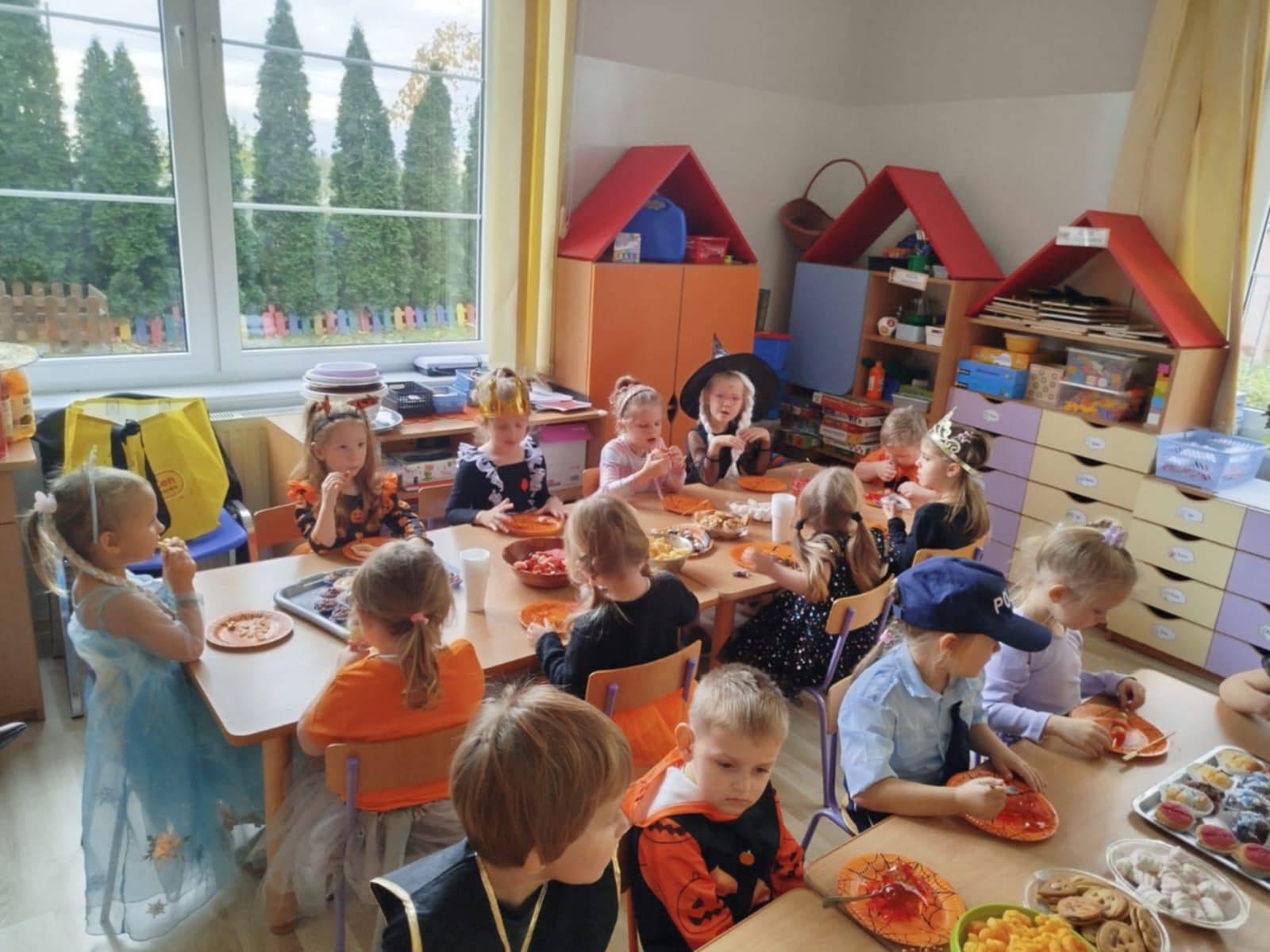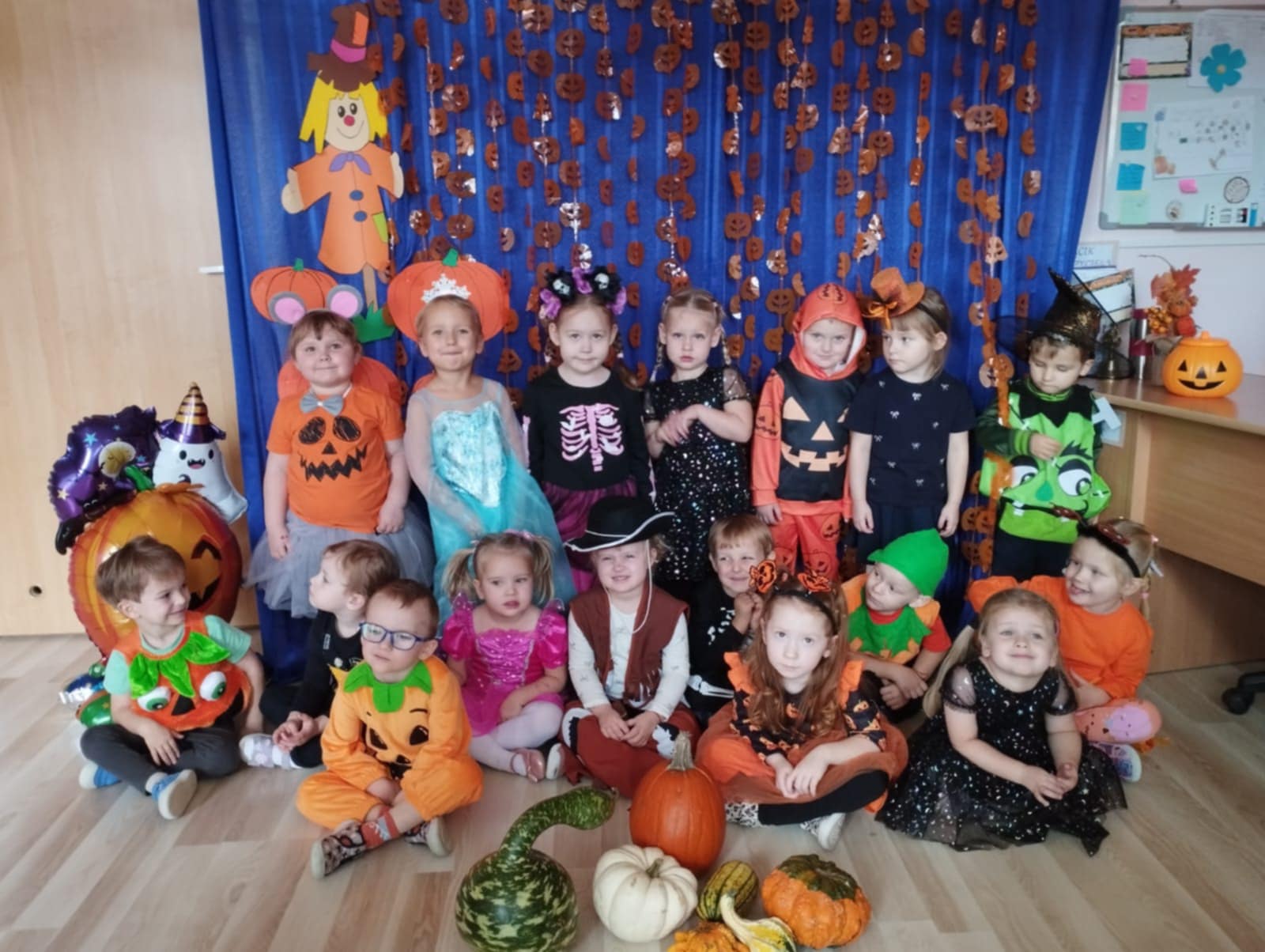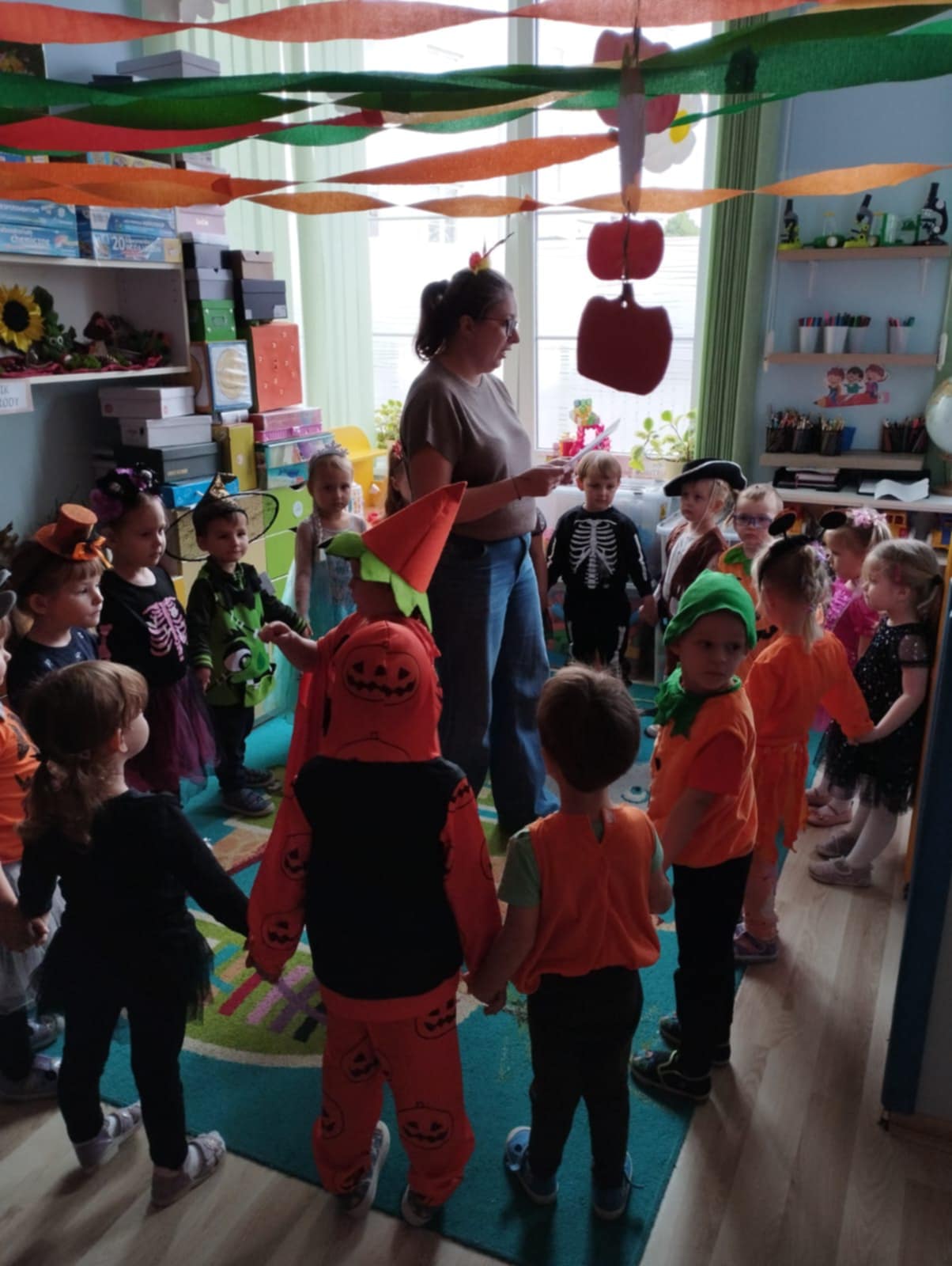 Bal Dyniowy to wspaniała okazja do świętowania jesieni. Dzieci przebrane w kolorowe stroje z uśmiechem pląsały do tanecznej muzyki i rozwiązywały jesienne zagadki z wykorzystaniem tablicy multimedialnej. Dzień wypełniony był wesołą zabawą, a słodki poczęstunek był okazją do integracji grup.