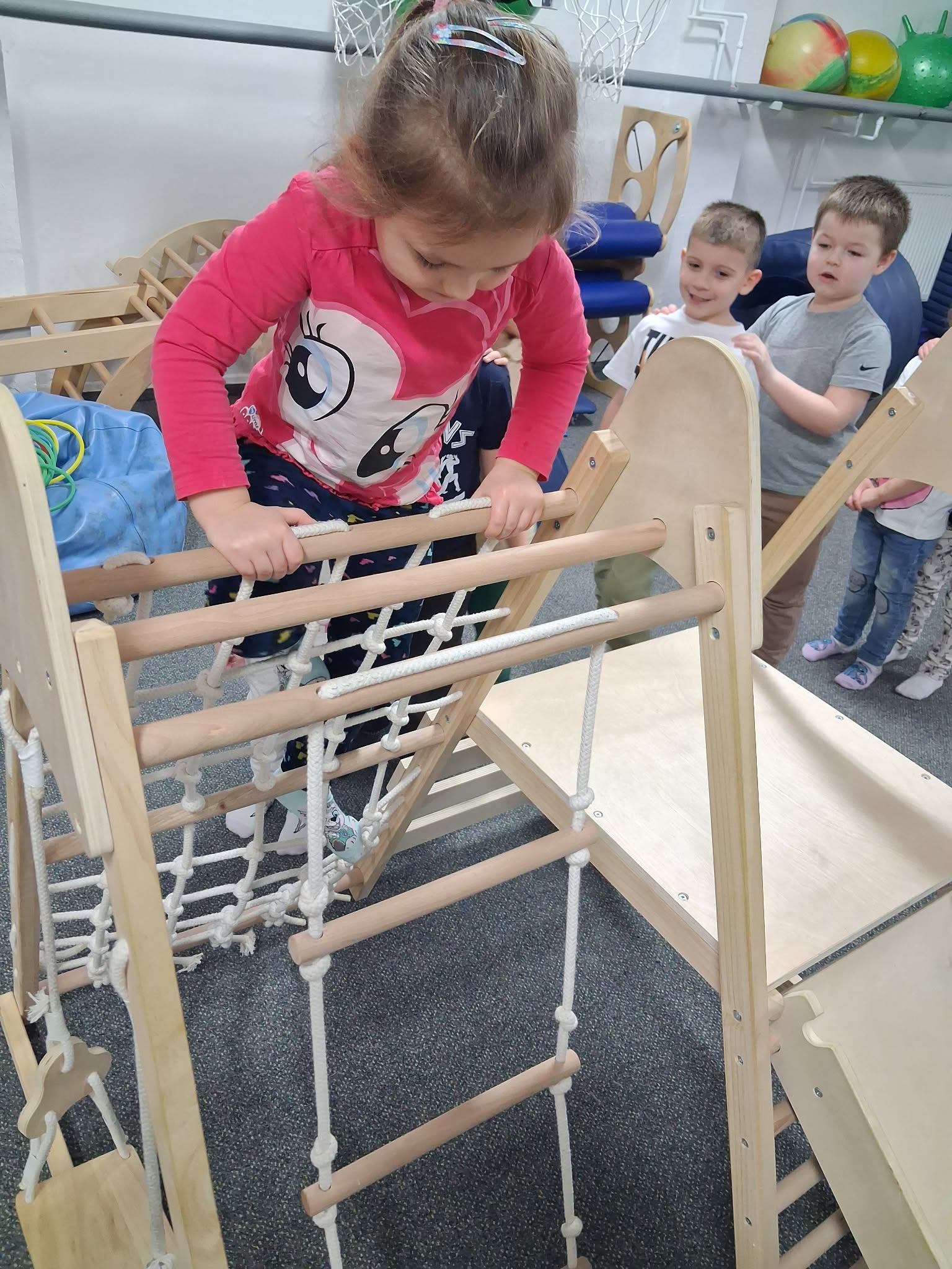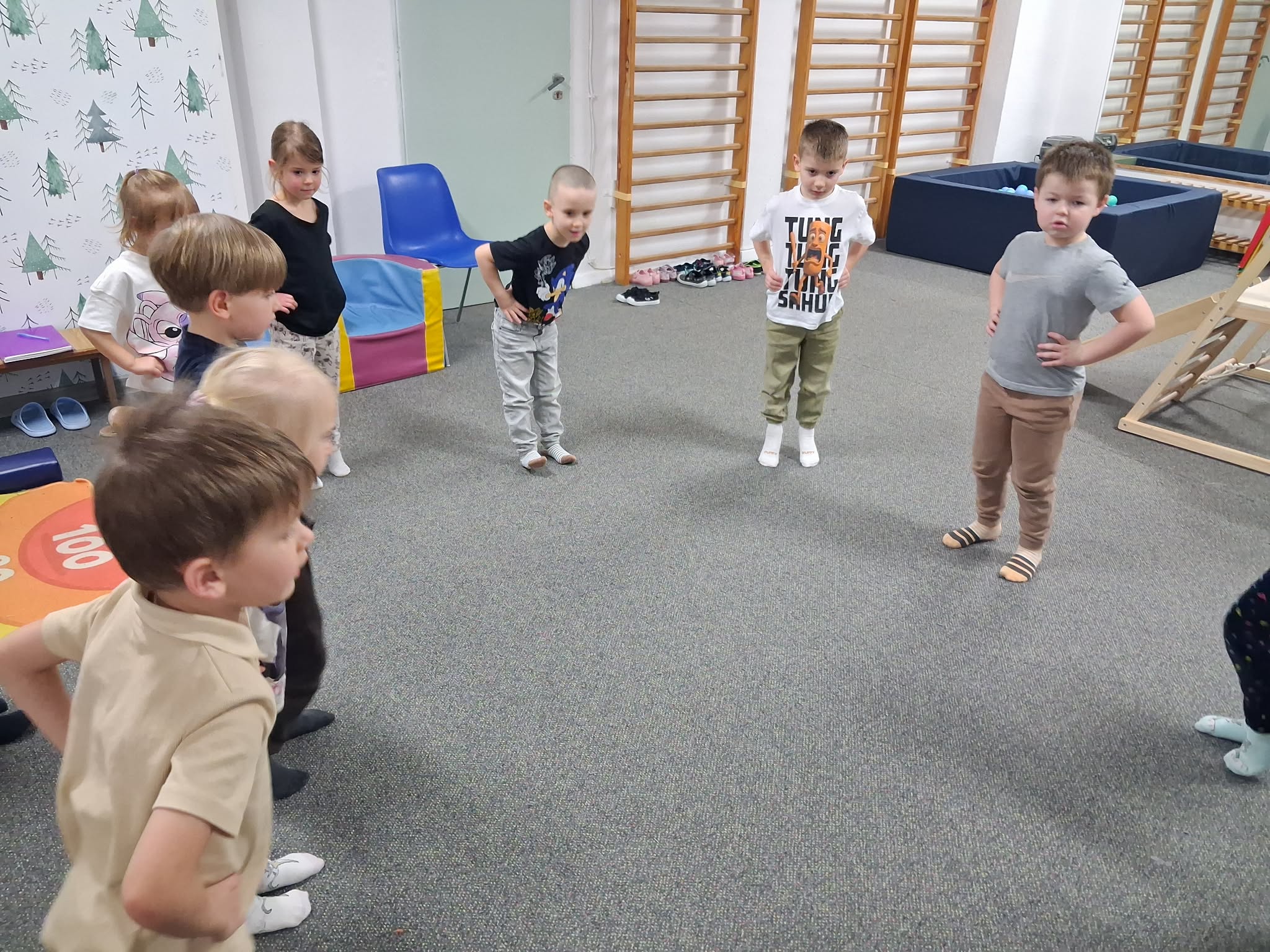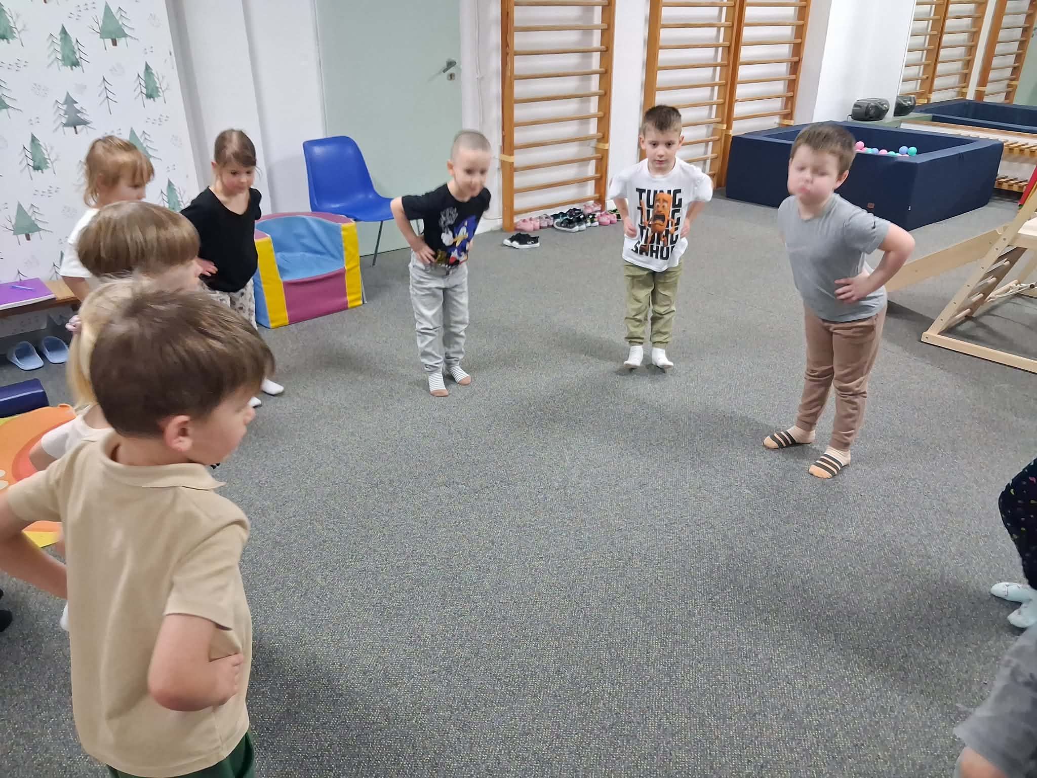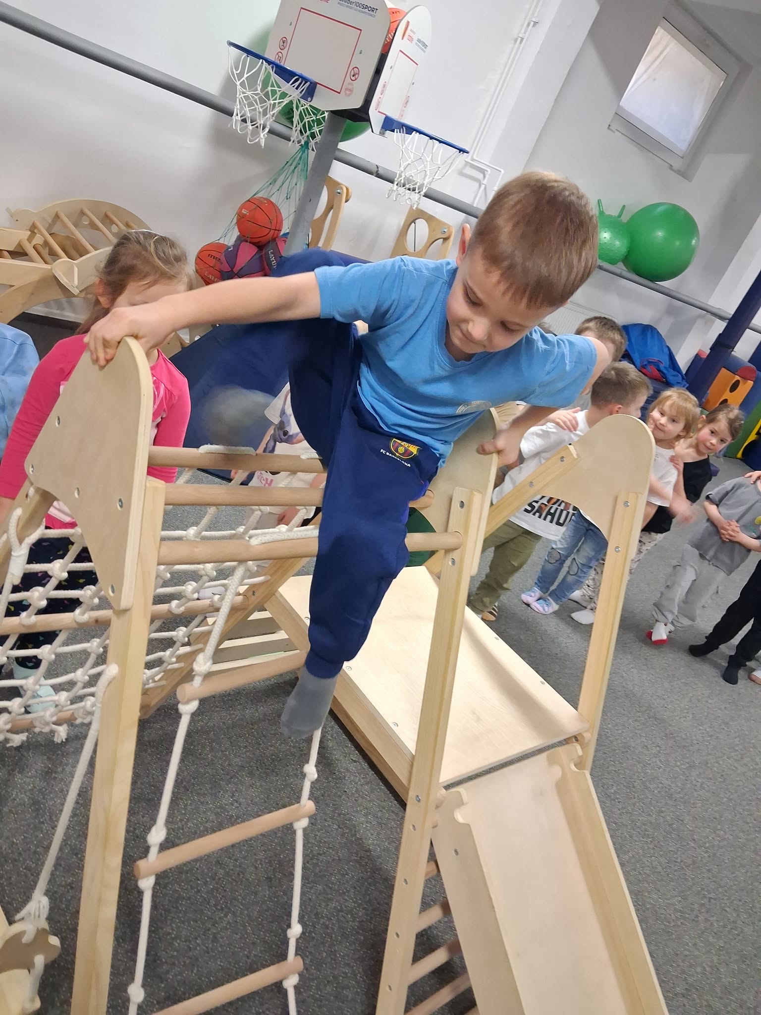 Zajęcia gimnastyki korekcyjnej miały na celu wspieranie prawidłowego rozwoju postawy ciała oraz usprawnianie funkcji motorycznych dzieci. Ćwiczenia były dostosowane do wieku i możliwości uczestników oraz prowadzone z zachowaniem zasad bezpieczeństwa. W trakcie zajęć realizowano następujące aktywności: Skakanie na piłce terapeutycznej – ćwiczenia wzmacniające mięśnie posturalne, poprawiające stabilizację tułowia oraz równowagę. Przechodzenie po drabinkach gimnastycznych – rozwijanie koordynacji ruchowej, wzmacnianie mięśni obręczy barkowej i pleców, kształtowanie kontroli ruchu. Jazda na deskorolce terapeutycznej – ćwiczenia wspierające integrację bilateralną, równowagę oraz planowanie motoryczne. Zajęcia przebiegały w atmosferze sprzyjającej aktywności i motywacji do podejmowania wysiłku fizycznego.