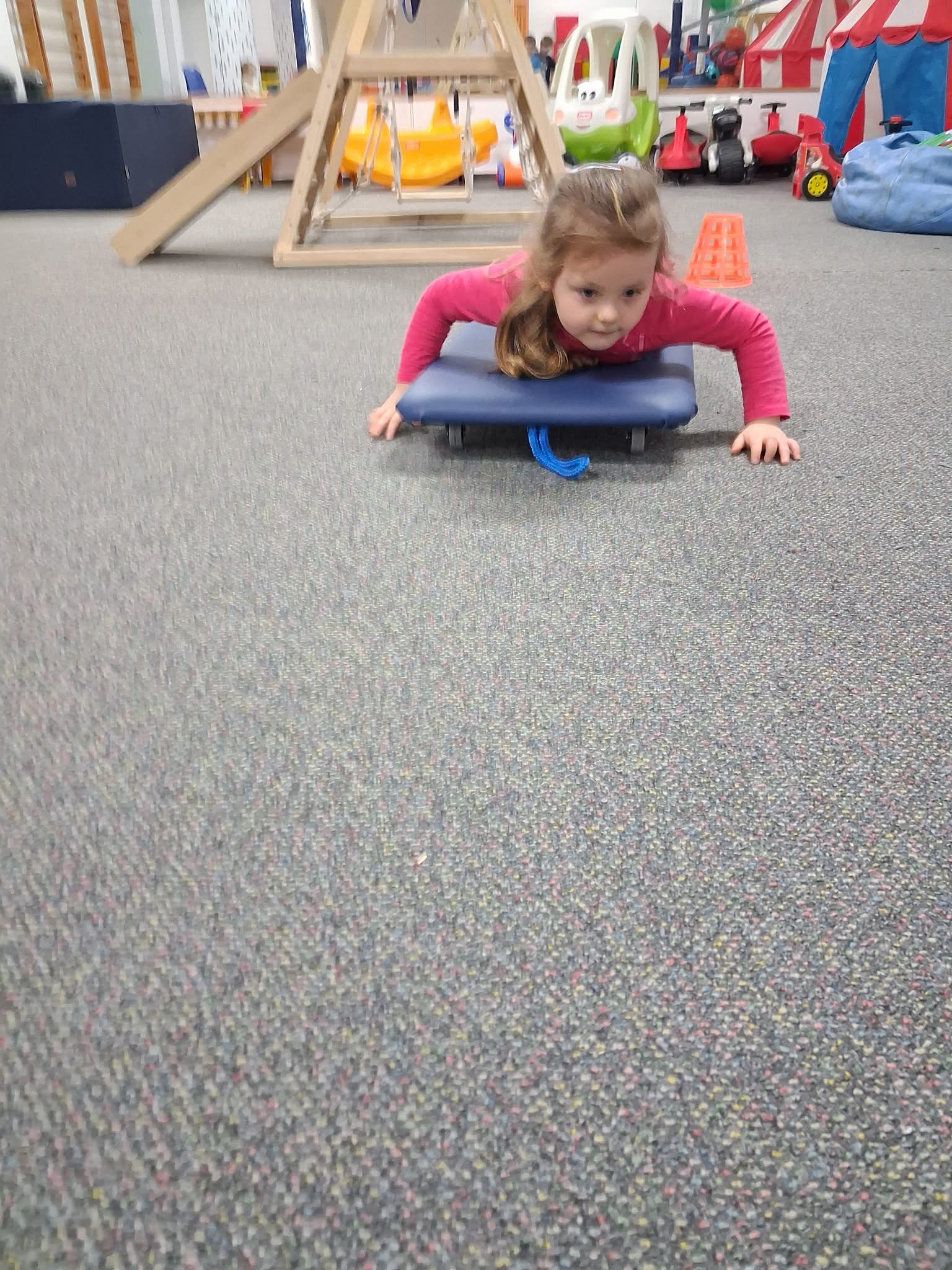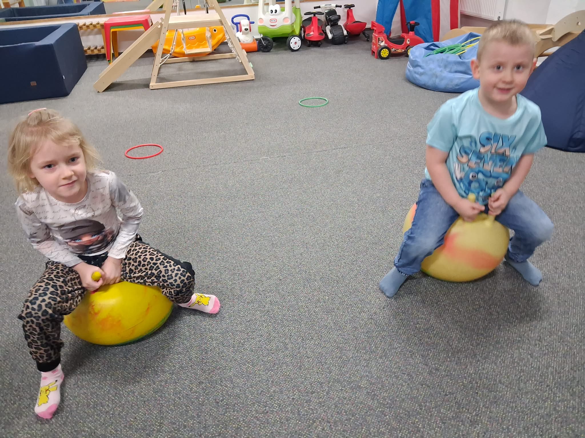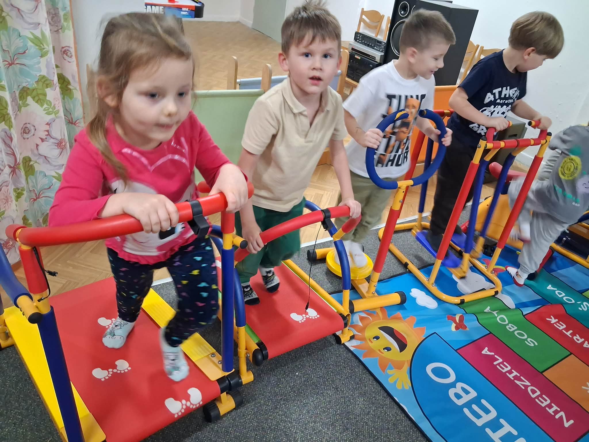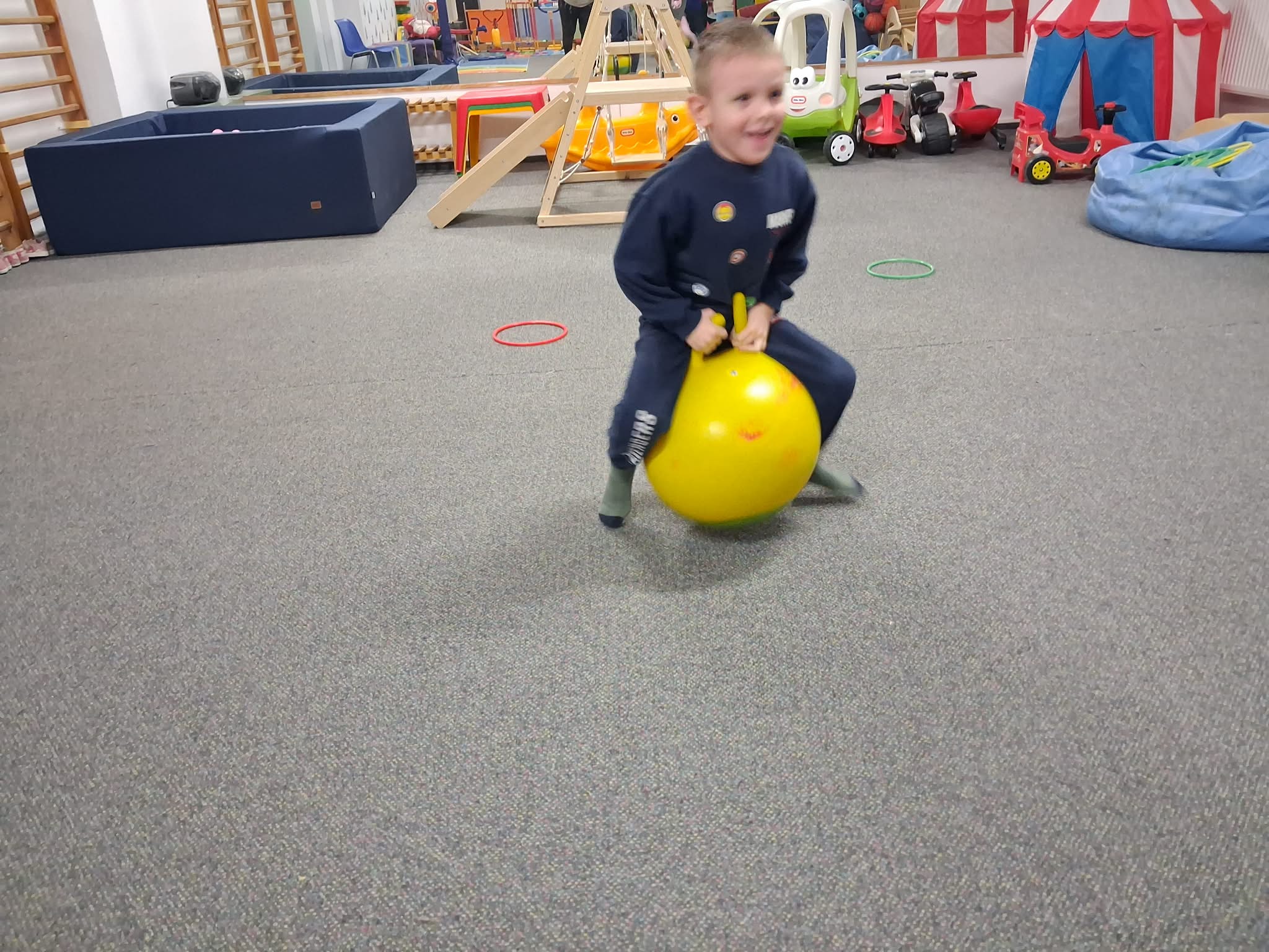 Zajęcia gimnastyki korekcyjnej miały na celu wspieranie prawidłowego rozwoju postawy ciała oraz usprawnianie funkcji motorycznych dzieci. Ćwiczenia były dostosowane do wieku i możliwości uczestników oraz prowadzone z zachowaniem zasad bezpieczeństwa. W trakcie zajęć realizowano następujące aktywności: Skakanie na piłce terapeutycznej – ćwiczenia wzmacniające mięśnie posturalne, poprawiające stabilizację tułowia oraz równowagę. Przechodzenie po drabinkach gimnastycznych – rozwijanie koordynacji ruchowej, wzmacnianie mięśni obręczy barkowej i pleców, kształtowanie kontroli ruchu. Jazda na deskorolce terapeutycznej – ćwiczenia wspierające integrację bilateralną, równowagę oraz planowanie motoryczne. Zajęcia przebiegały w atmosferze sprzyjającej aktywności i motywacji do podejmowania wysiłku fizycznego.