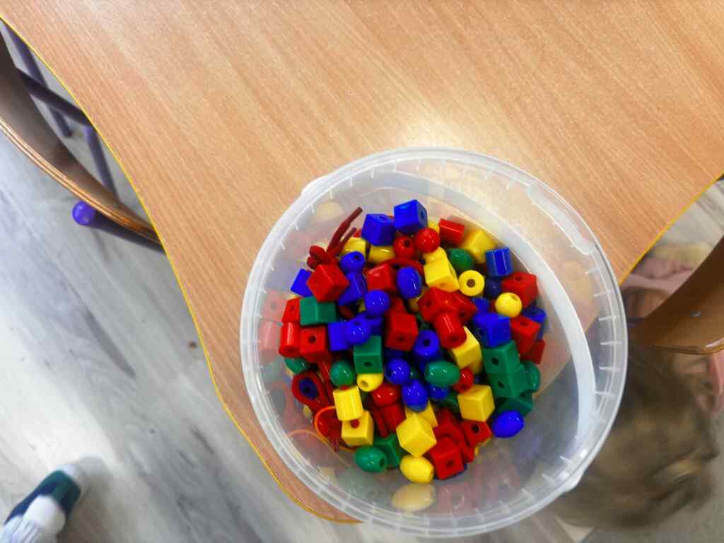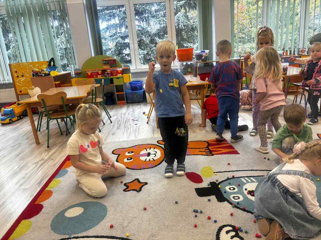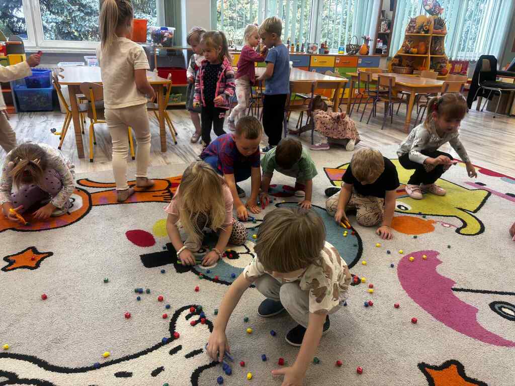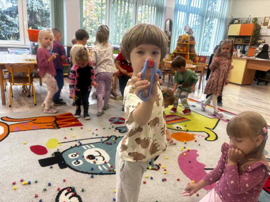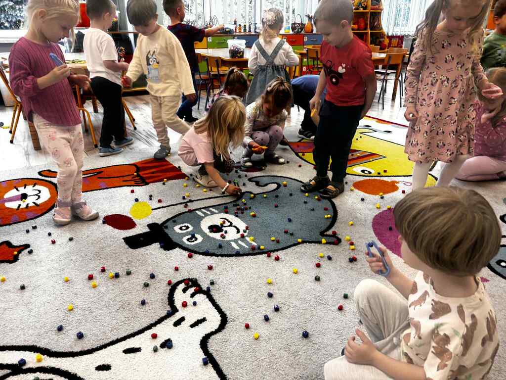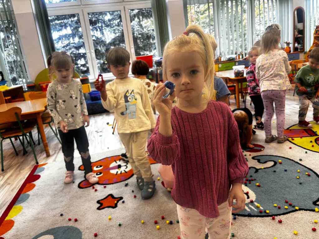 Dziś podczas zajęć popołudniowych nasze przedszkolaki doskonaliły swoje małe rączki, zbierając kolorowe koraliki za pomocą pęsety.
