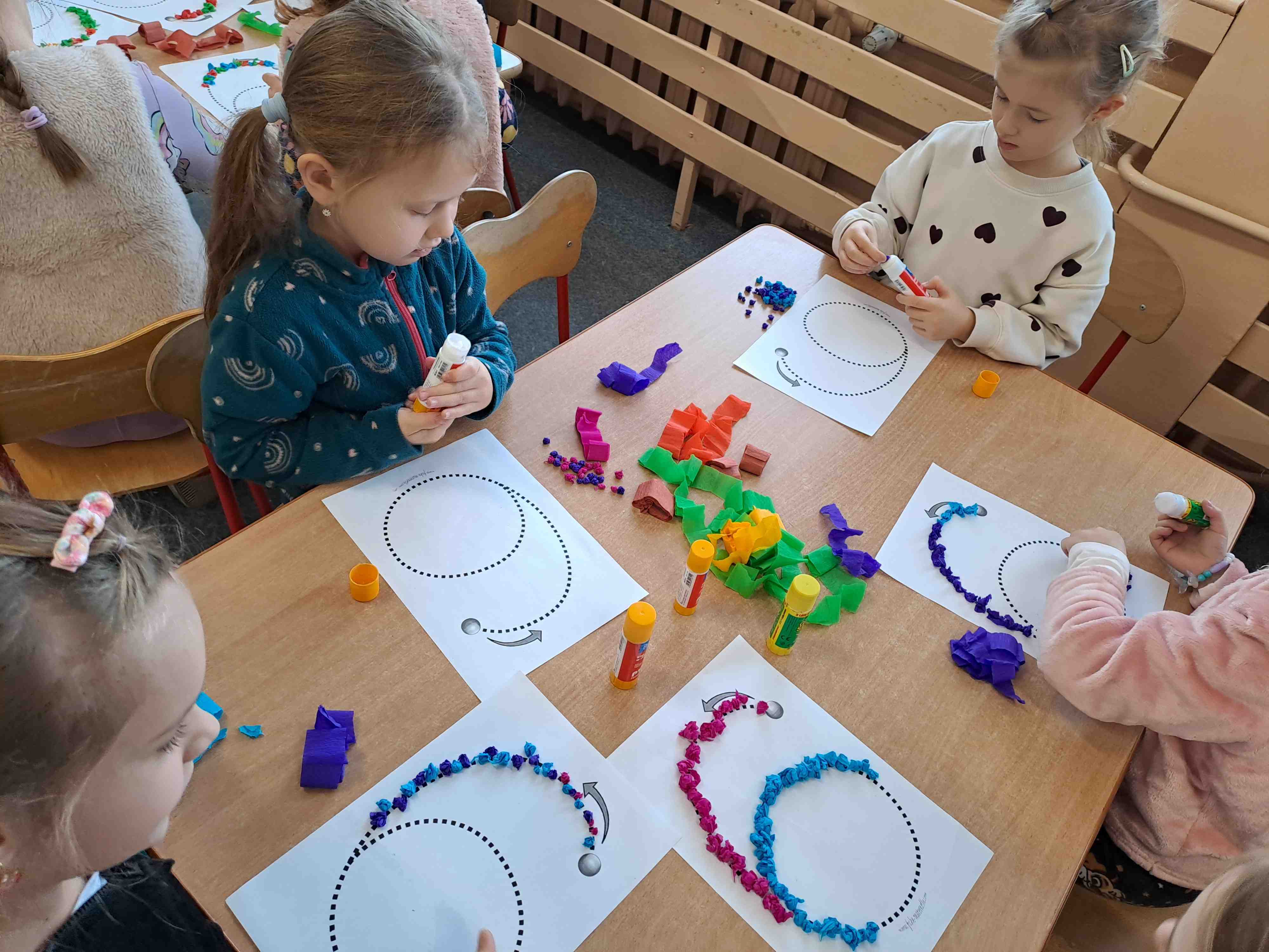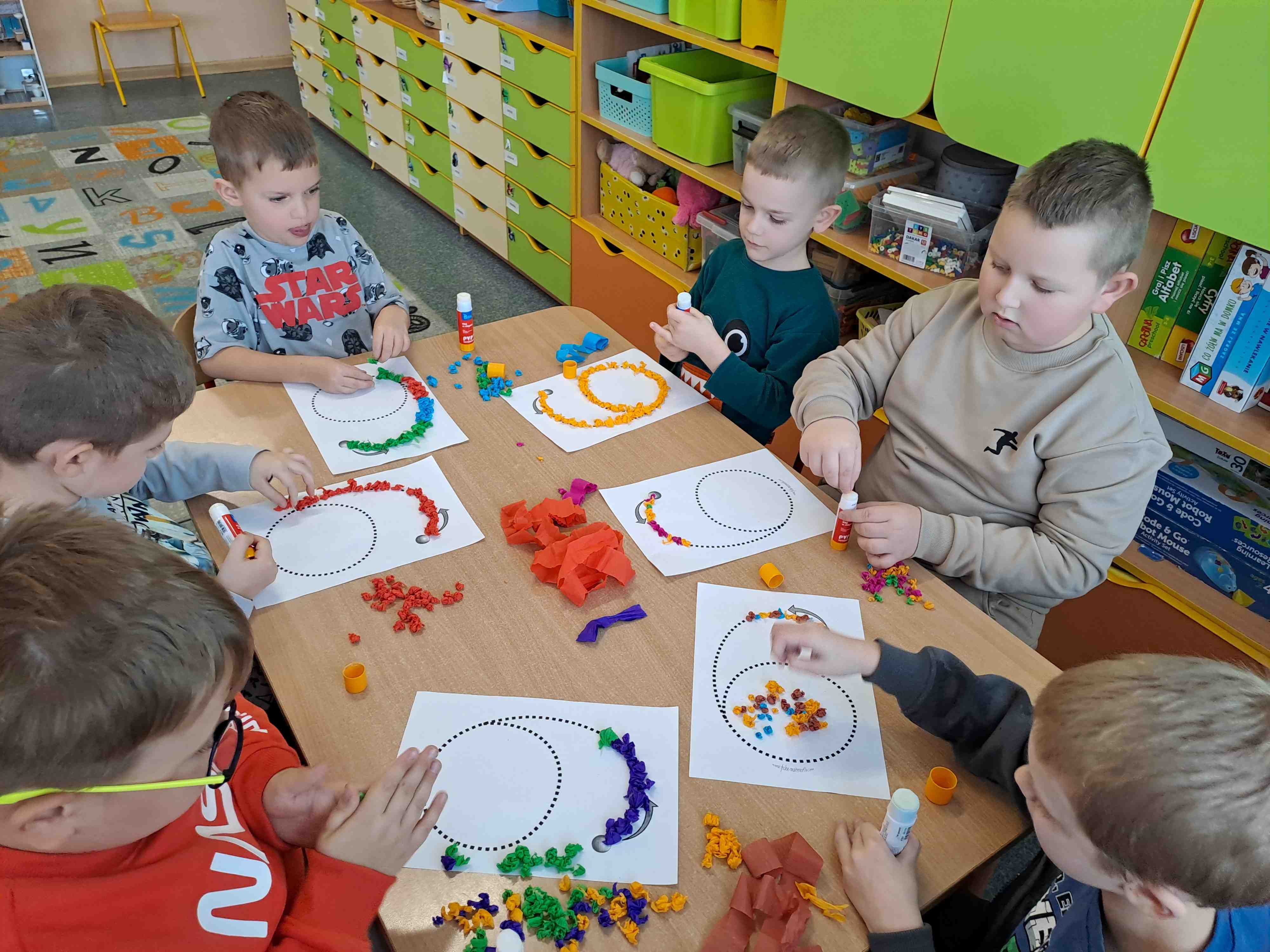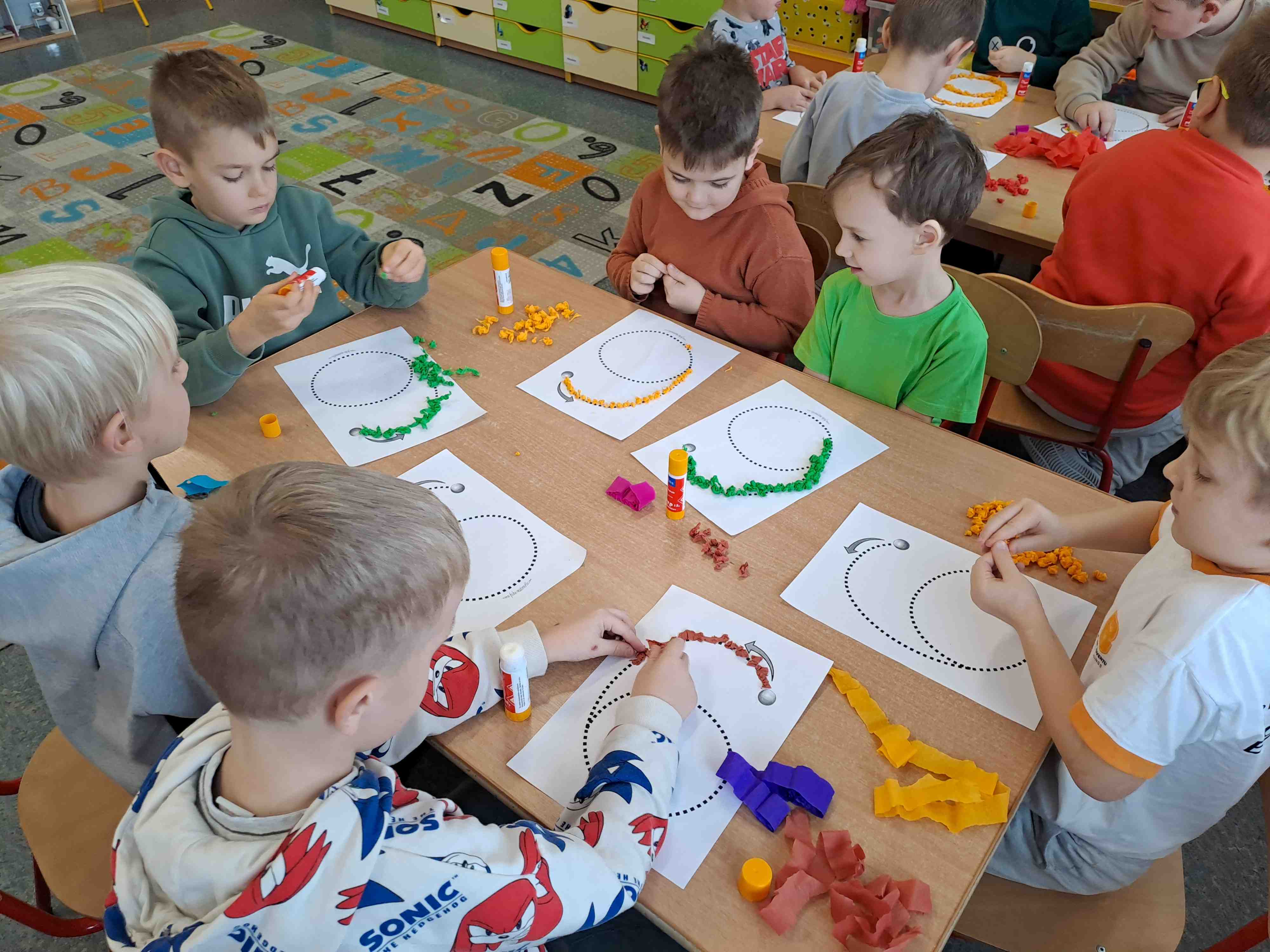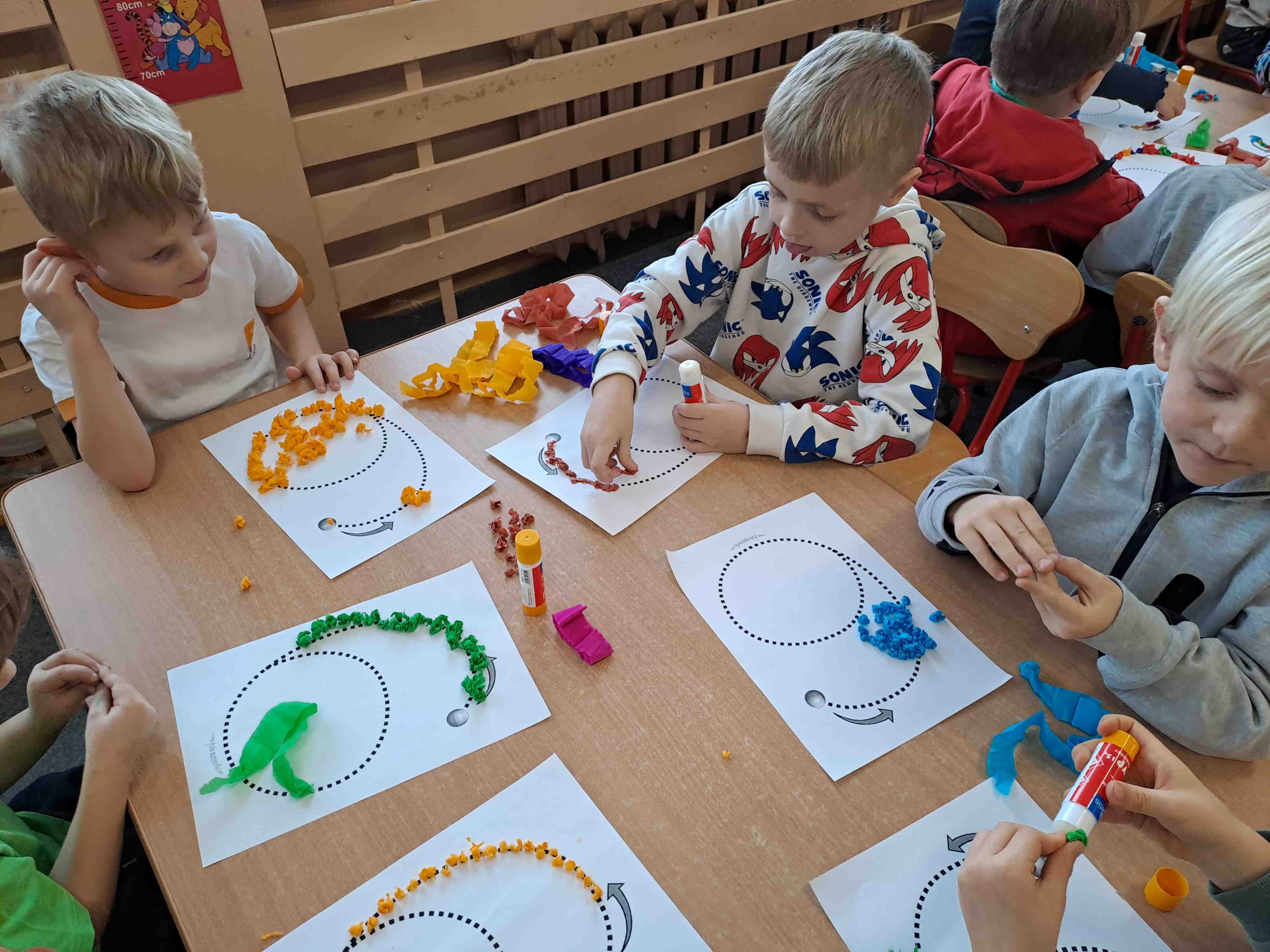W celu utrwalenia zapisu cyfrowego liczby sześć Motylki wykonały dziś pracę plastyczną "Kolorowa szóstka" techniką wylepianki bibułowej. Wszystkie szóstki zdecydowanie zasługują na szóstkę!