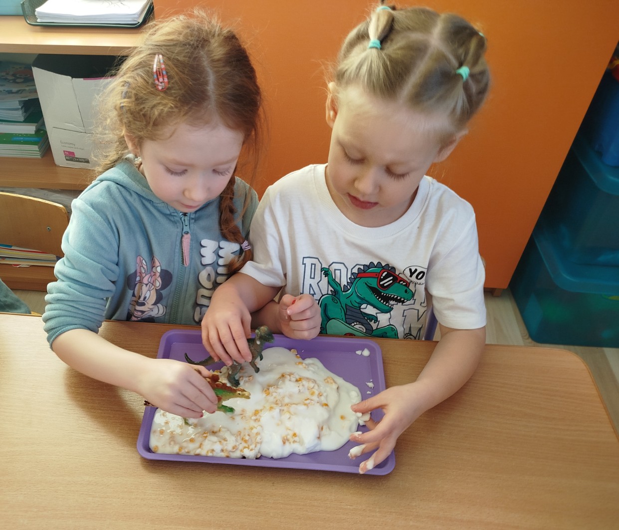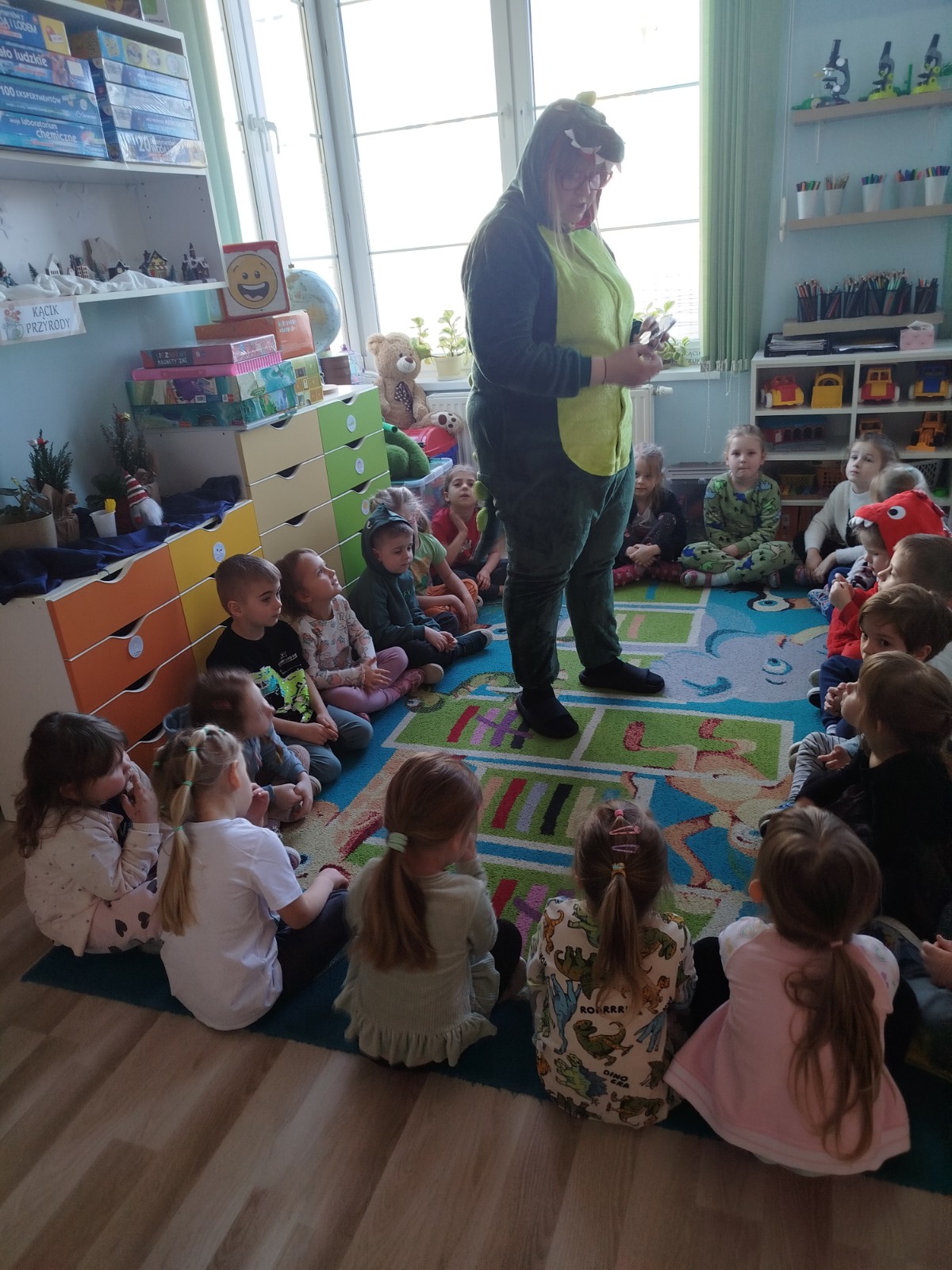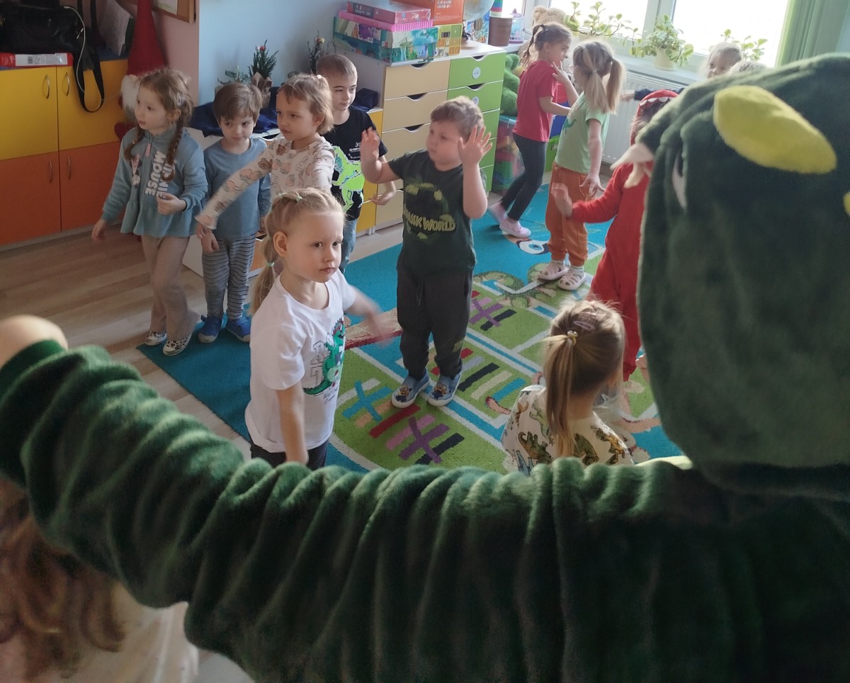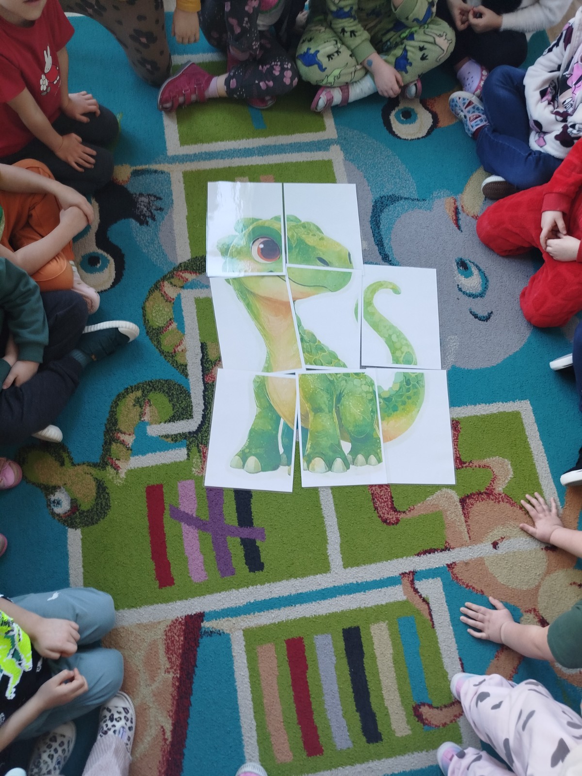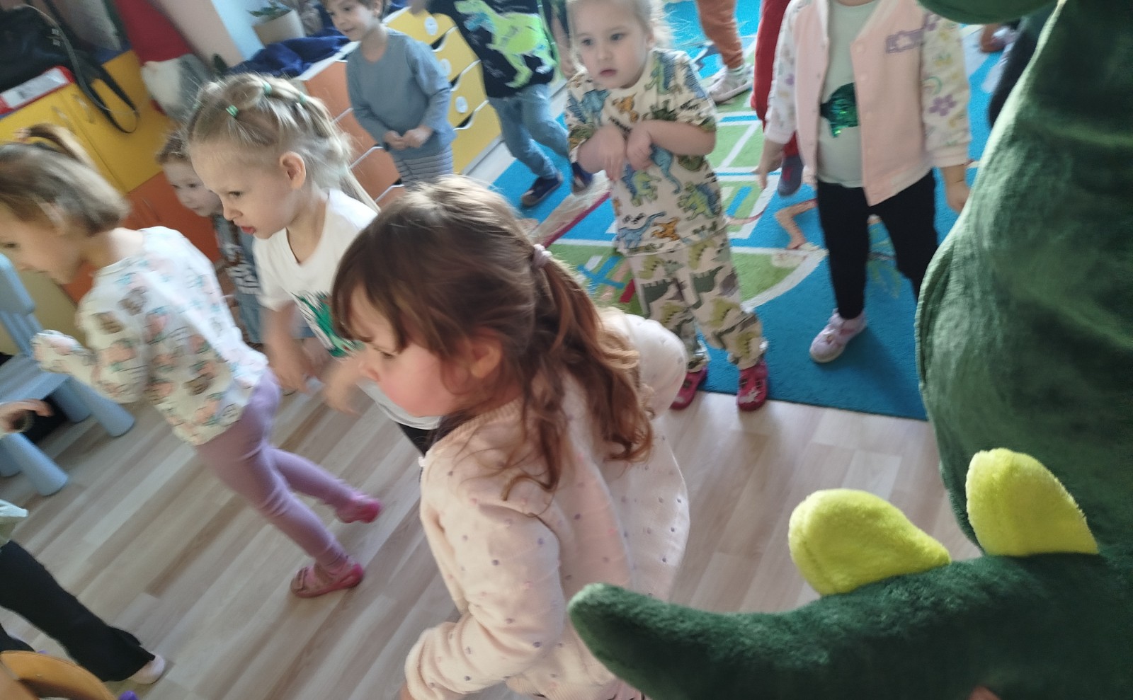 Dziś nasze przedszkolaki wzięły udział w uroczystości z okazji Dnia Dinozaura. Okazało się, że w naszej sali mieszka całkiem sporo różnego rodzaju dinozaurów, które stały się inspiracją do dzisiejszych zabaw. Przedszkolaki oglądały film edukacyjny nt. tych prehistorycznych stworzeń, tańczyły przy "dinusiowych" piosenkach, dobierały karty dinozaurów do ich cieni, układały obrazek pocięty na części przedstawiającego Diplodoka. Wykonały pracę plastyczną zgodnie z tematyką uroczystości oraz bawiły się figurkami dinozaurów zatopionych w cieczy nienewtonowskiej.
