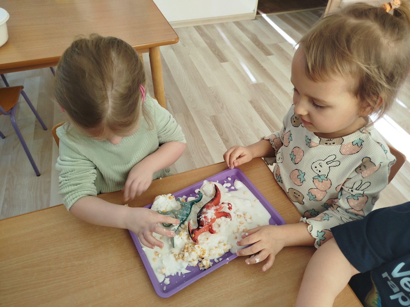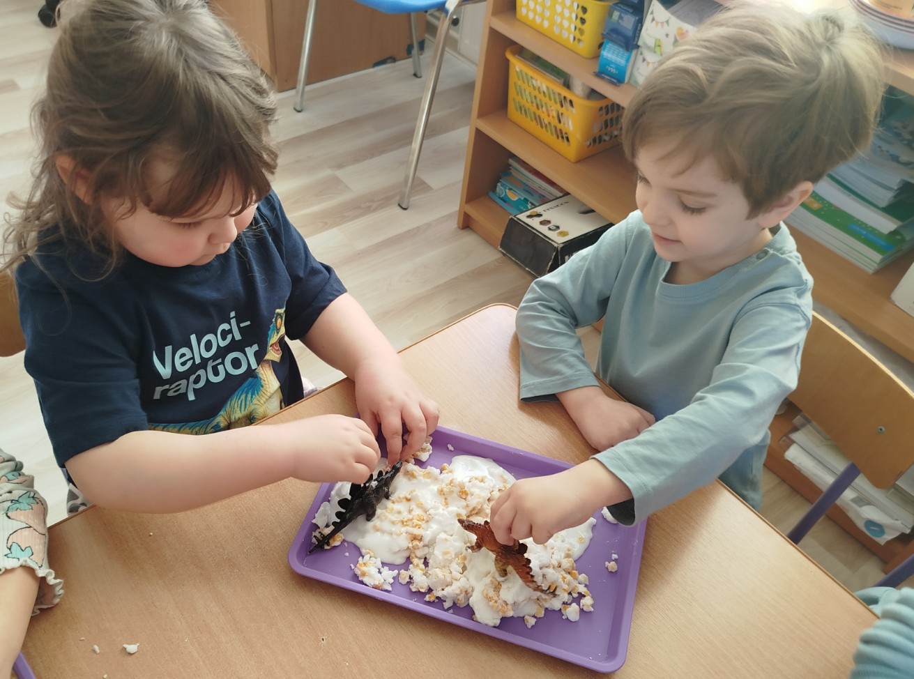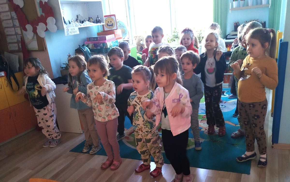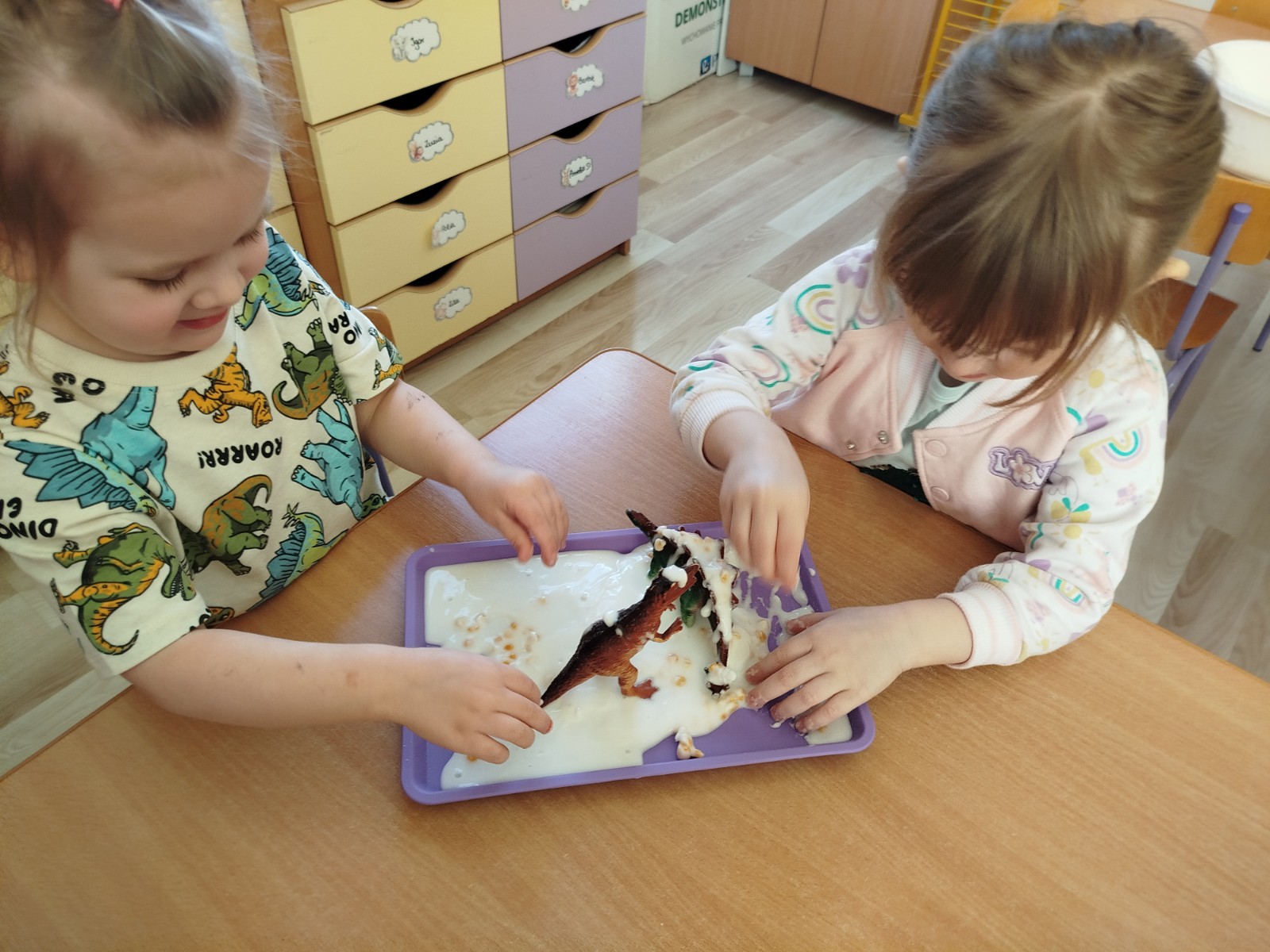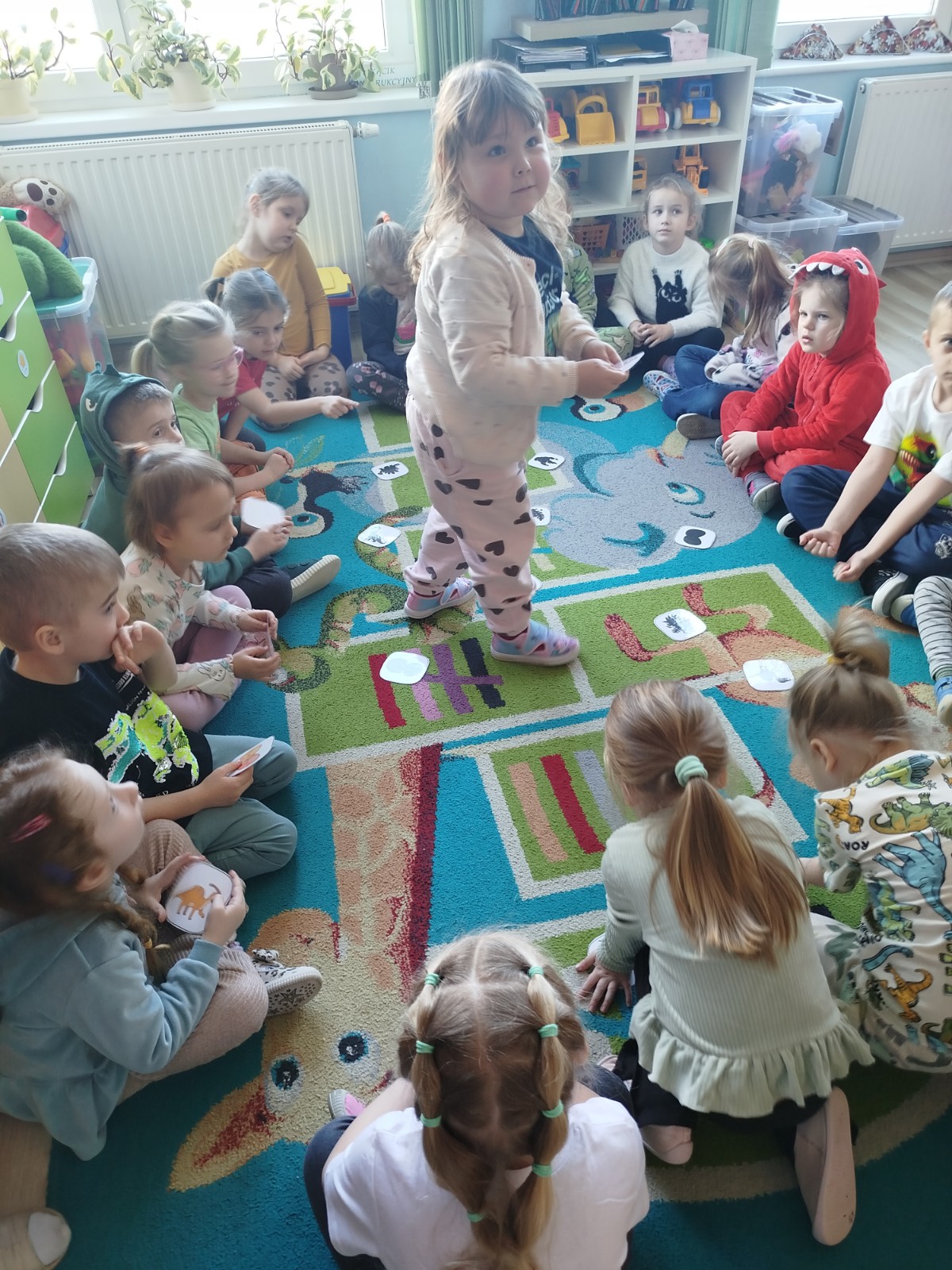 Dziś nasze przedszkolaki wzięły udział w uroczystości z okazji Dnia Dinozaura. Okazało się, że w naszej sali mieszka całkiem sporo różnego rodzaju dinozaurów, które stały się inspiracją do dzisiejszych zabaw. Przedszkolaki oglądały film edukacyjny nt. tych prehistorycznych stworzeń, tańczyły przy "dinusiowych" piosenkach, dobierały karty dinozaurów do ich cieni, układały obrazek pocięty na części przedstawiającego Diplodoka. Wykonały pracę plastyczną zgodnie z tematyką uroczystości oraz bawiły się figurkami dinozaurów zatopionych w cieczy nienewtonowskiej.