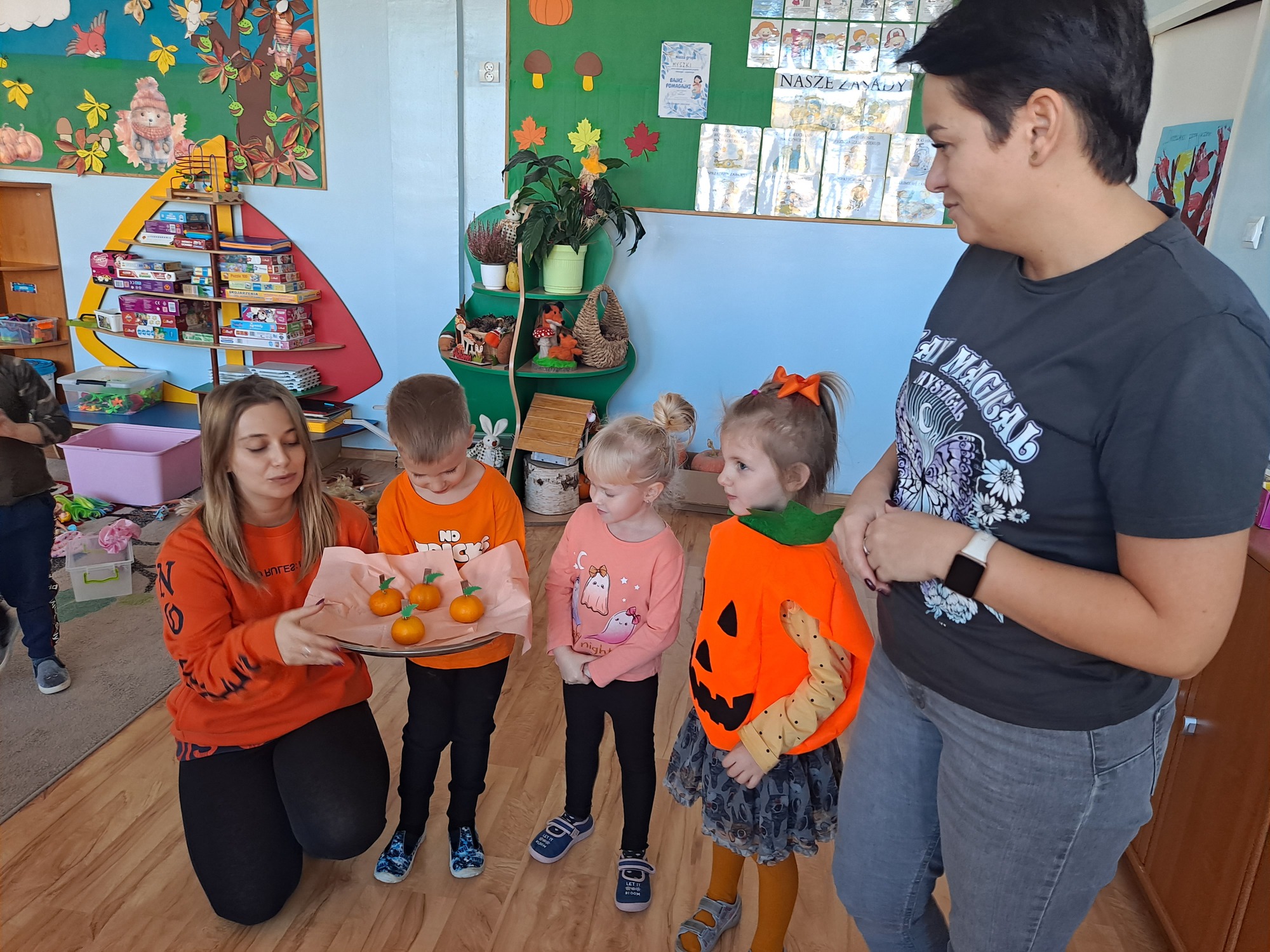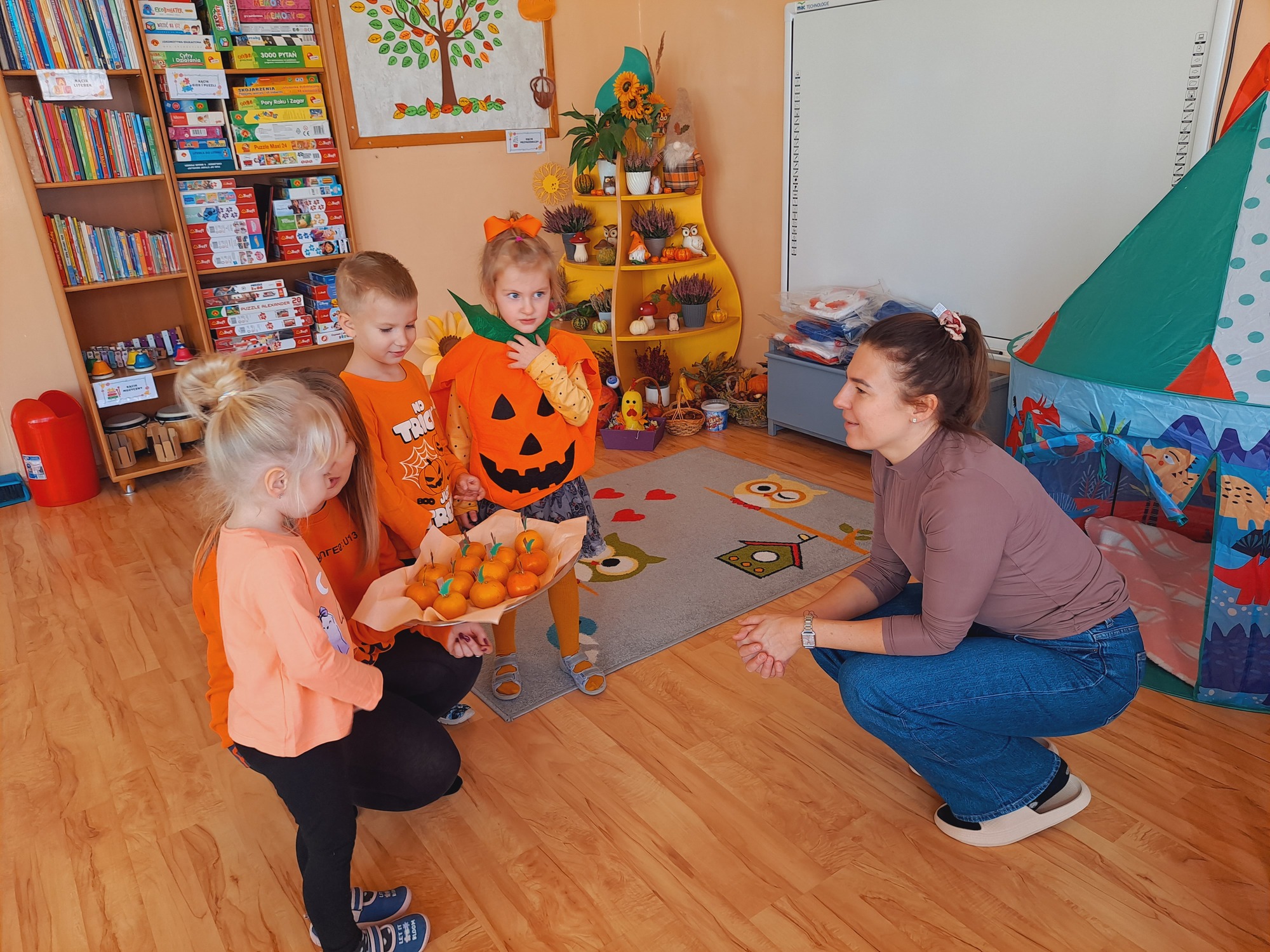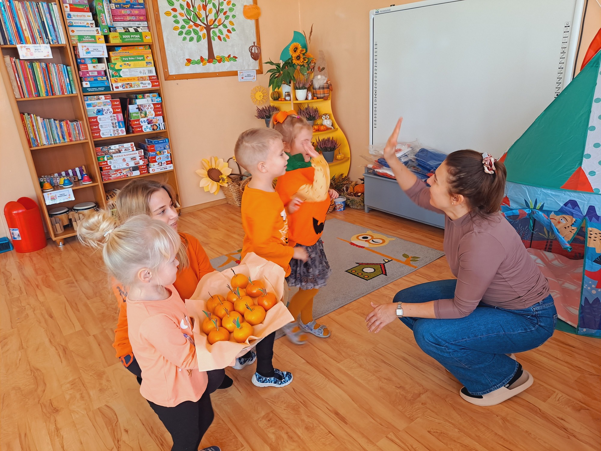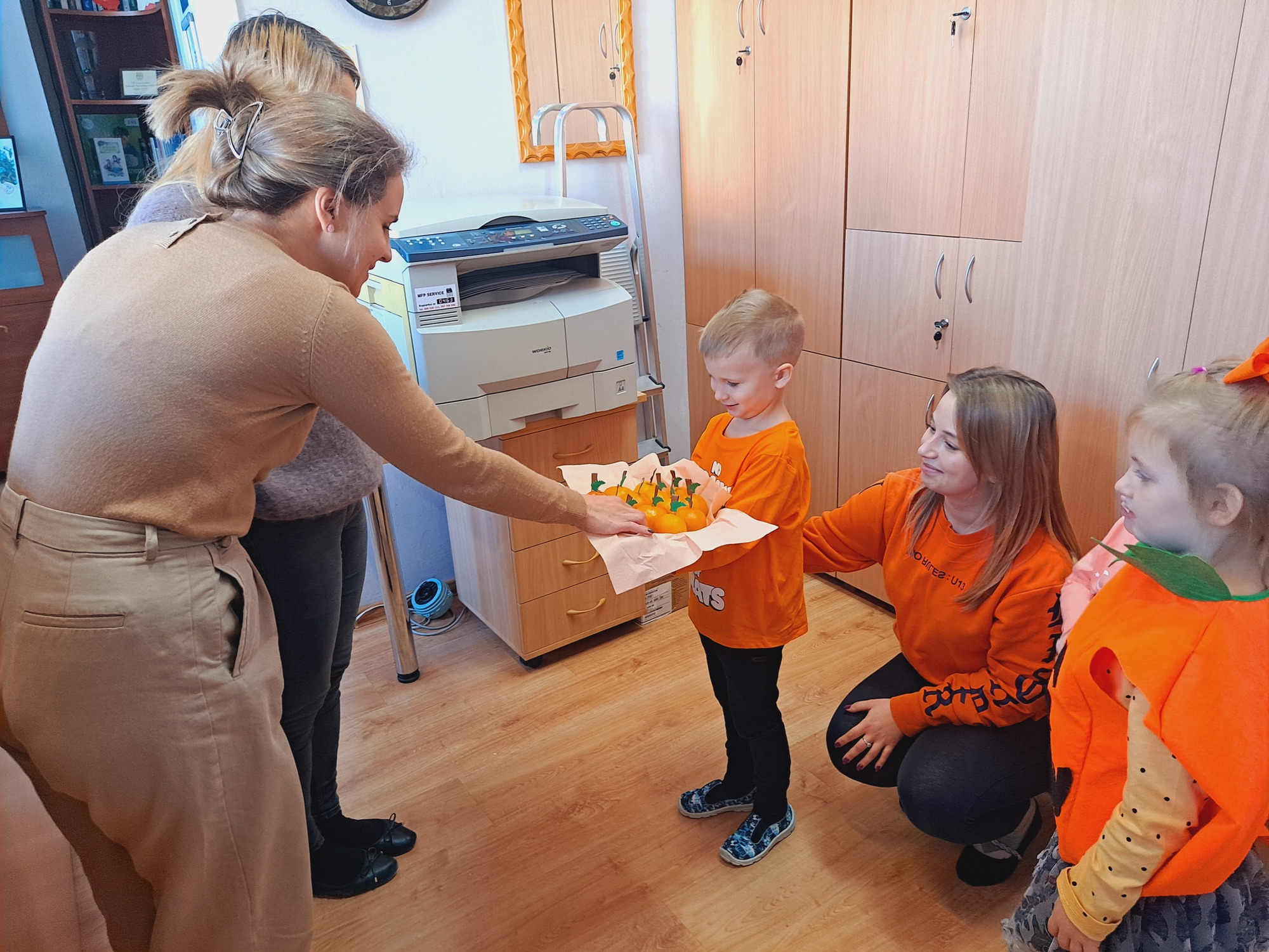 Dziś w naszym przedszkolu grupa „Pszczółek” świętowała Święto Dyni w wyjątkowy i pełen uśmiechu sposób. Dzieci, z wielkim zaangażowaniem i radością, wybrały się na spacer po przedszkolu, aby obdarować pracowników słodkimi „dyniami” – mandarynkami ozdobionymi tak, aby przypominały małe, jesienne dynie.