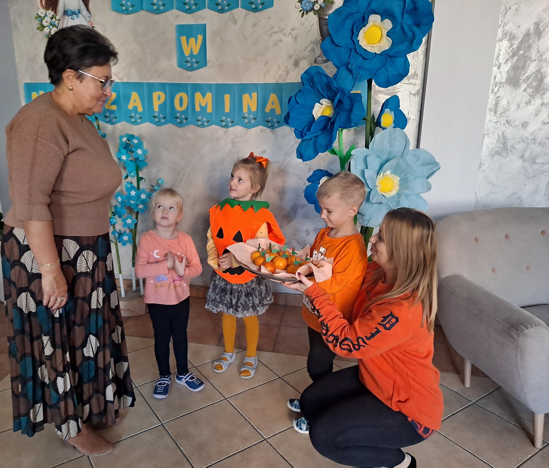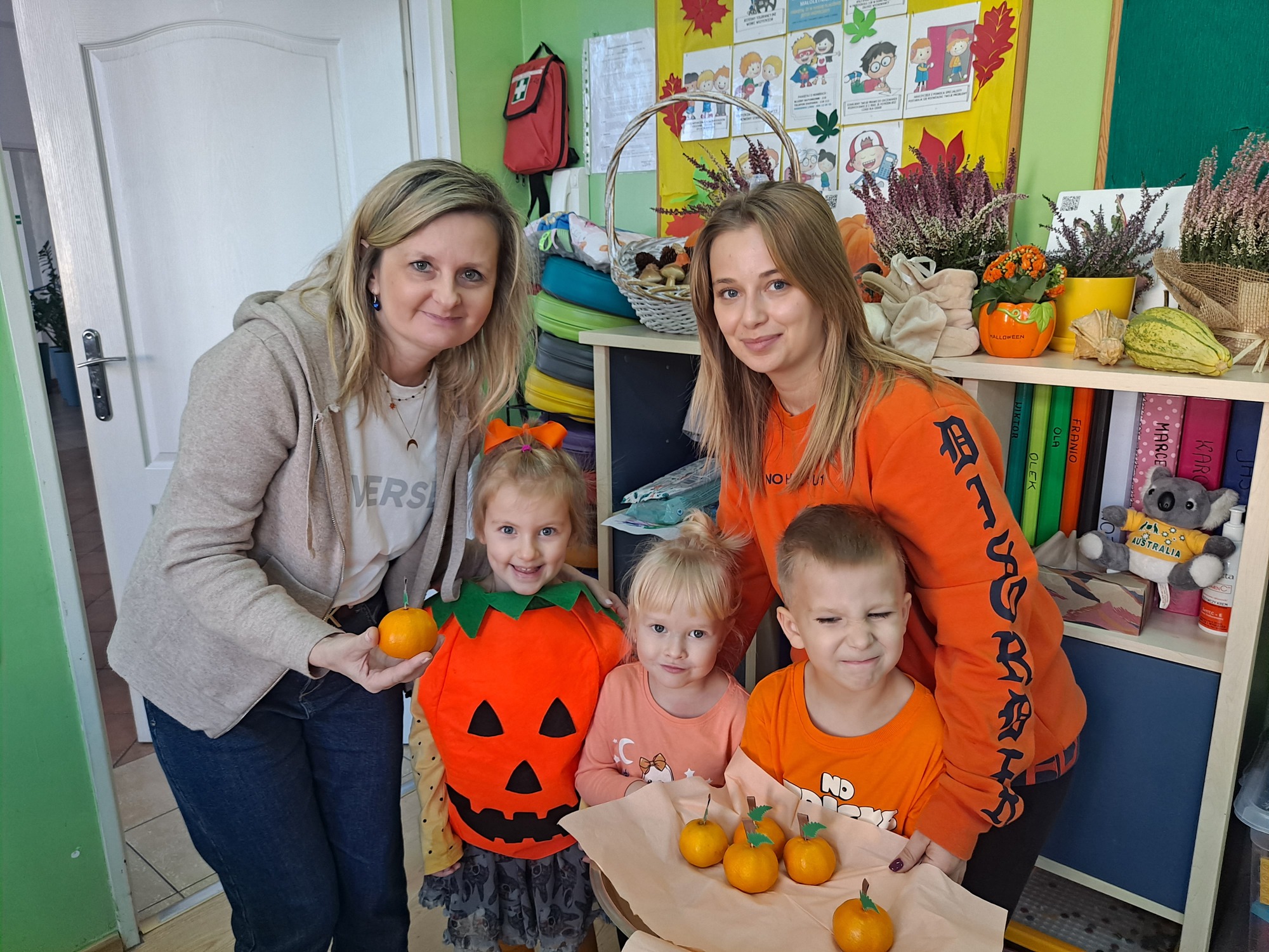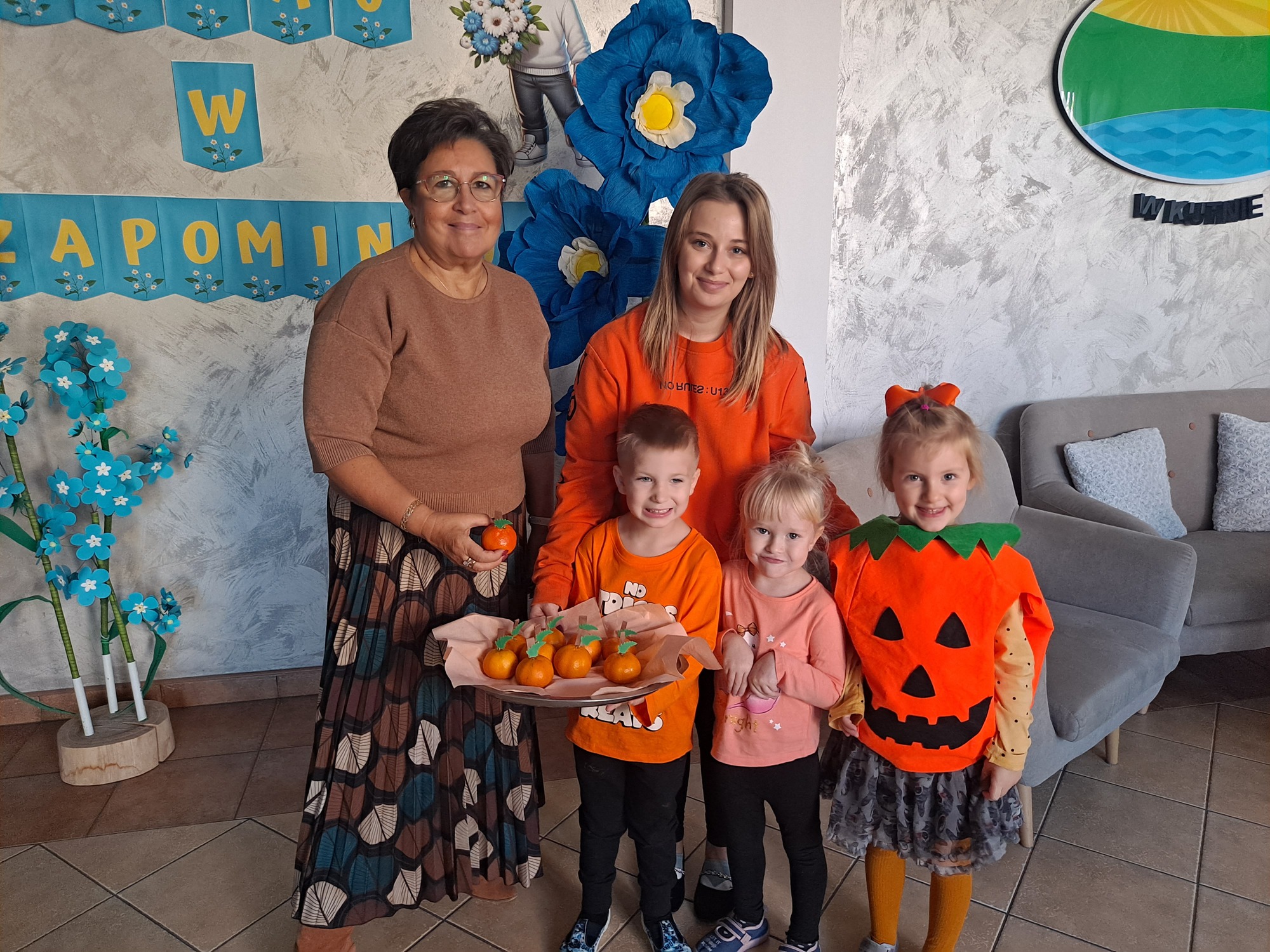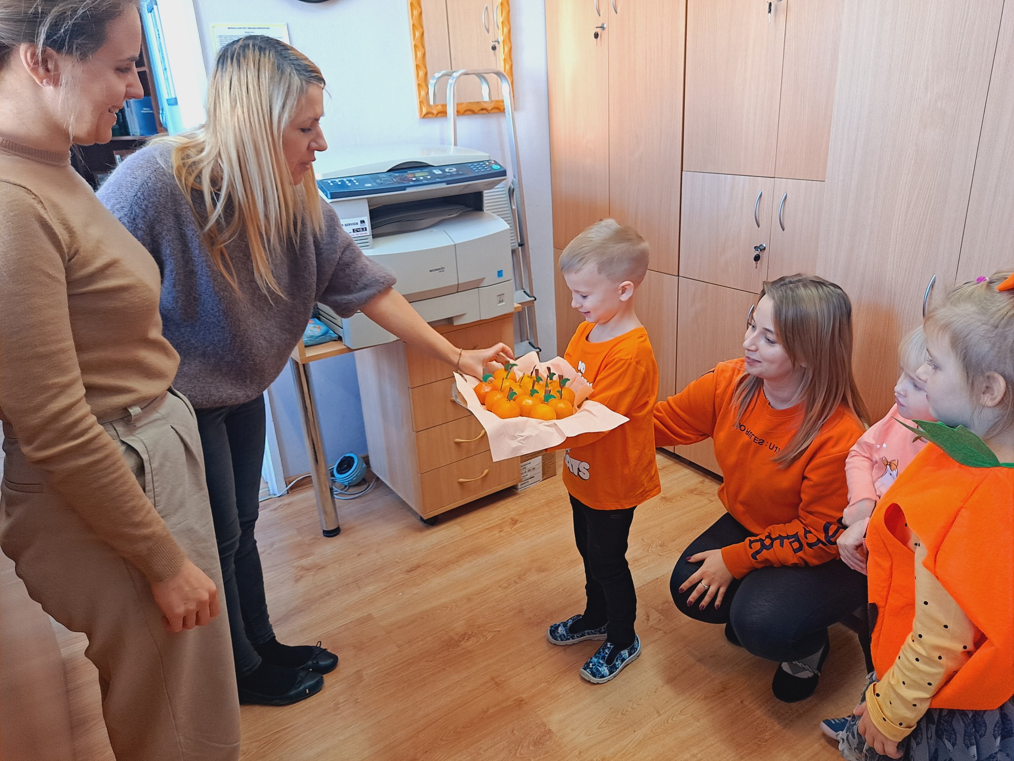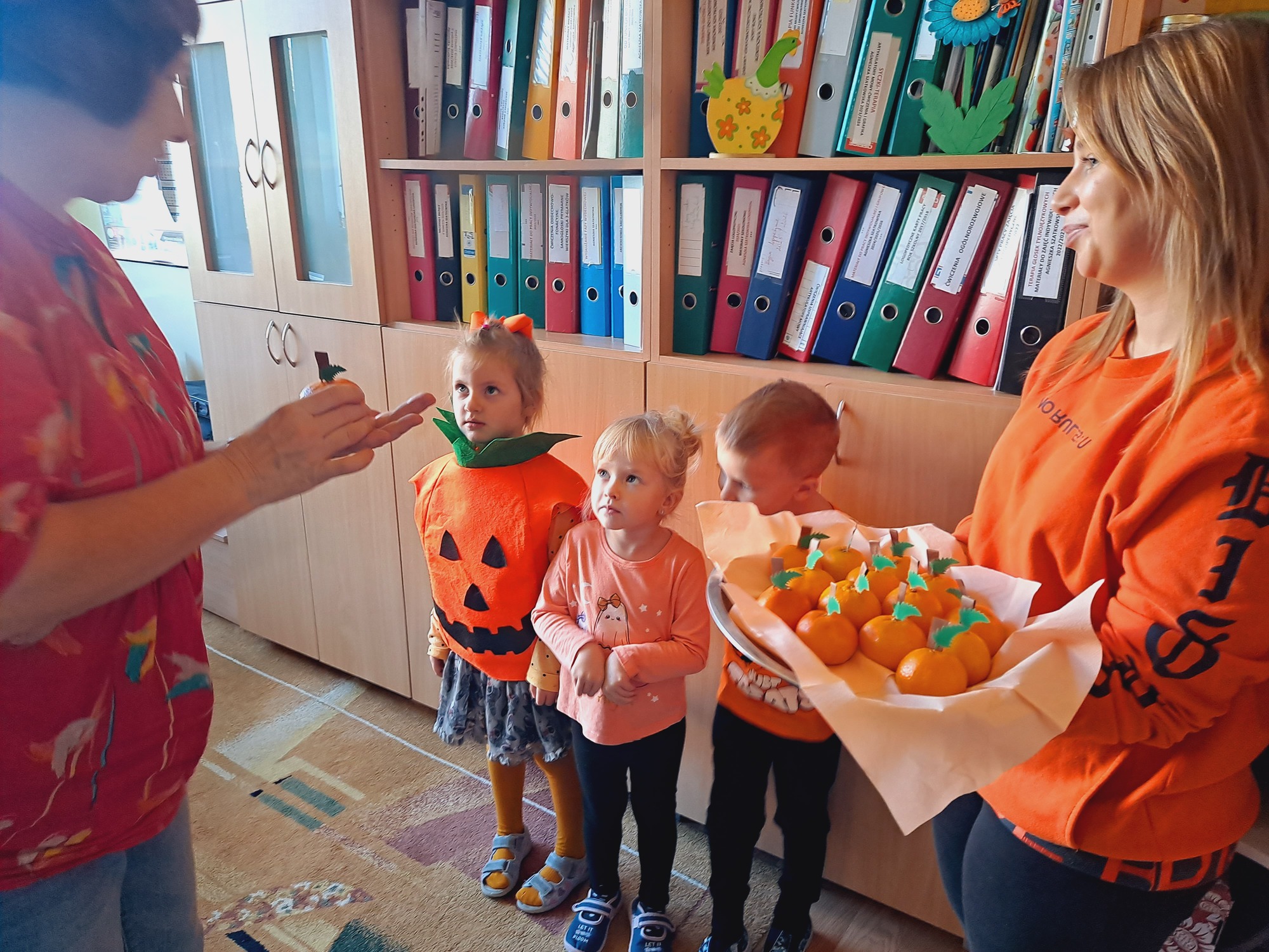 Dziś w naszym przedszkolu grupa „Pszczółek” świętowała Święto Dyni w wyjątkowy i pełen uśmiechu sposób. Dzieci, z wielkim zaangażowaniem i radością, wybrały się na spacer po przedszkolu, aby obdarować pracowników słodkimi „dyniami” – mandarynkami ozdobionymi tak, aby przypominały małe, jesienne dynie.