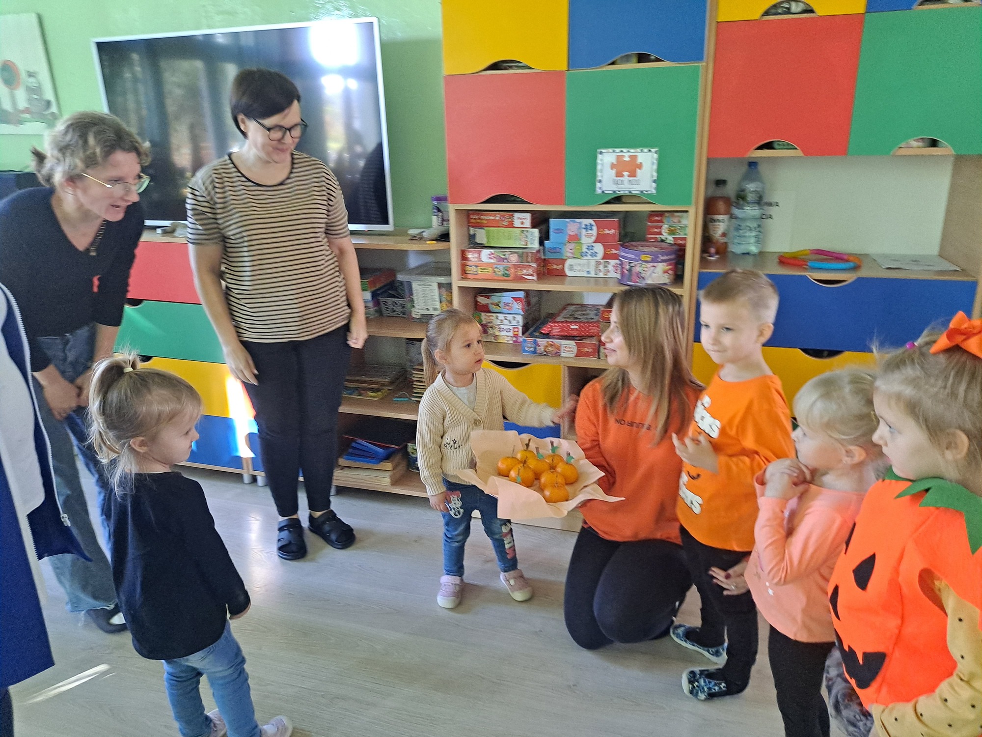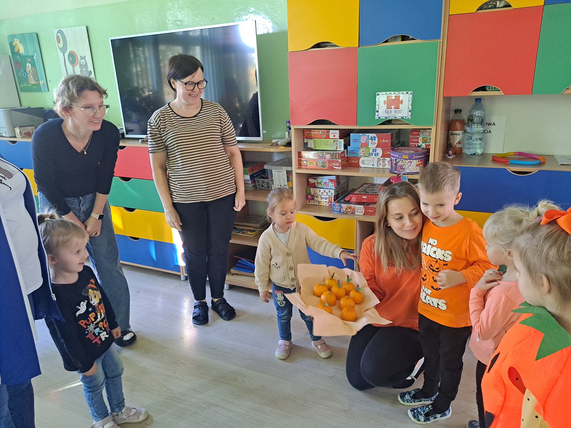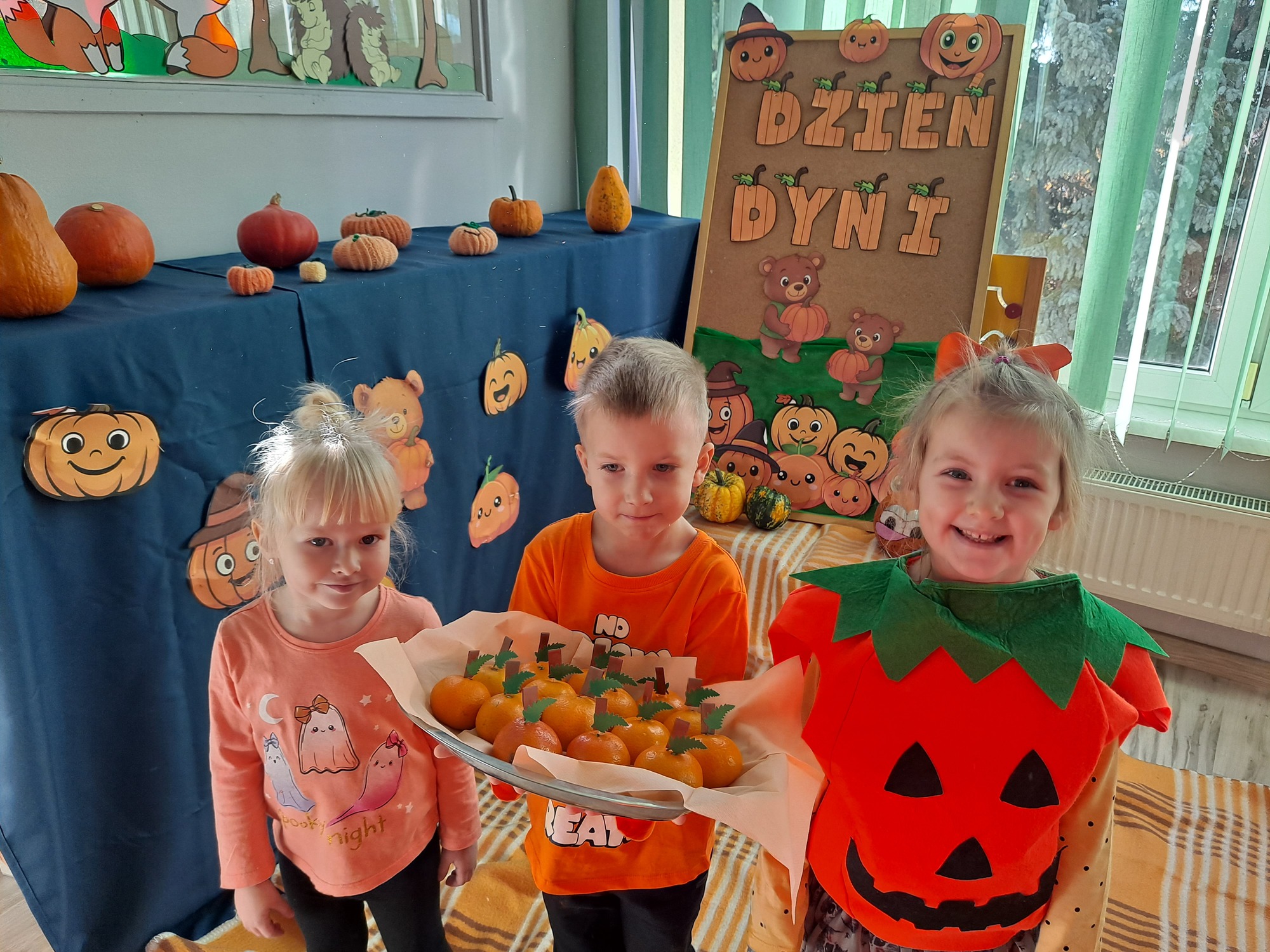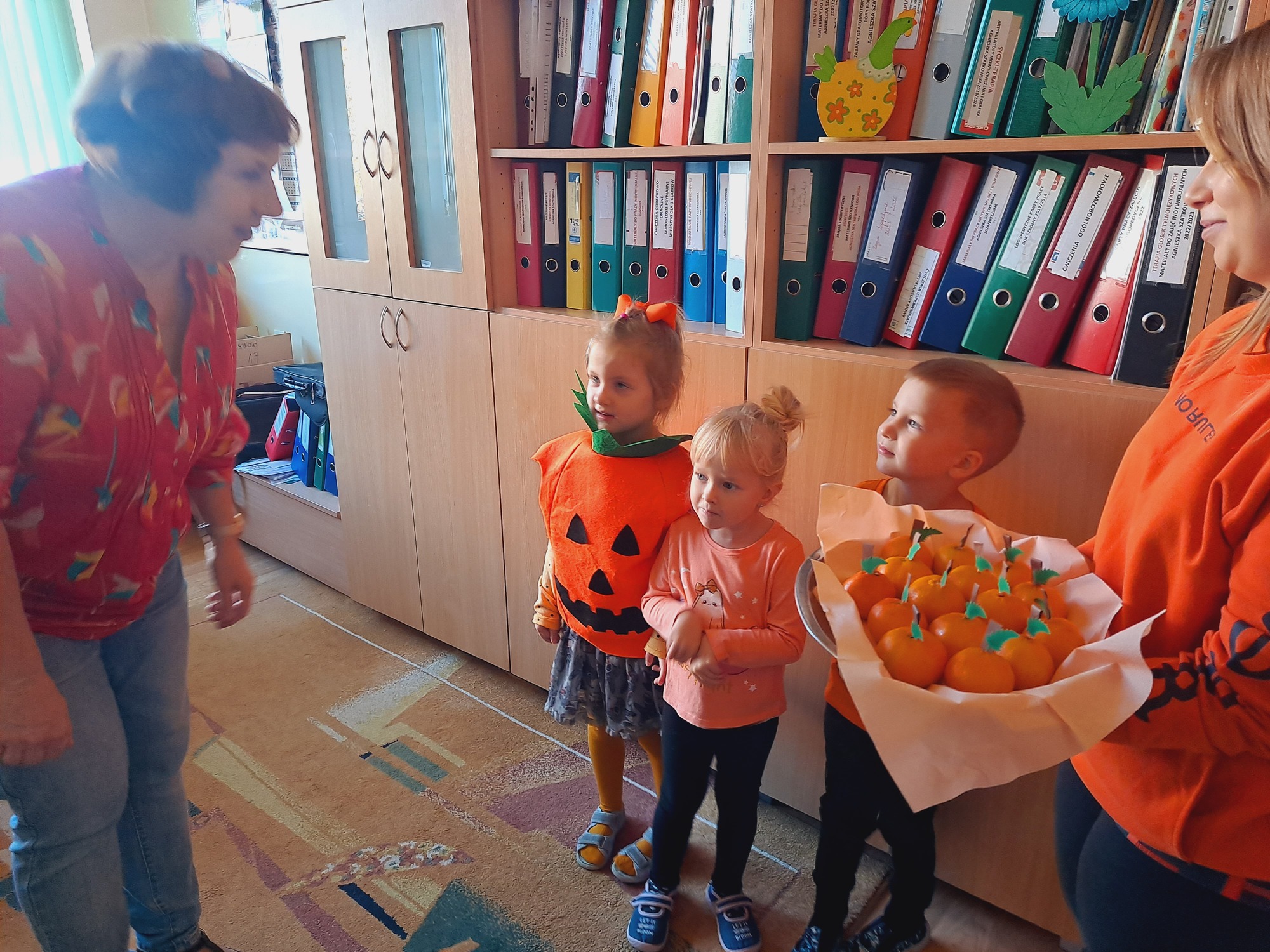 Dziś w naszym przedszkolu grupa „Pszczółek” świętowała Święto Dyni w wyjątkowy i pełen uśmiechu sposób. Dzieci, z wielkim zaangażowaniem i radością, wybrały się na spacer po przedszkolu, aby obdarować pracowników słodkimi „dyniami” – mandarynkami ozdobionymi tak, aby przypominały małe, jesienne dynie.