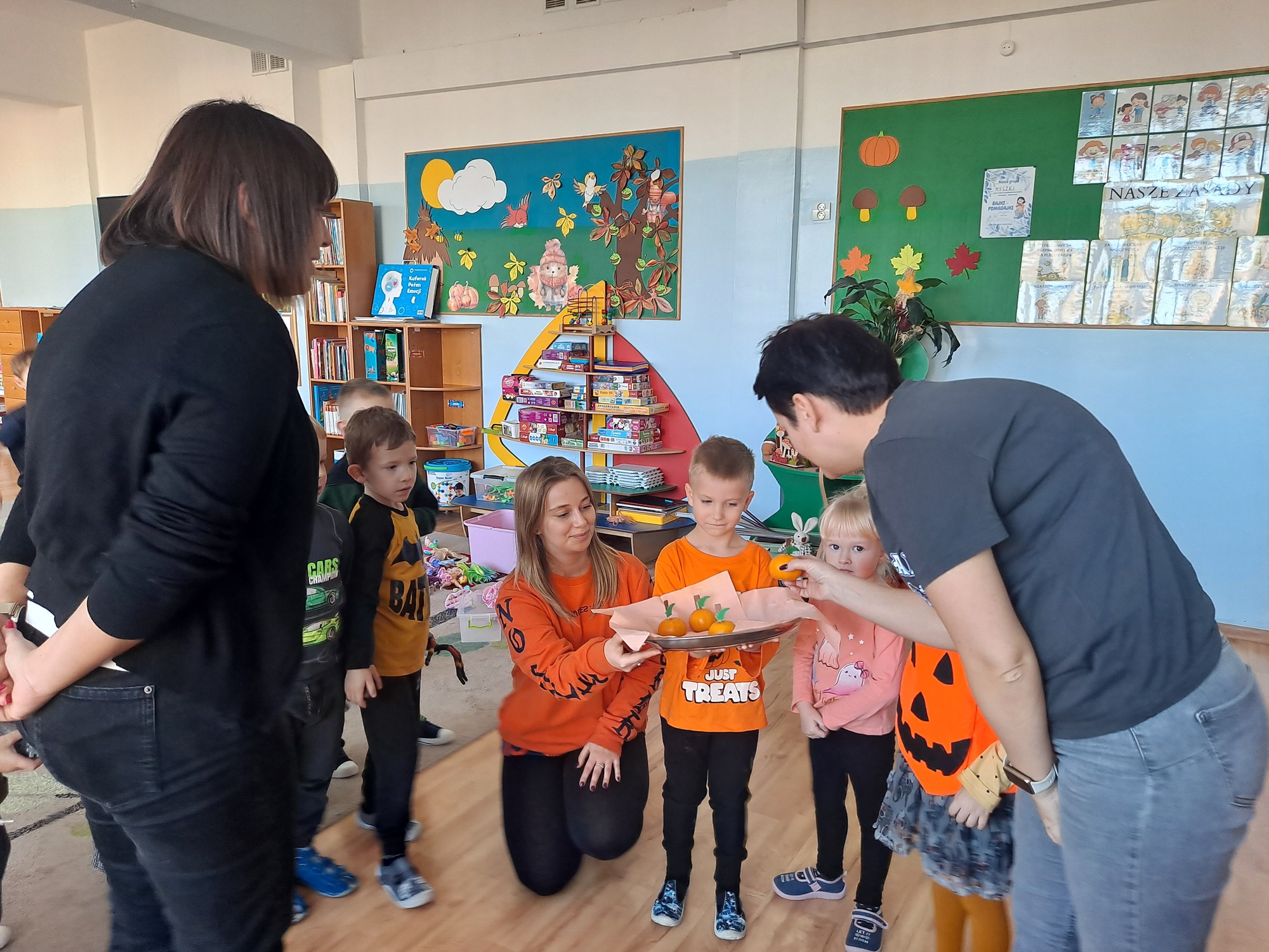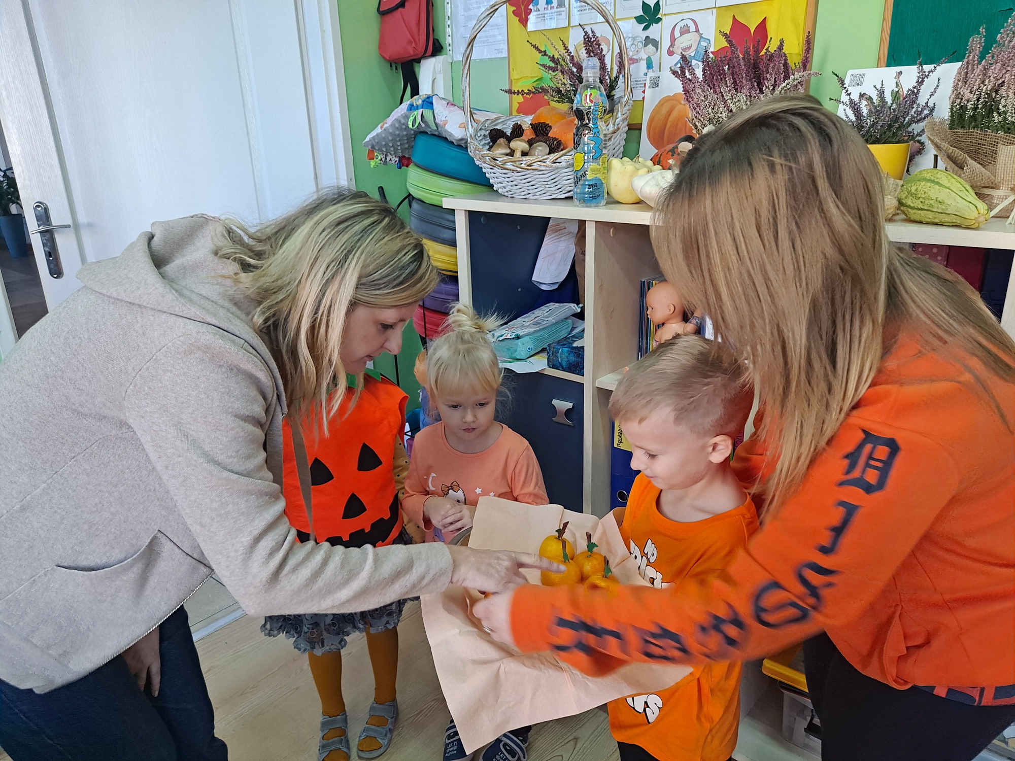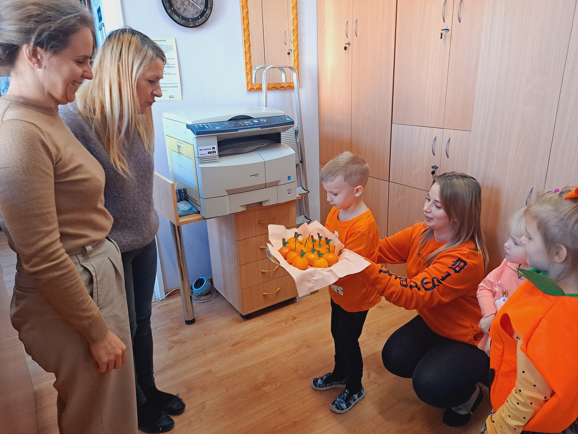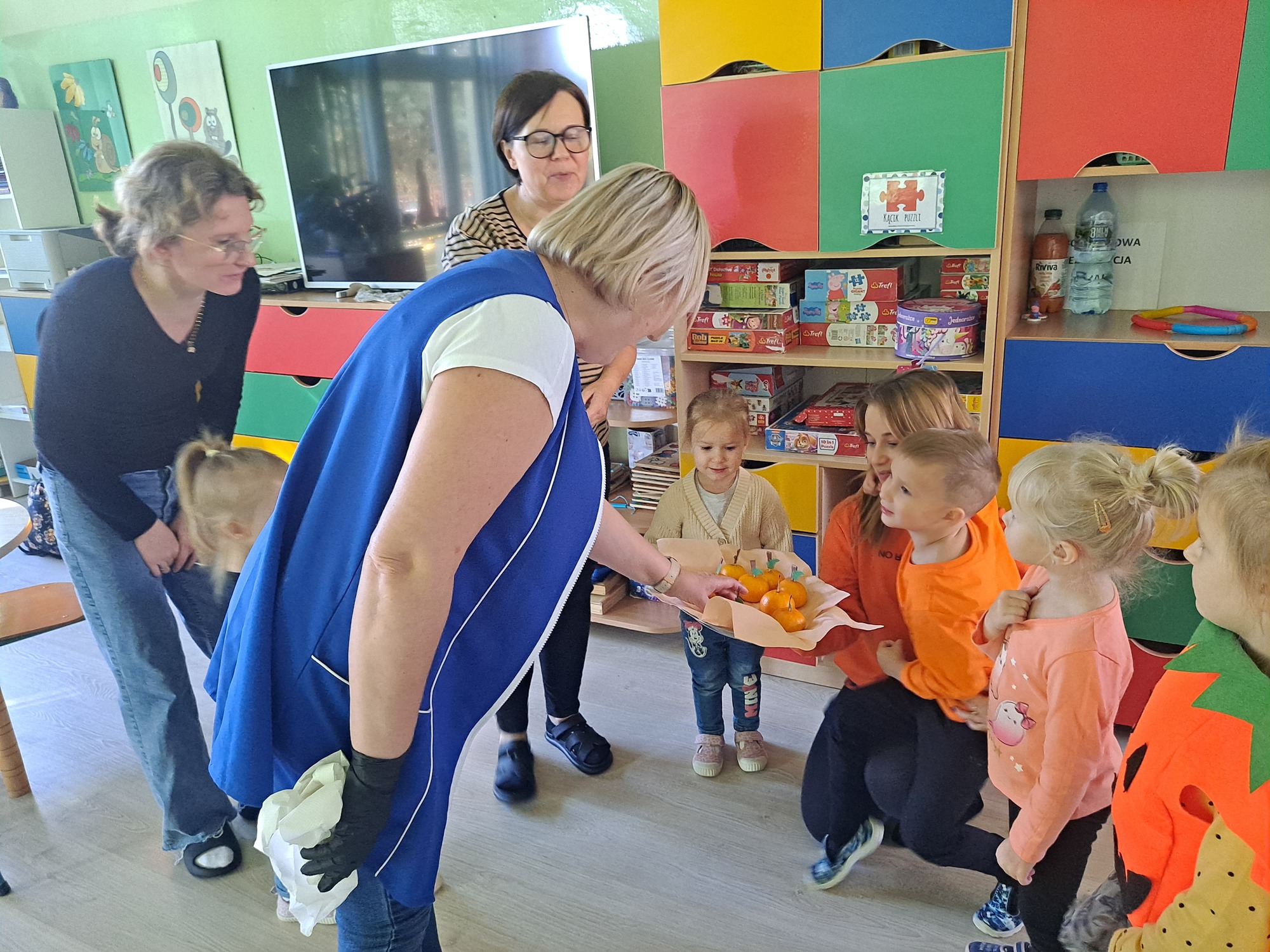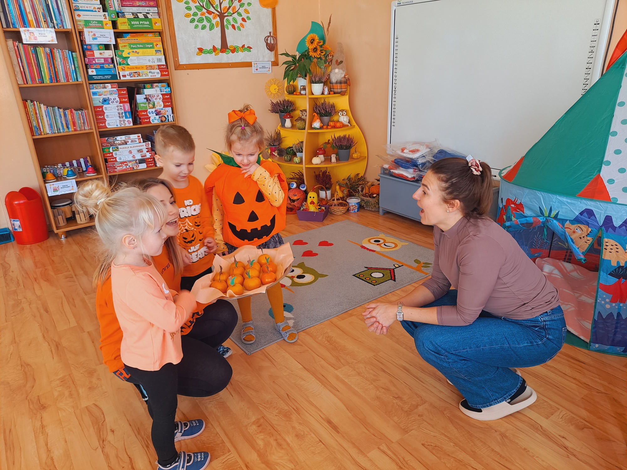Dziś w naszym przedszkolu grupa „Pszczółek” świętowała Święto Dyni w wyjątkowy i pełen uśmiechu sposób. Dzieci, z wielkim zaangażowaniem i radością, wybrały się na spacer po przedszkolu, aby obdarować pracowników słodkimi „dyniami” – mandarynkami ozdobionymi tak, aby przypominały małe, jesienne dynie.