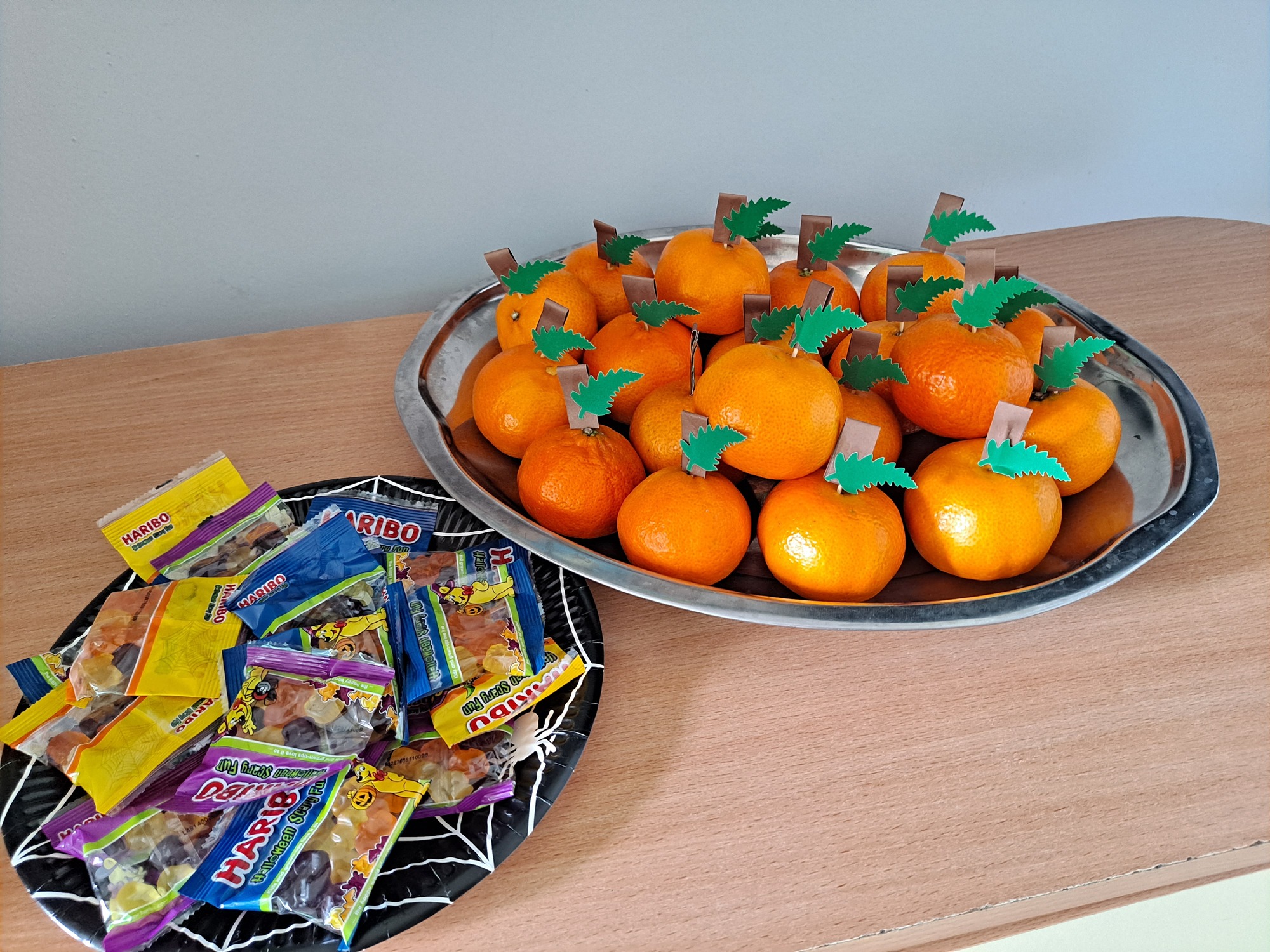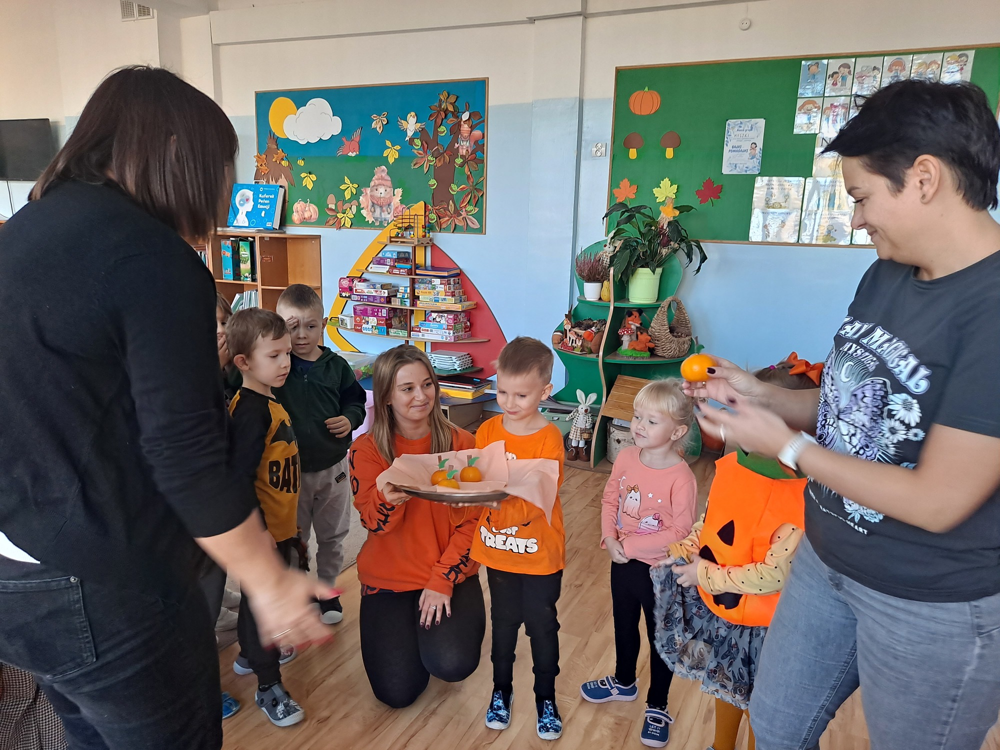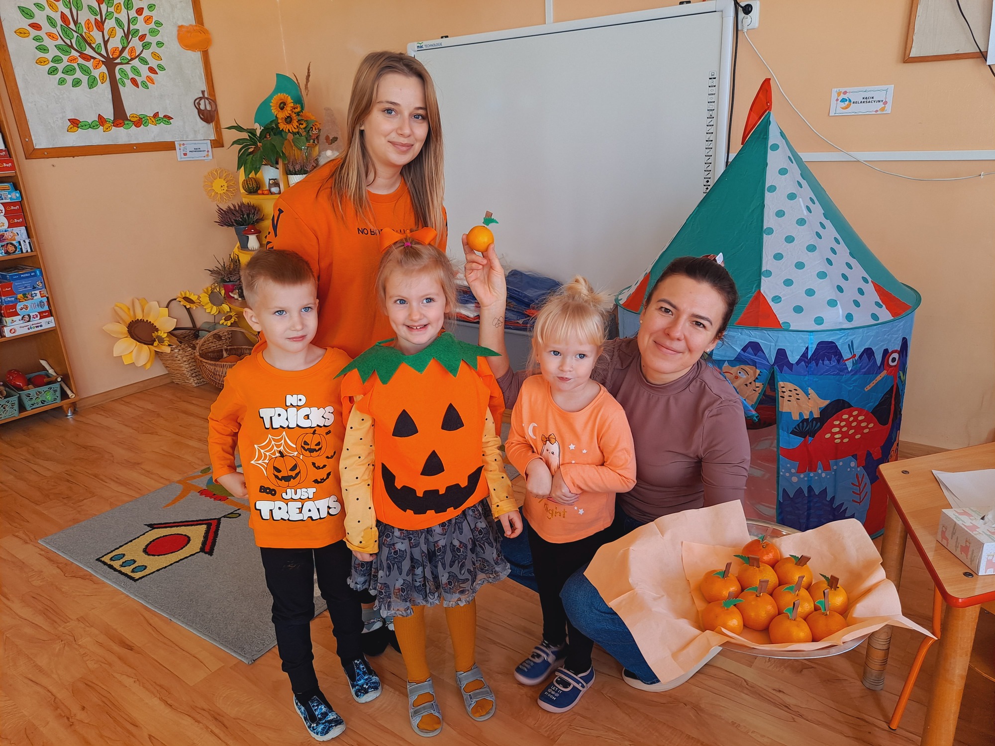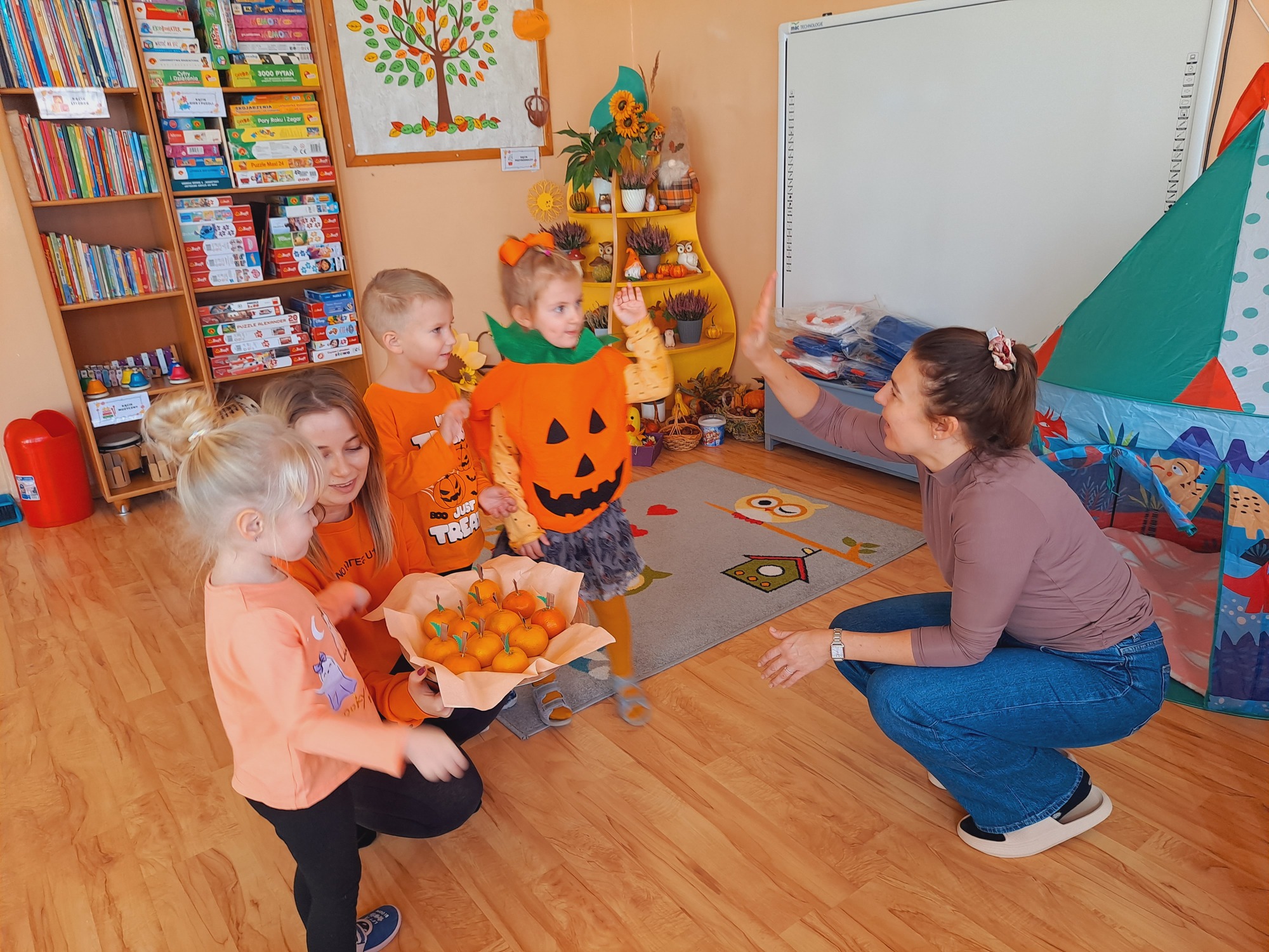 Dziś w naszym przedszkolu grupa „Pszczółek” świętowała Święto Dyni w wyjątkowy i pełen uśmiechu sposób. Dzieci, z wielkim zaangażowaniem i radością, wybrały się na spacer po przedszkolu, aby obdarować pracowników słodkimi „dyniami” – mandarynkami ozdobionymi tak, aby przypominały małe, jesienne dynie.