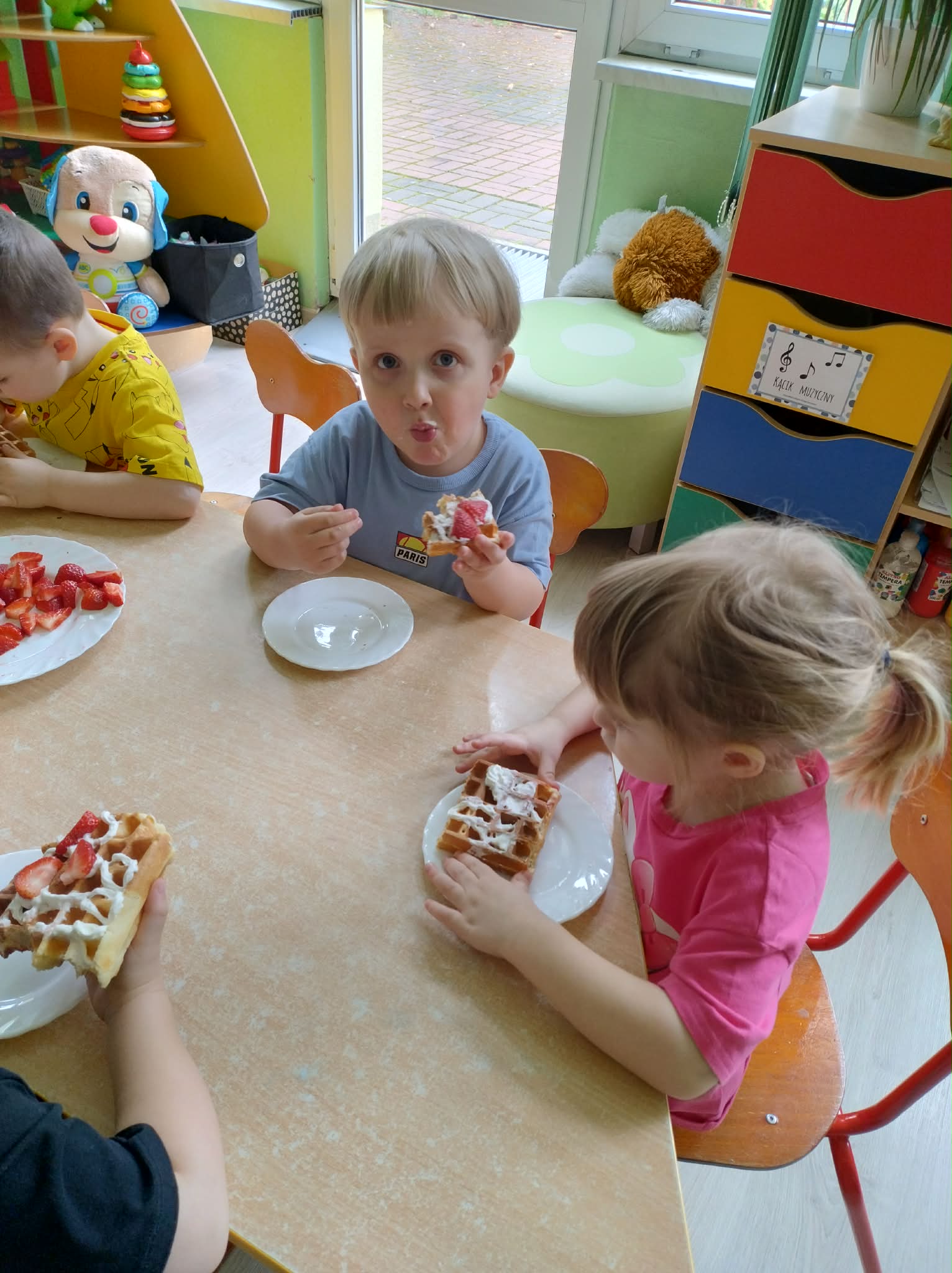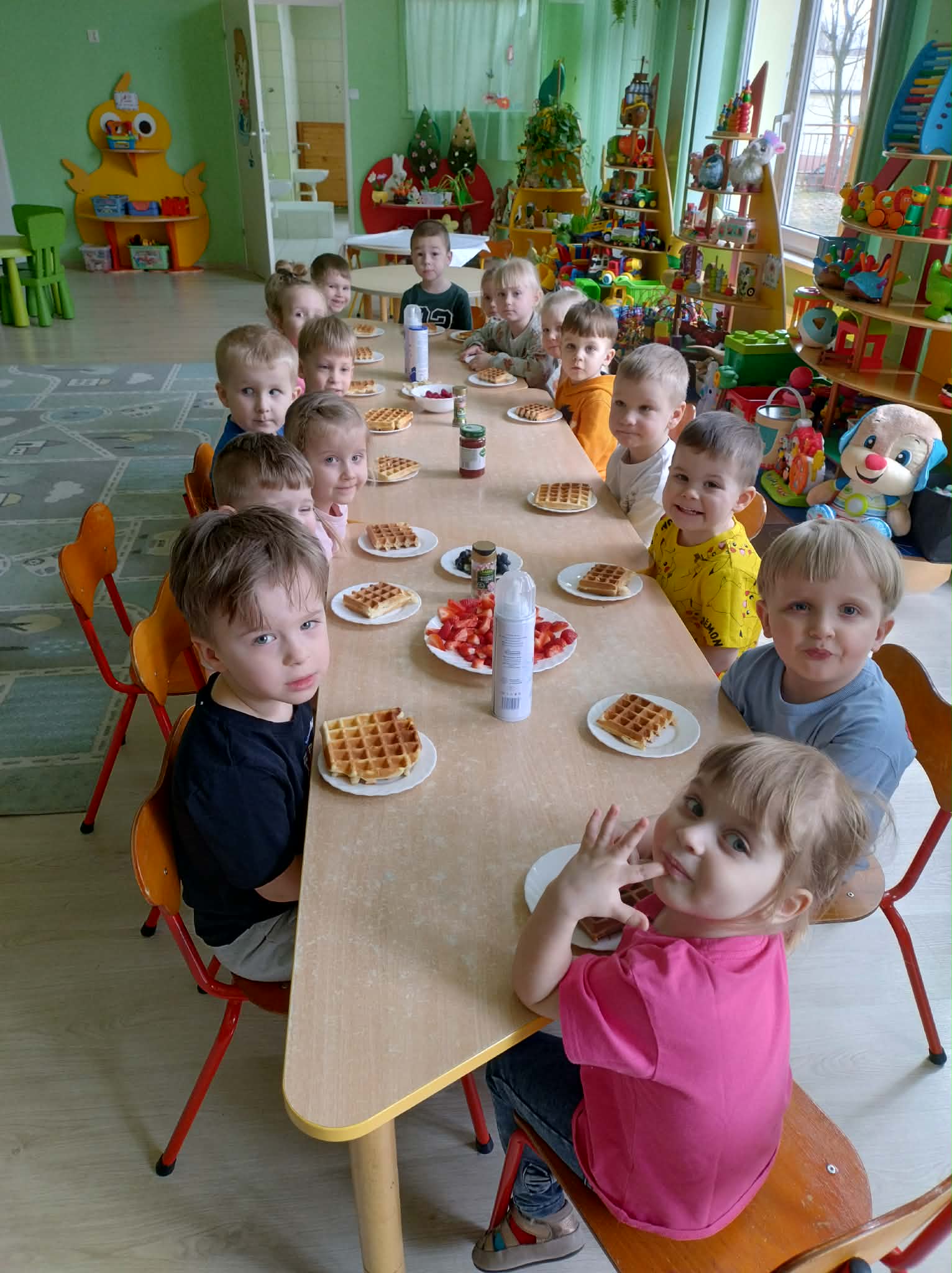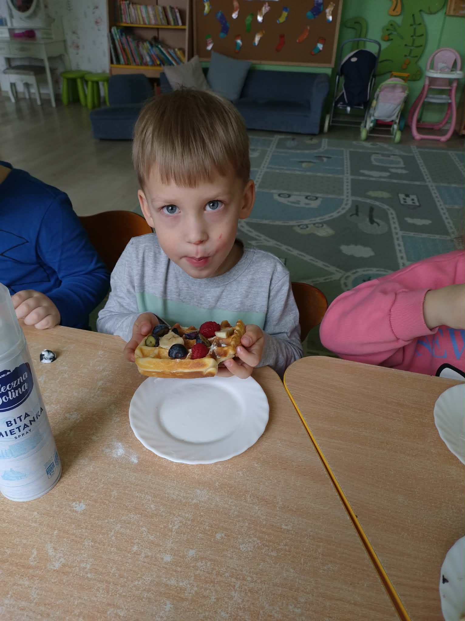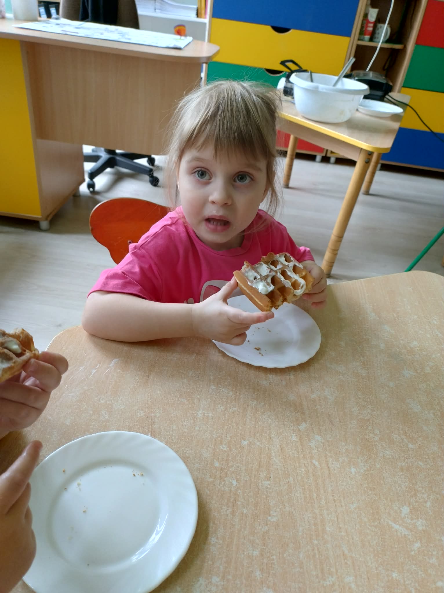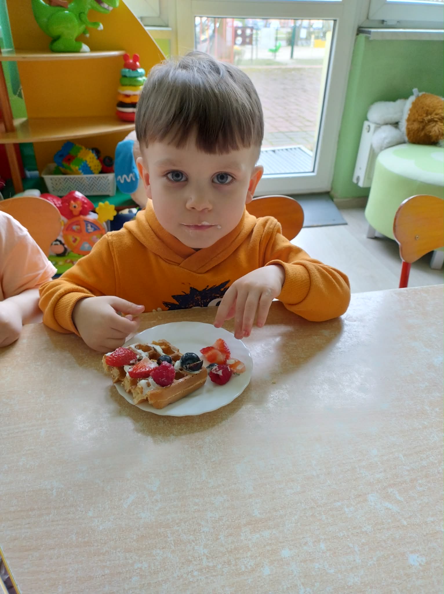 W naszej grupie odbył się wyjątkowy Dzień Gofra, który dostarczył dzieciom wielu radości i smakowitych wrażeń. Przedszkolaki miały okazję samodzielnie uczestniczyć w przygotowaniu gofrów – obserwowały kolejne etapy ich powstawania, a także pomagały w prostych czynnościach. Po upieczeniu przyszedł czas na najprzyjemniejszą część, czyli degustację. Dzieci dekorowały swoje gofry według własnych upodobań, wybierając spośród dodatków takich jak bita śmietana, dżem, cukier puder oraz świeże owoce. Każdy mógł stworzyć swojego wyjątkowego, kolorowego gofra. Na zakończenie dzieci wykonały pracę plastyczną – naklejały gotowe elementy, tworząc własnego gofra na wzór prawdziwego wypieku. Zajęcia rozwijały kreatywność, sprawność manualną oraz były doskonałą okazją do wspólnej zabawy. Dzień upłynął w bardzo radosnej i słodkiej atmosferze.