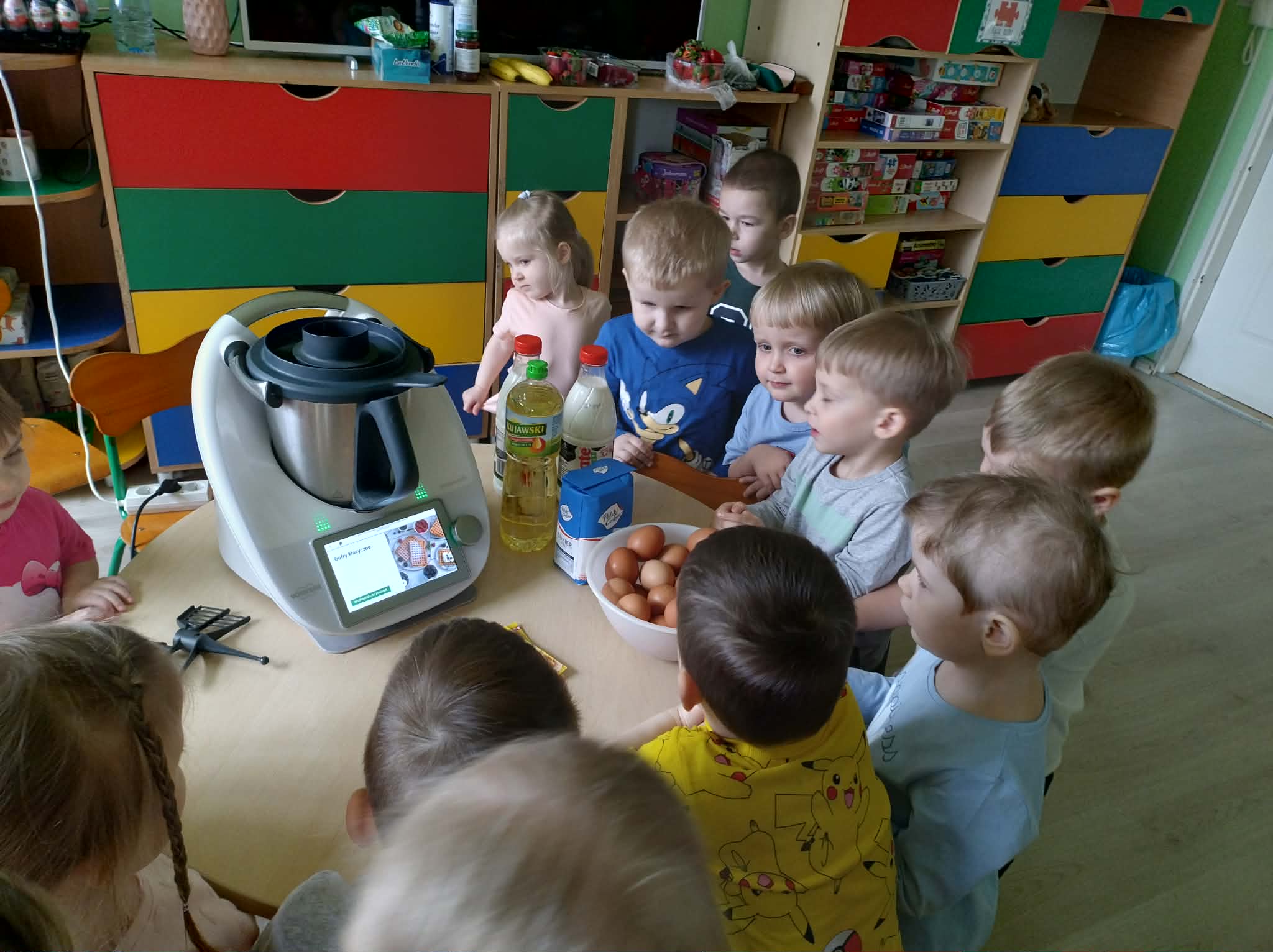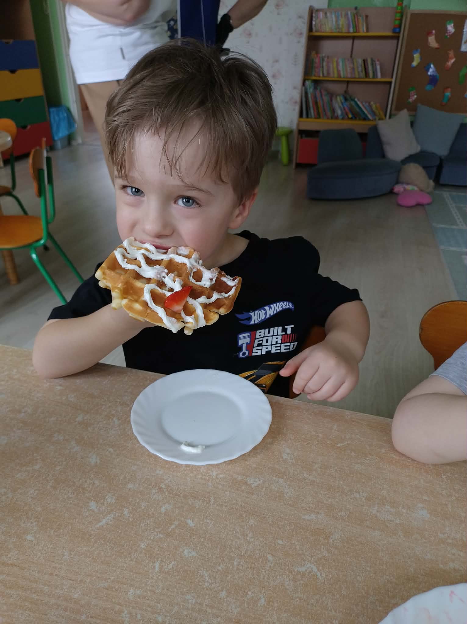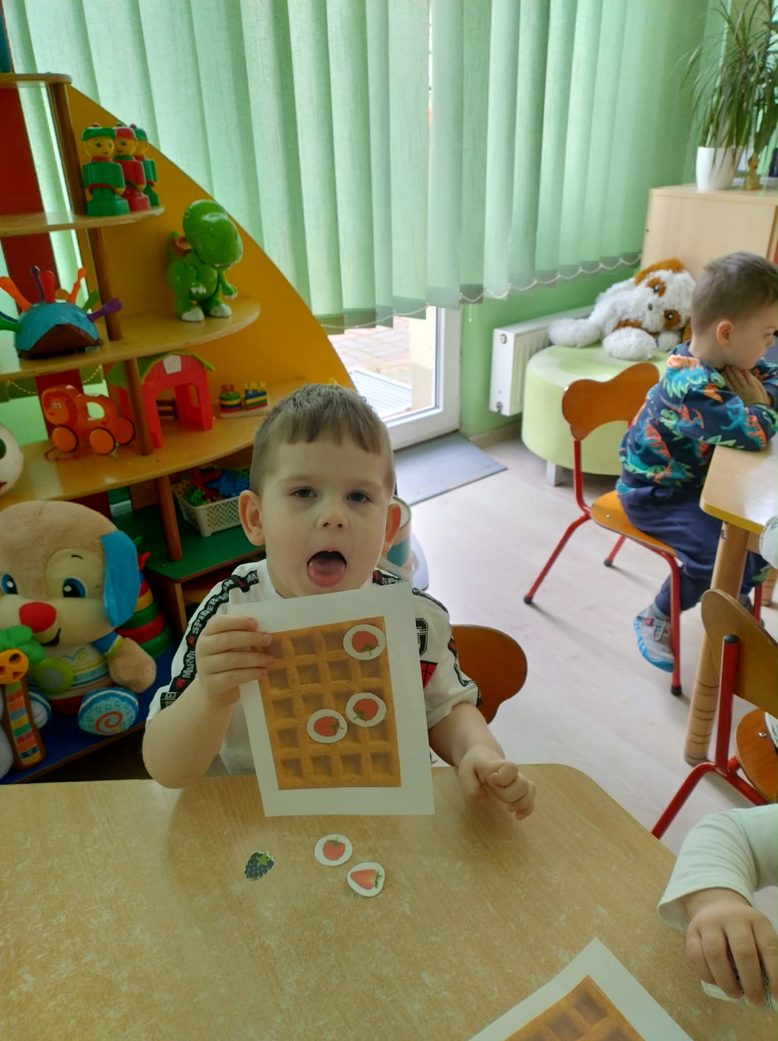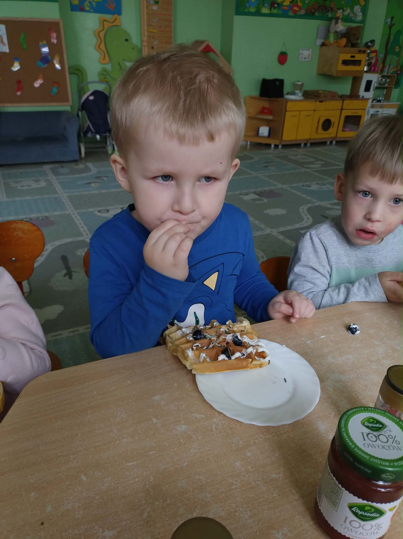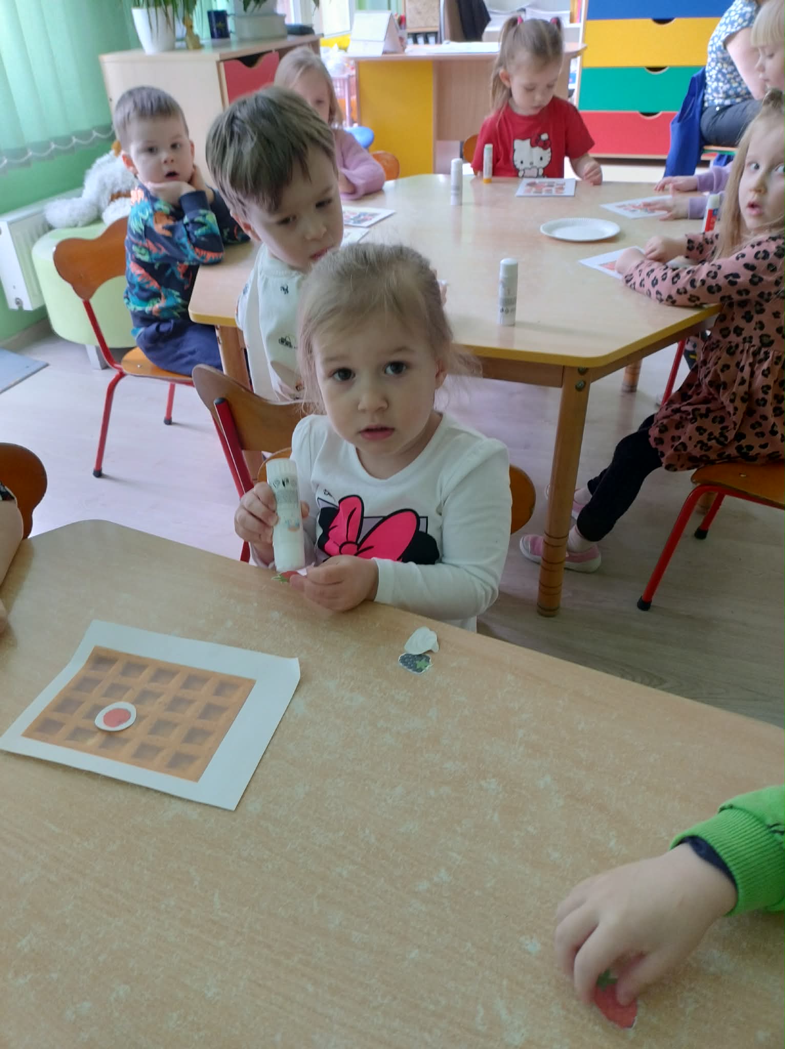 W naszej grupie odbył się wyjątkowy Dzień Gofra, który dostarczył dzieciom wielu radości i smakowitych wrażeń. Przedszkolaki miały okazję samodzielnie uczestniczyć w przygotowaniu gofrów – obserwowały kolejne etapy ich powstawania, a także pomagały w prostych czynnościach. Po upieczeniu przyszedł czas na najprzyjemniejszą część, czyli degustację. Dzieci dekorowały swoje gofry według własnych upodobań, wybierając spośród dodatków takich jak bita śmietana, dżem, cukier puder oraz świeże owoce. Każdy mógł stworzyć swojego wyjątkowego, kolorowego gofra. Na zakończenie dzieci wykonały pracę plastyczną – naklejały gotowe elementy, tworząc własnego gofra na wzór prawdziwego wypieku. Zajęcia rozwijały kreatywność, sprawność manualną oraz były doskonałą okazją do wspólnej zabawy. Dzień upłynął w bardzo radosnej i słodkiej atmosferze.