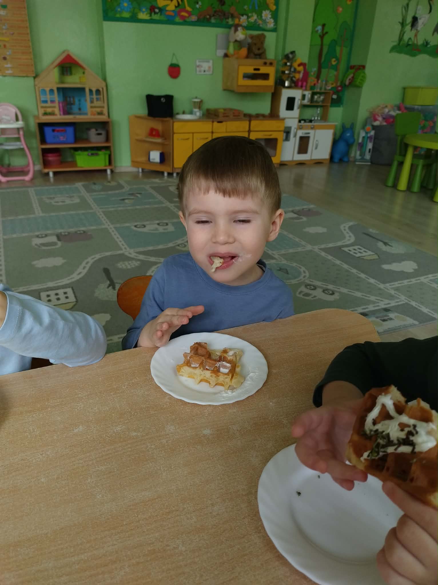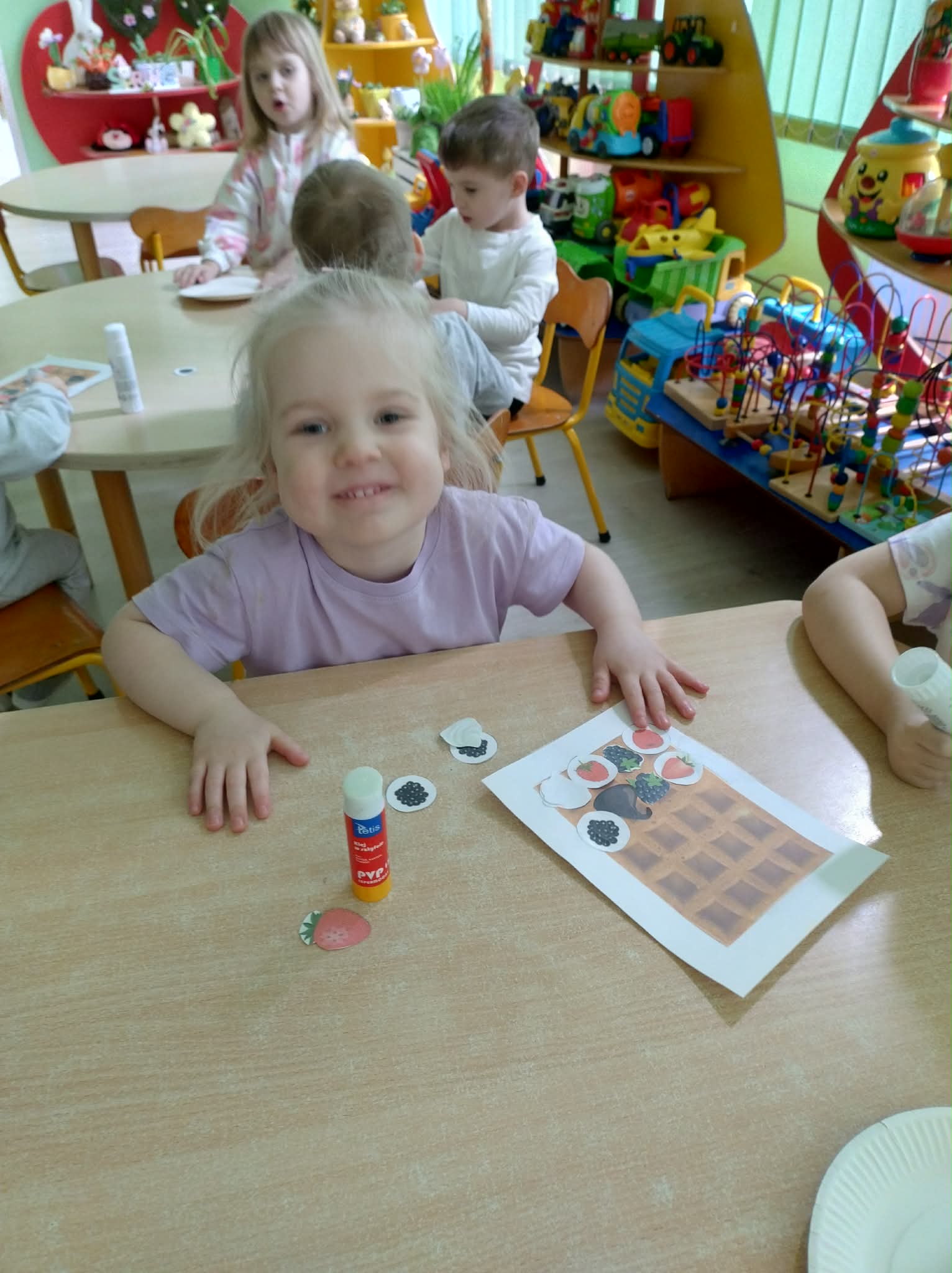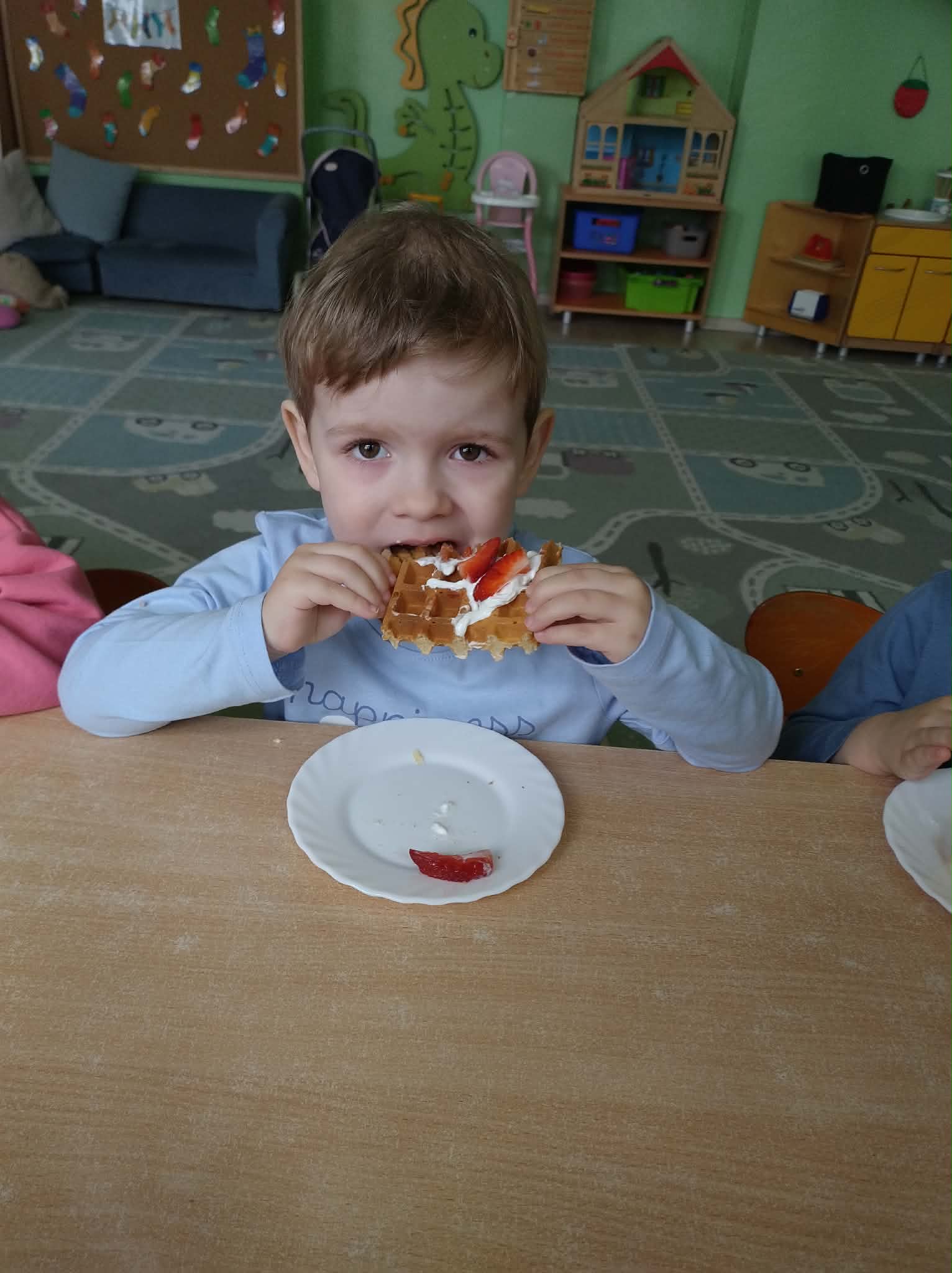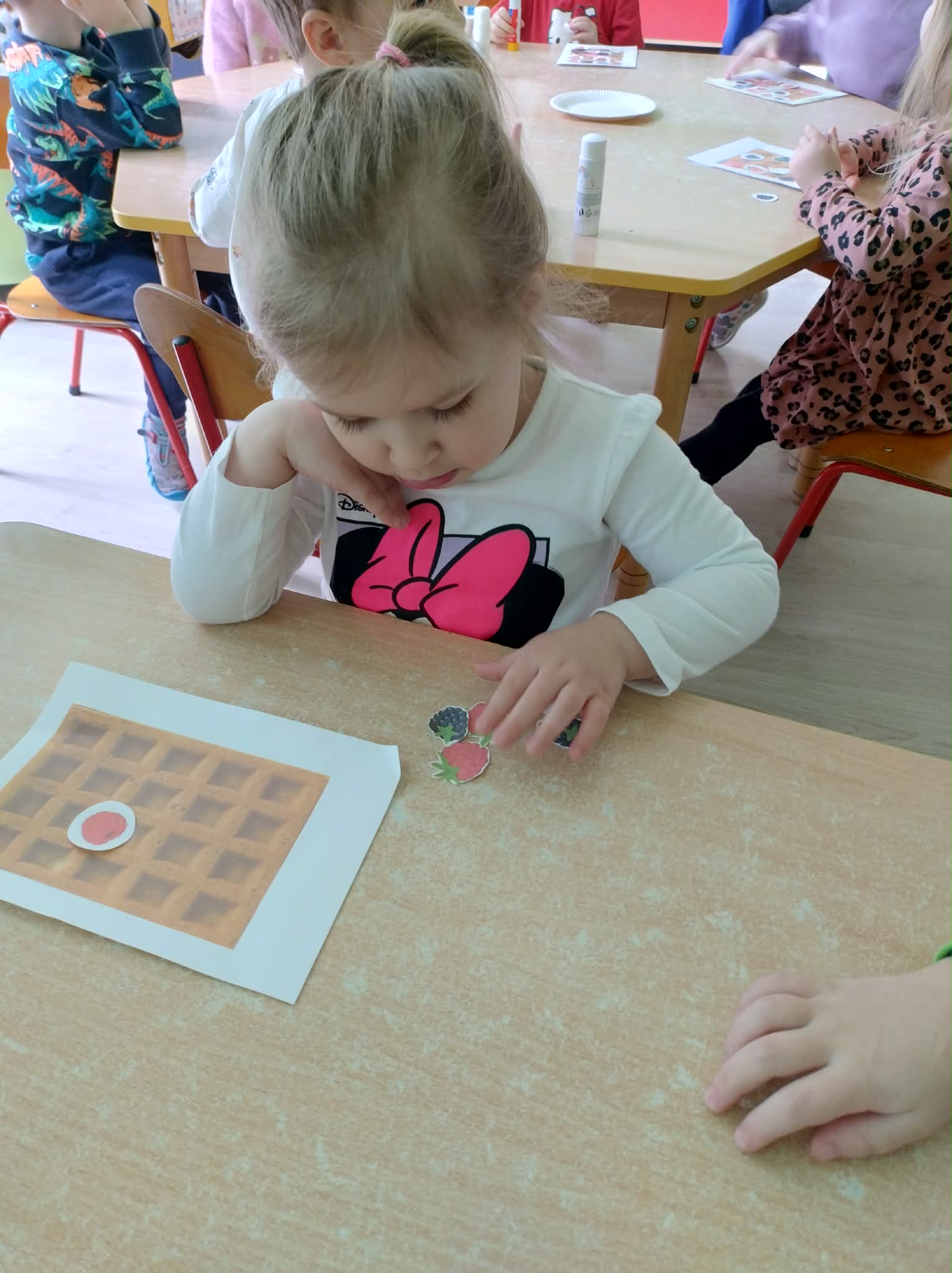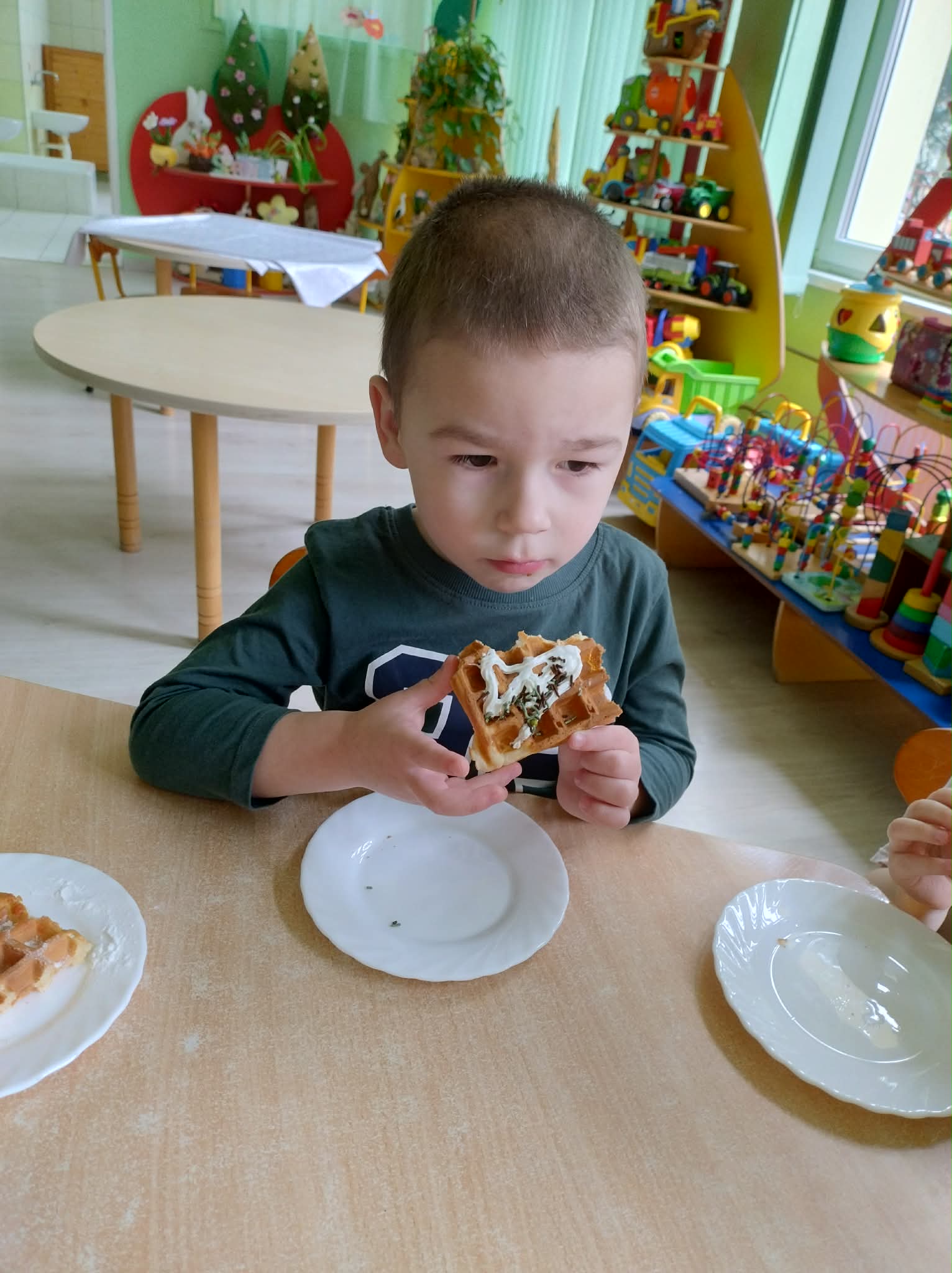 W naszej grupie odbył się wyjątkowy Dzień Gofra, który dostarczył dzieciom wielu radości i smakowitych wrażeń. Przedszkolaki miały okazję samodzielnie uczestniczyć w przygotowaniu gofrów – obserwowały kolejne etapy ich powstawania, a także pomagały w prostych czynnościach. Po upieczeniu przyszedł czas na najprzyjemniejszą część, czyli degustację. Dzieci dekorowały swoje gofry według własnych upodobań, wybierając spośród dodatków takich jak bita śmietana, dżem, cukier puder oraz świeże owoce. Każdy mógł stworzyć swojego wyjątkowego, kolorowego gofra. Na zakończenie dzieci wykonały pracę plastyczną – naklejały gotowe elementy, tworząc własnego gofra na wzór prawdziwego wypieku. Zajęcia rozwijały kreatywność, sprawność manualną oraz były doskonałą okazją do wspólnej zabawy. Dzień upłynął w bardzo radosnej i słodkiej atmosferze.