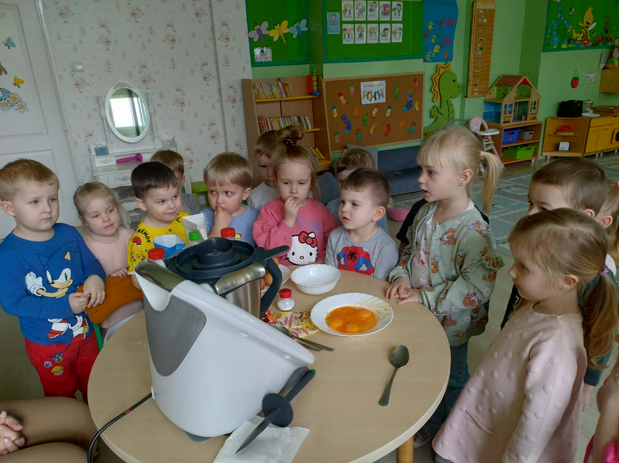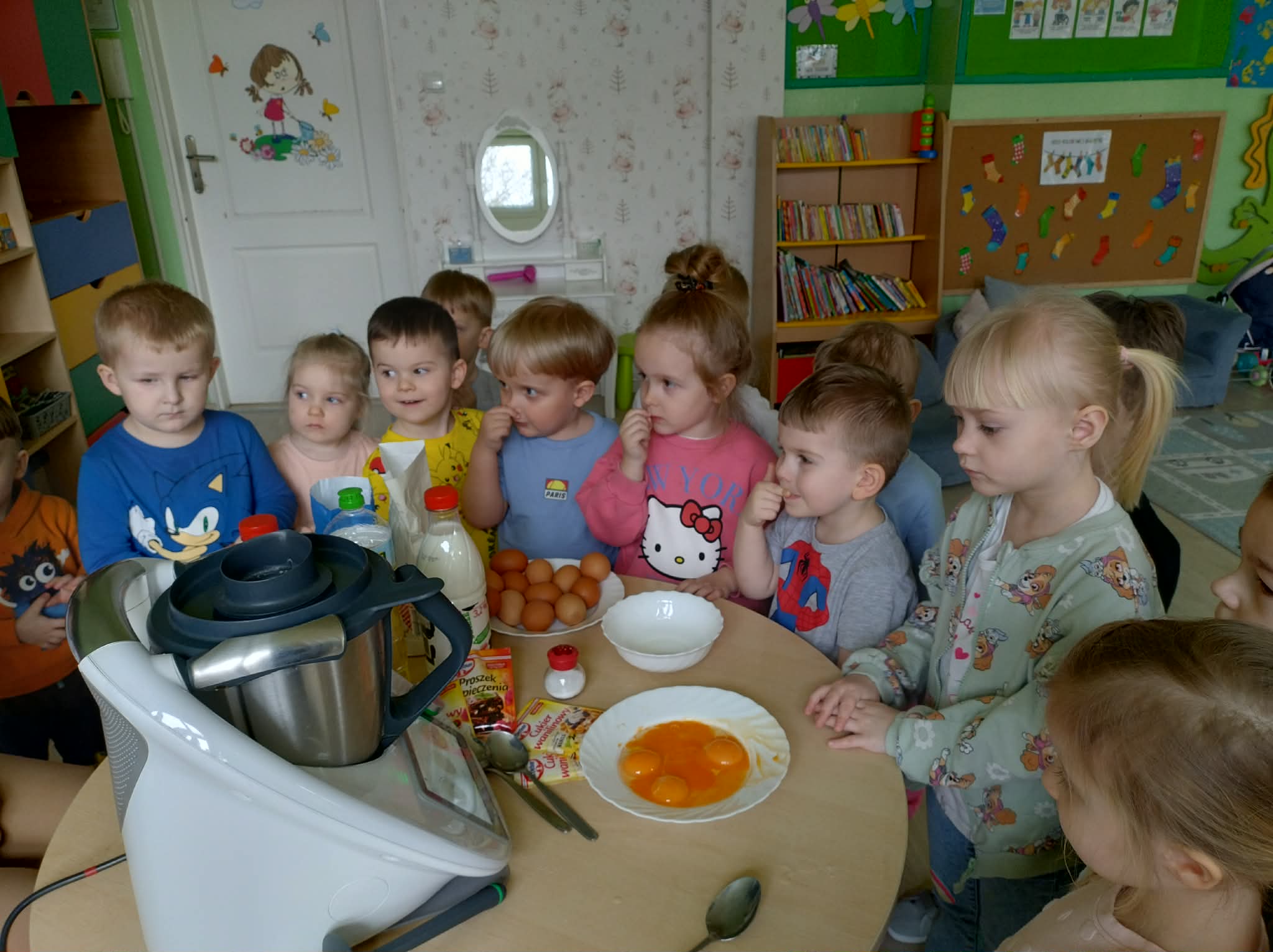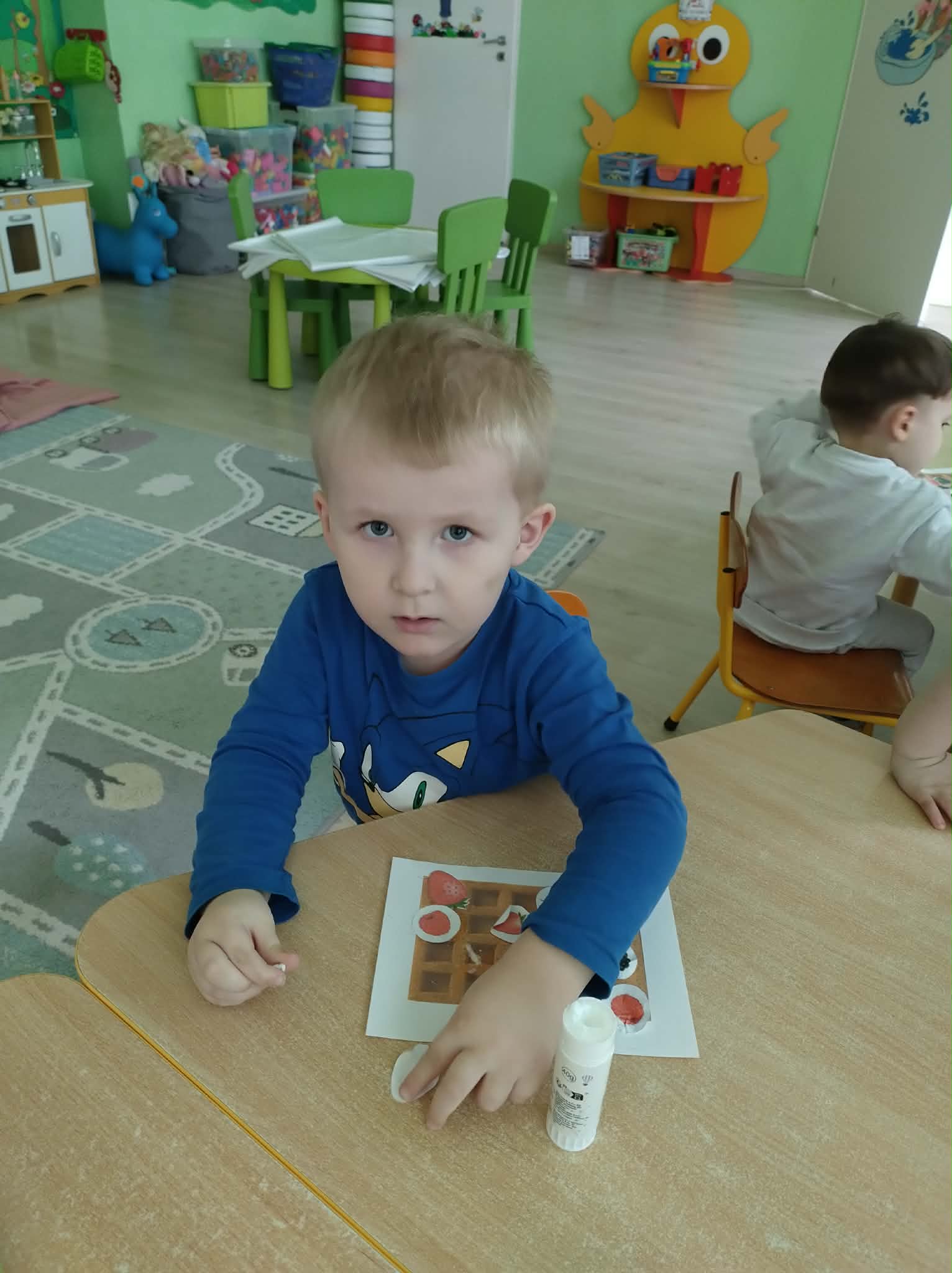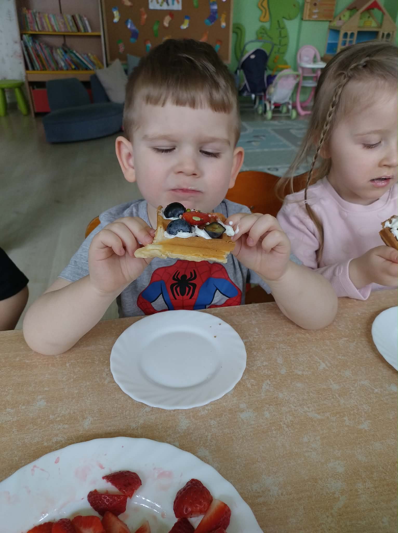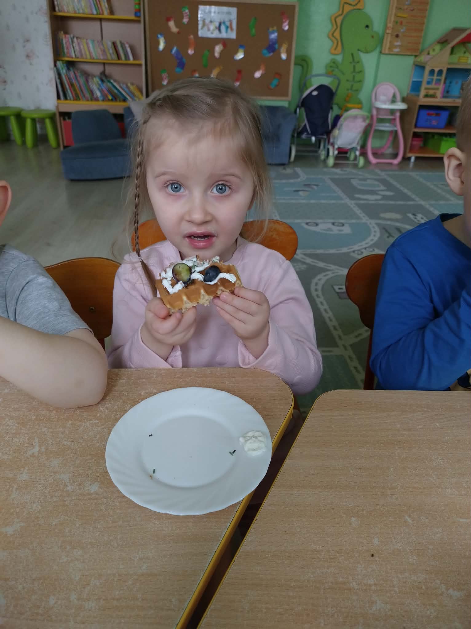 W naszej grupie odbył się wyjątkowy Dzień Gofra, który dostarczył dzieciom wielu radości i smakowitych wrażeń. Przedszkolaki miały okazję samodzielnie uczestniczyć w przygotowaniu gofrów – obserwowały kolejne etapy ich powstawania, a także pomagały w prostych czynnościach. Po upieczeniu przyszedł czas na najprzyjemniejszą część, czyli degustację. Dzieci dekorowały swoje gofry według własnych upodobań, wybierając spośród dodatków takich jak bita śmietana, dżem, cukier puder oraz świeże owoce. Każdy mógł stworzyć swojego wyjątkowego, kolorowego gofra. Na zakończenie dzieci wykonały pracę plastyczną – naklejały gotowe elementy, tworząc własnego gofra na wzór prawdziwego wypieku. Zajęcia rozwijały kreatywność, sprawność manualną oraz były doskonałą okazją do wspólnej zabawy. Dzień upłynął w bardzo radosnej i słodkiej atmosferze.