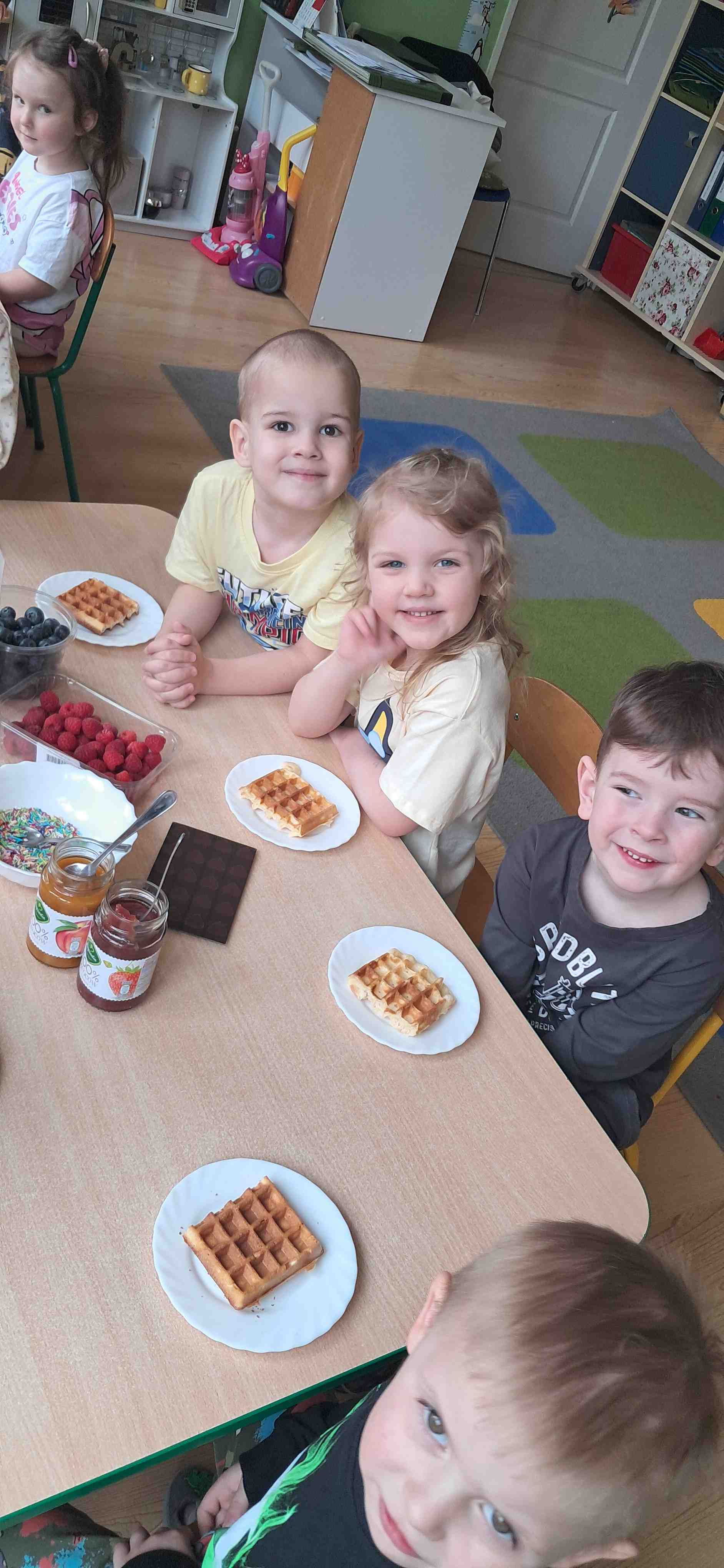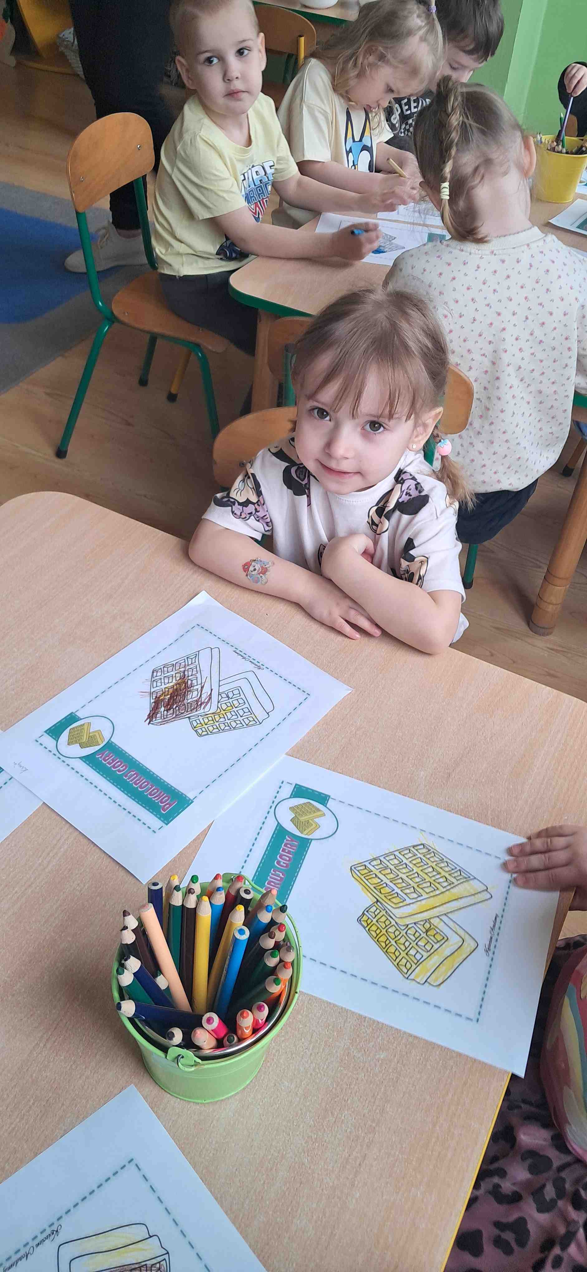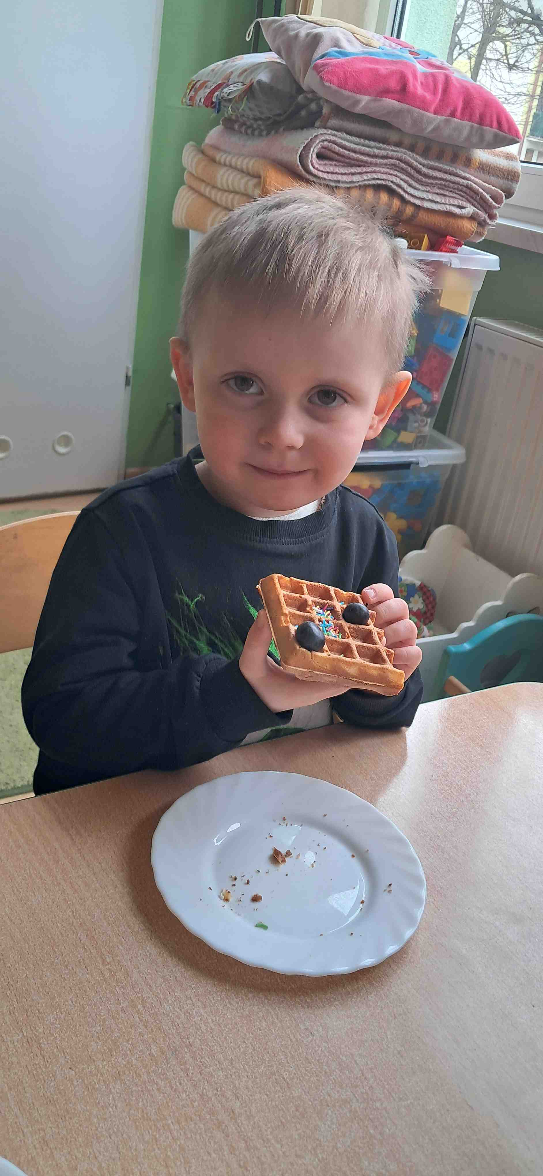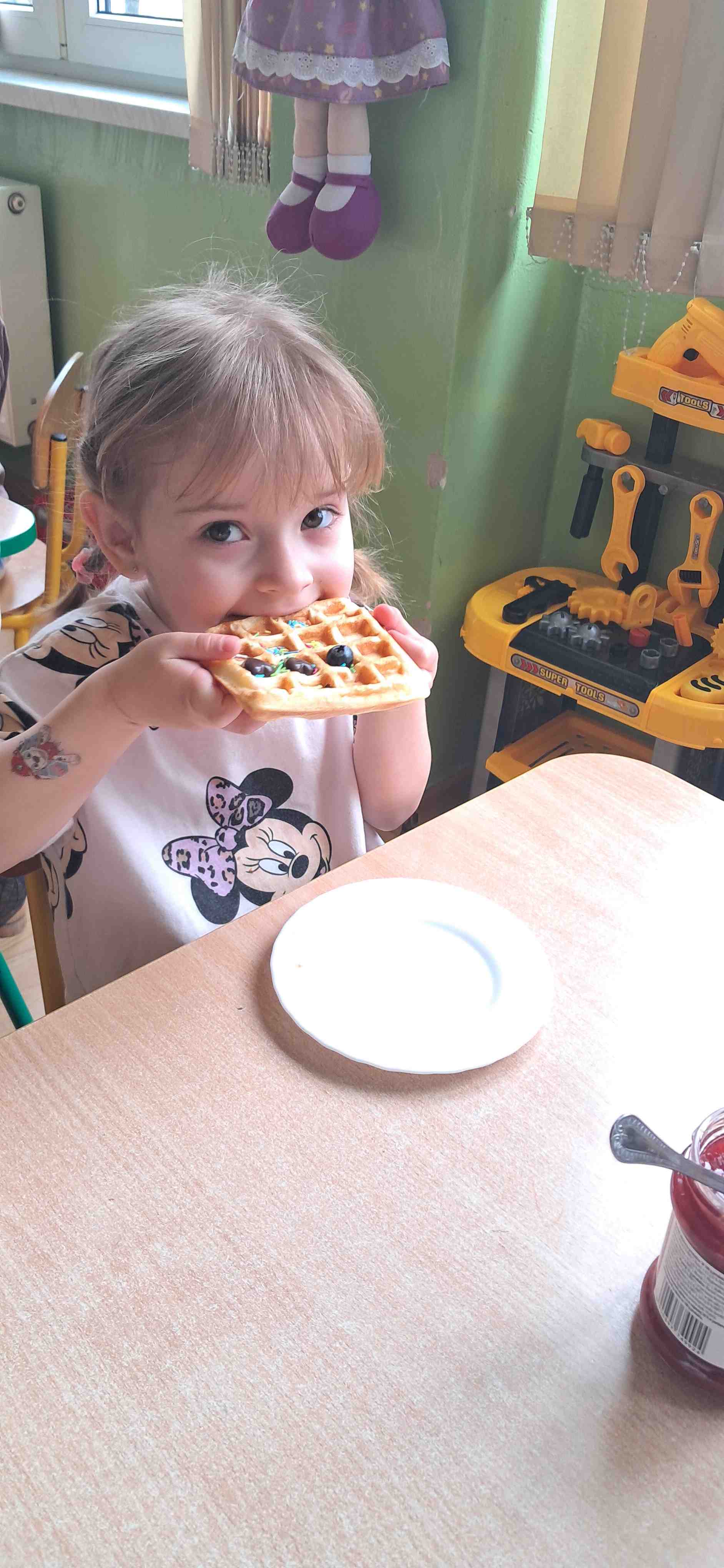 W naszej grupie odbył się wyjątkowy Dzień Gofra, który dostarczył dzieciom wielu radości i smakowitych wrażeń. Przedszkolaki miały okazję samodzielnie uczestniczyć w przygotowaniu gofrów – obserwowały kolejne etapy ich powstawania, a także pomagały w prostych czynnościach. Po upieczeniu przyszedł czas na najprzyjemniejszą część, czyli degustację. Dzieci dekorowały swoje gofry według własnych upodobań, wybierając spośród dodatków takich jak bita śmietana, dżem, cukier puder oraz świeże owoce. Każdy mógł stworzyć swojego wyjątkowego, kolorowego gofra. Na zakończenie dzieci wykonały pracę plastyczną – naklejały gotowe elementy, tworząc własnego gofra na wzór prawdziwego wypieku. Zajęcia rozwijały kreatywność, sprawność manualną oraz były doskonałą okazją do wspólnej zabawy. Dzień upłynął w bardzo radosnej i słodkiej atmosferze.