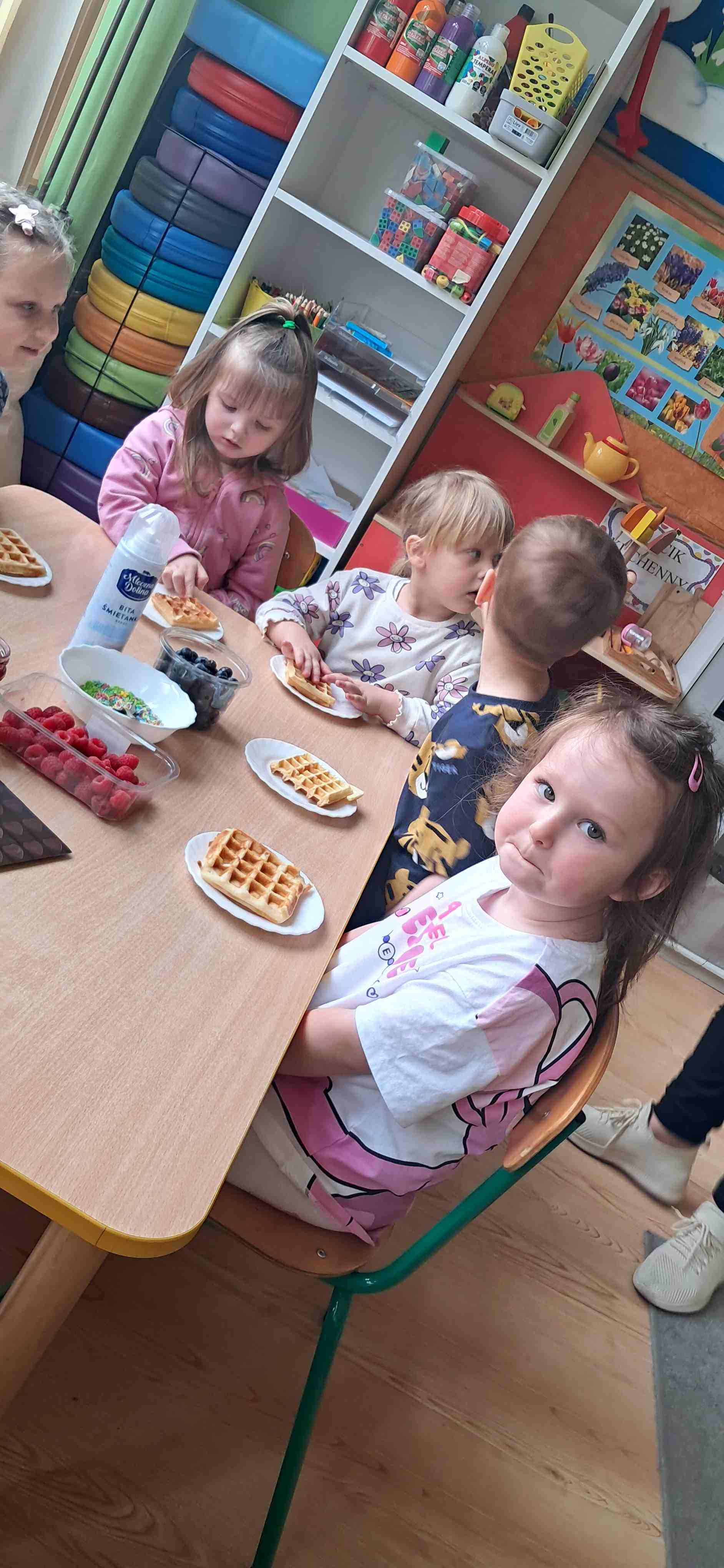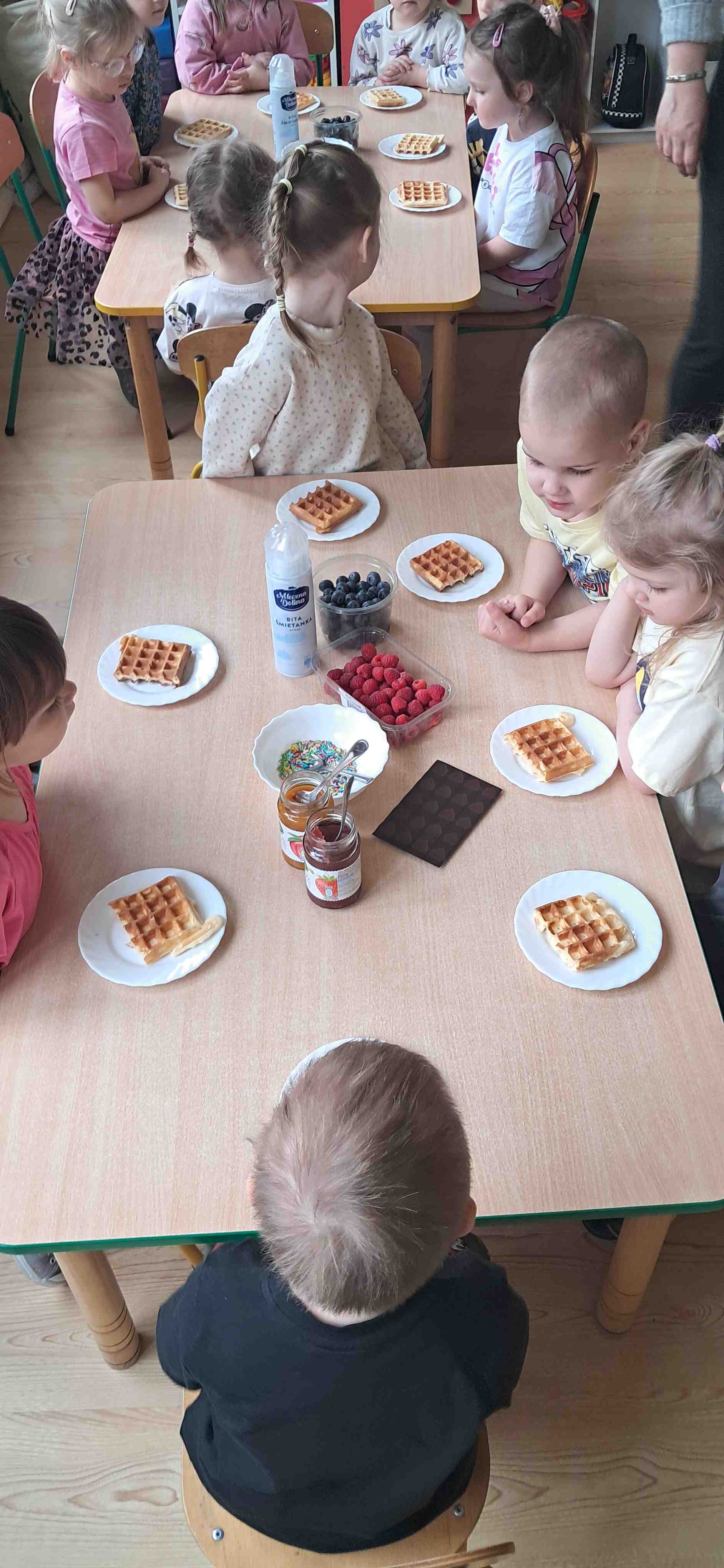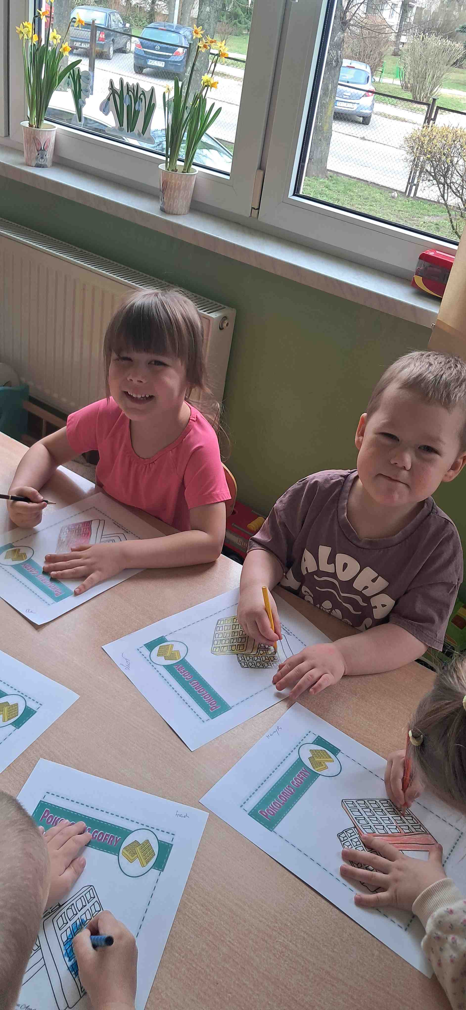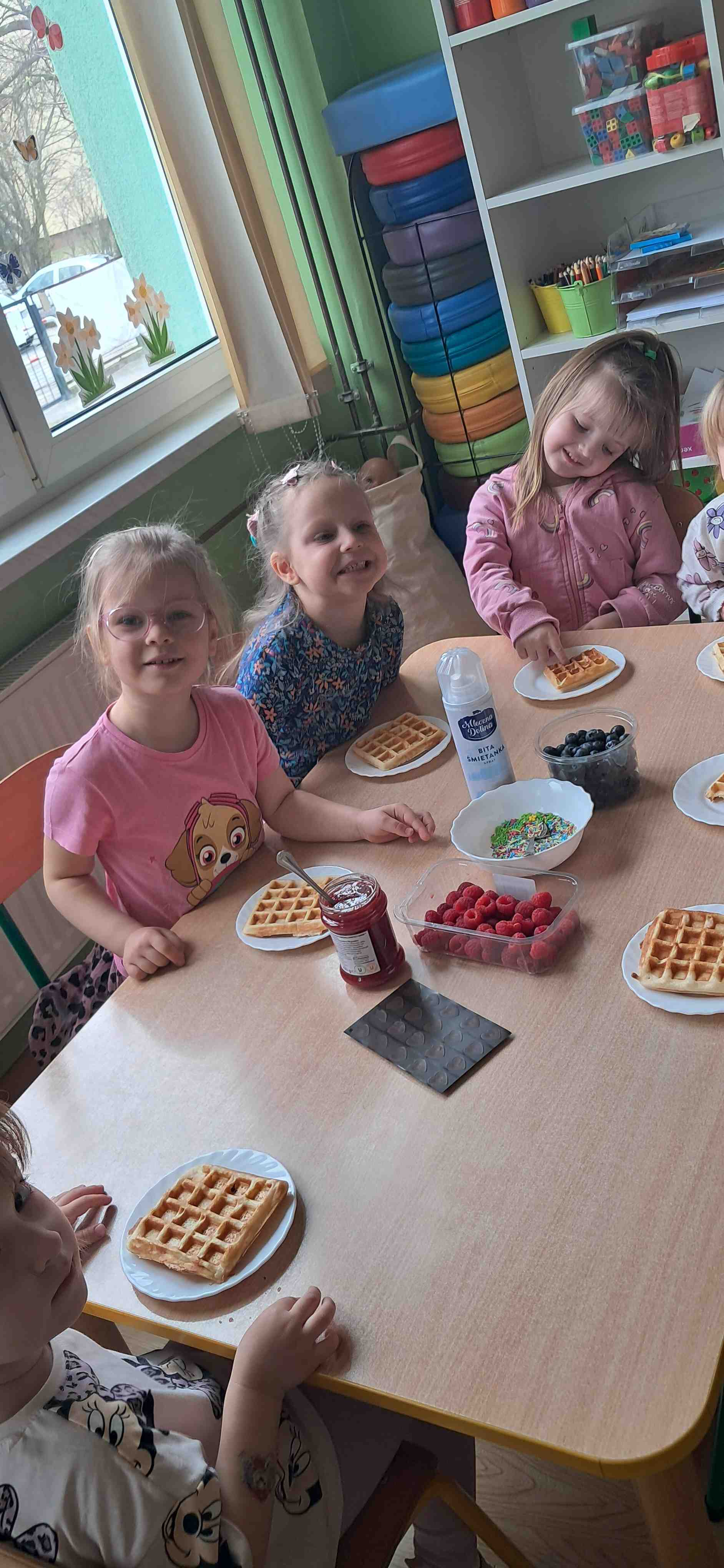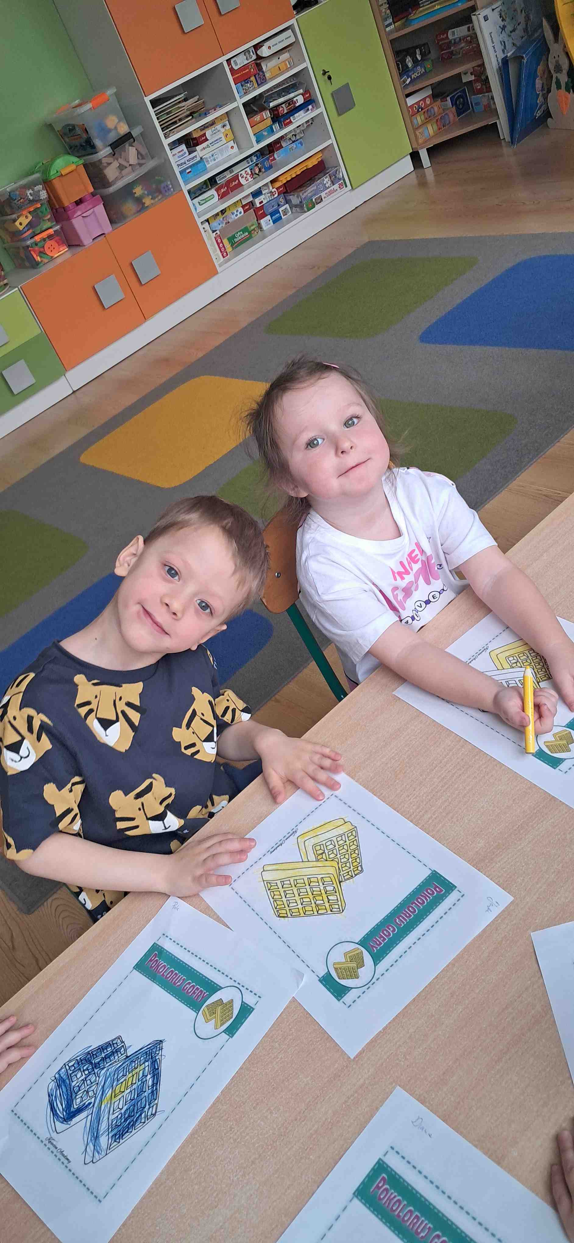 W naszej grupie odbył się wyjątkowy Dzień Gofra, który dostarczył dzieciom wielu radości i smakowitych wrażeń. Przedszkolaki miały okazję samodzielnie uczestniczyć w przygotowaniu gofrów – obserwowały kolejne etapy ich powstawania, a także pomagały w prostych czynnościach. Po upieczeniu przyszedł czas na najprzyjemniejszą część, czyli degustację. Dzieci dekorowały swoje gofry według własnych upodobań, wybierając spośród dodatków takich jak bita śmietana, dżem, cukier puder oraz świeże owoce. Każdy mógł stworzyć swojego wyjątkowego, kolorowego gofra. Na zakończenie dzieci wykonały pracę plastyczną – naklejały gotowe elementy, tworząc własnego gofra na wzór prawdziwego wypieku. Zajęcia rozwijały kreatywność, sprawność manualną oraz były doskonałą okazją do wspólnej zabawy. Dzień upłynął w bardzo radosnej i słodkiej atmosferze.
