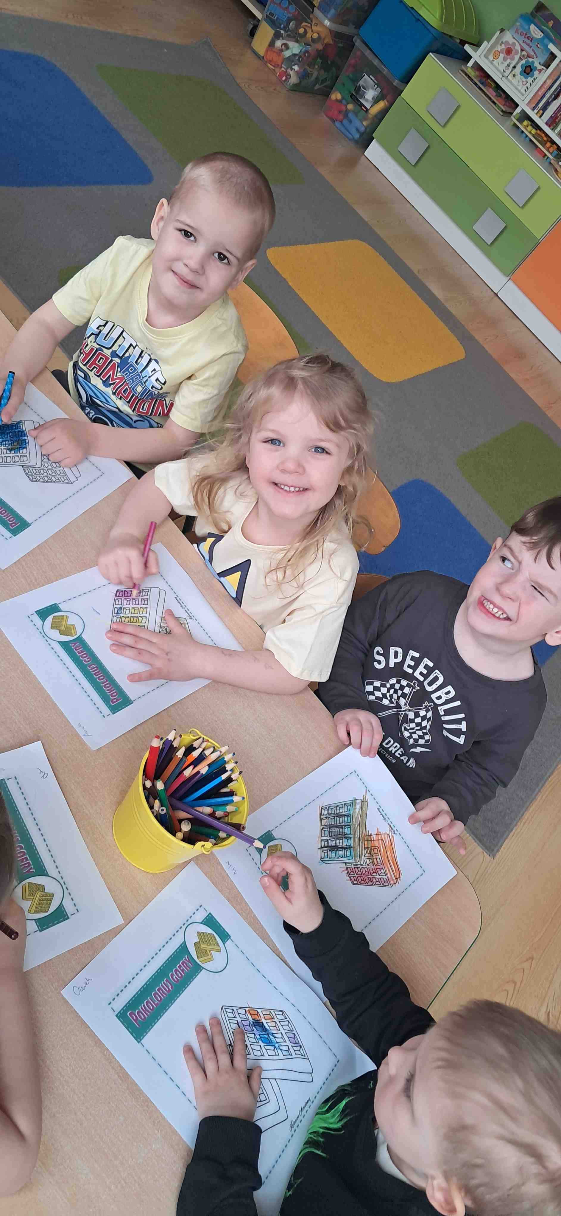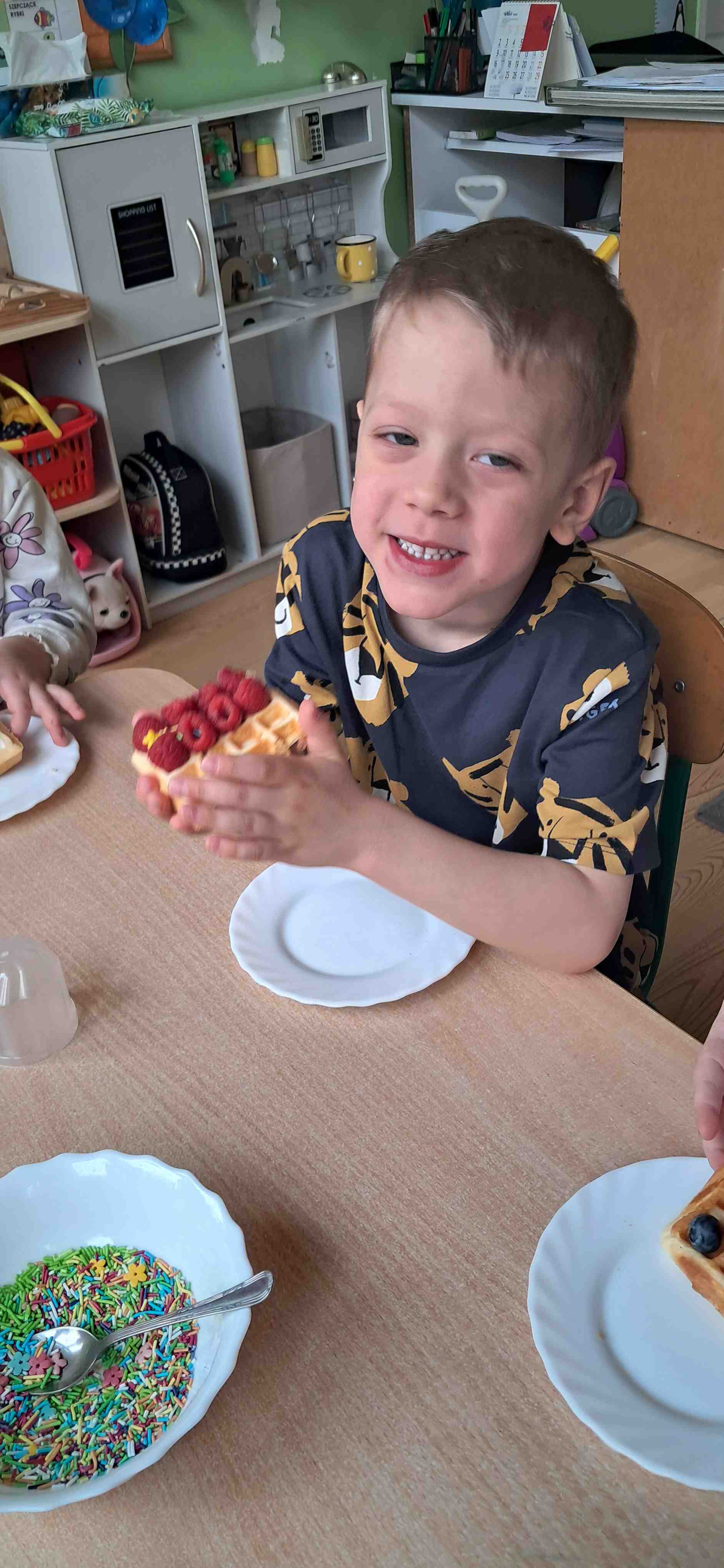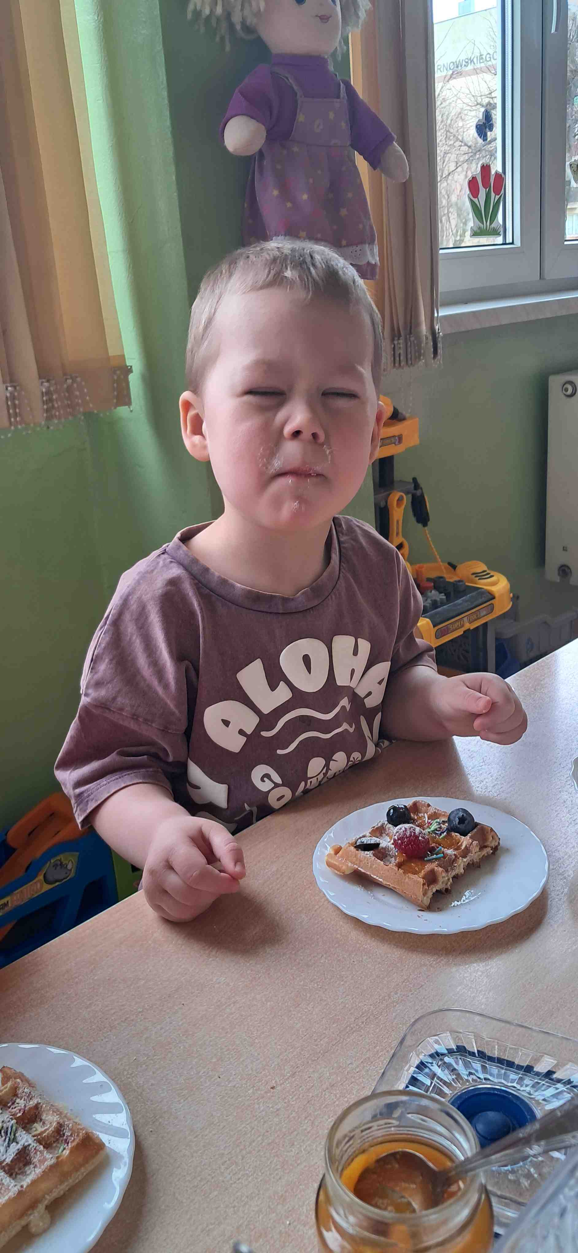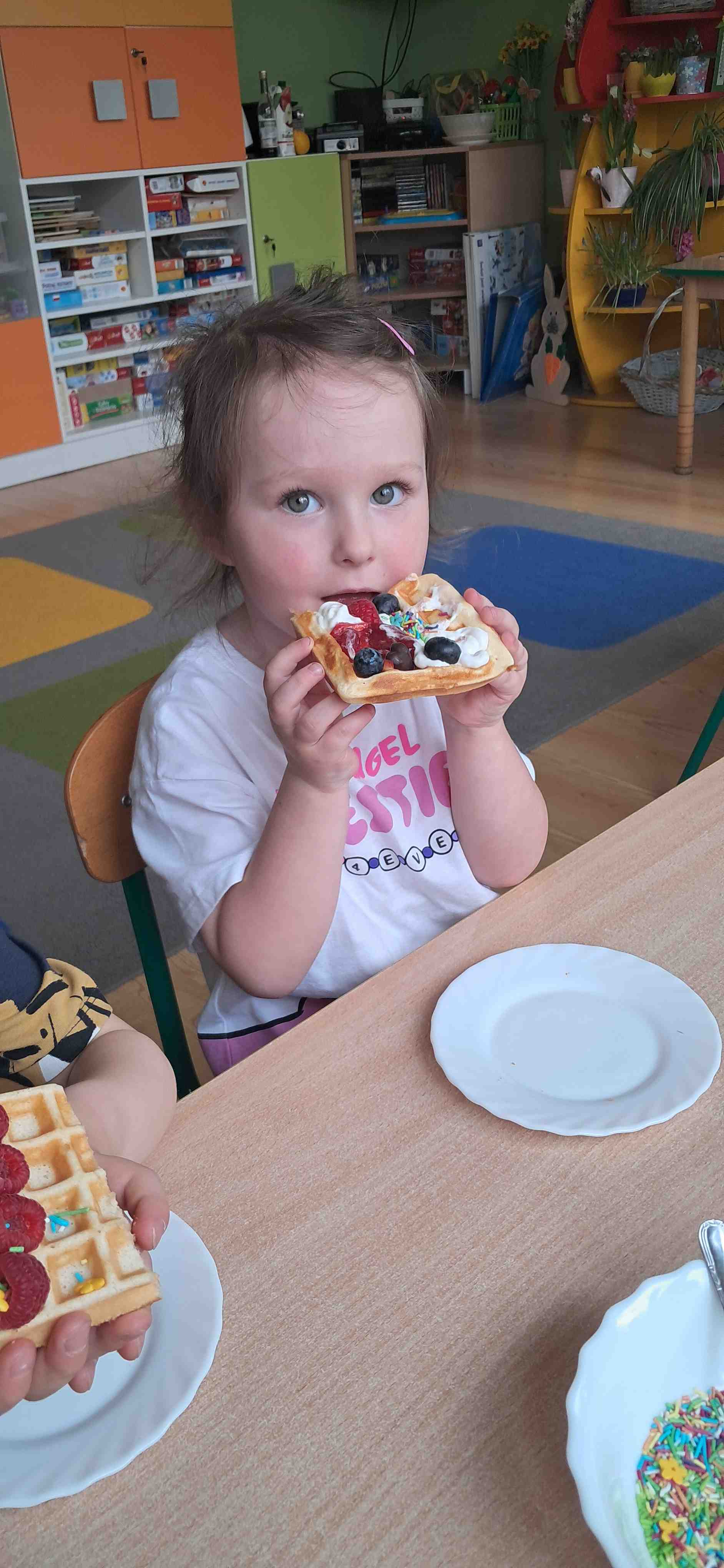 W naszej grupie odbył się wyjątkowy Dzień Gofra, który dostarczył dzieciom wielu radości i smakowitych wrażeń. Przedszkolaki miały okazję samodzielnie uczestniczyć w przygotowaniu gofrów – obserwowały kolejne etapy ich powstawania, a także pomagały w prostych czynnościach. Po upieczeniu przyszedł czas na najprzyjemniejszą część, czyli degustację. Dzieci dekorowały swoje gofry według własnych upodobań, wybierając spośród dodatków takich jak bita śmietana, dżem, cukier puder oraz świeże owoce. Każdy mógł stworzyć swojego wyjątkowego, kolorowego gofra. Na zakończenie dzieci wykonały pracę plastyczną – naklejały gotowe elementy, tworząc własnego gofra na wzór prawdziwego wypieku. Zajęcia rozwijały kreatywność, sprawność manualną oraz były doskonałą okazją do wspólnej zabawy. Dzień upłynął w bardzo radosnej i słodkiej atmosferze.
