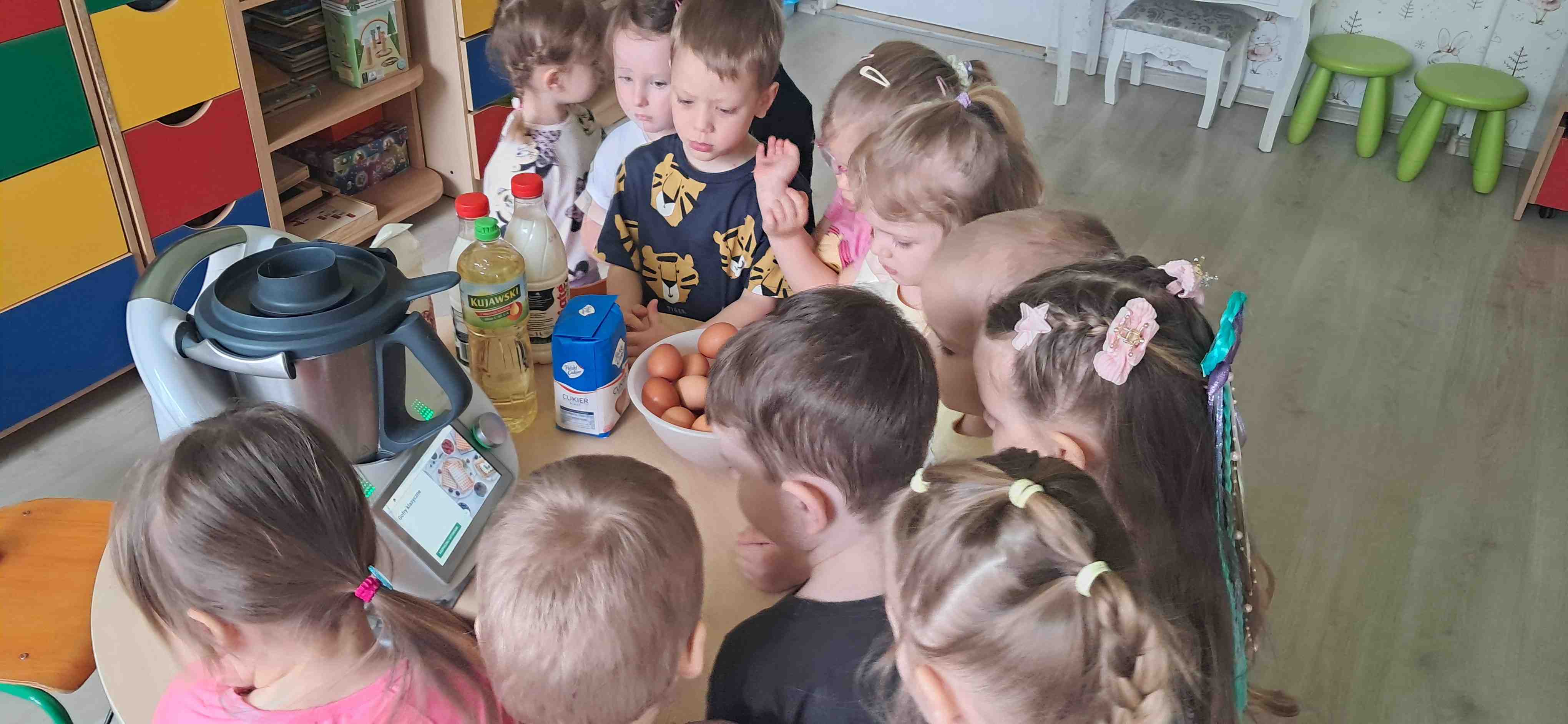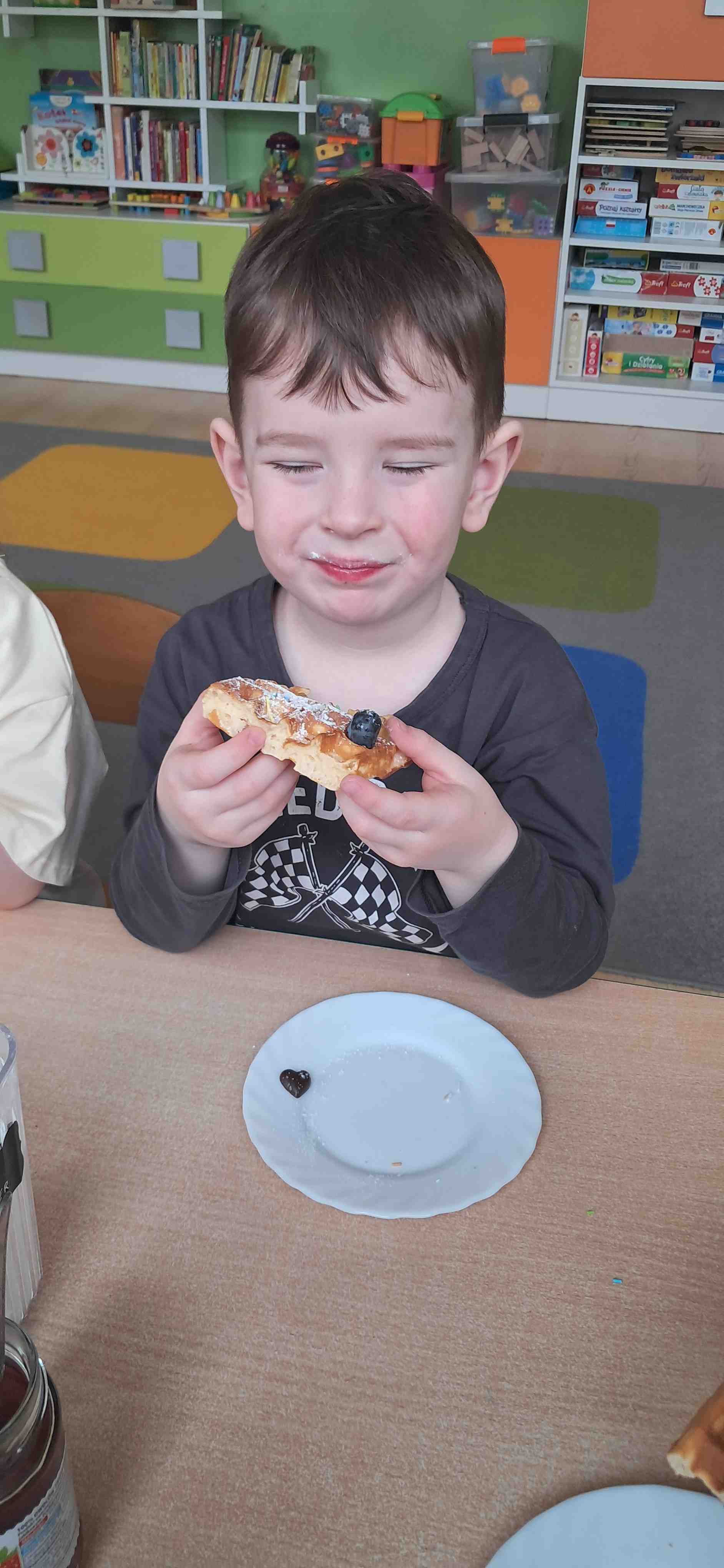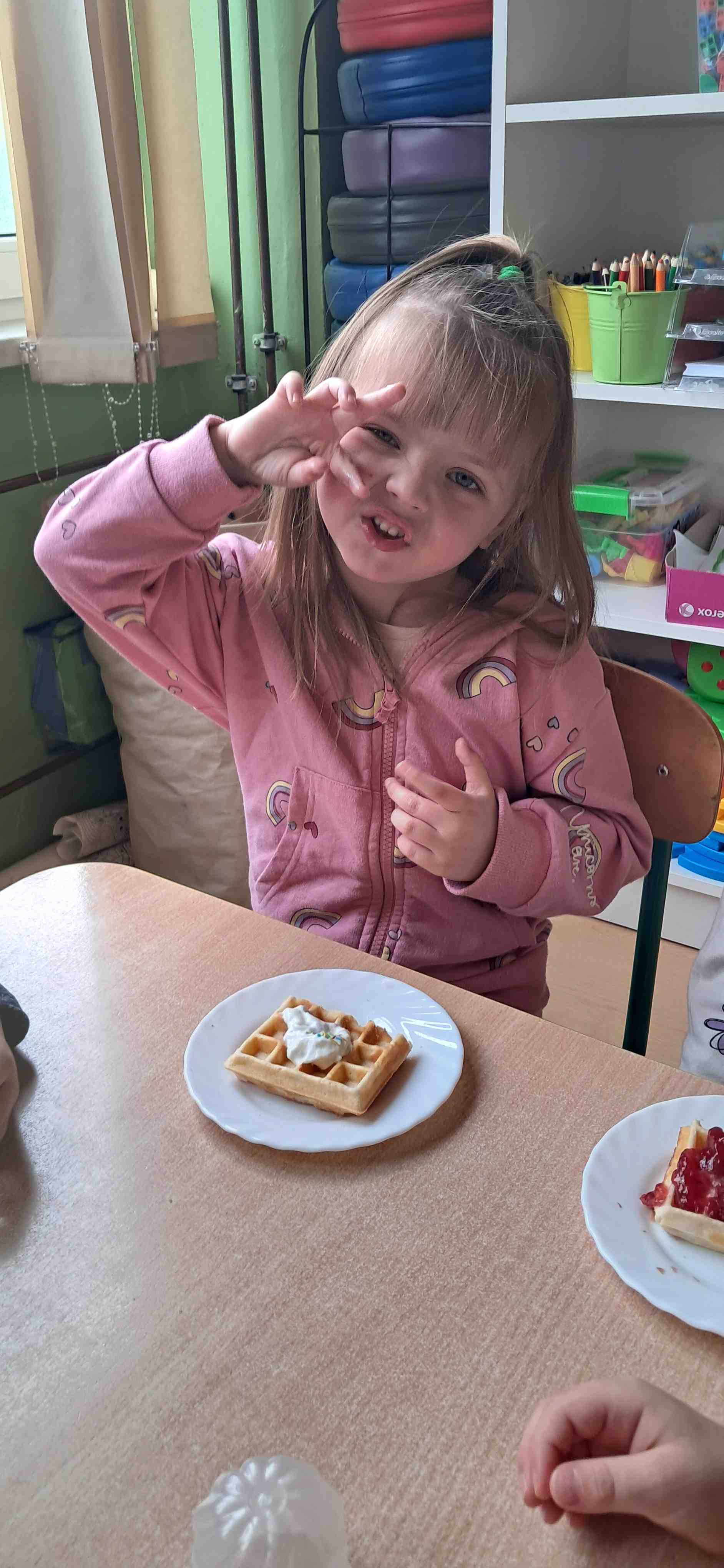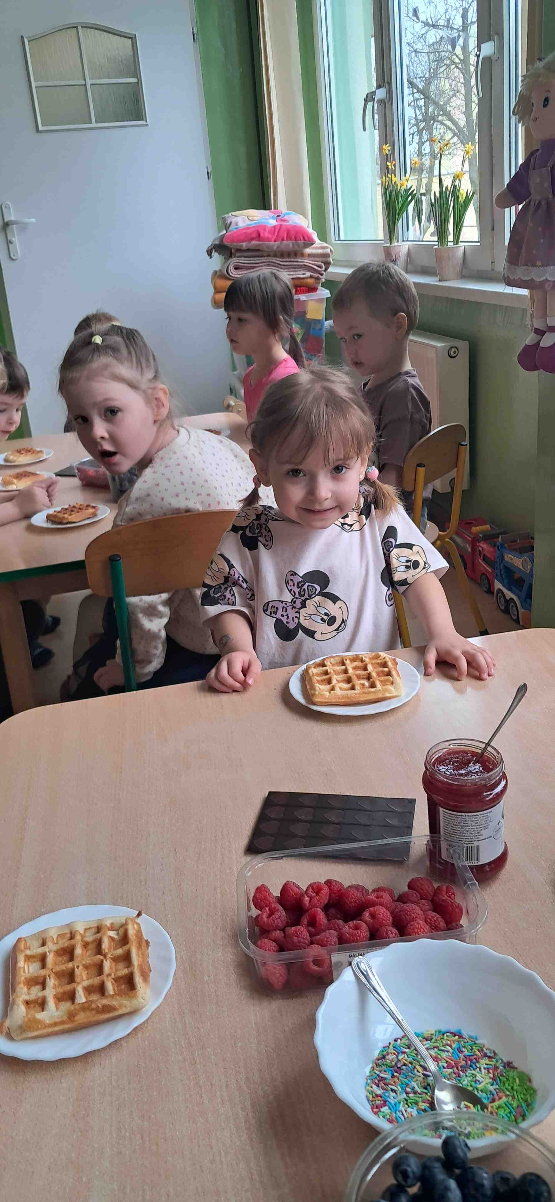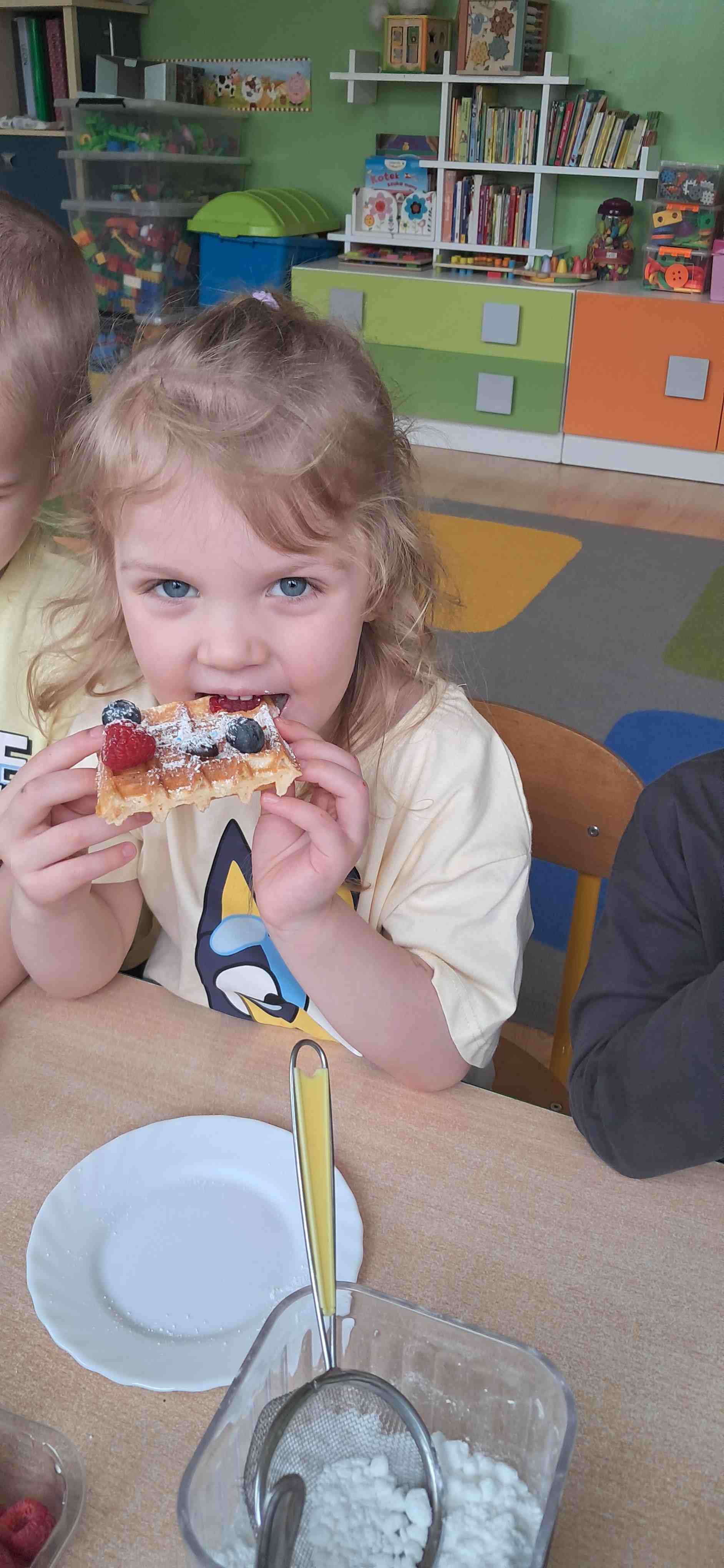 W naszej grupie odbył się wyjątkowy Dzień Gofra, który dostarczył dzieciom wielu radości i smakowitych wrażeń. Przedszkolaki miały okazję samodzielnie uczestniczyć w przygotowaniu gofrów – obserwowały kolejne etapy ich powstawania, a także pomagały w prostych czynnościach. Po upieczeniu przyszedł czas na najprzyjemniejszą część, czyli degustację. Dzieci dekorowały swoje gofry według własnych upodobań, wybierając spośród dodatków takich jak bita śmietana, dżem, cukier puder oraz świeże owoce. Każdy mógł stworzyć swojego wyjątkowego, kolorowego gofra. Na zakończenie dzieci wykonały pracę plastyczną – naklejały gotowe elementy, tworząc własnego gofra na wzór prawdziwego wypieku. Zajęcia rozwijały kreatywność, sprawność manualną oraz były doskonałą okazją do wspólnej zabawy. Dzień upłynął w bardzo radosnej i słodkiej atmosferze.