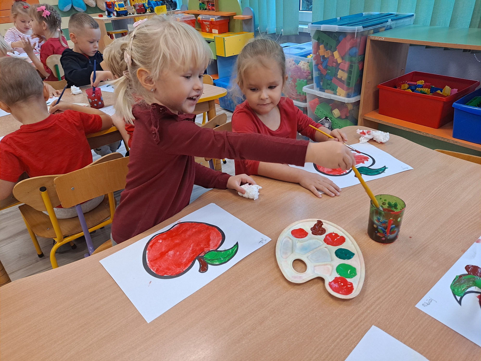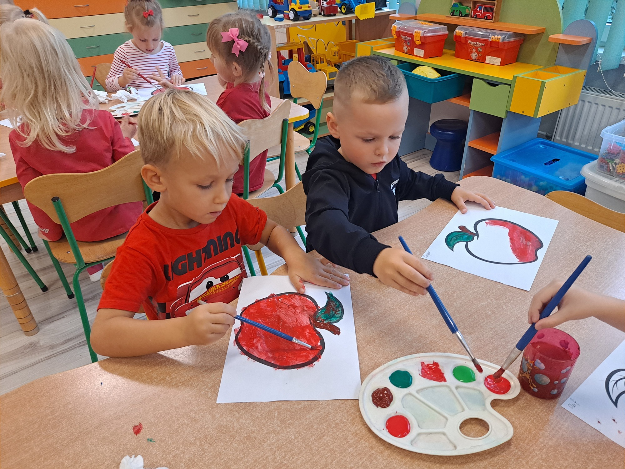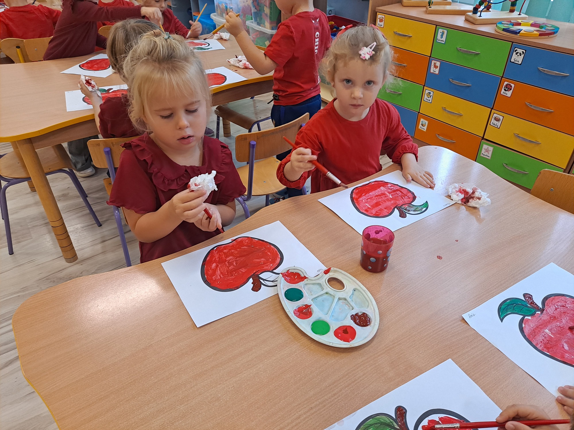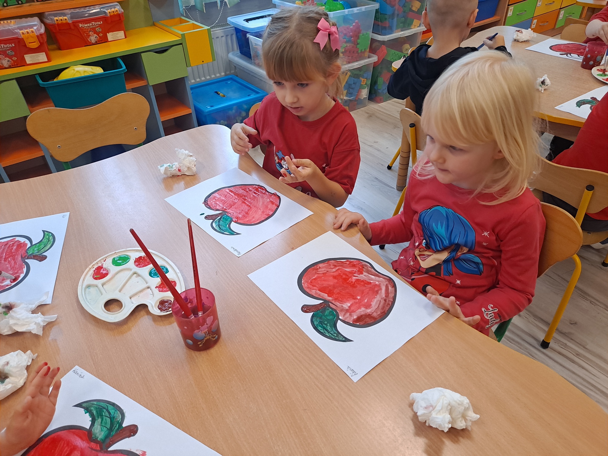 Dzieci wykonały pracę plastyczną – malowały farbami kontury jabłka, rozwijając przy tym swoją kreatywność i sprawność manualną.