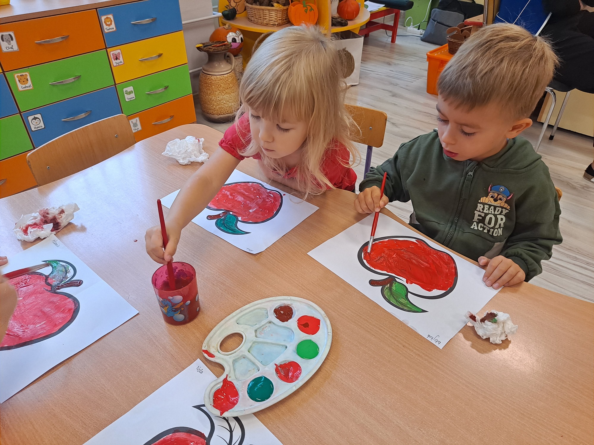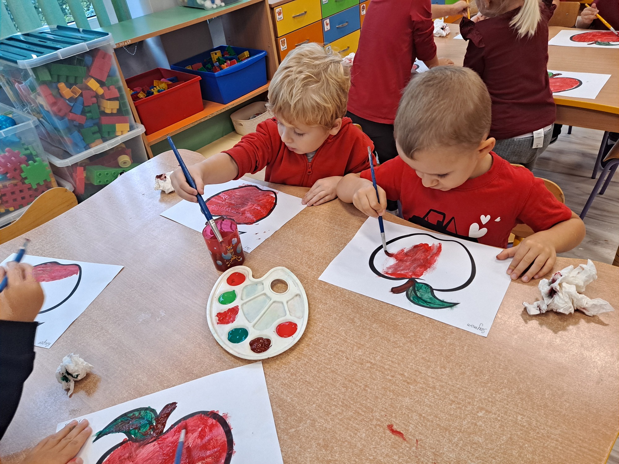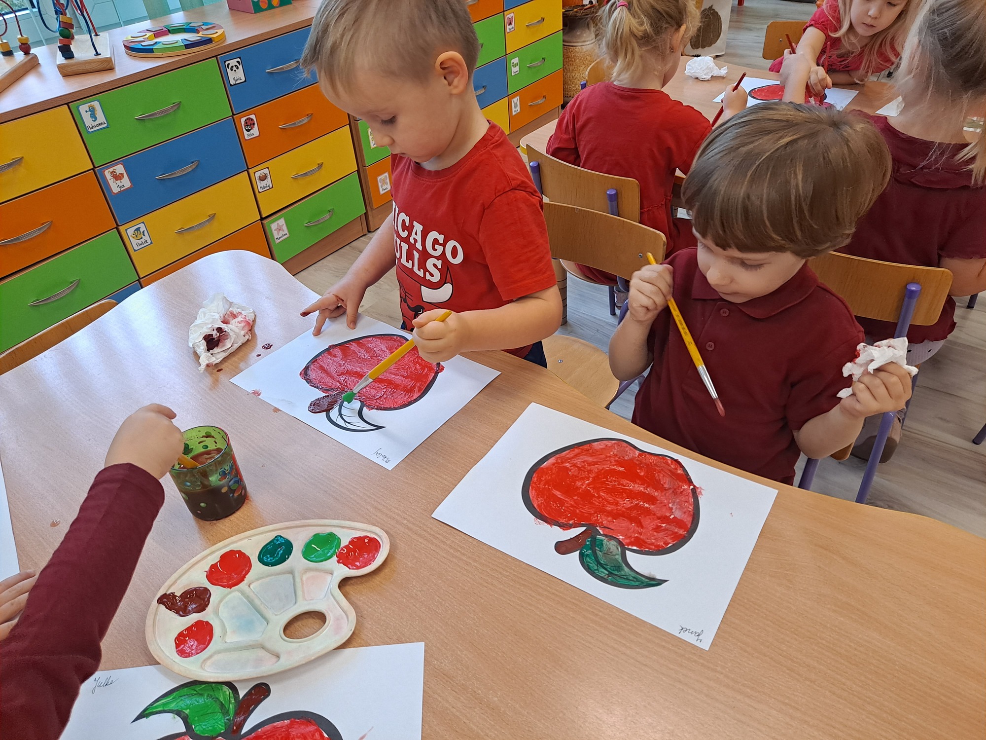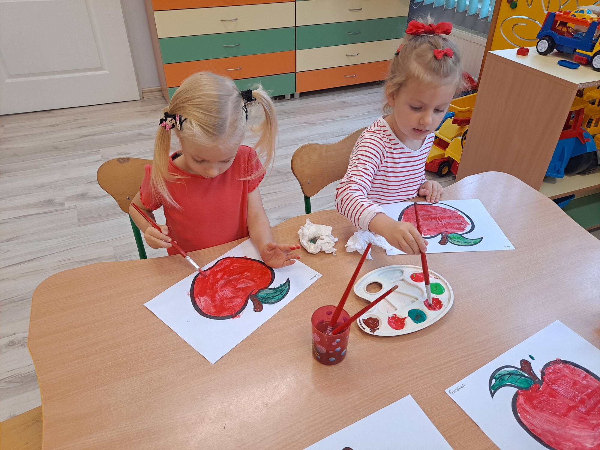 Dzieci wykonały pracę plastyczną – malowały farbami kontury jabłka, rozwijając przy tym swoją kreatywność i sprawność manualną.