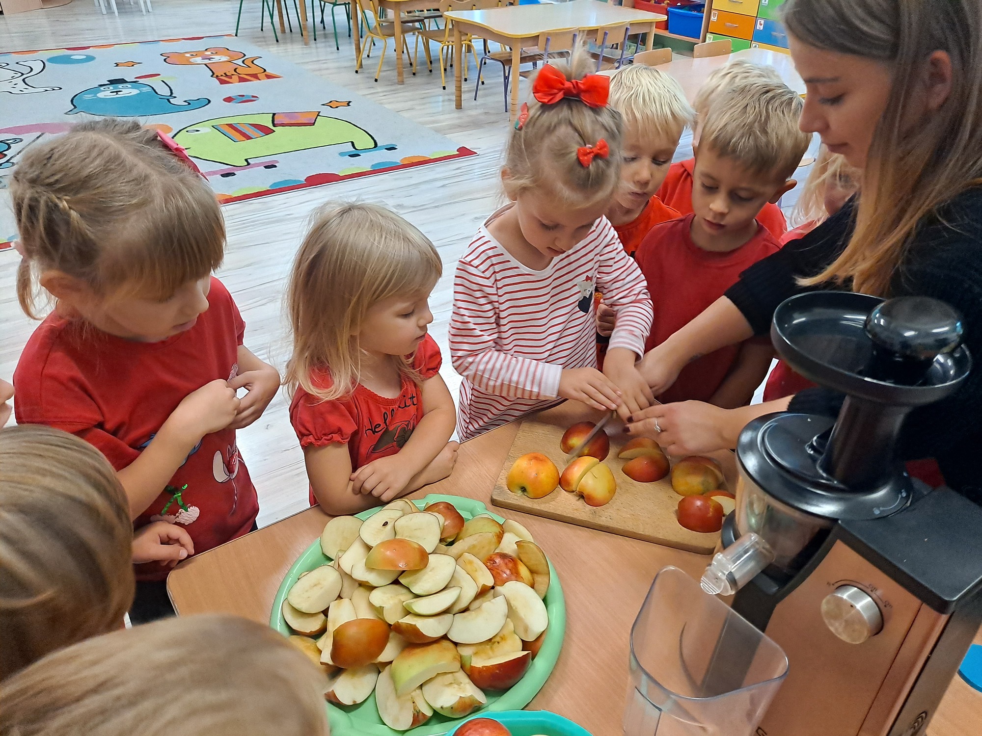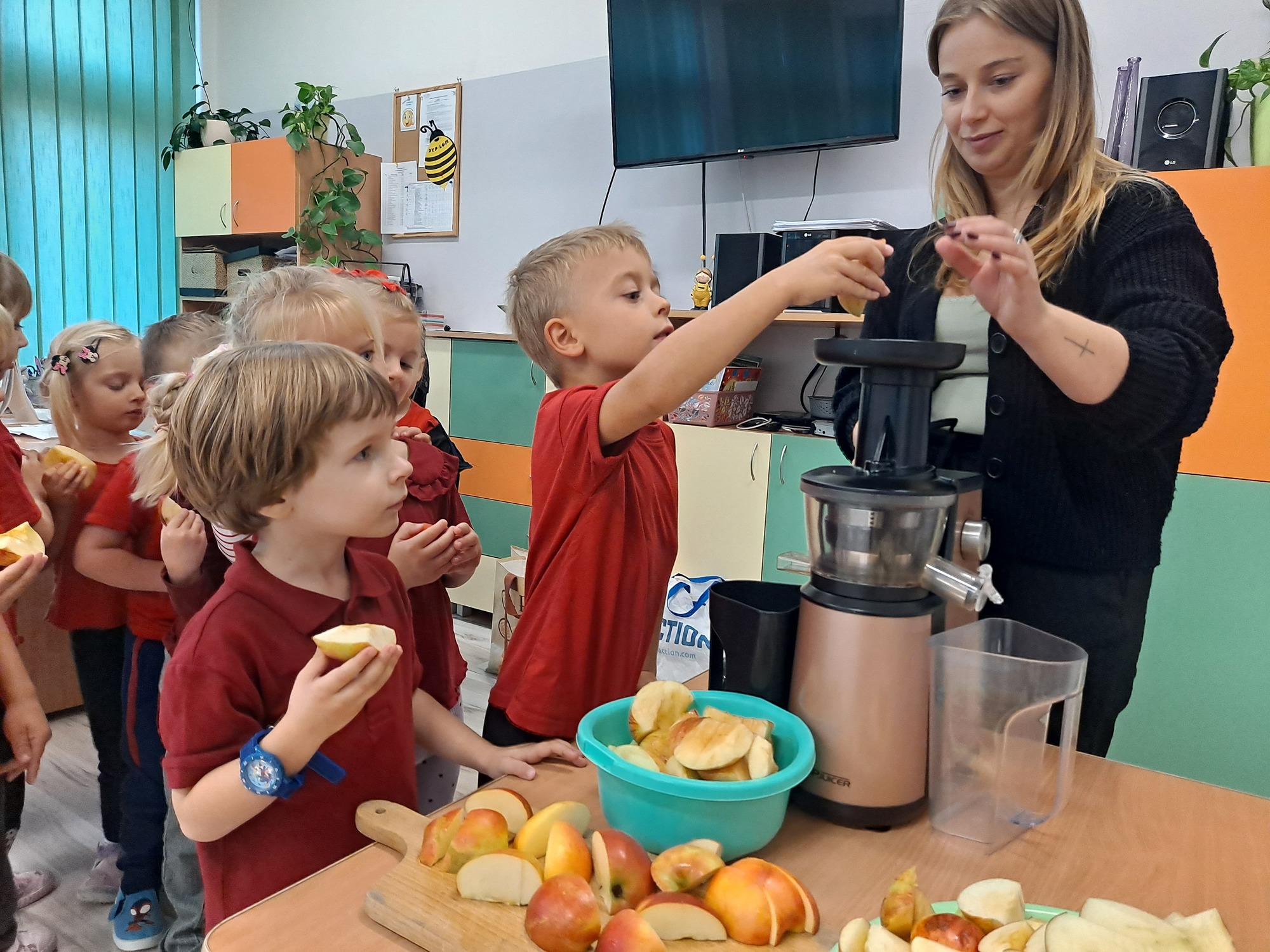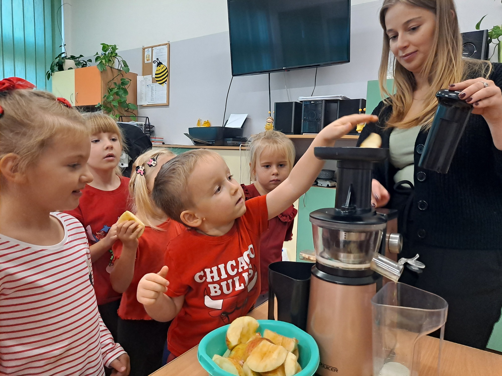 Najwięcej radości sprawiło nam przygotowanie świeżego soku z jabłek – dzieci mogły zobaczyć, jak powstaje zdrowy napój, a potem z apetytem go spróbować.
