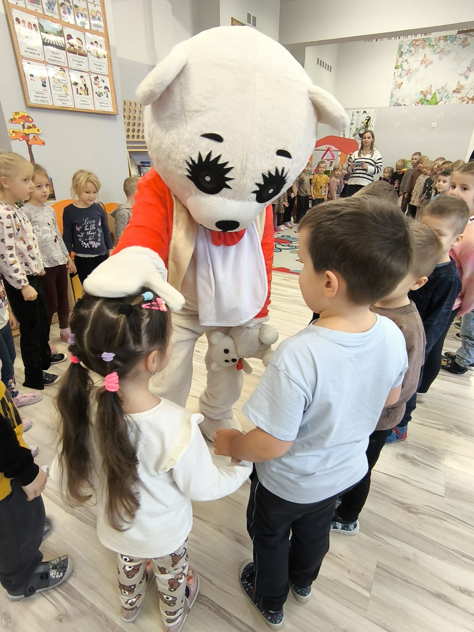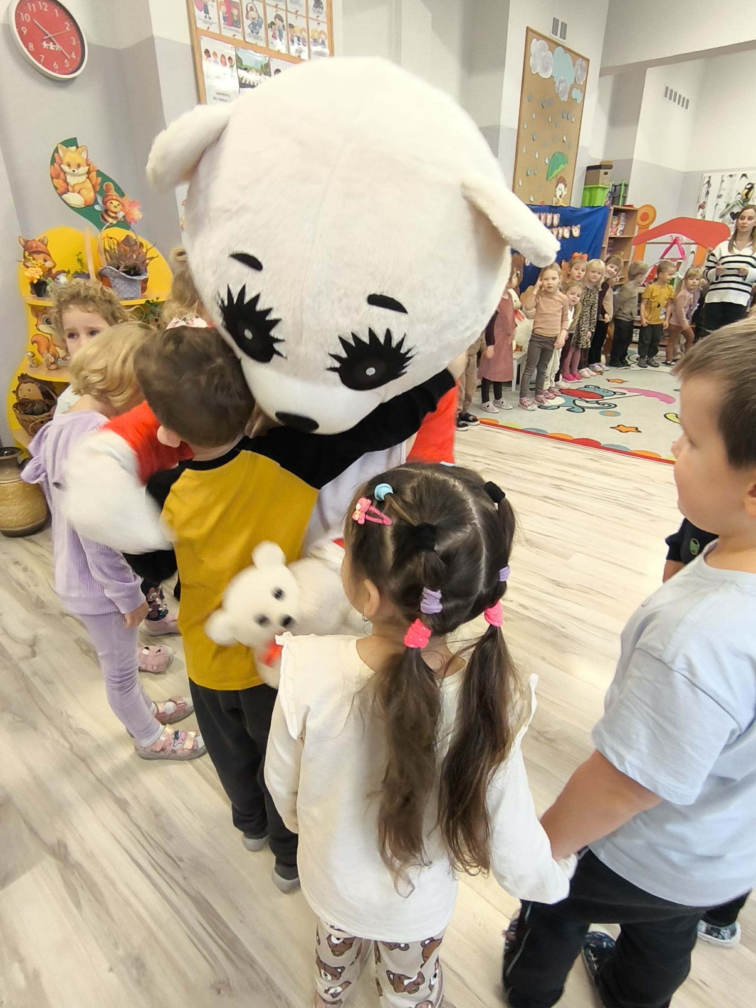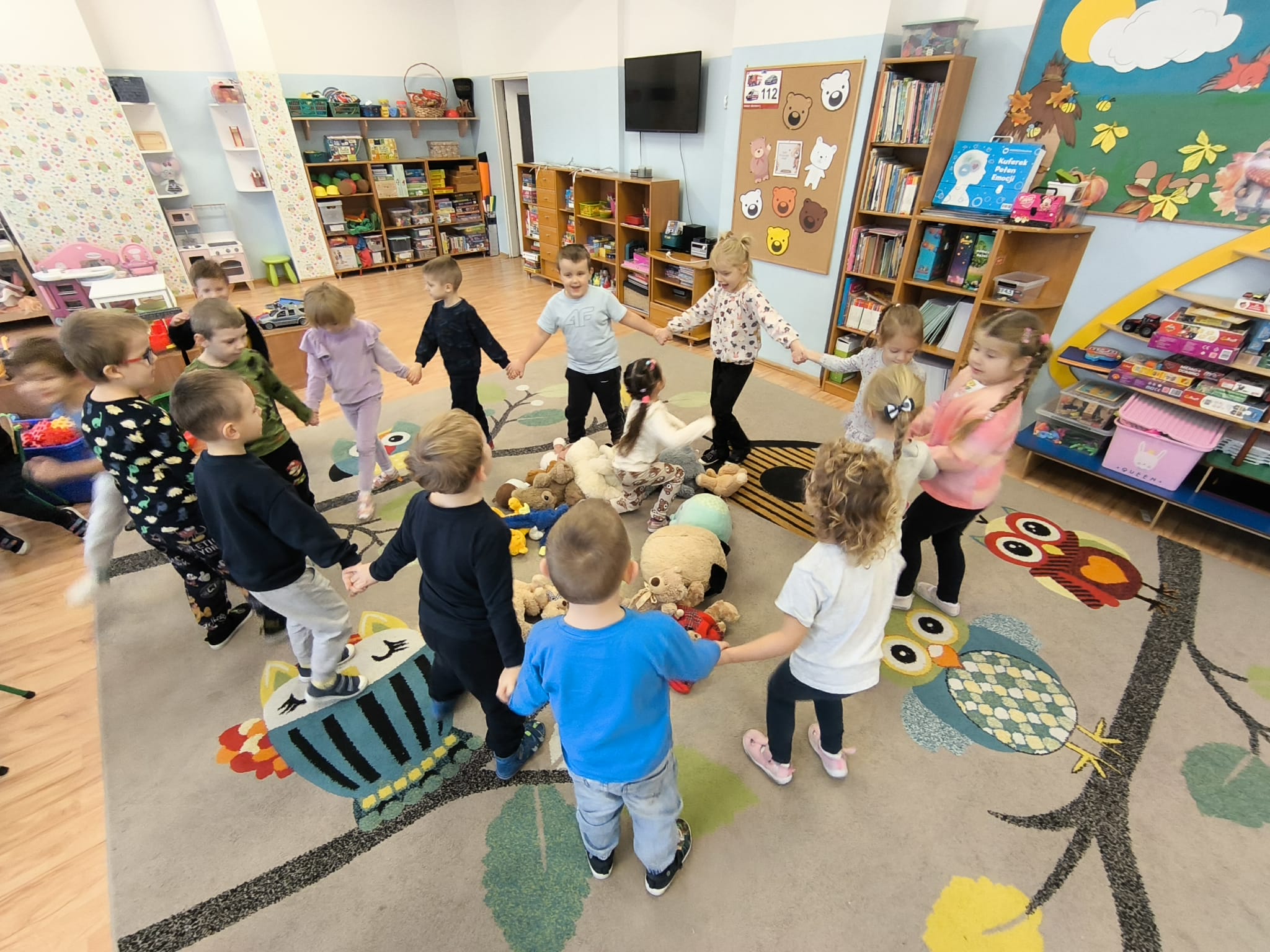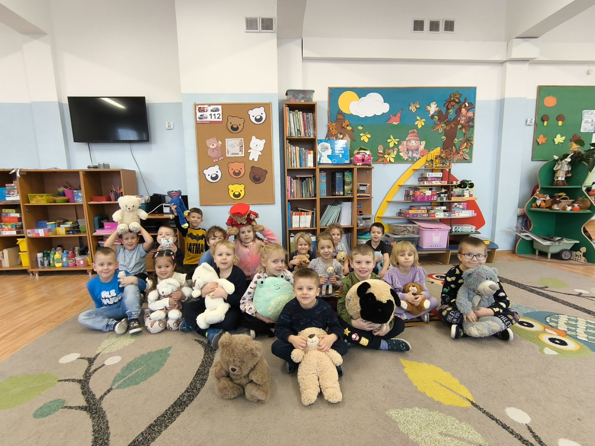 Dzień Pluszowego Misia w przedszkolu był pełen radości i zabawy. Dzieci przyniosły swoje ulubione pluszaki, tańczyły z misiami przy wesołej muzyce, brały udział w wspólnych zabawach i konkursach, a na koniec wysłuchały krótkiej opowieści o historii pluszowego misia. Atmosfera była ciepła, przytulna i pełna uśmiechów.