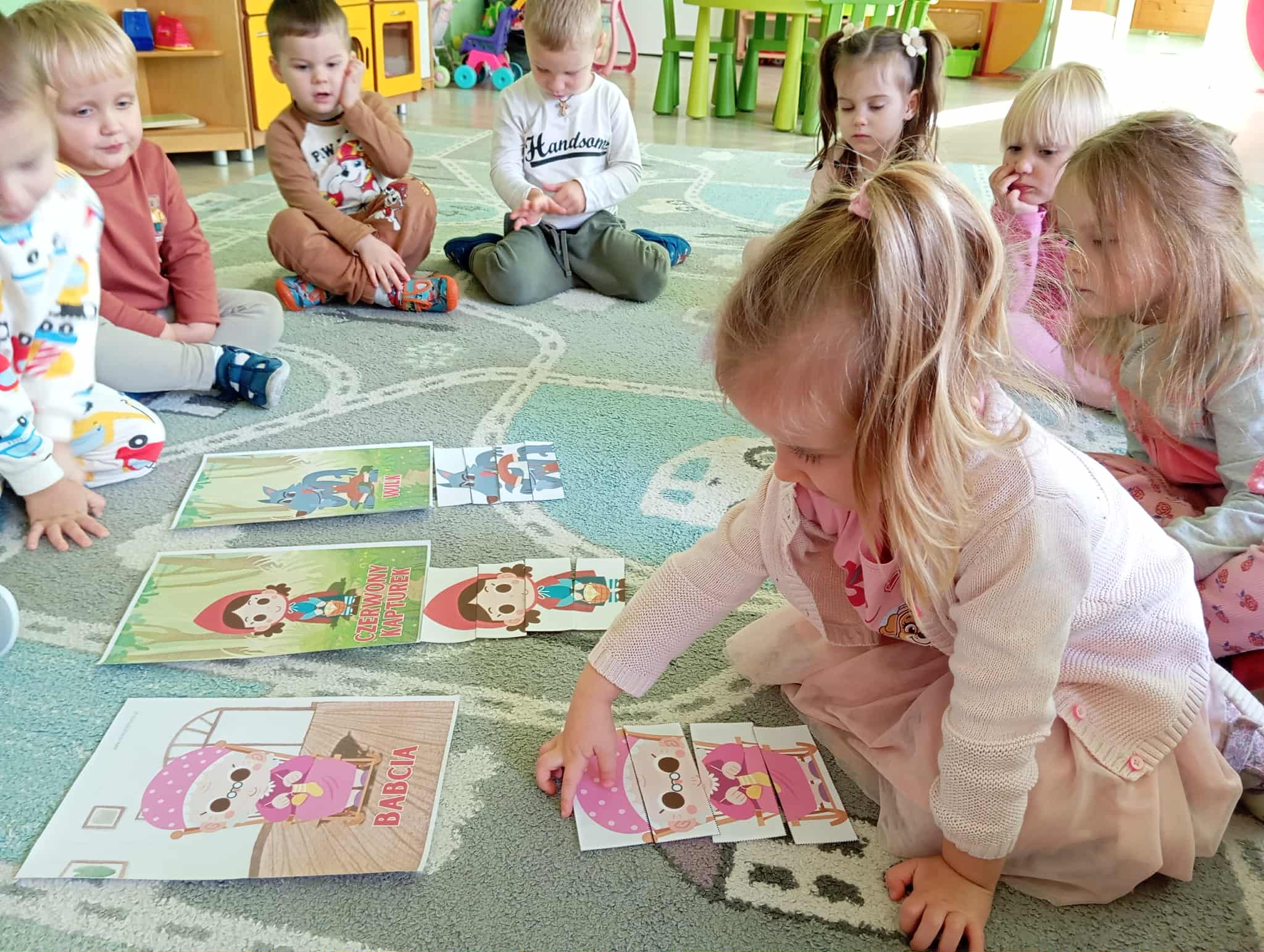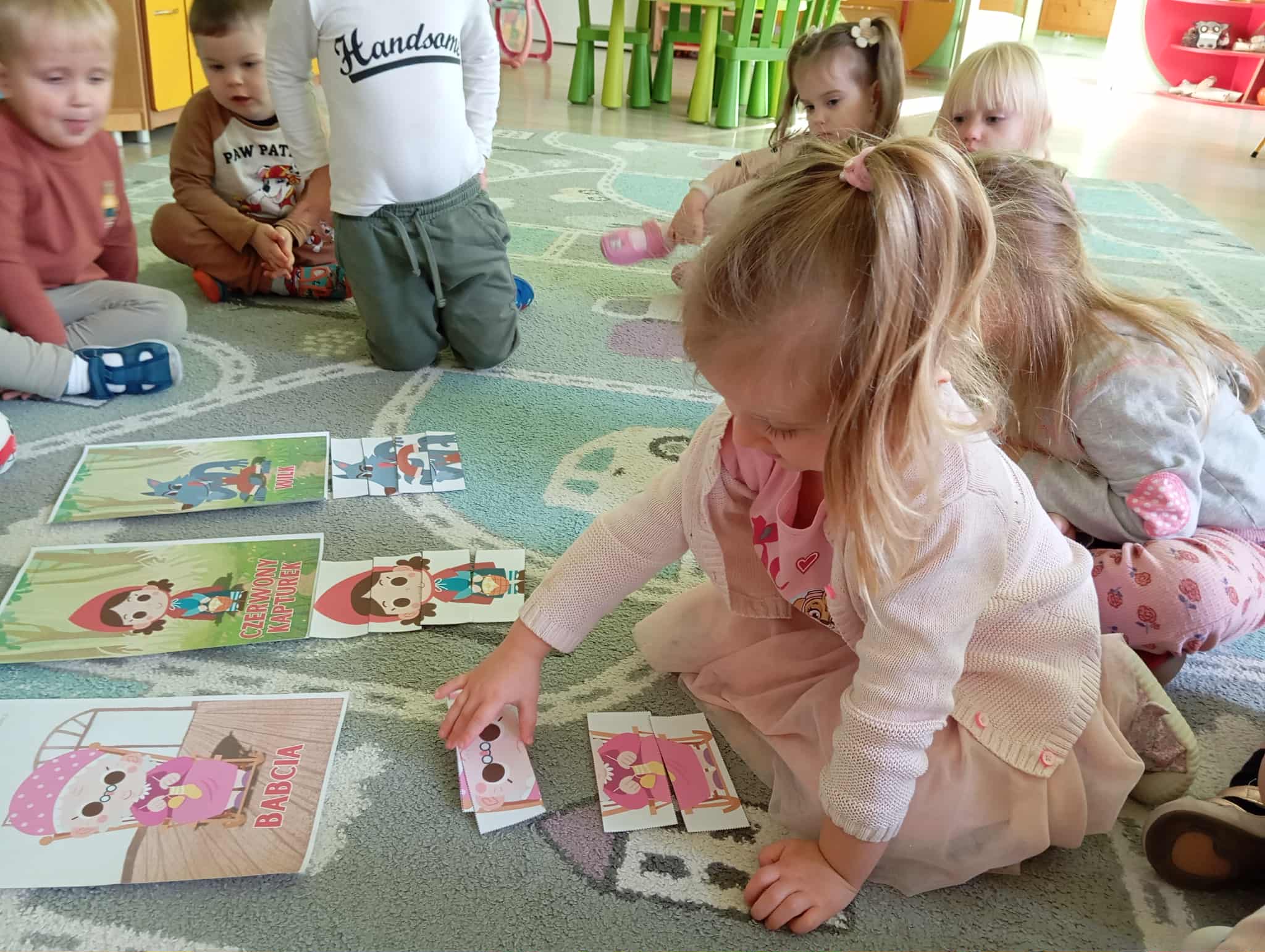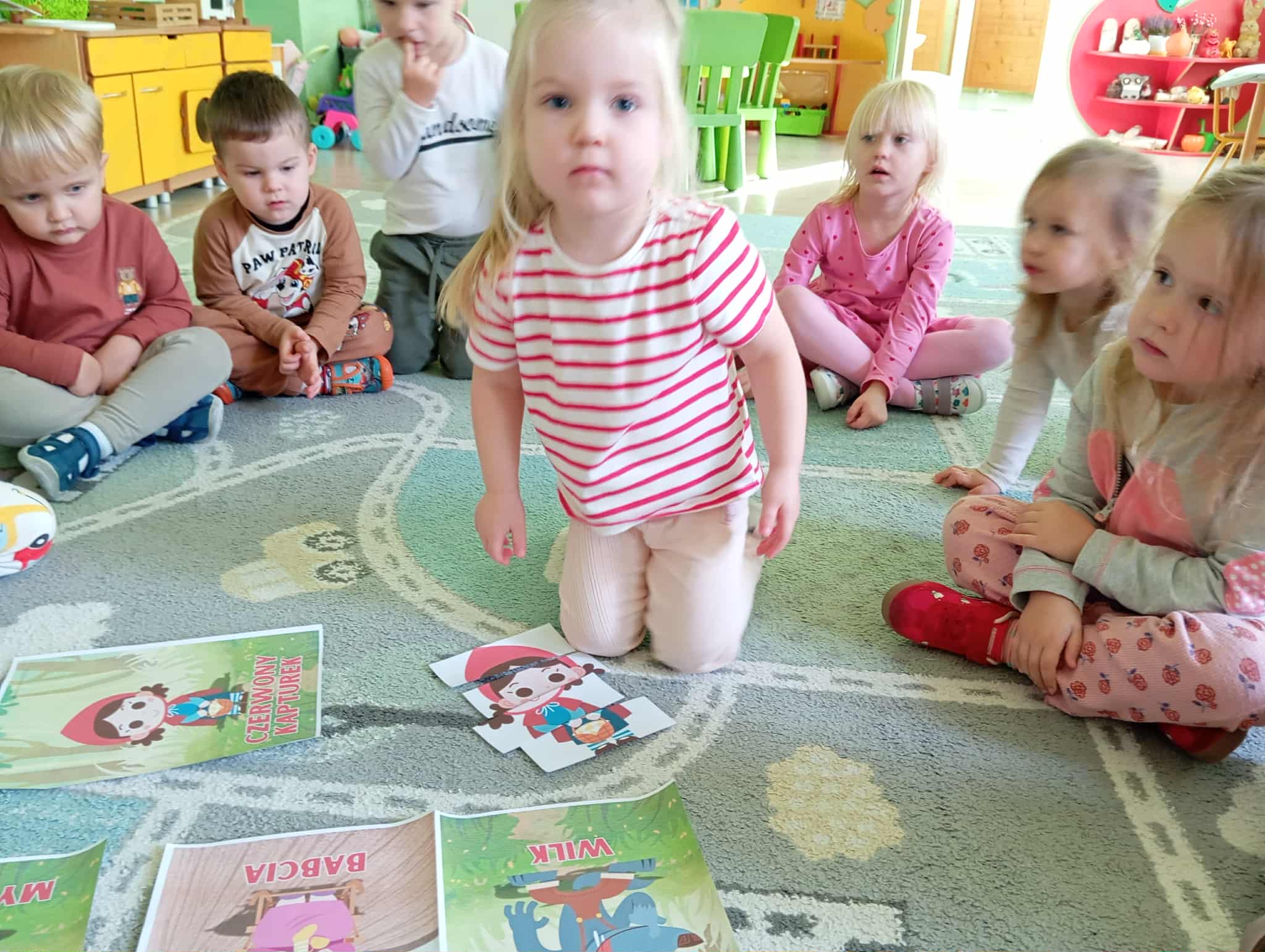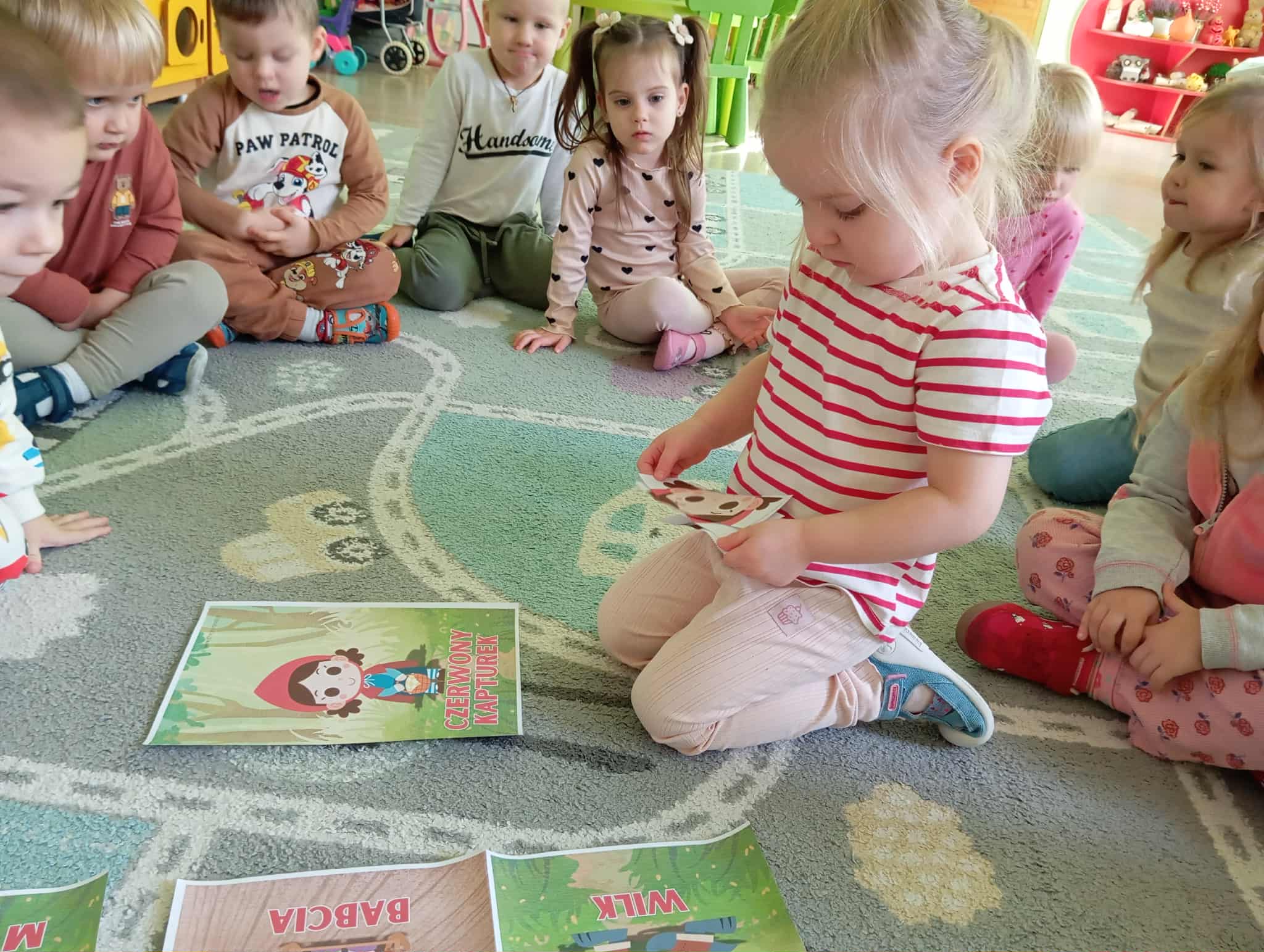 Dnia 5 listopada w naszym przedszkolu obchodziliśmy Dzień Postaci z Bajek – święto pełne uśmiechu, fantazji i kolorów. Podczas zajęć przedszkolaki poznawały różne znane bajki, rozmawiały o ich bohaterach i morałach. Szczególną uwagę poświęciliśmy bajce o Czerwonym Kapturku. Dzieci słuchały opowieści, omawiały zachowania bohaterów oraz uczyły się, jak ważne jest słuchanie rad dorosłych i ostrożność wobec nieznajomych. Następnie przedszkolaki wykonały pracę plastyczną – „Bohaterowie bajek”. Zadaniem dzieci było sklejenie poszczególnych elementów postaci w całość, tak aby powstał ich ulubiony bajkowy bohater. Ta twórcza aktywność sprawiła wszystkim wiele radości i pozwoliła rozwijać wyobraźnię, zdolności manualne oraz umiejętność współpracy. Dużym zainteresowaniem cieszyła się również historyjka obrazkowa o Czerwonym Kapturku. Dzieci układały obrazki we właściwej kolejności, opowiadały wydarzenia własnymi słowami i utrwalały treść bajki. Na zakończenie odbyły się zabawy i tańce przy bajkowej muzyce – przedszkolaki z radością ruszyły do wspólnej zabawy, tańcząc w rytm wesołych piosenek o swoich ulubionych bohaterach. To był magiczny, pełen emocji i dobrej zabawy dzień, który przypomniał wszystkim, jak ważne są bajki w rozwijaniu dziecięcej wyobraźni i nauce wartości takich jak dobro, odwaga i przyjaźń.