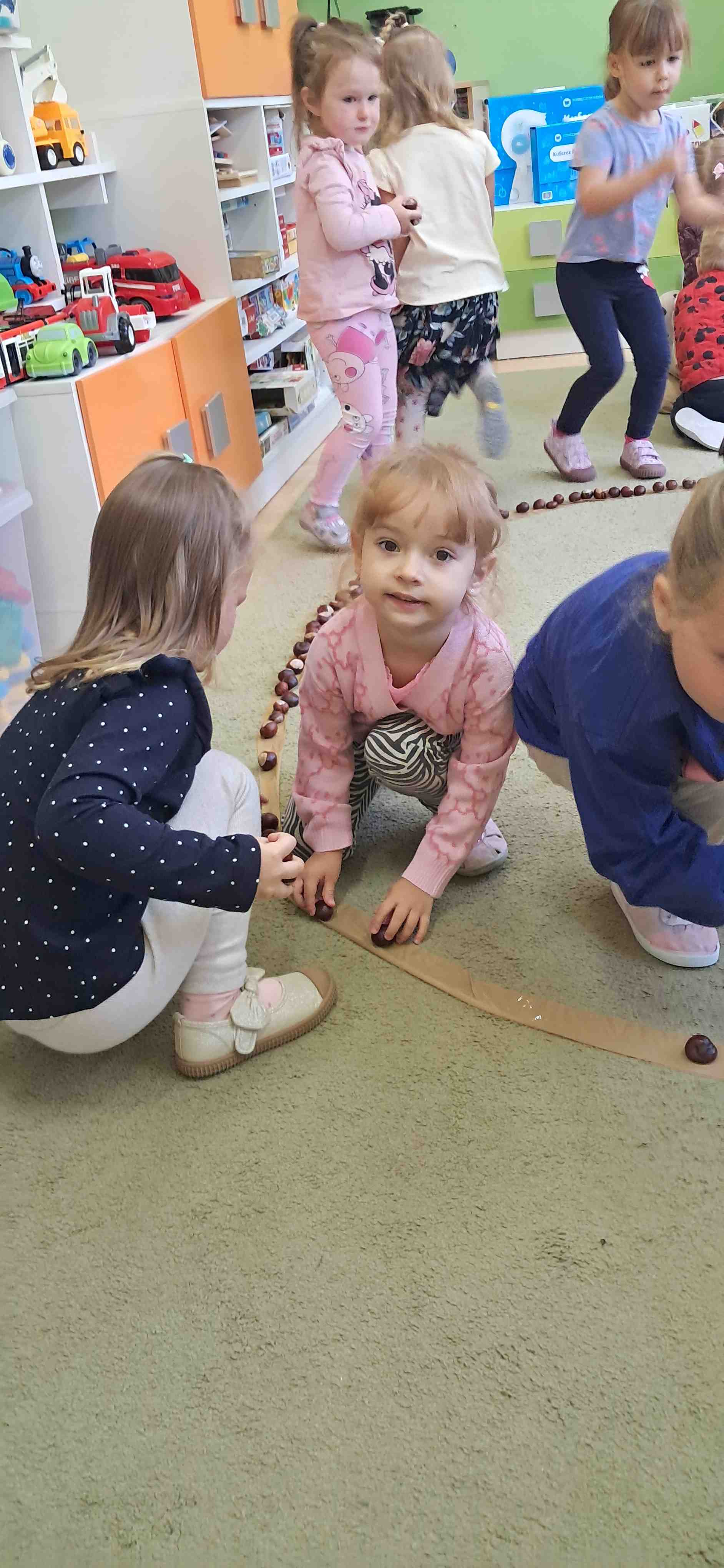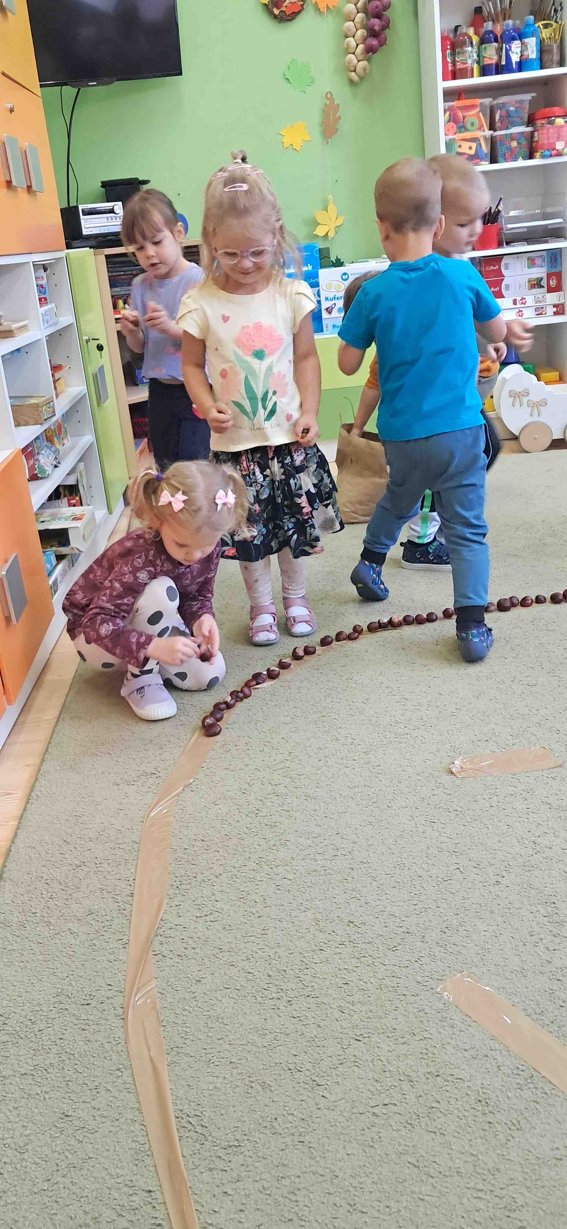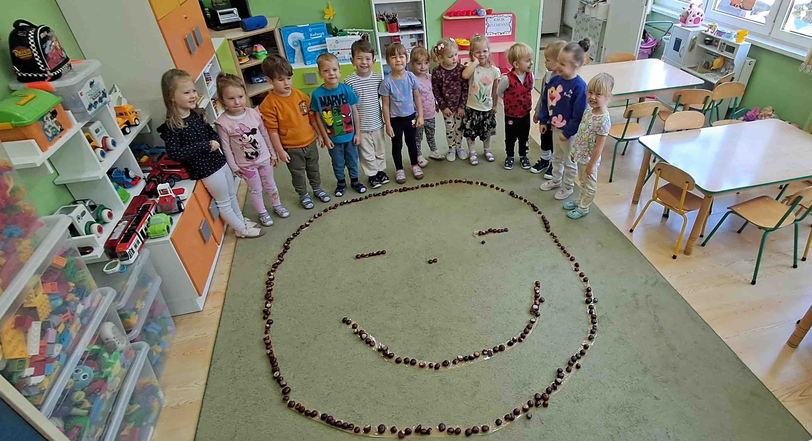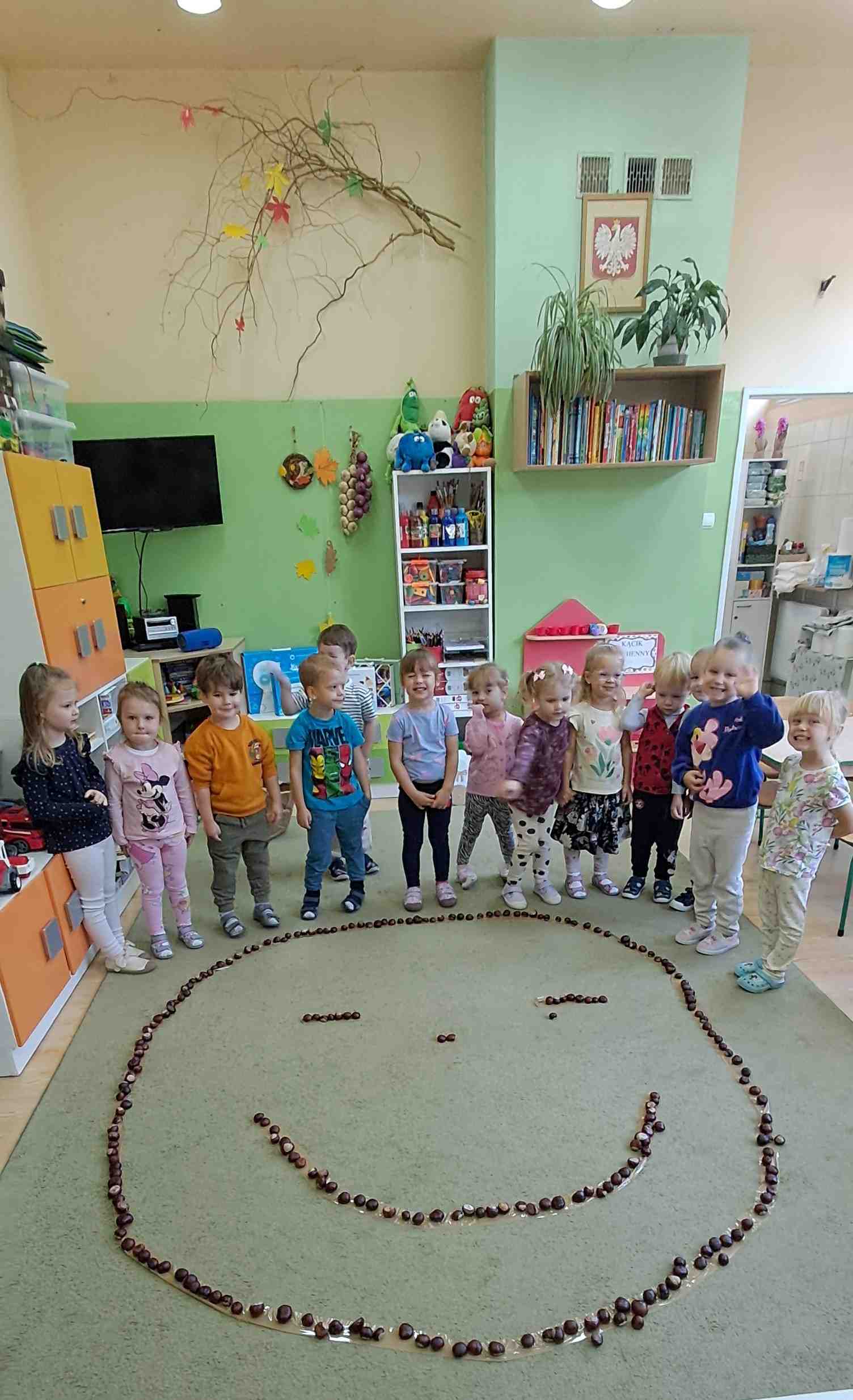 Z okazji Światowego Dnia Uśmiechu ,,Jagódki'' zrobiły w sali ogromną, uśmiechniętą buzię. Do swojej pracy wykorzystały dary jesieni- kasztany!