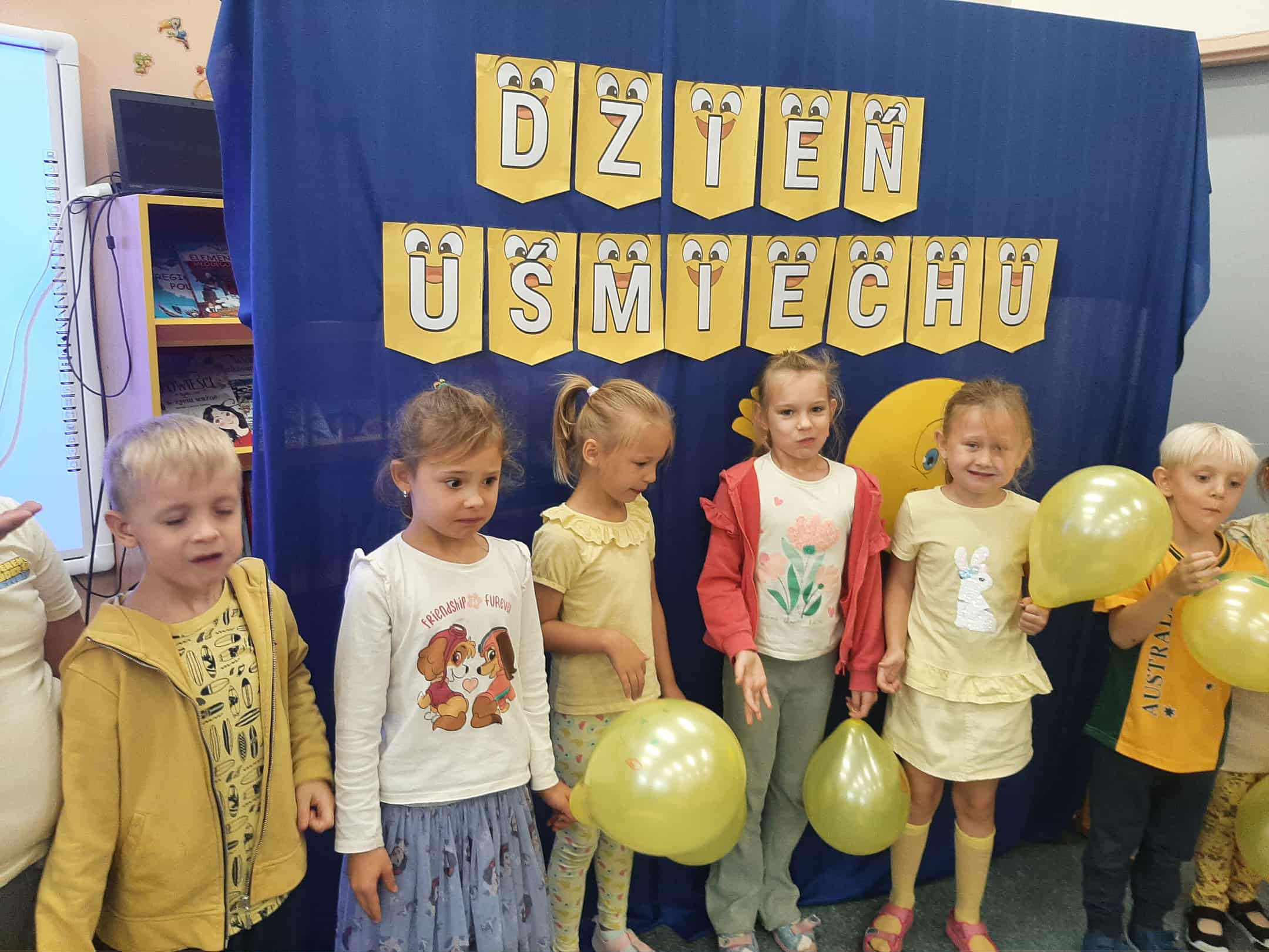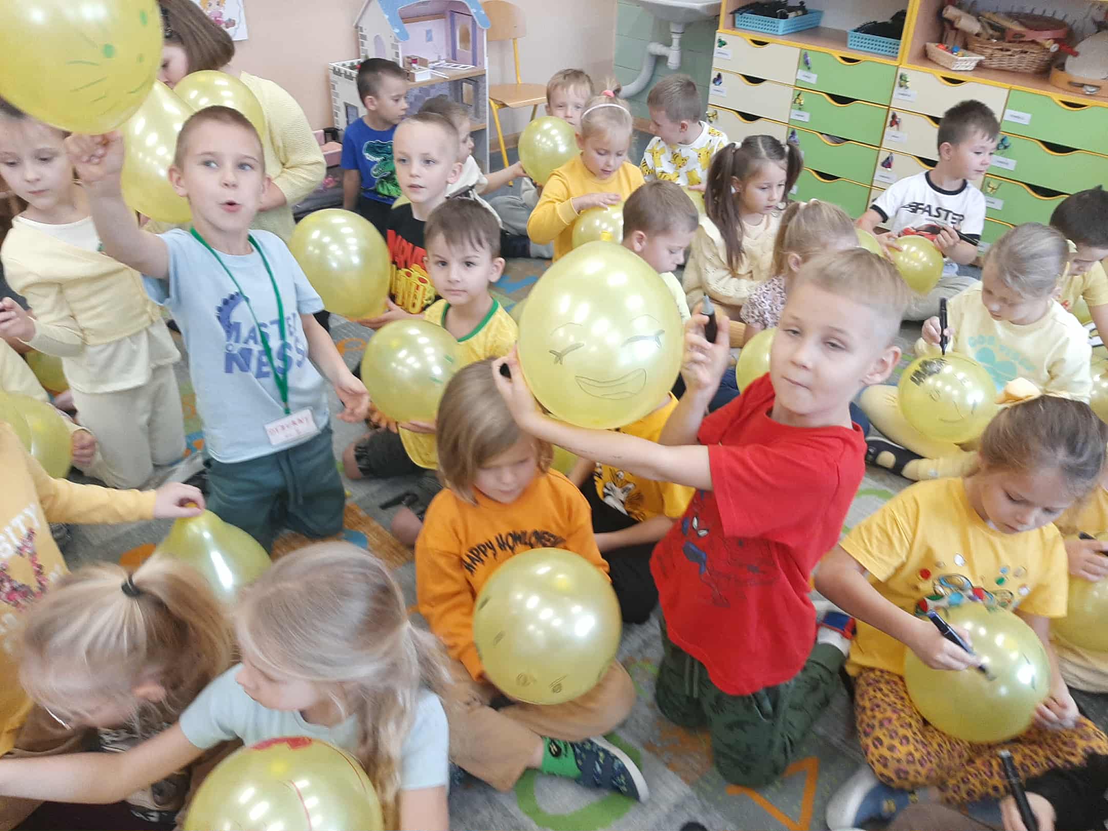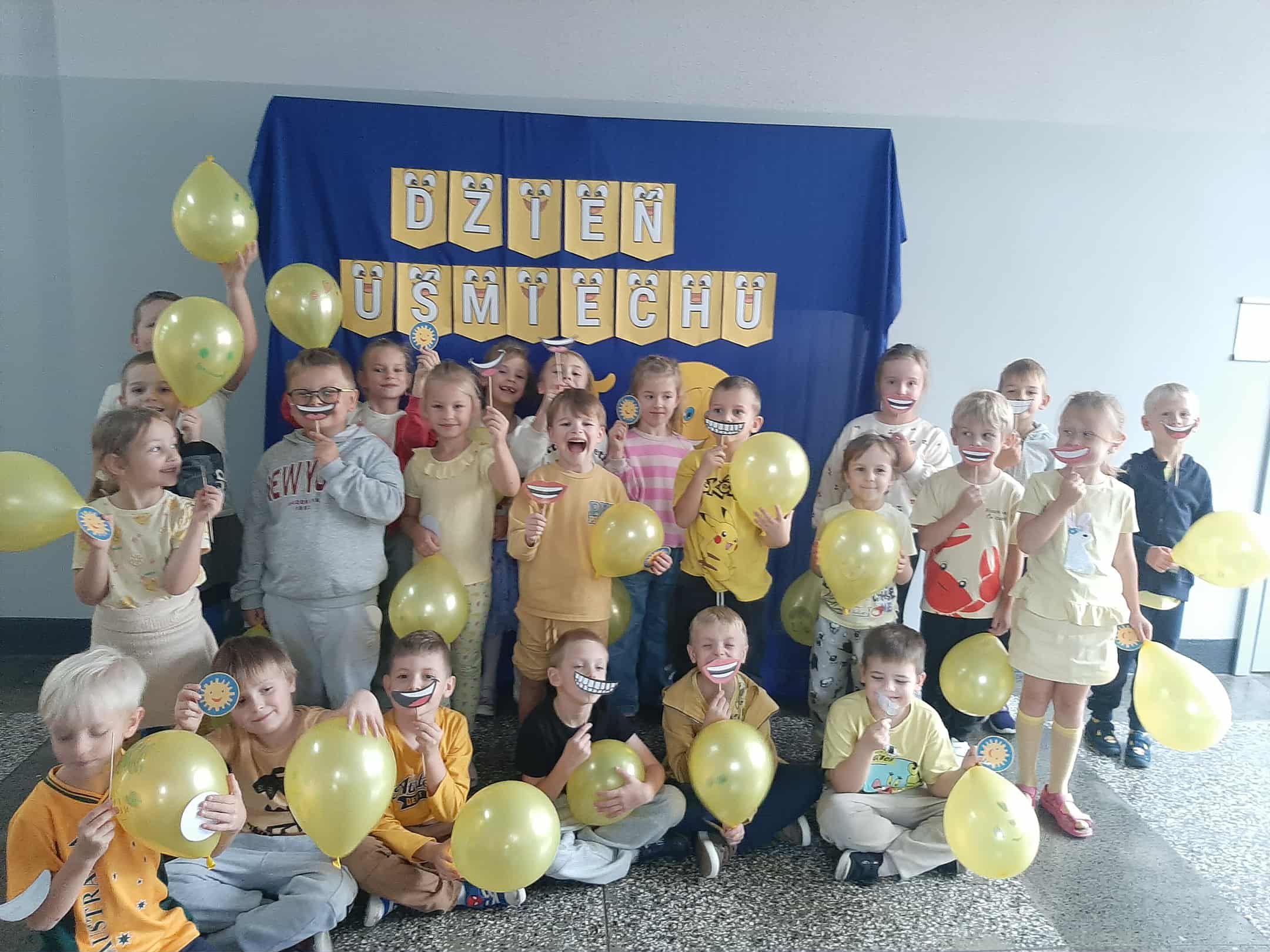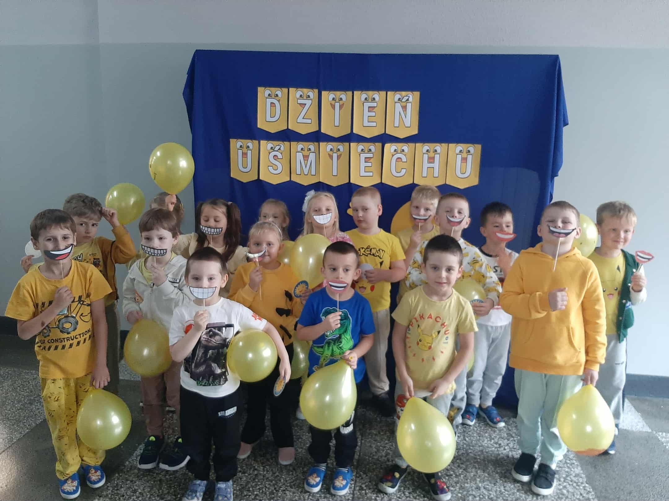 W dniu 06.10.2025r. w naszym przedszkolu obchodziliśmy Dzień Uśmiechu! W zabawie wzięły udział trzy grupy 6-latków, które od samego rana dzieliły się radością i pozytywną energią. Świętowanie rozpoczęło się od pogadanki o emocjach – dzieci rozmawiały o tym, co sprawia im radość i dlaczego warto się uśmiechać. Następnie przedszkolaki z wielkim zaangażowaniem rysowały wesołe minki na żółtych balonach, tworząc kolorowe, radosne buźki. Nie zabrakło też degustacji cytryny – to zabawne doświadczenie wywołało wiele śmiechu, choć miny nie zawsze były wesołe! Na zakończenie każde dziecko otrzymało Order Uśmiechu, jako symbol radości, życzliwości i dobrej zabawy. Dzień zakończyliśmy pamiątkowymi zdjęciami grupowymi, które na pewno będą piękną pamiątką tego radosnego wydarzenia. Uśmiech to najlepszy sposób, by świat stał się lepszy!