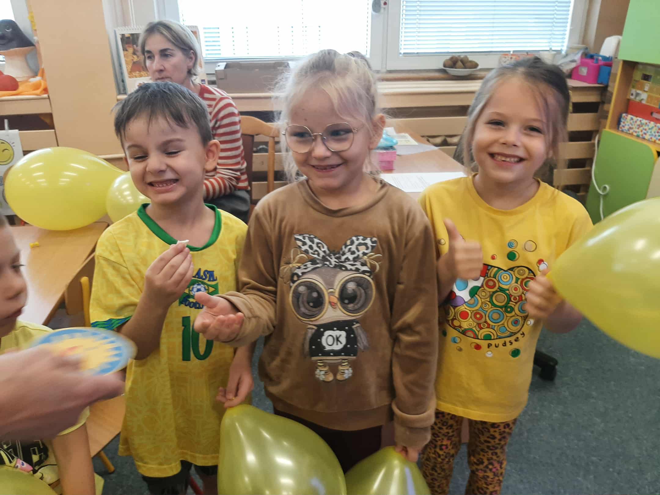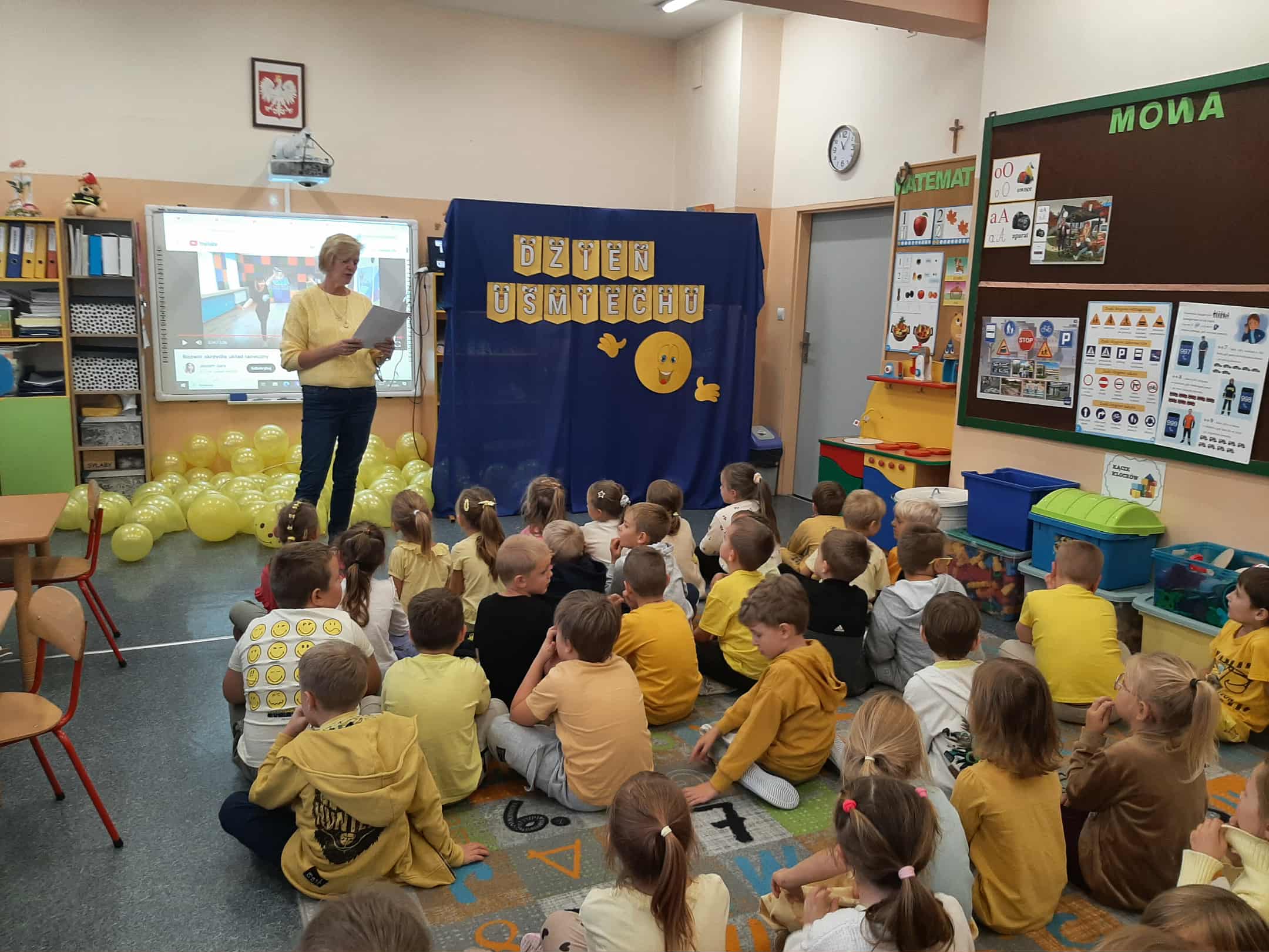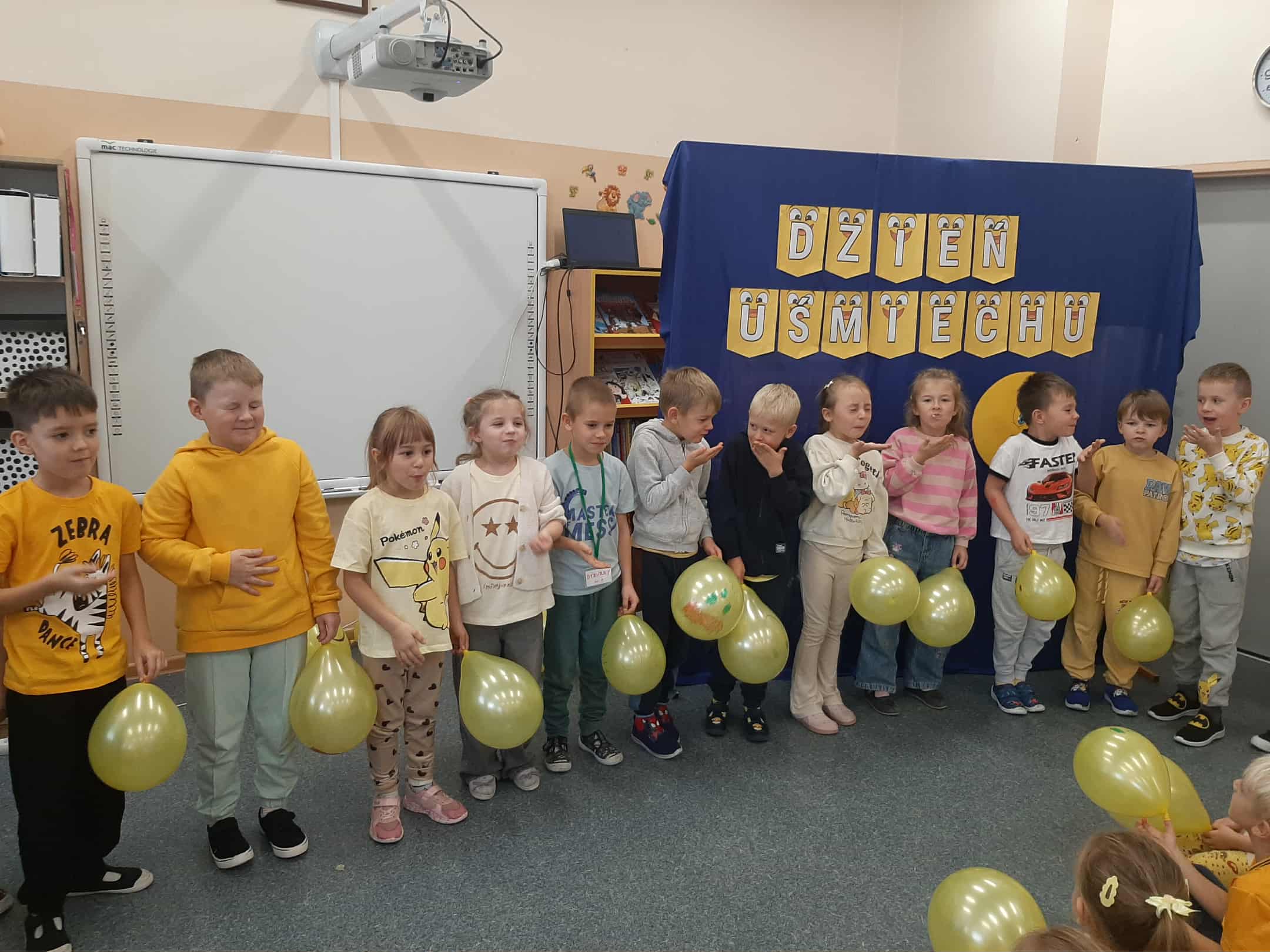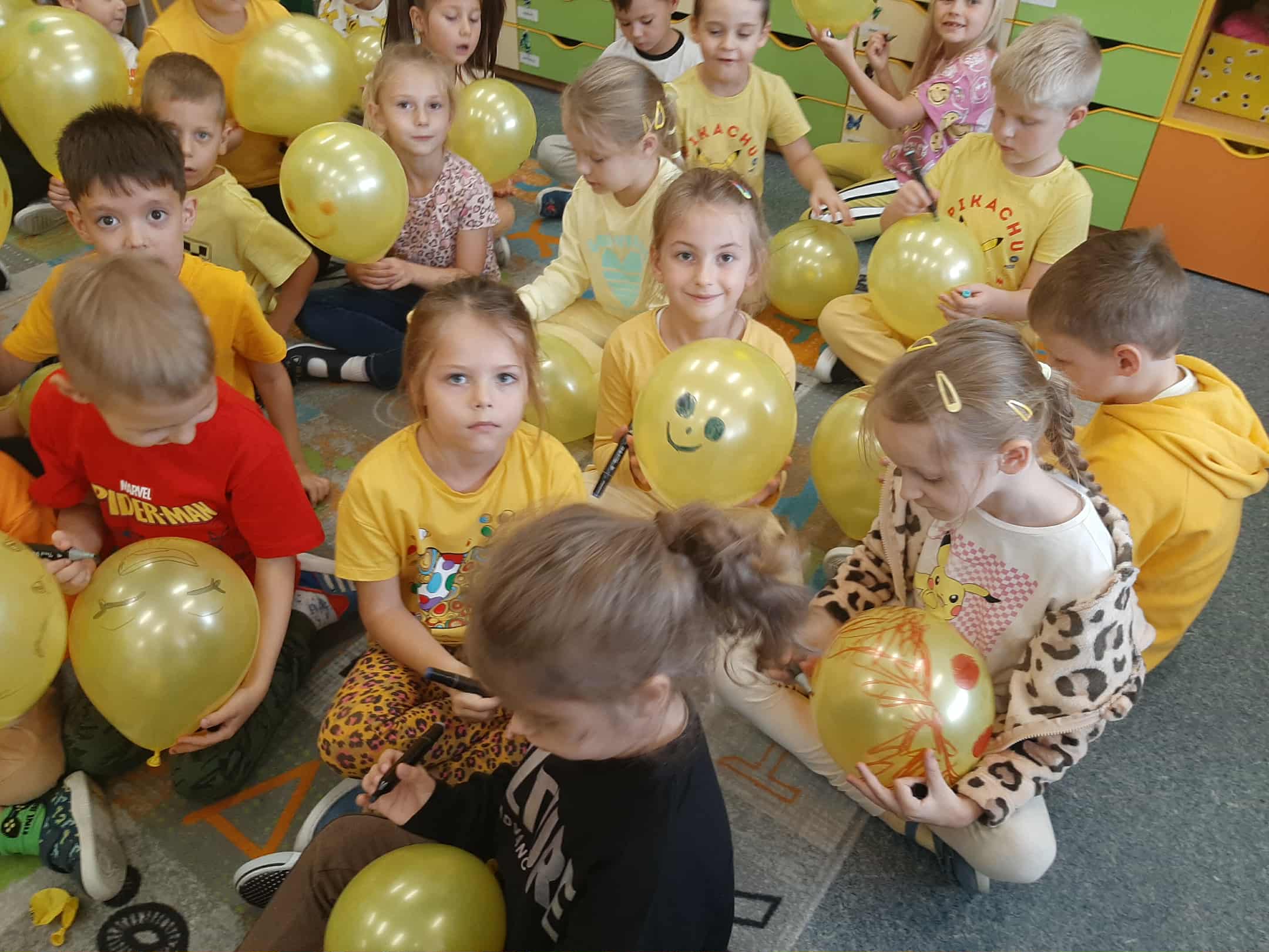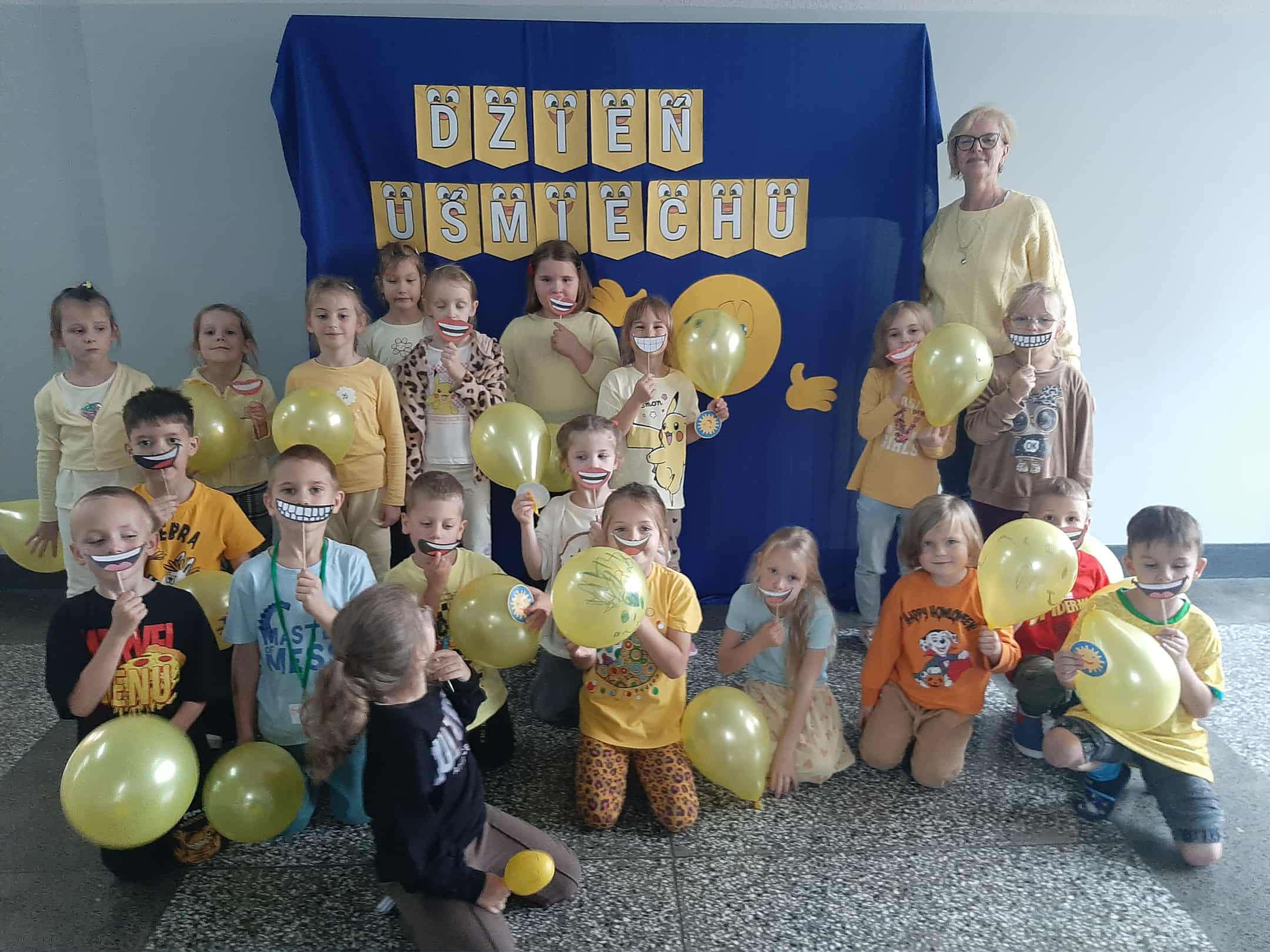 W dniu 06.10.2025r. w naszym przedszkolu obchodziliśmy Dzień Uśmiechu! W zabawie wzięły udział trzy grupy 6-latków, które od samego rana dzieliły się radością i pozytywną energią. Świętowanie rozpoczęło się od pogadanki o emocjach – dzieci rozmawiały o tym, co sprawia im radość i dlaczego warto się uśmiechać. Następnie przedszkolaki z wielkim zaangażowaniem rysowały wesołe minki na żółtych balonach, tworząc kolorowe, radosne buźki. Nie zabrakło też degustacji cytryny – to zabawne doświadczenie wywołało wiele śmiechu, choć miny nie zawsze były wesołe! Na zakończenie każde dziecko otrzymało Order Uśmiechu, jako symbol radości, życzliwości i dobrej zabawy. Dzień zakończyliśmy pamiątkowymi zdjęciami grupowymi, które na pewno będą piękną pamiątką tego radosnego wydarzenia. Uśmiech to najlepszy sposób, by świat stał się lepszy!