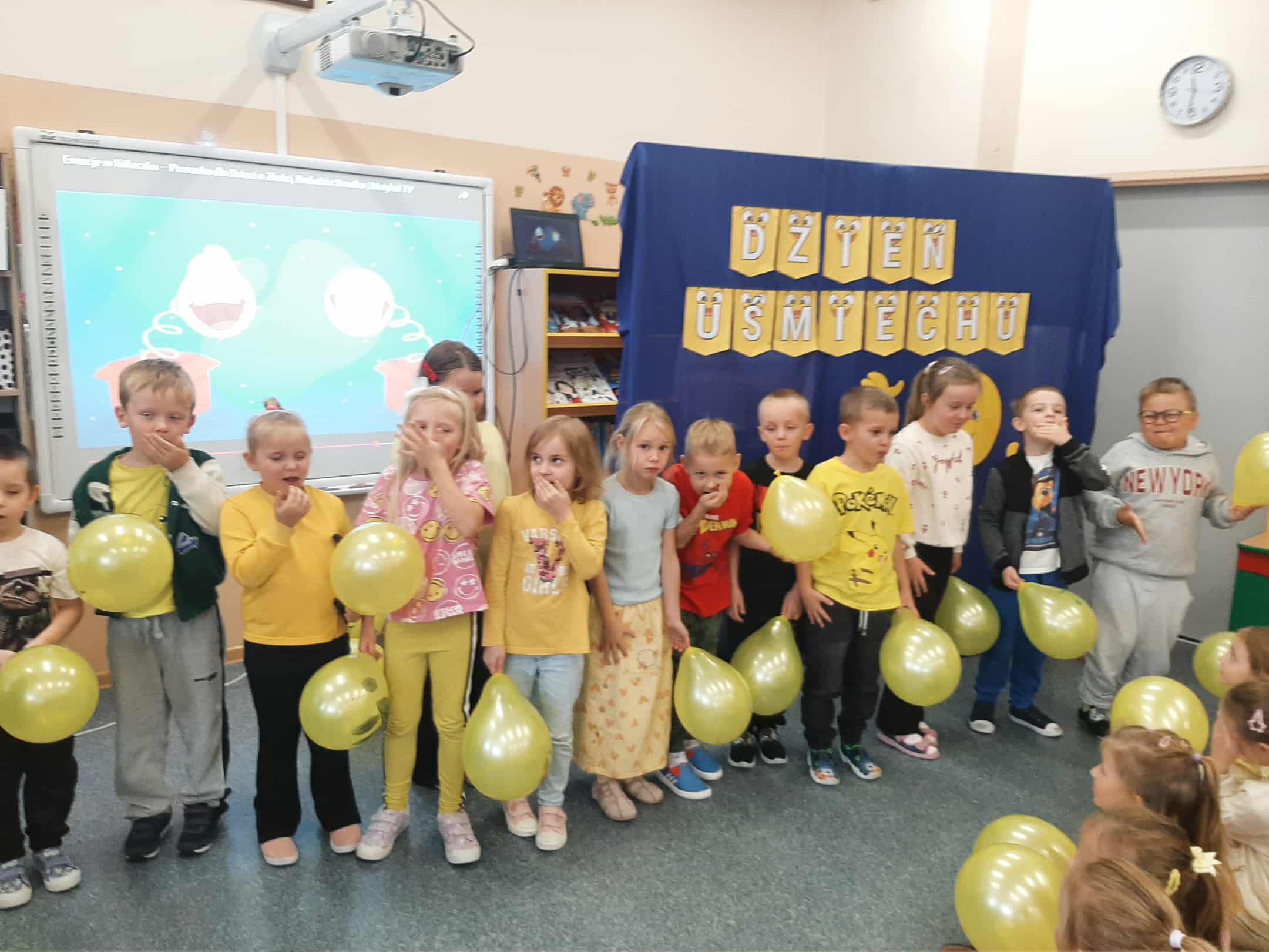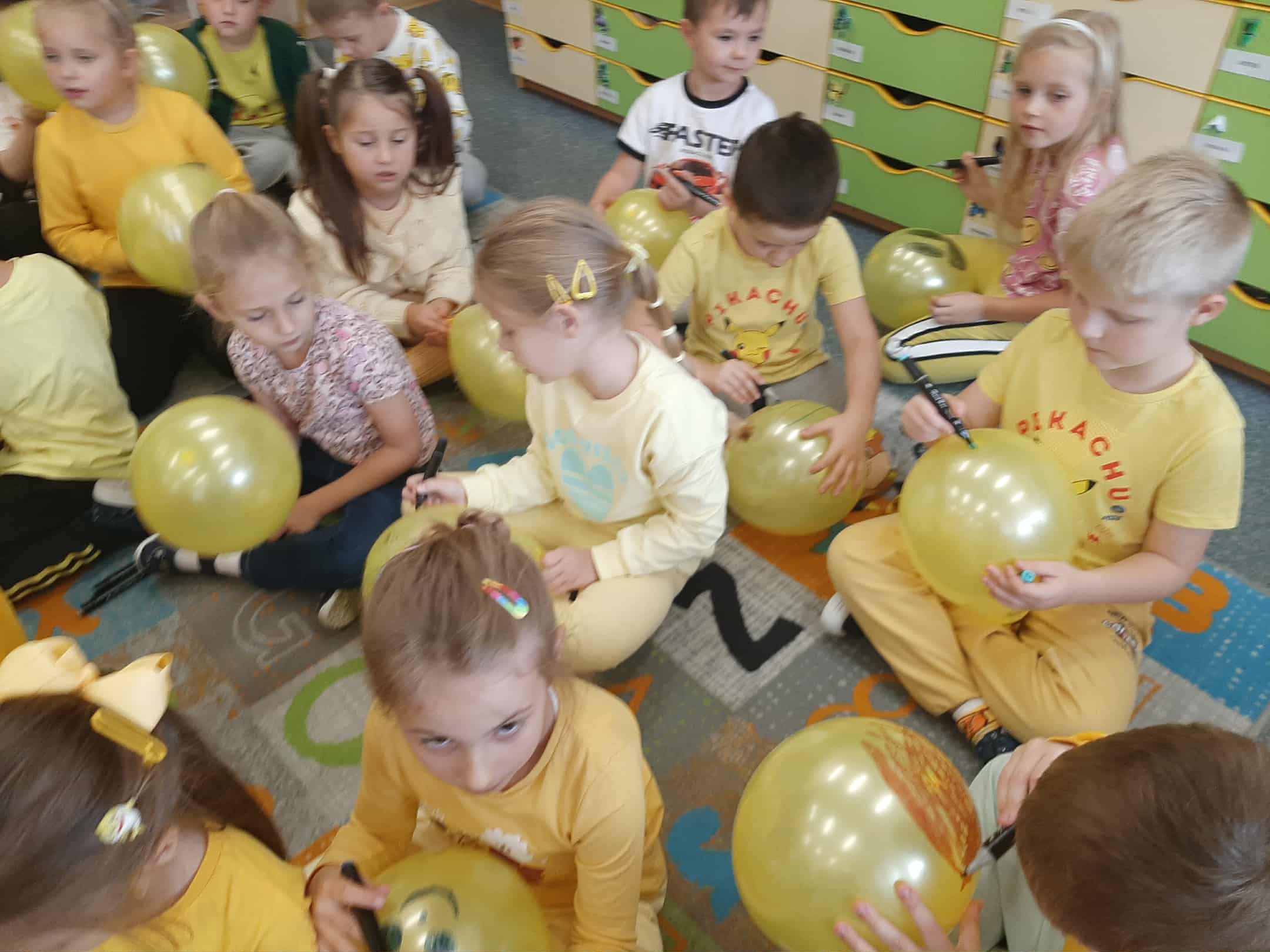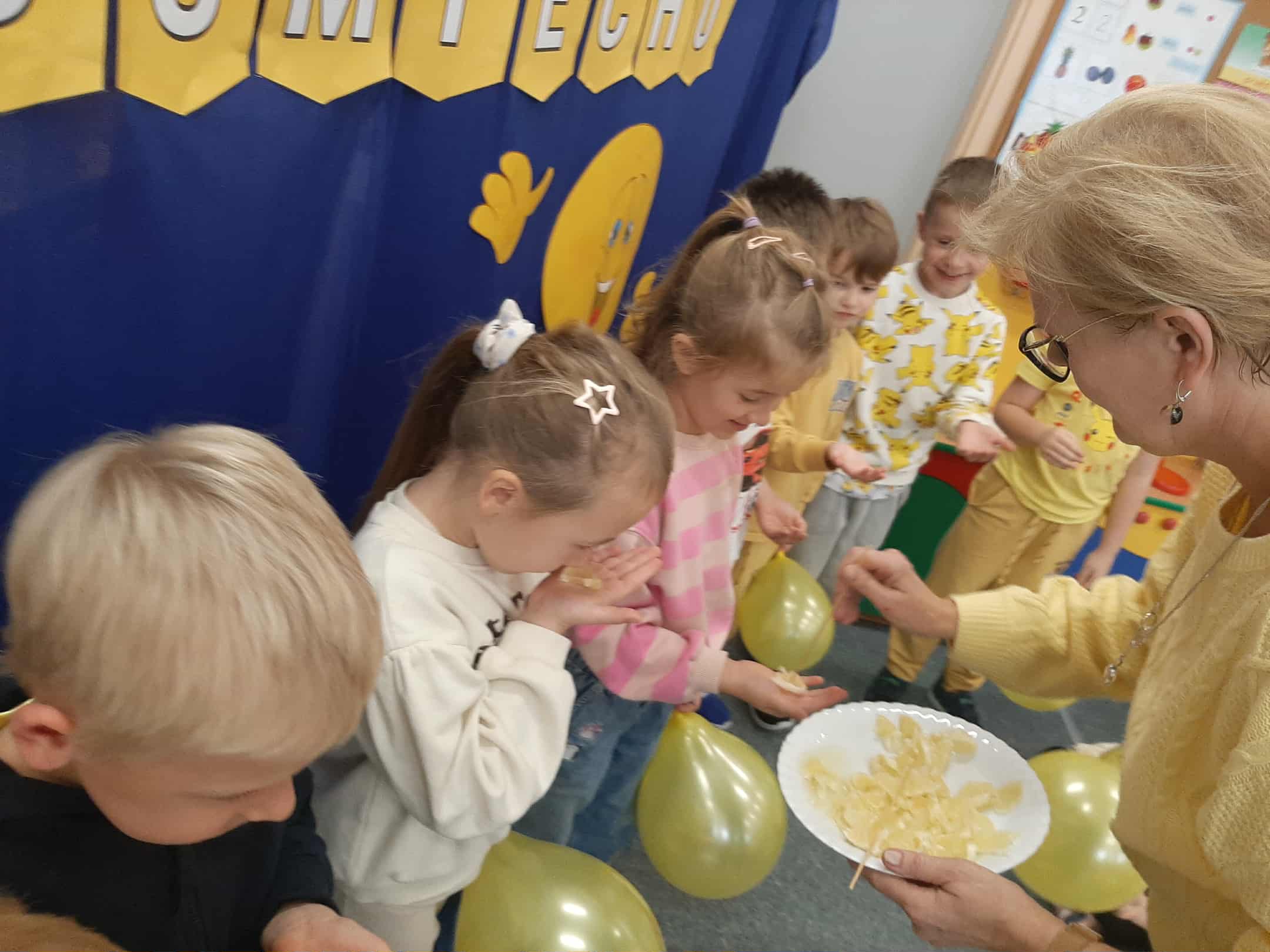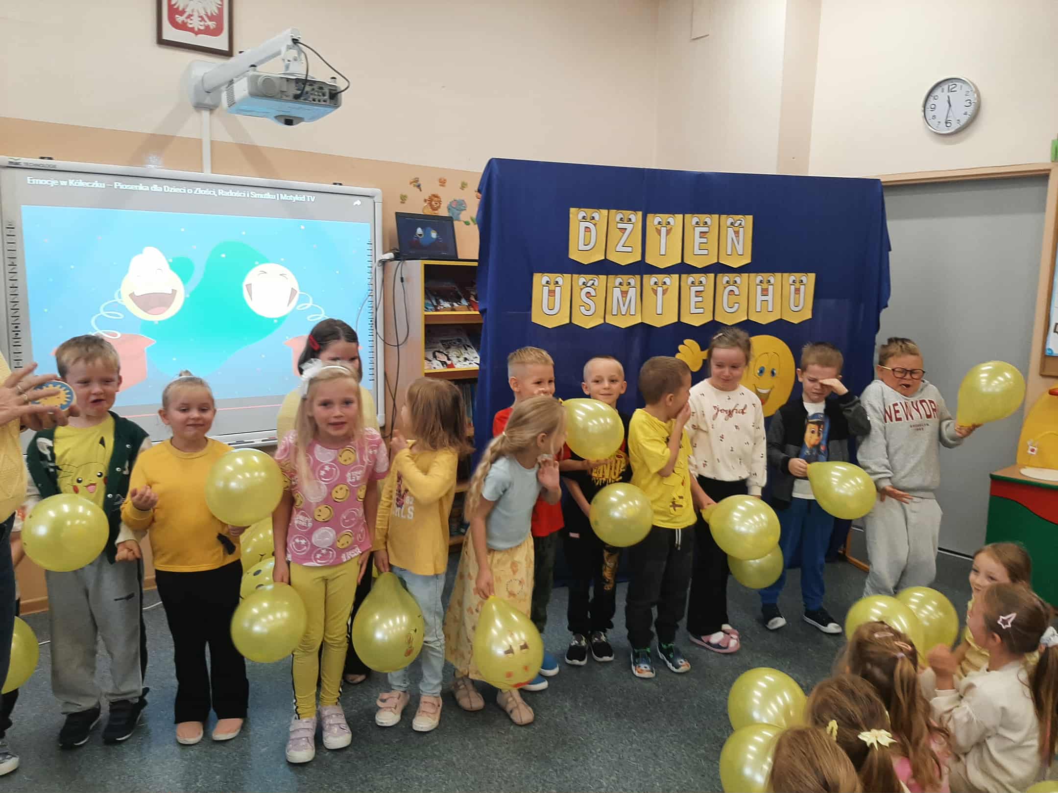 W dniu 06.10.2025r. w naszym przedszkolu obchodziliśmy Dzień Uśmiechu! W zabawie wzięły udział trzy grupy 6-latków, które od samego rana dzieliły się radością i pozytywną energią. Świętowanie rozpoczęło się od pogadanki o emocjach – dzieci rozmawiały o tym, co sprawia im radość i dlaczego warto się uśmiechać. Następnie przedszkolaki z wielkim zaangażowaniem rysowały wesołe minki na żółtych balonach, tworząc kolorowe, radosne buźki. Nie zabrakło też degustacji cytryny – to zabawne doświadczenie wywołało wiele śmiechu, choć miny nie zawsze były wesołe! Na zakończenie każde dziecko otrzymało Order Uśmiechu, jako symbol radości, życzliwości i dobrej zabawy. Dzień zakończyliśmy pamiątkowymi zdjęciami grupowymi, które na pewno będą piękną pamiątką tego radosnego wydarzenia. Uśmiech to najlepszy sposób, by świat stał się lepszy!