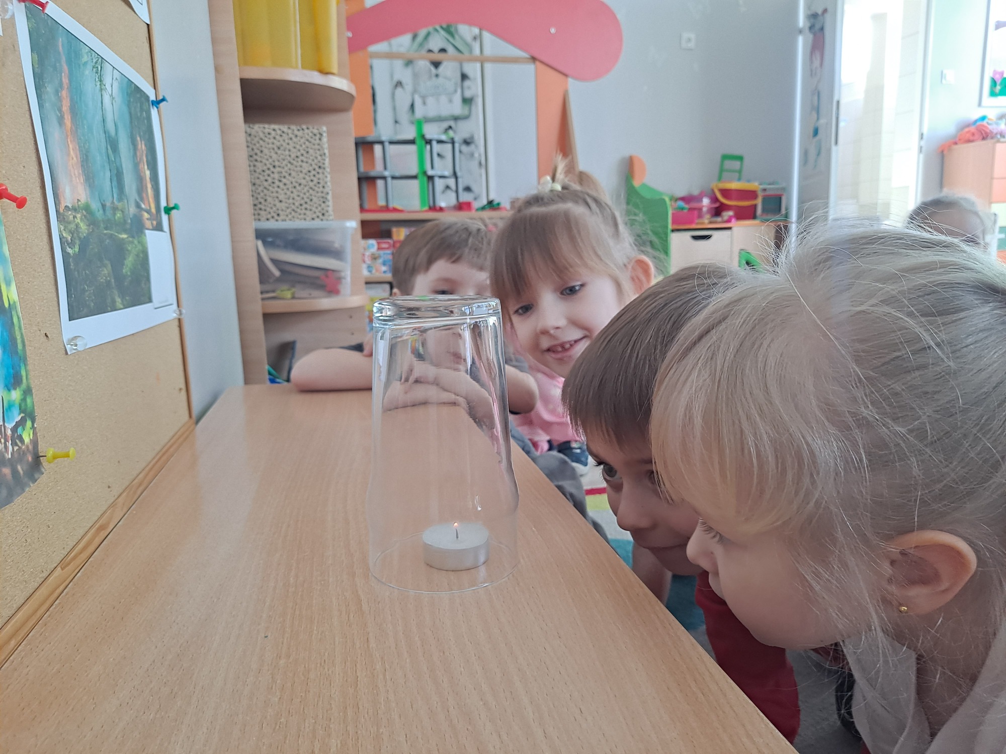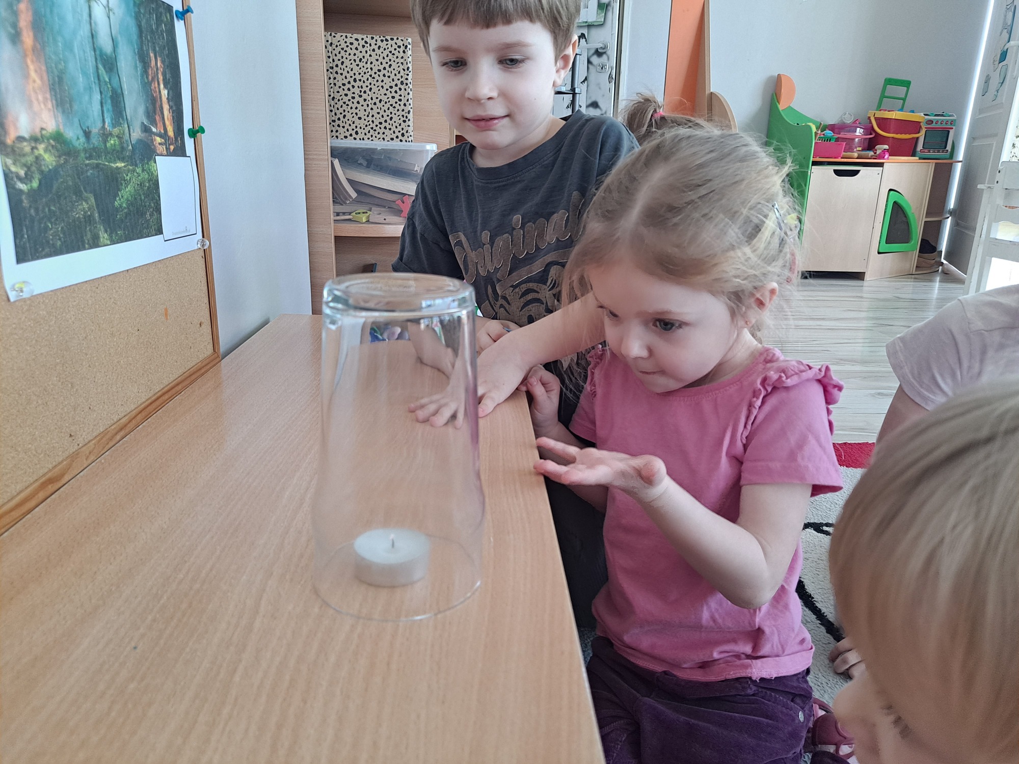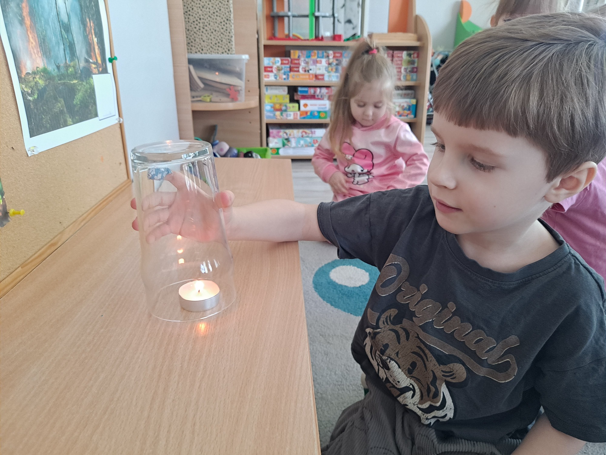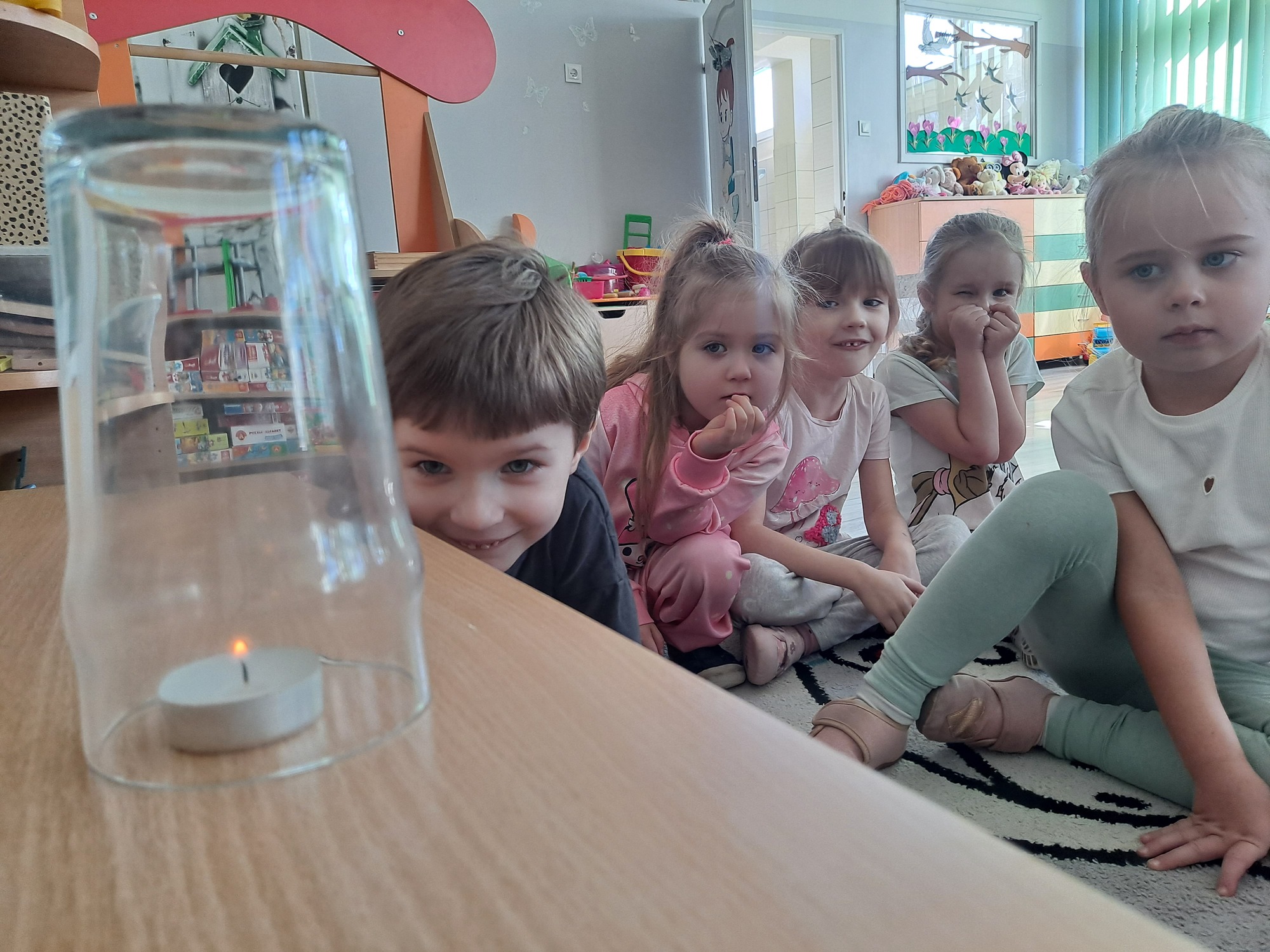 Podczas dzisiejszych zajęć dzieci miały okazję wziąć udział w ciekawym eksperymencie związanym z ogniem. Pod pilnym okiem nauczyciela przedszkolaki obserwowały świeczkę, którą następnie przykrywano szklanką. Dzieci z dużym zainteresowaniem zastanawiały się, dlaczego płomień po chwili gaśnie pod przykrytą szklanką.