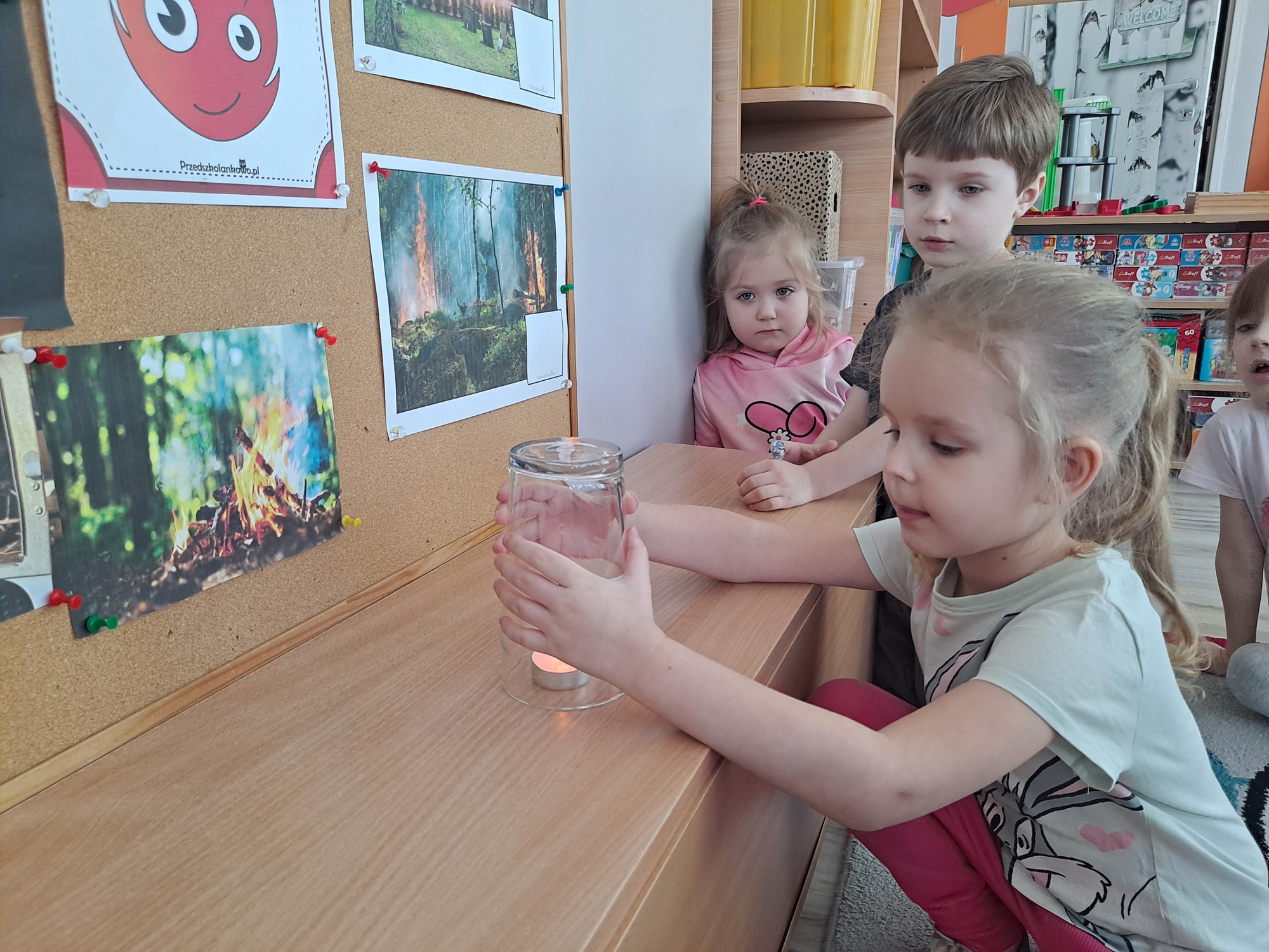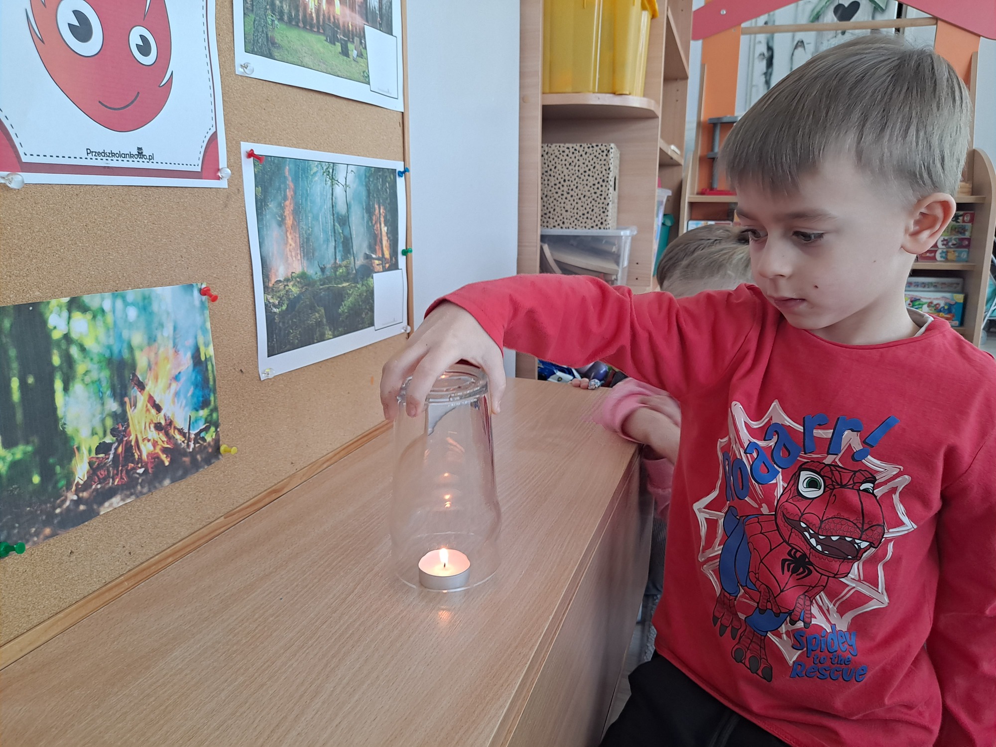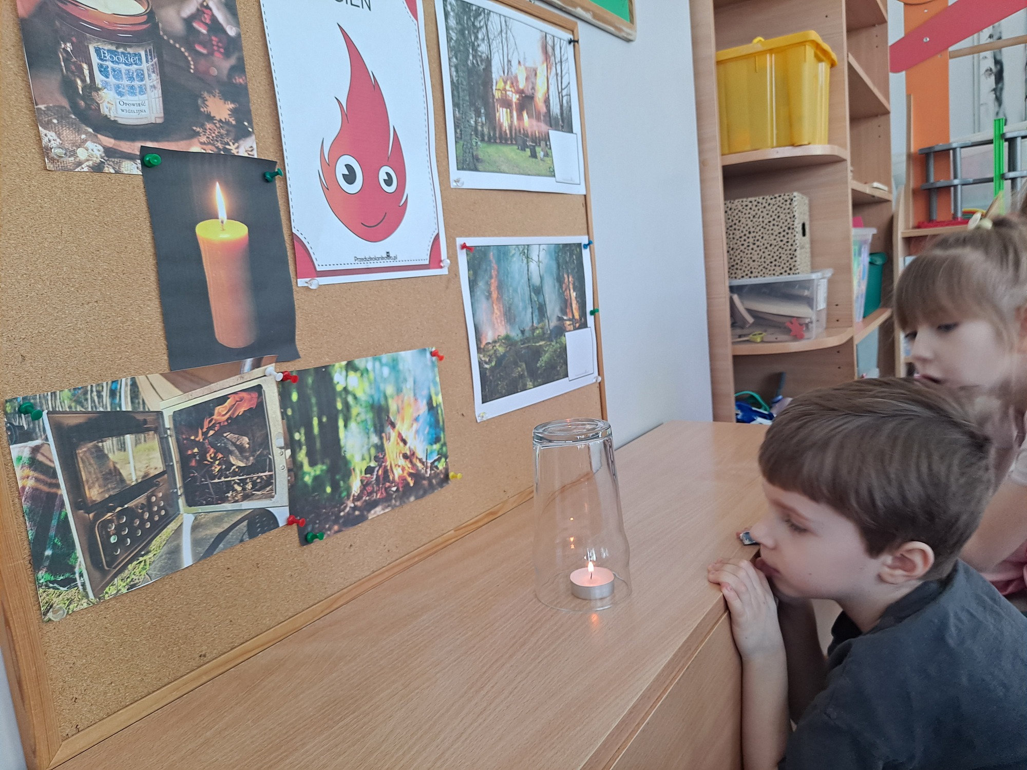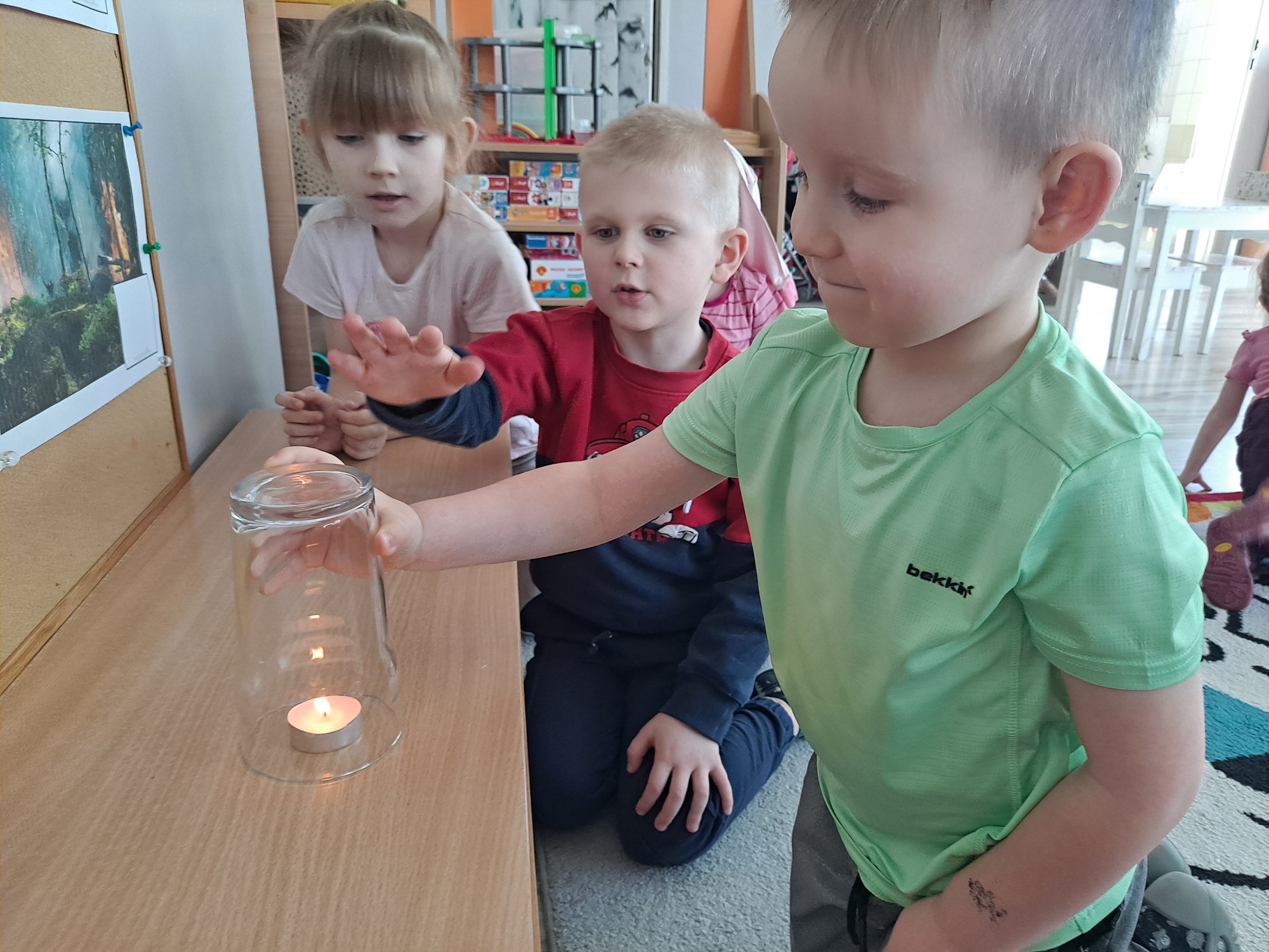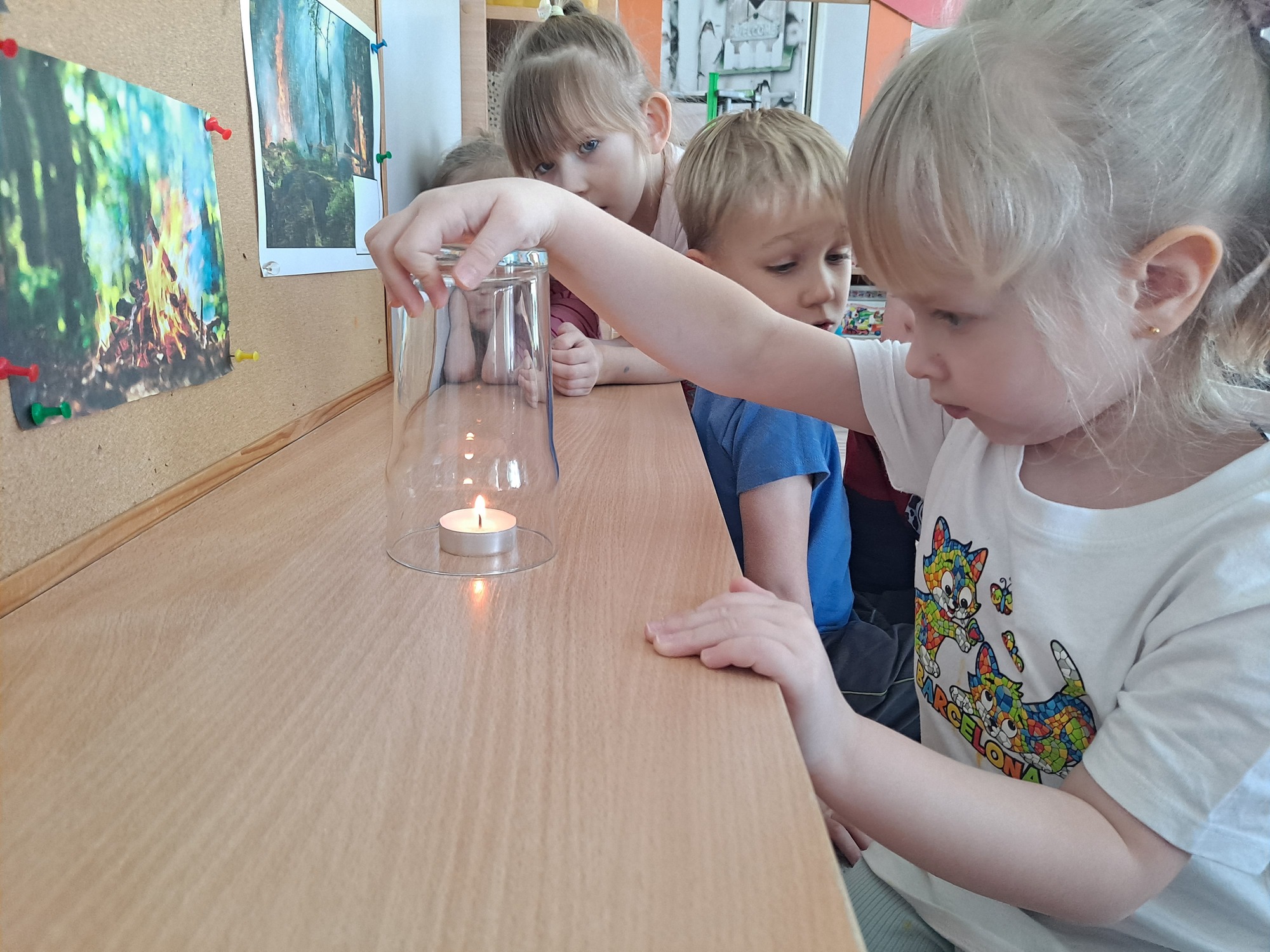 Podczas dzisiejszych zajęć dzieci miały okazję wziąć udział w ciekawym eksperymencie związanym z ogniem. Pod pilnym okiem nauczyciela przedszkolaki obserwowały świeczkę, którą następnie przykrywano szklanką. Dzieci z dużym zainteresowaniem zastanawiały się, dlaczego płomień po chwili gaśnie pod przykrytą szklanką.