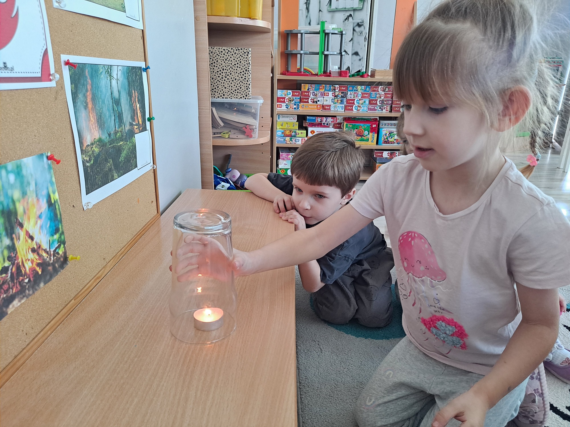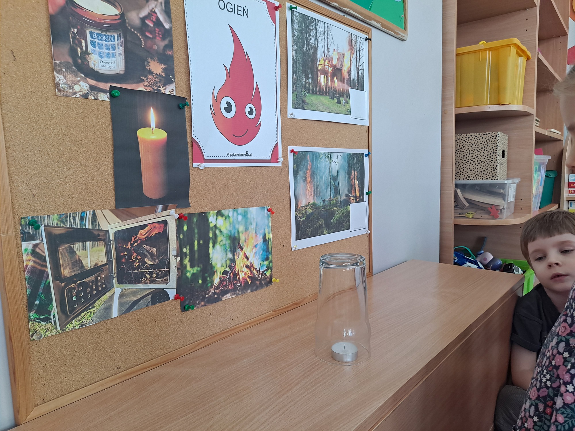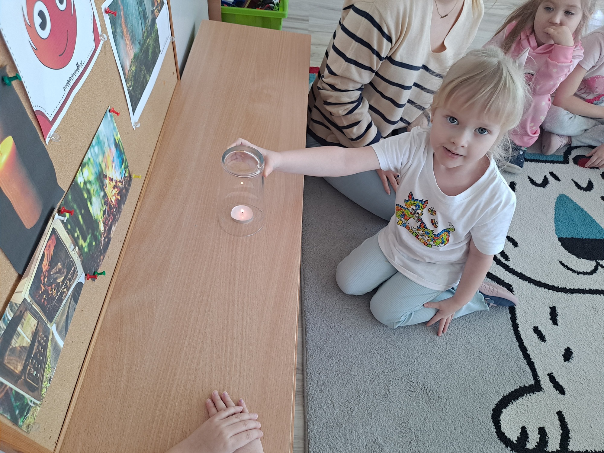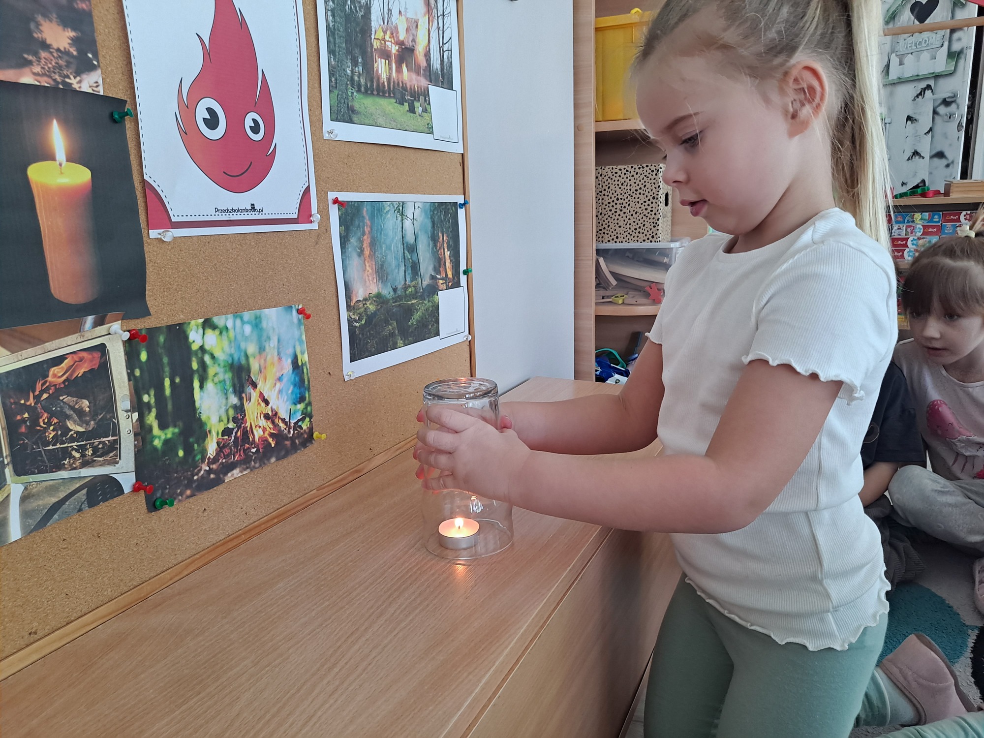 Podczas dzisiejszych zajęć dzieci miały okazję wziąć udział w ciekawym eksperymencie związanym z ogniem. Pod pilnym okiem nauczyciela przedszkolaki obserwowały świeczkę, którą następnie przykrywano szklanką. Dzieci z dużym zainteresowaniem zastanawiały się, dlaczego płomień po chwili gaśnie pod przykrytą szklanką.