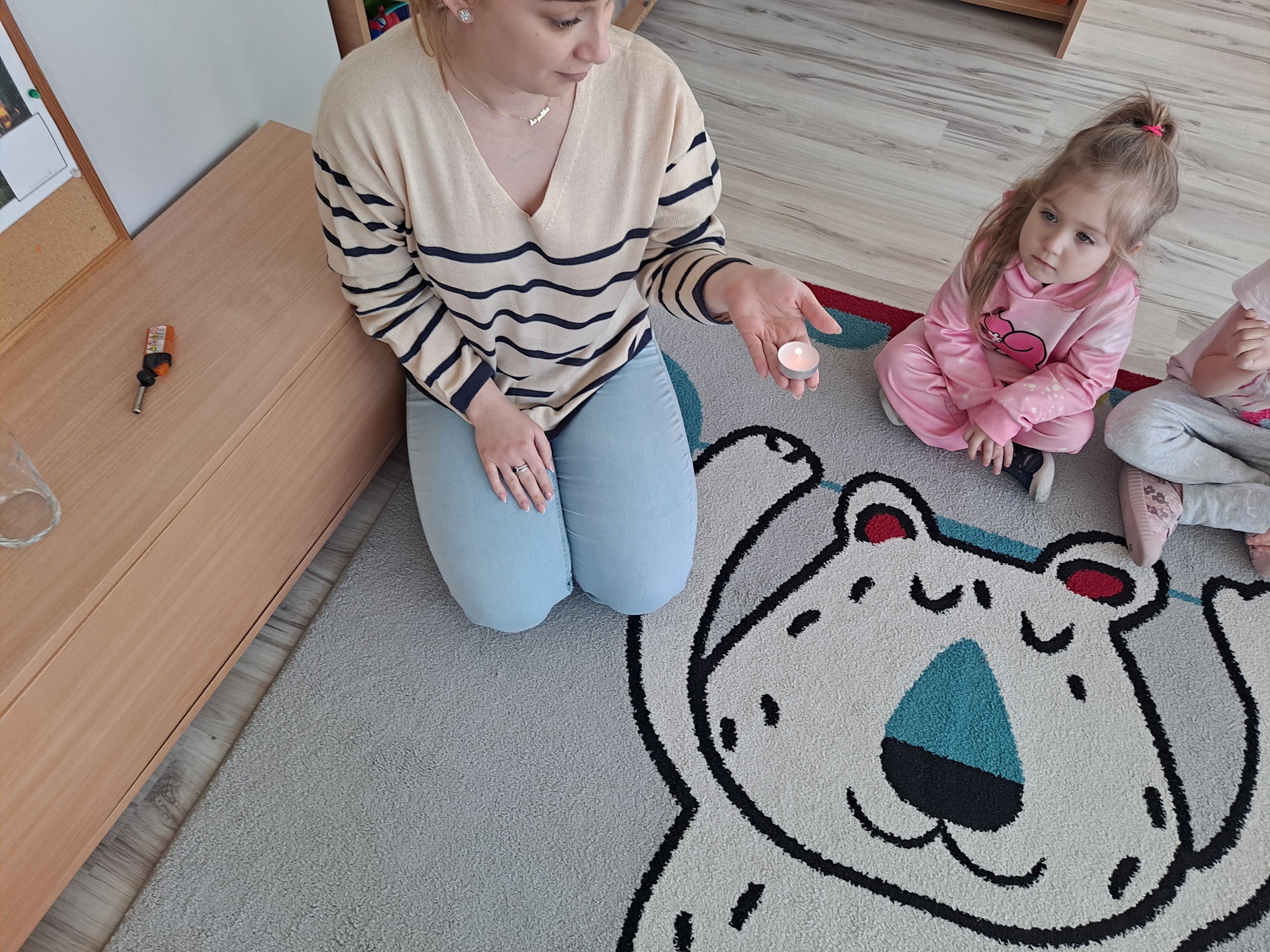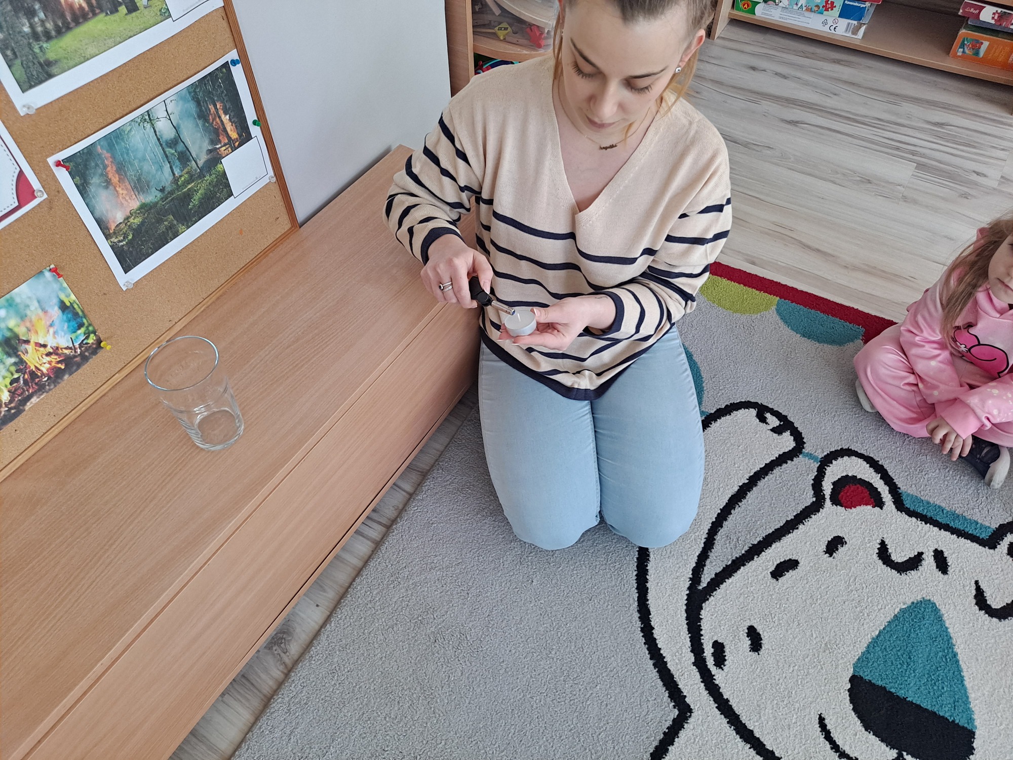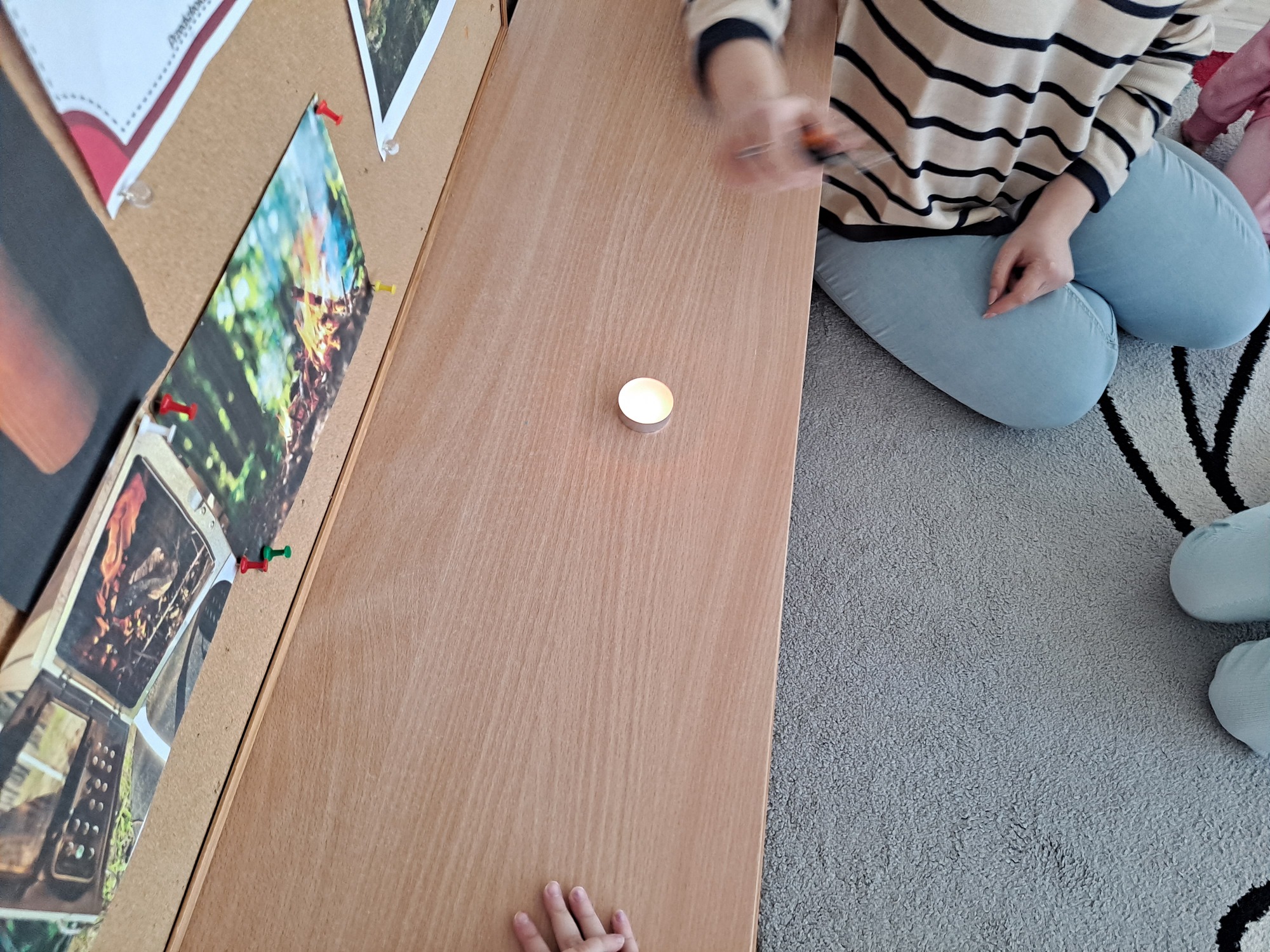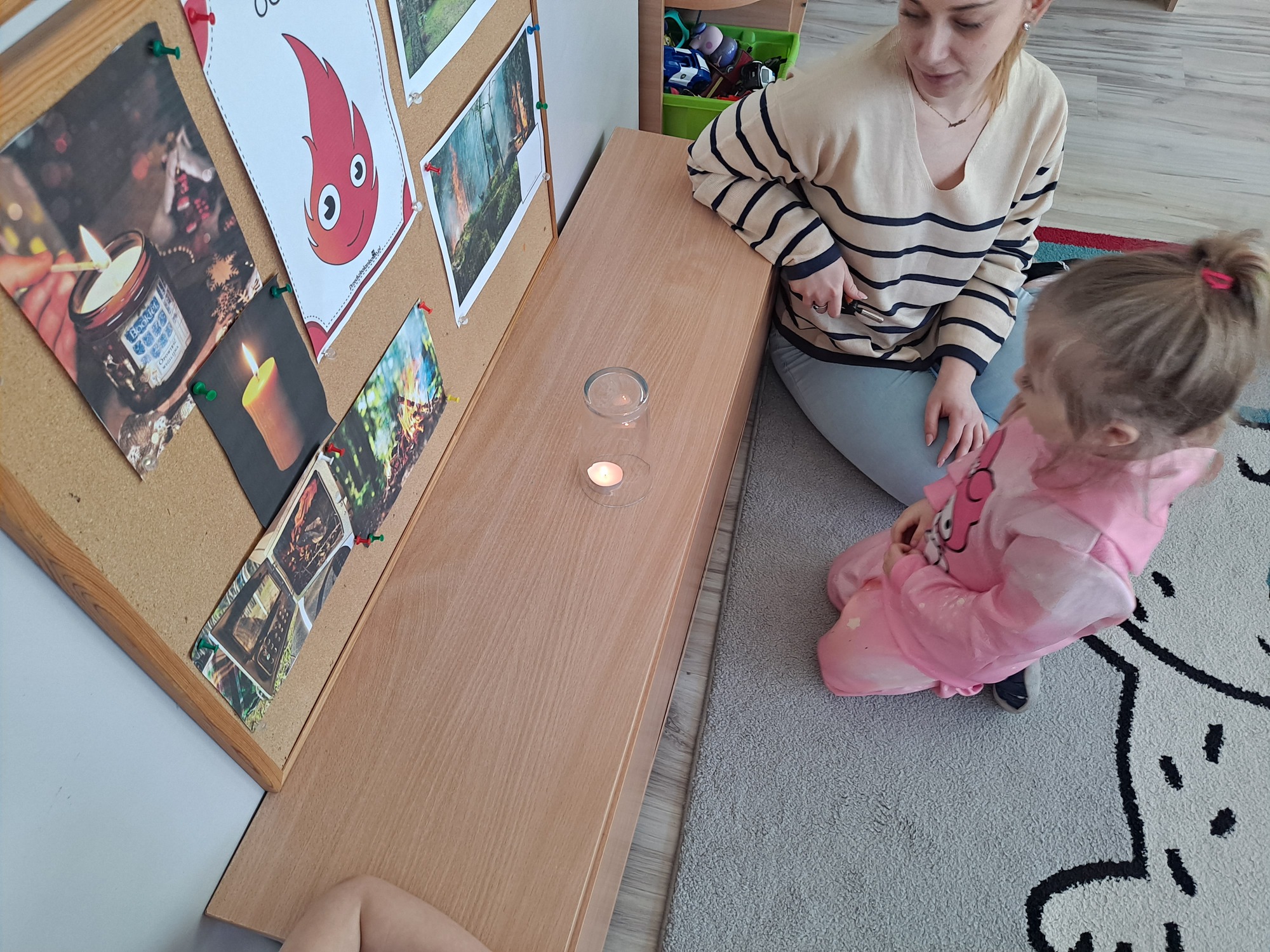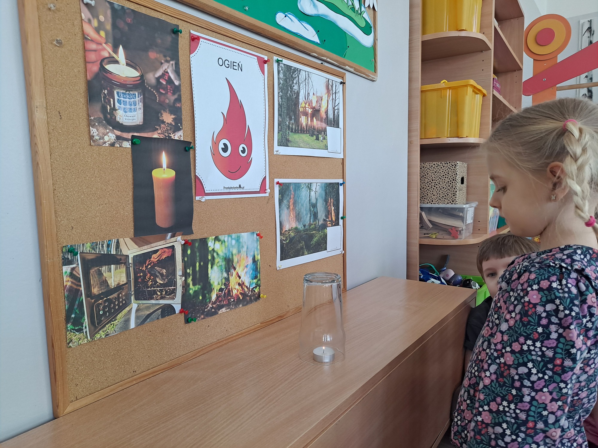 Podczas dzisiejszych zajęć dzieci miały okazję wziąć udział w ciekawym eksperymencie związanym z ogniem. Pod pilnym okiem nauczyciela przedszkolaki obserwowały świeczkę, którą następnie przykrywano szklanką. Dzieci z dużym zainteresowaniem zastanawiały się, dlaczego płomień po chwili gaśnie pod przykrytą szklanką.