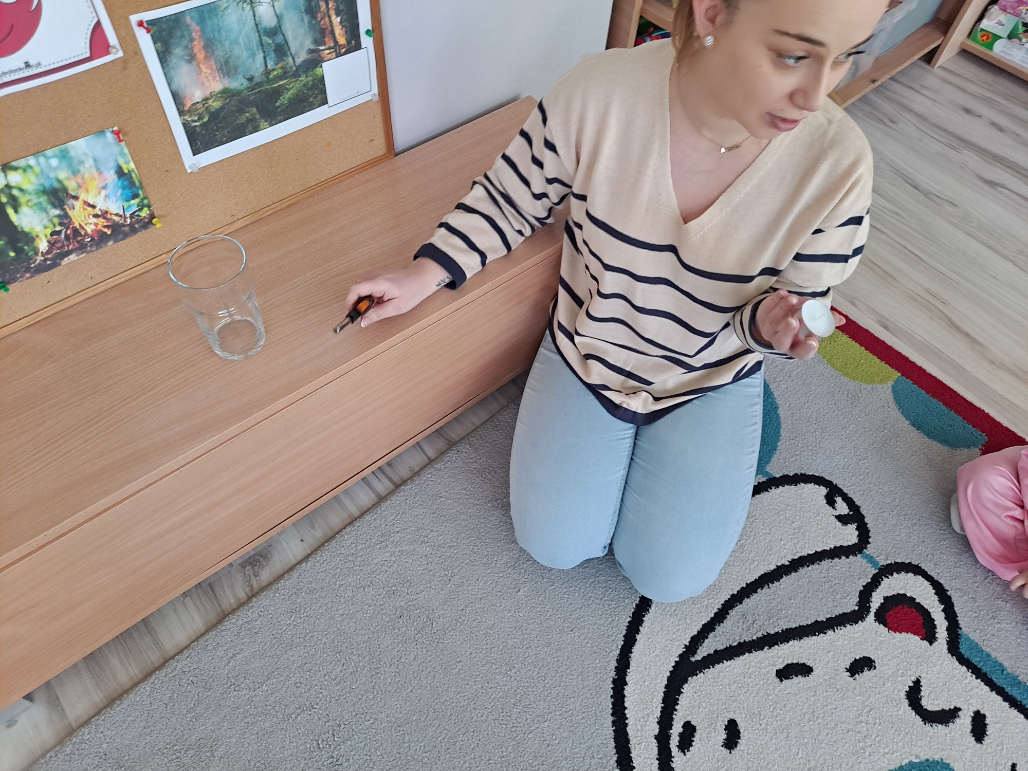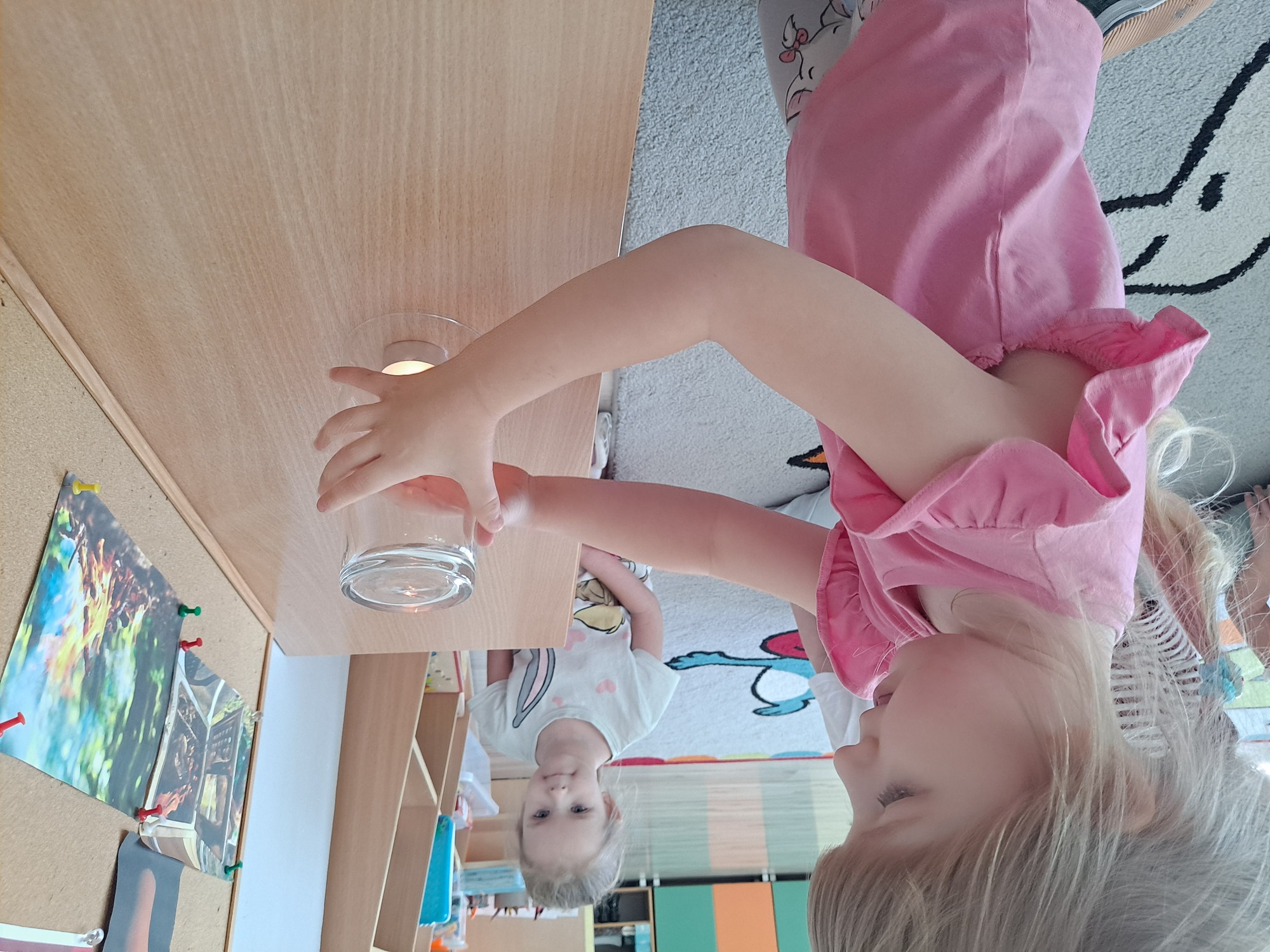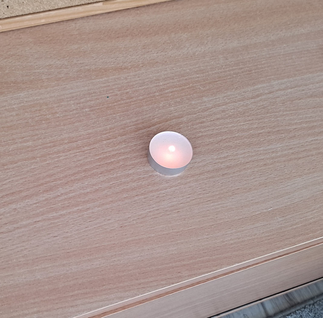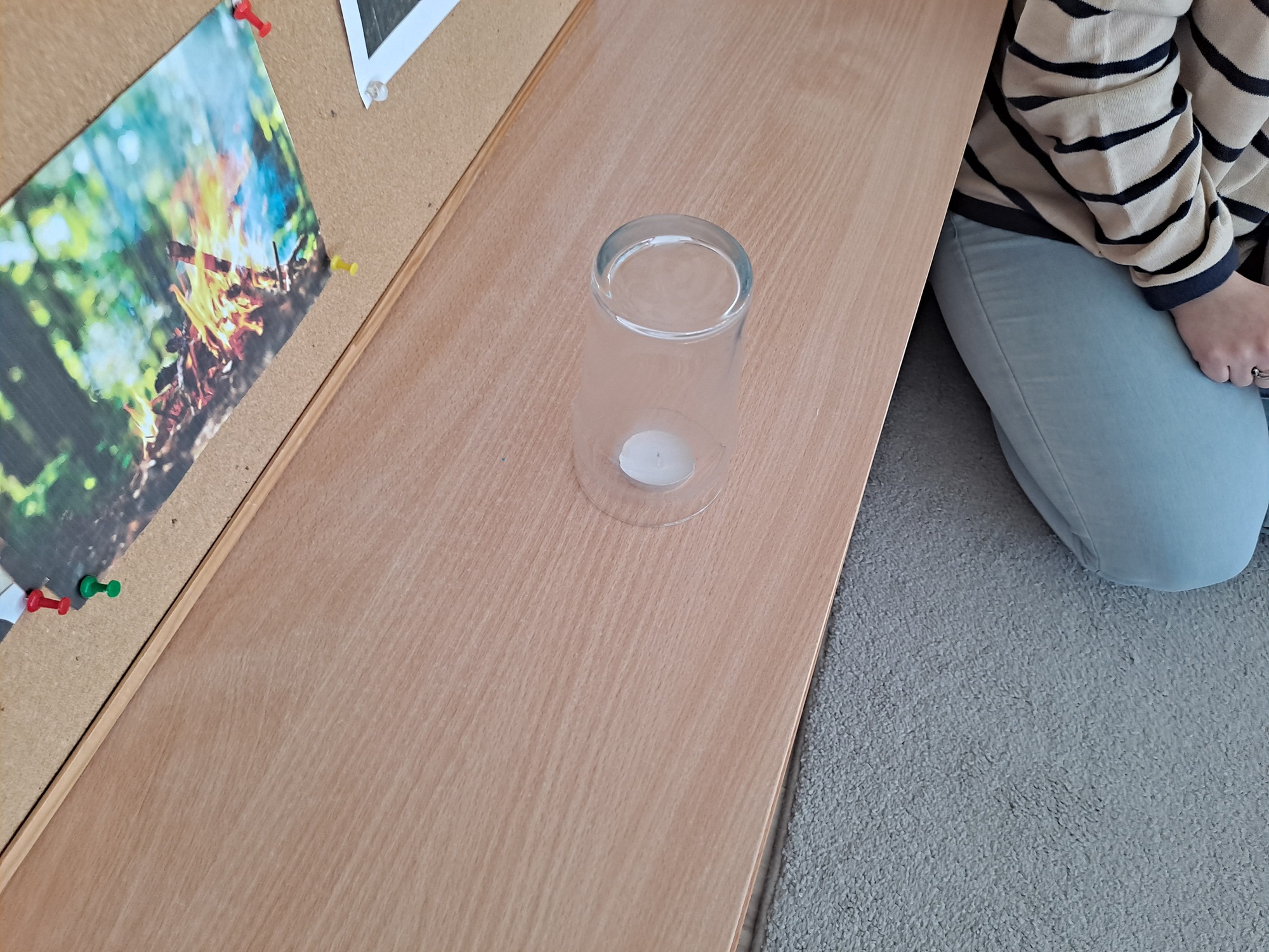 Podczas dzisiejszych zajęć dzieci miały okazję wziąć udział w ciekawym eksperymencie związanym z ogniem. Pod pilnym okiem nauczyciela przedszkolaki obserwowały świeczkę, którą następnie przykrywano szklanką. Dzieci z dużym zainteresowaniem zastanawiały się, dlaczego płomień po chwili gaśnie pod przykrytą szklanką.