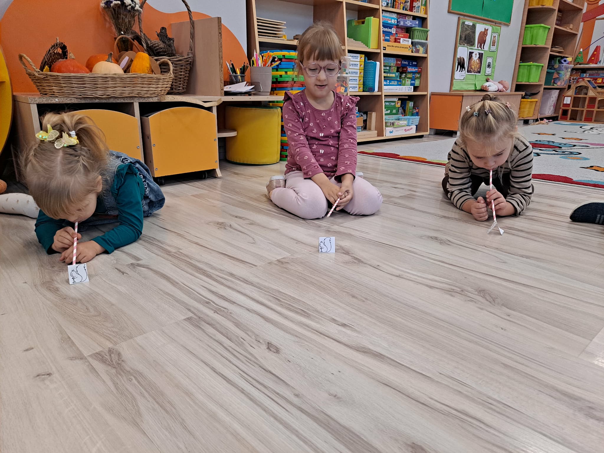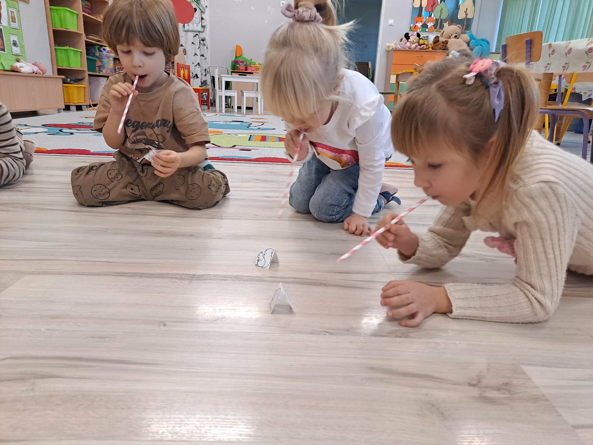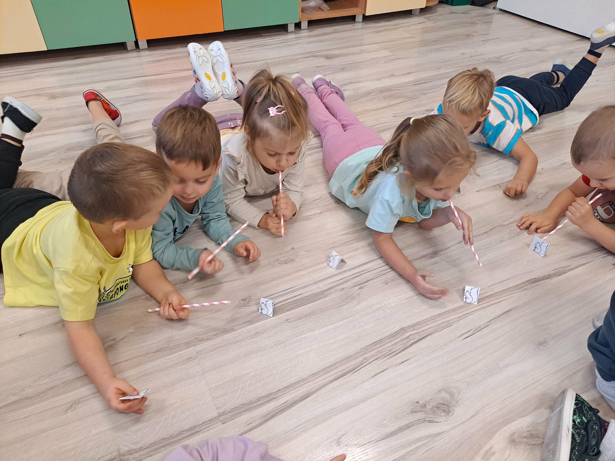 Dzieci najpierw bawiły się papierową wiewiórką, na którą dmuchały przez słomki.