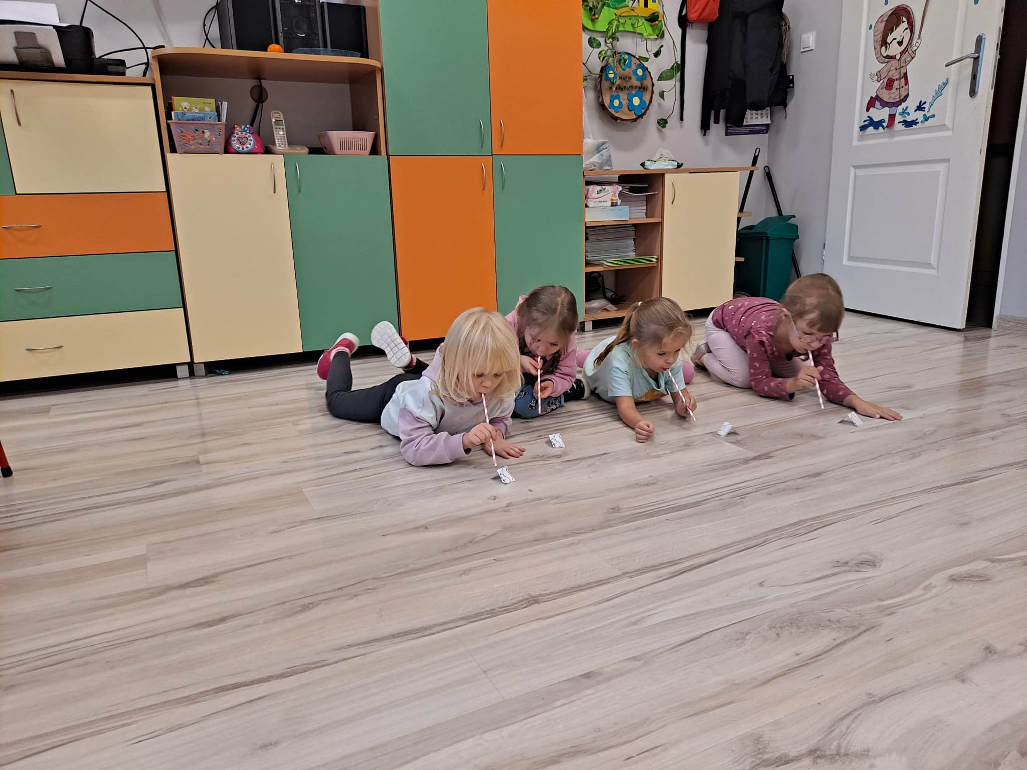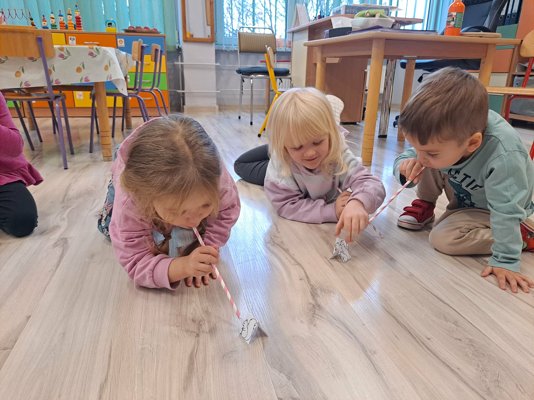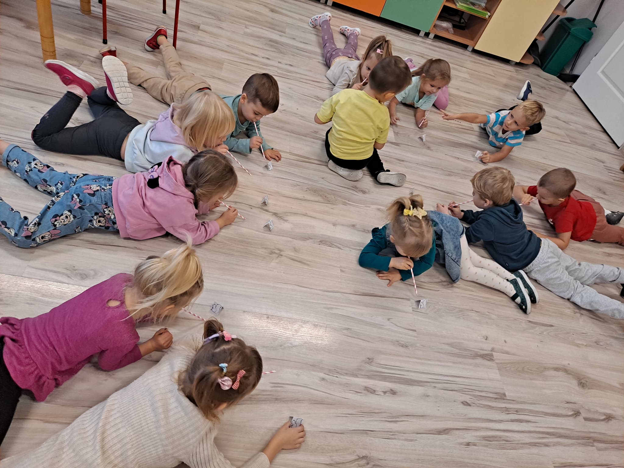 Dzieci najpierw bawiły się papierową wiewiórką, na którą dmuchały przez słomki.