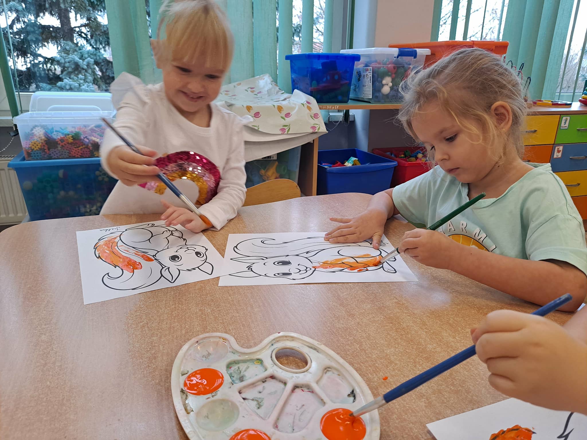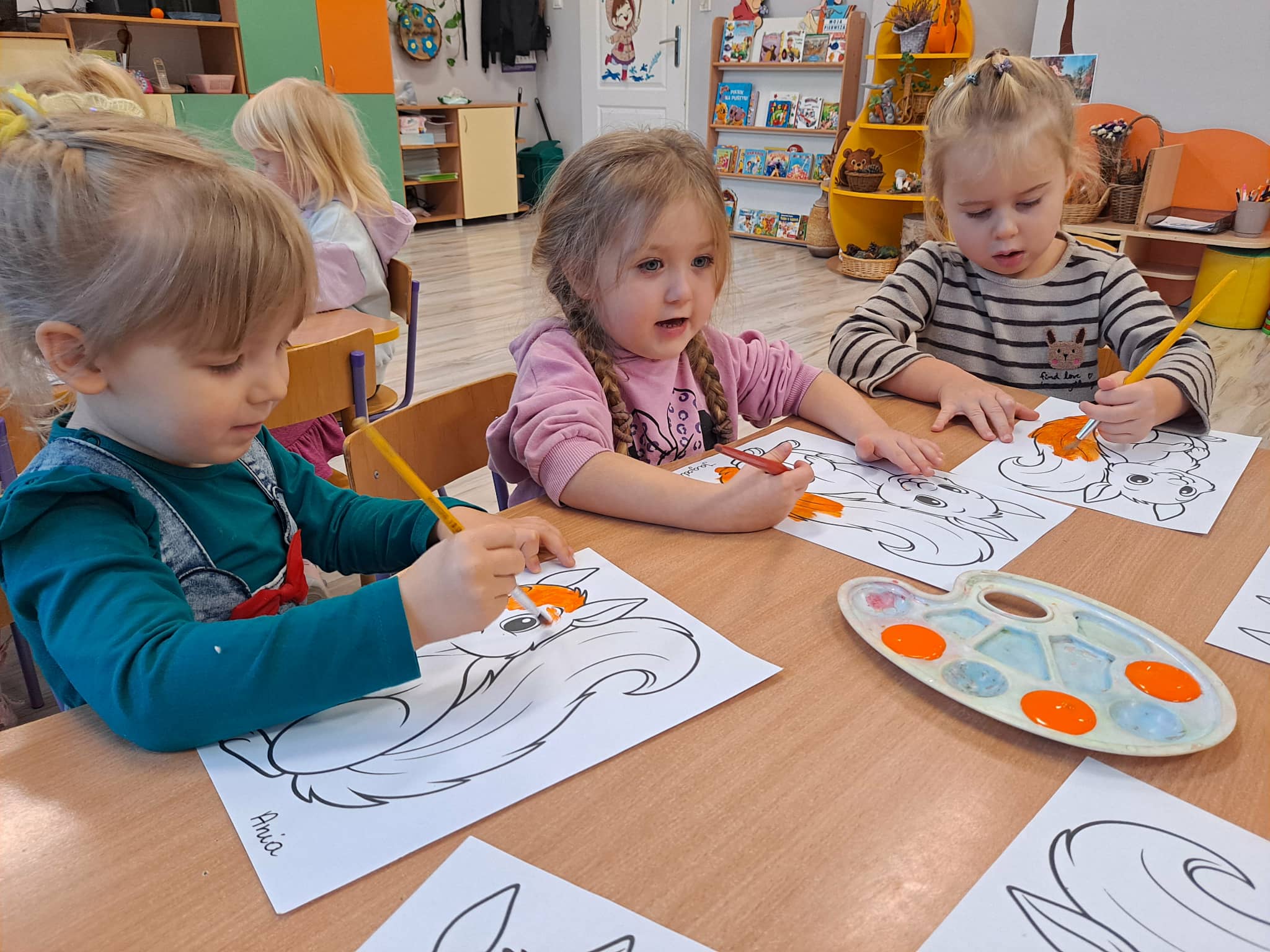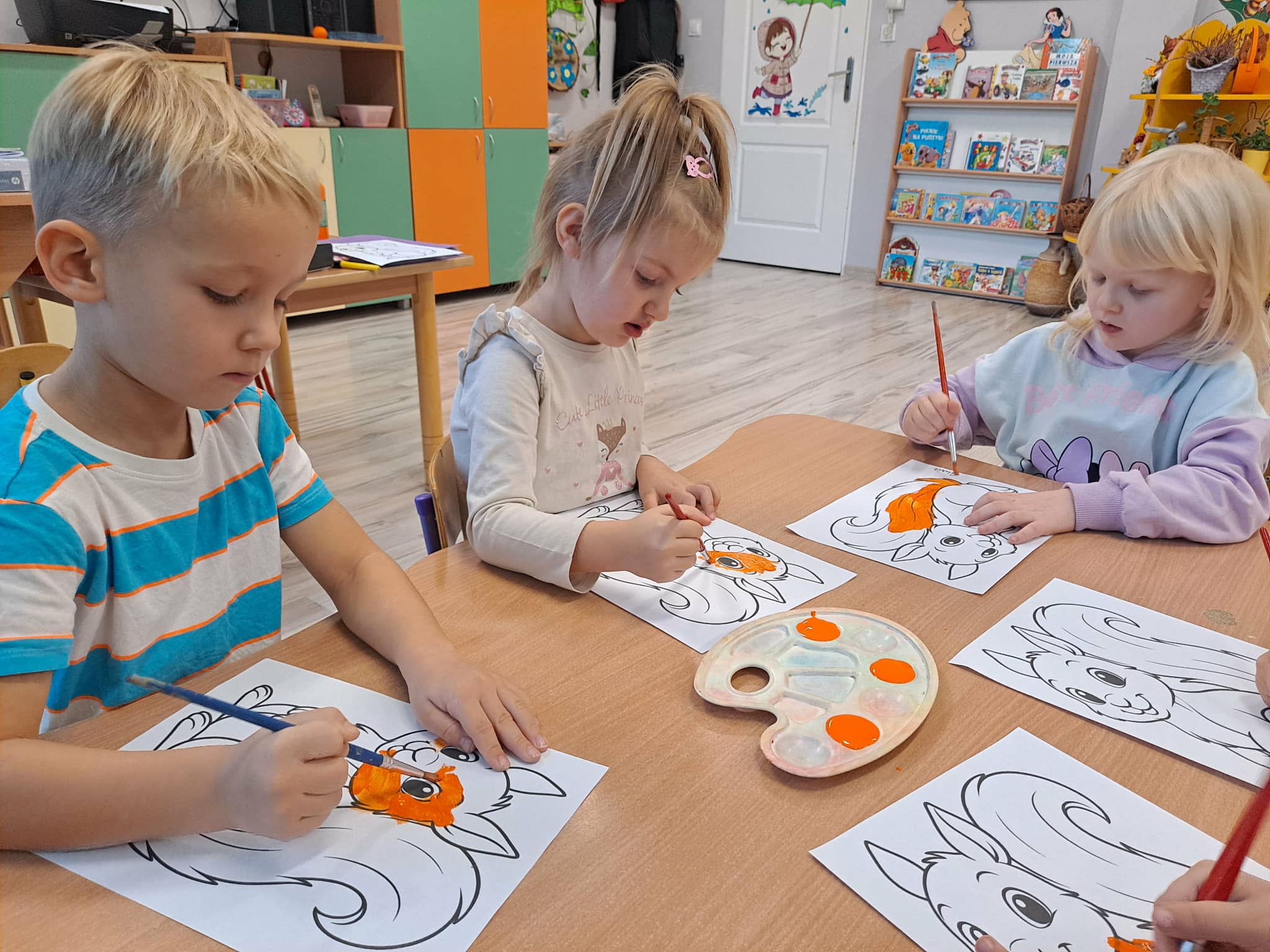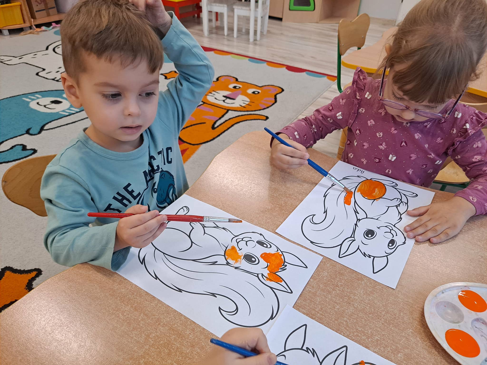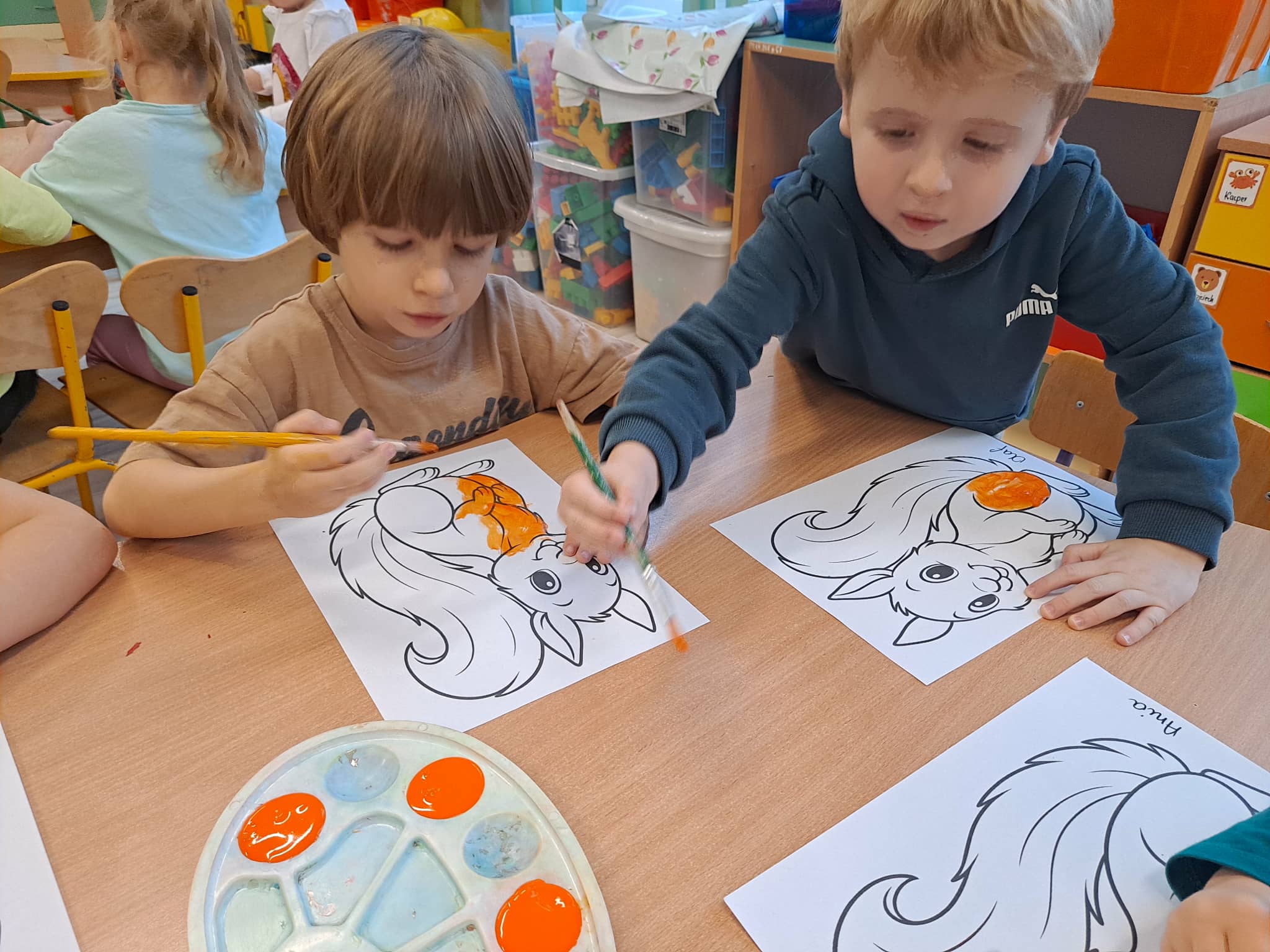 Następnie przedszkolaki malowały farbami kontur wiewiórki.