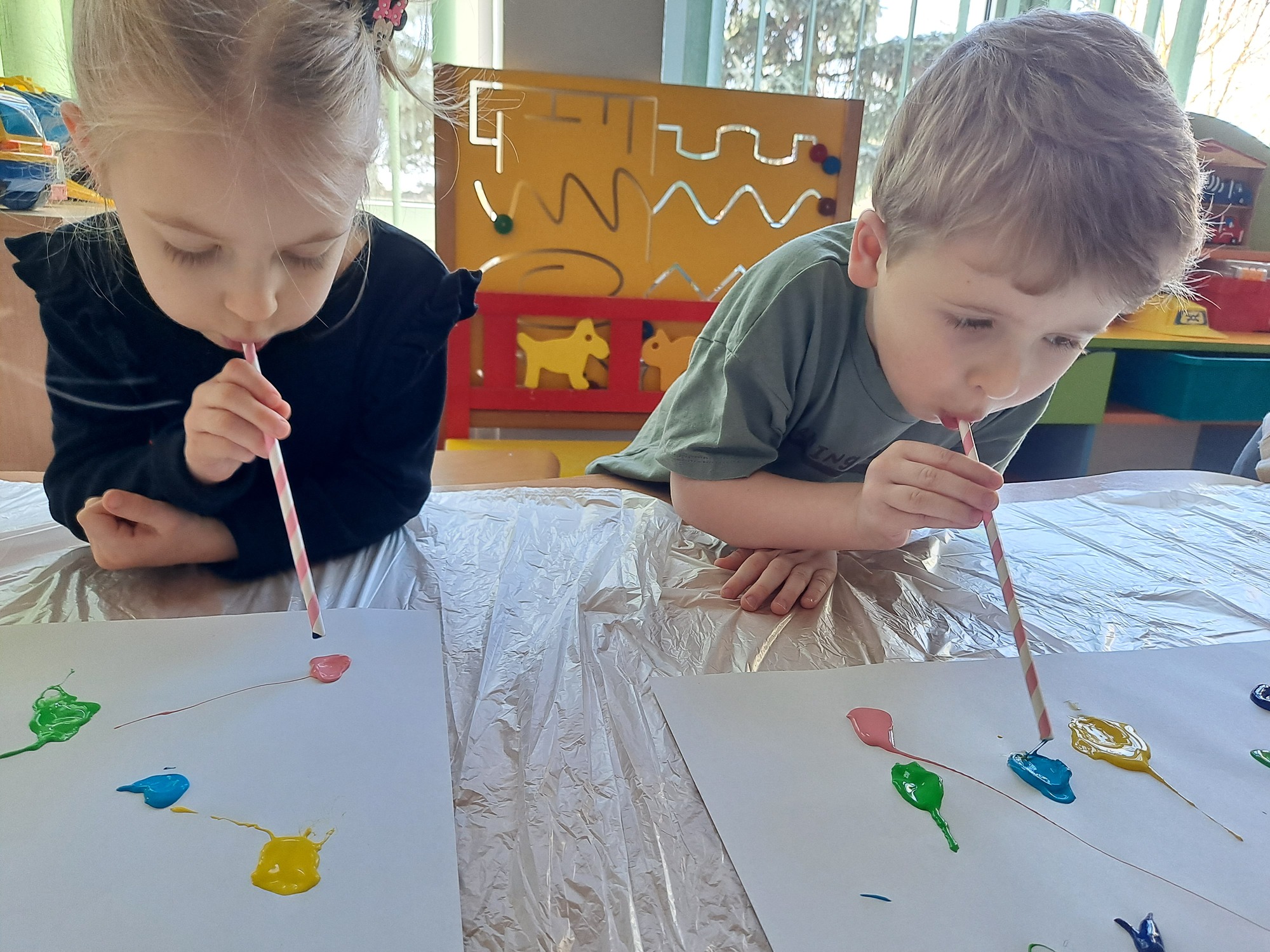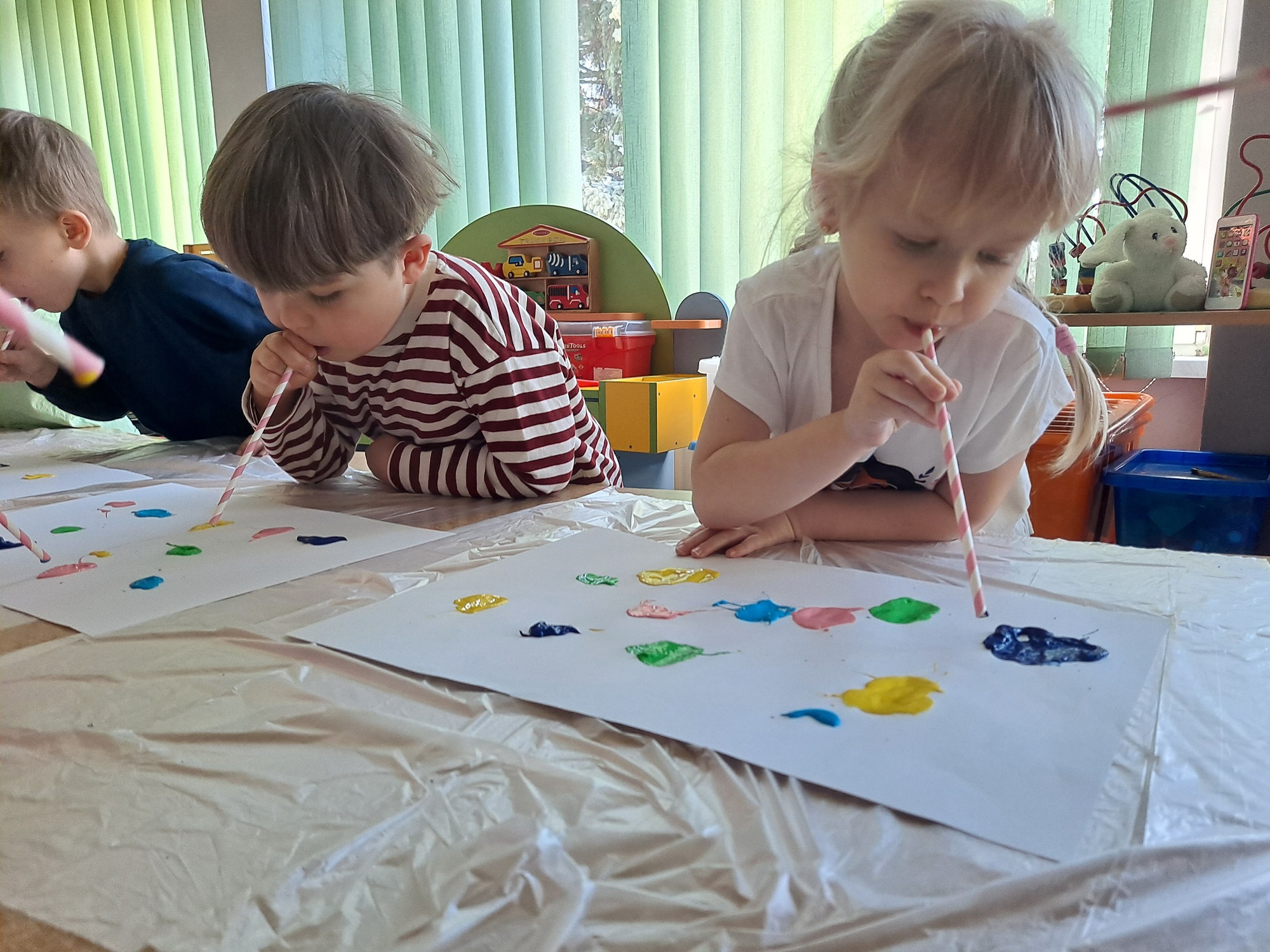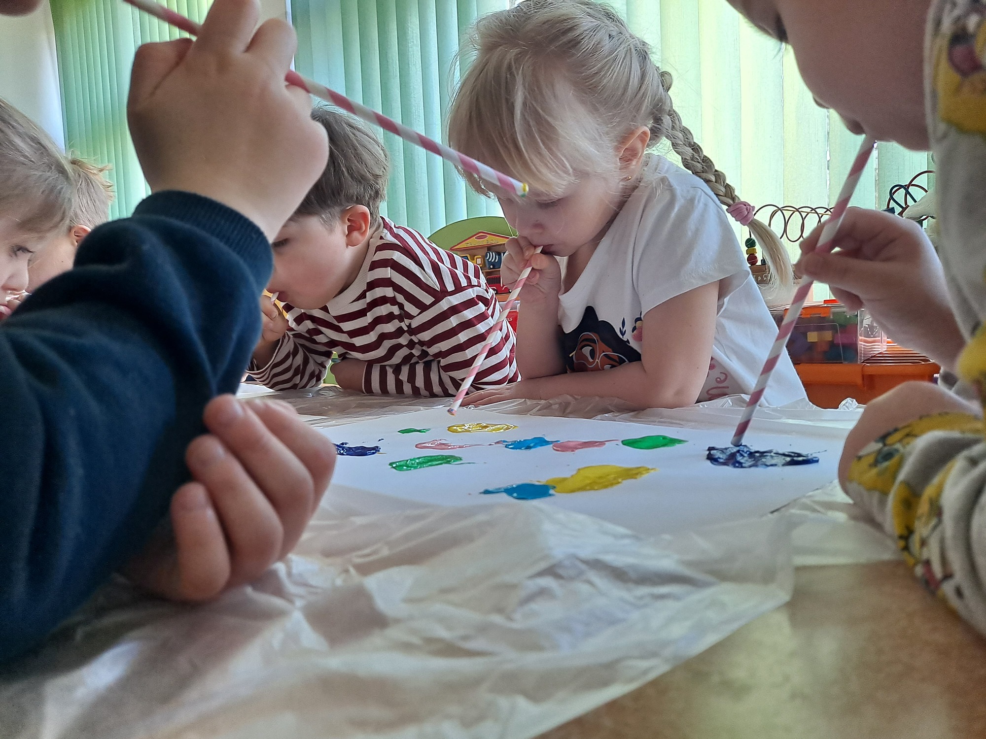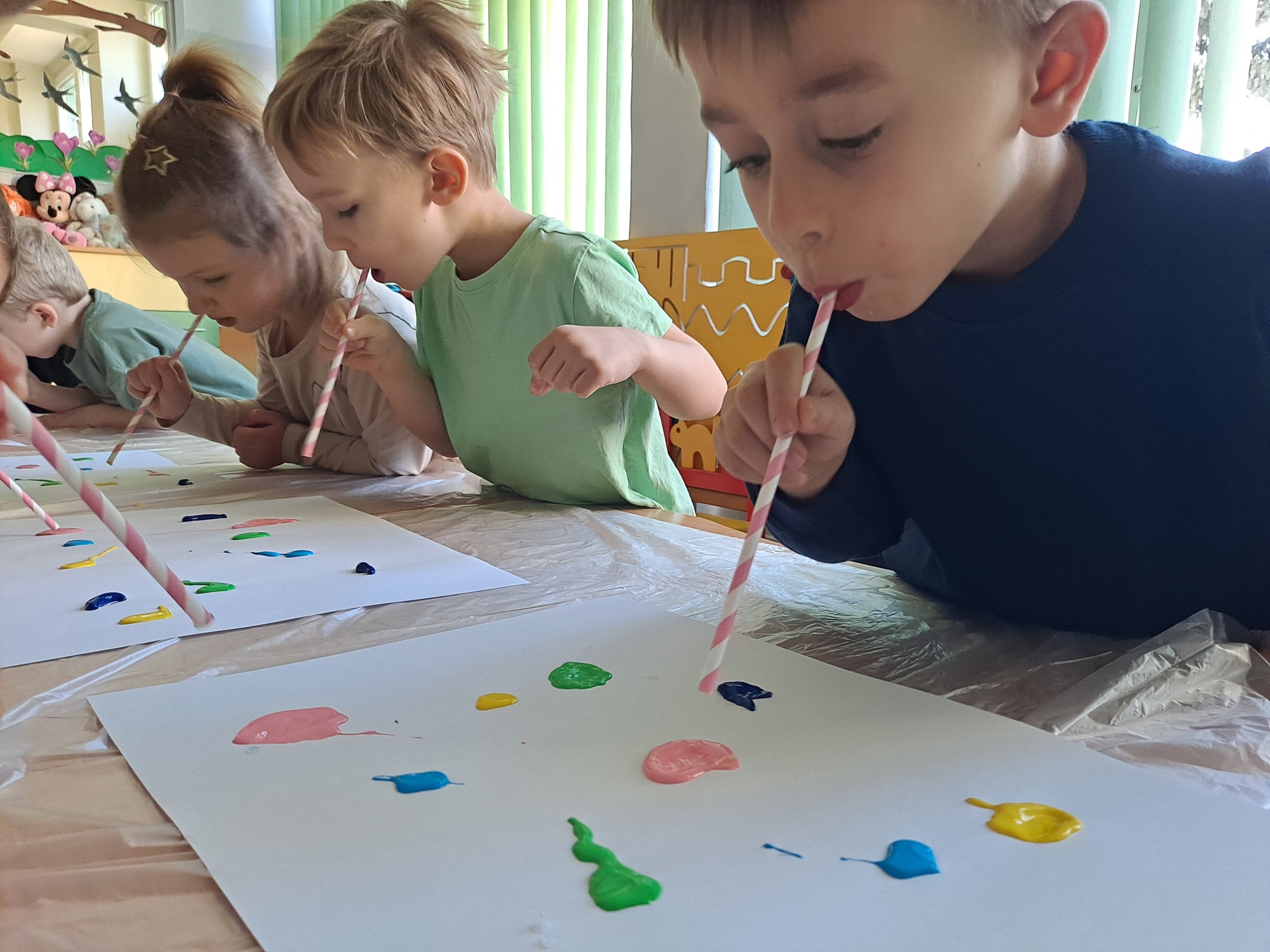 Za pomocą słomek rozdmuchiwały kleksy z farby, tworząc ciekawe wzory i kolorowe kształty.