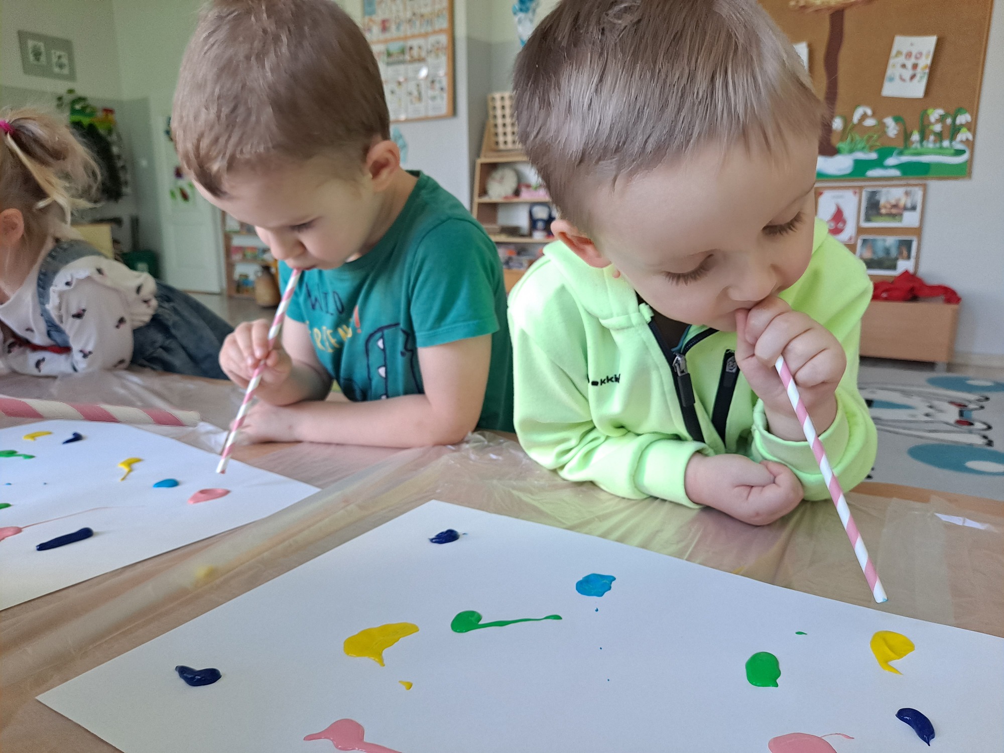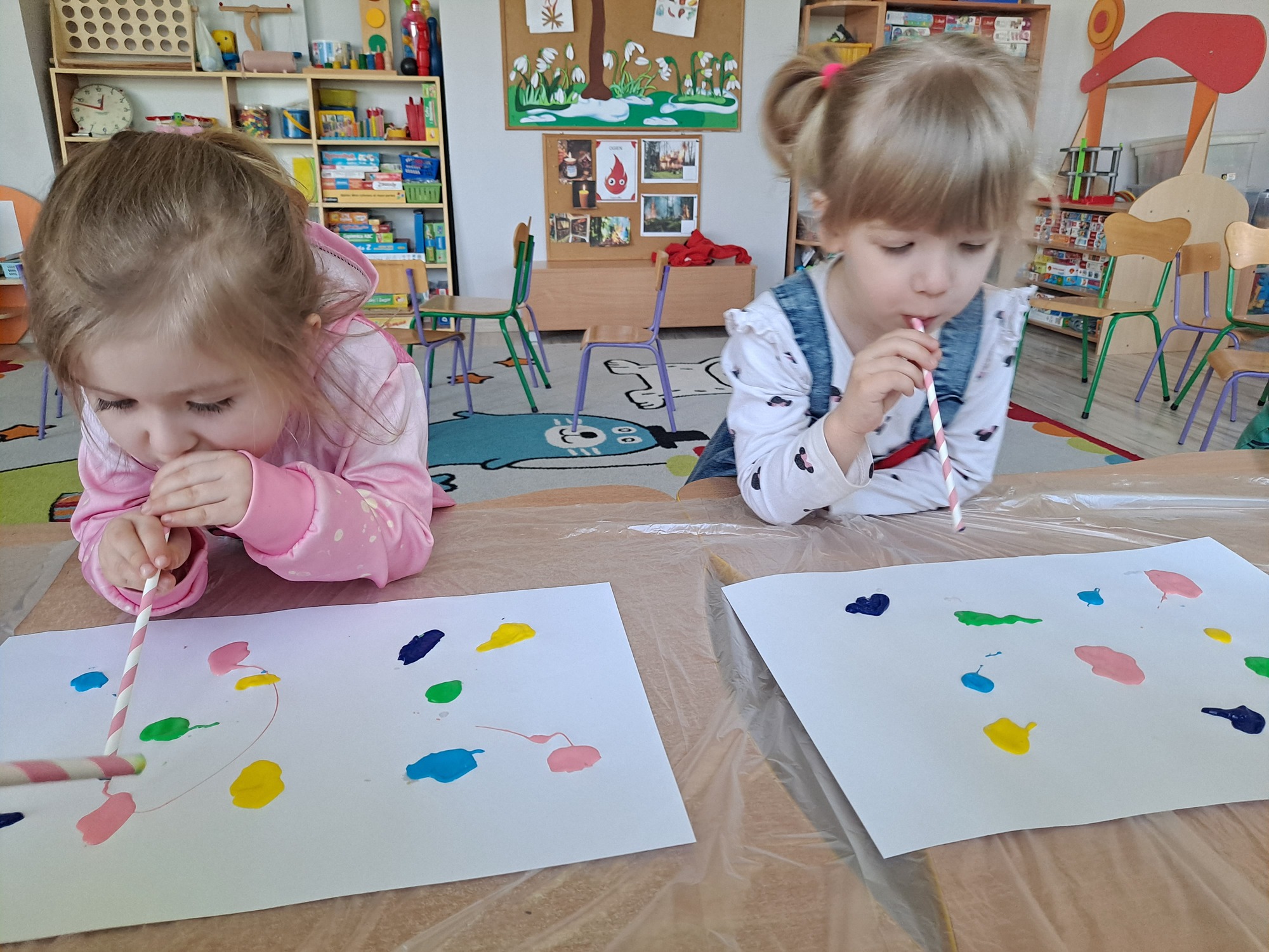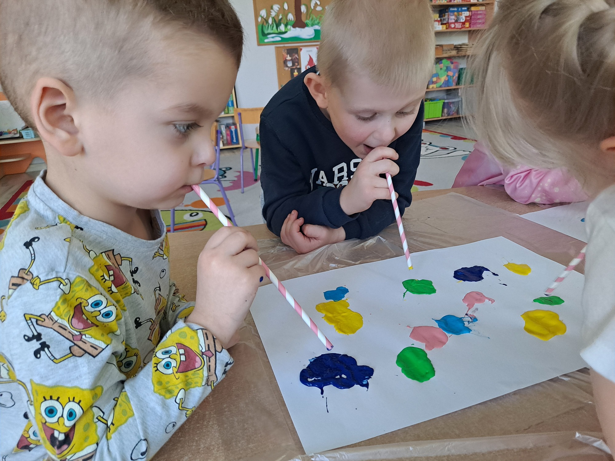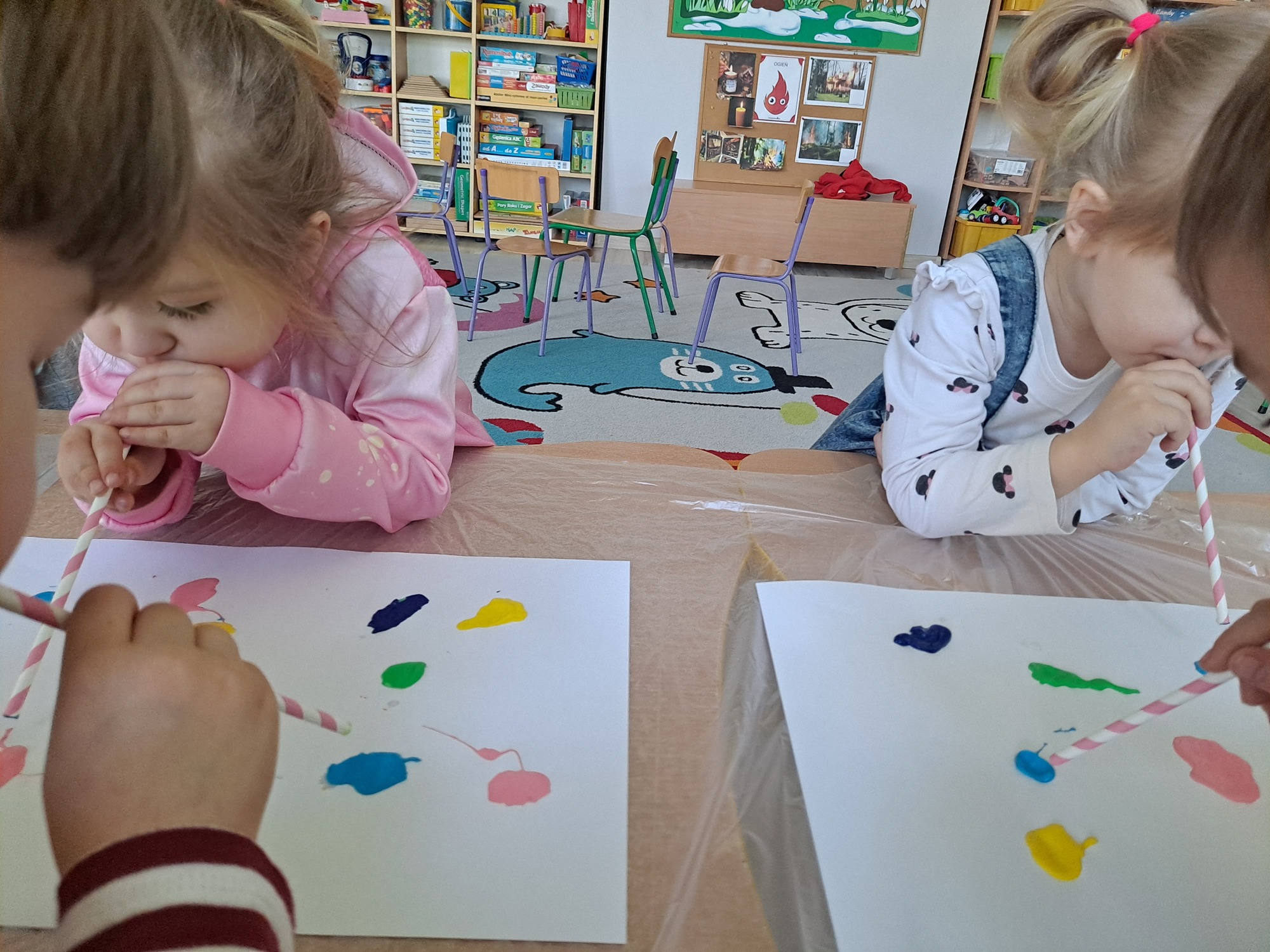 Za pomocą słomek rozdmuchiwały kleksy z farby, tworząc ciekawe wzory i kolorowe kształty.