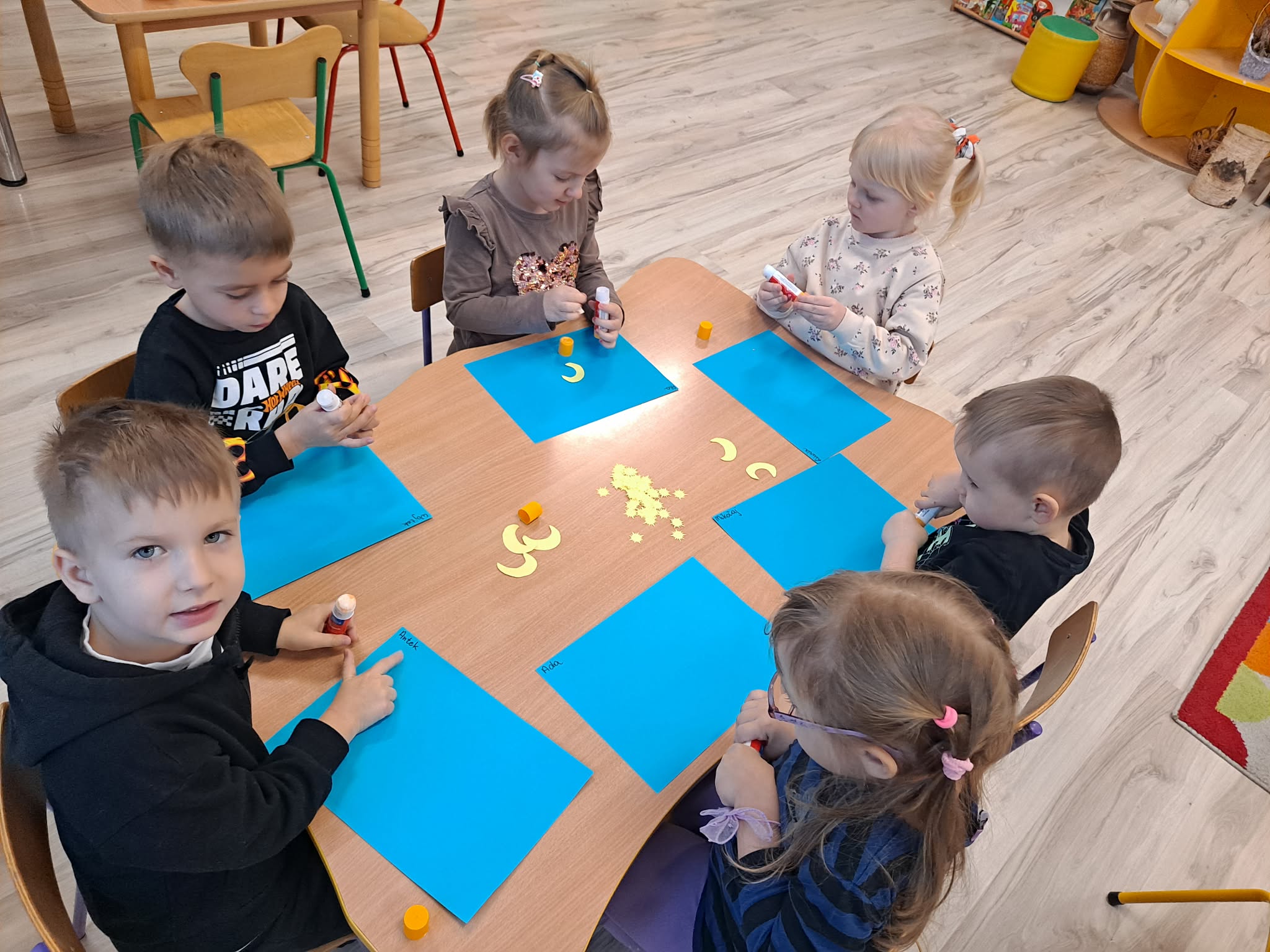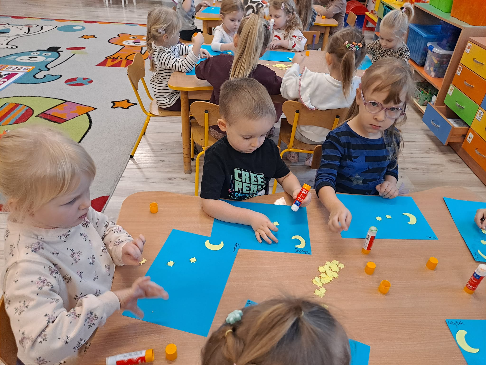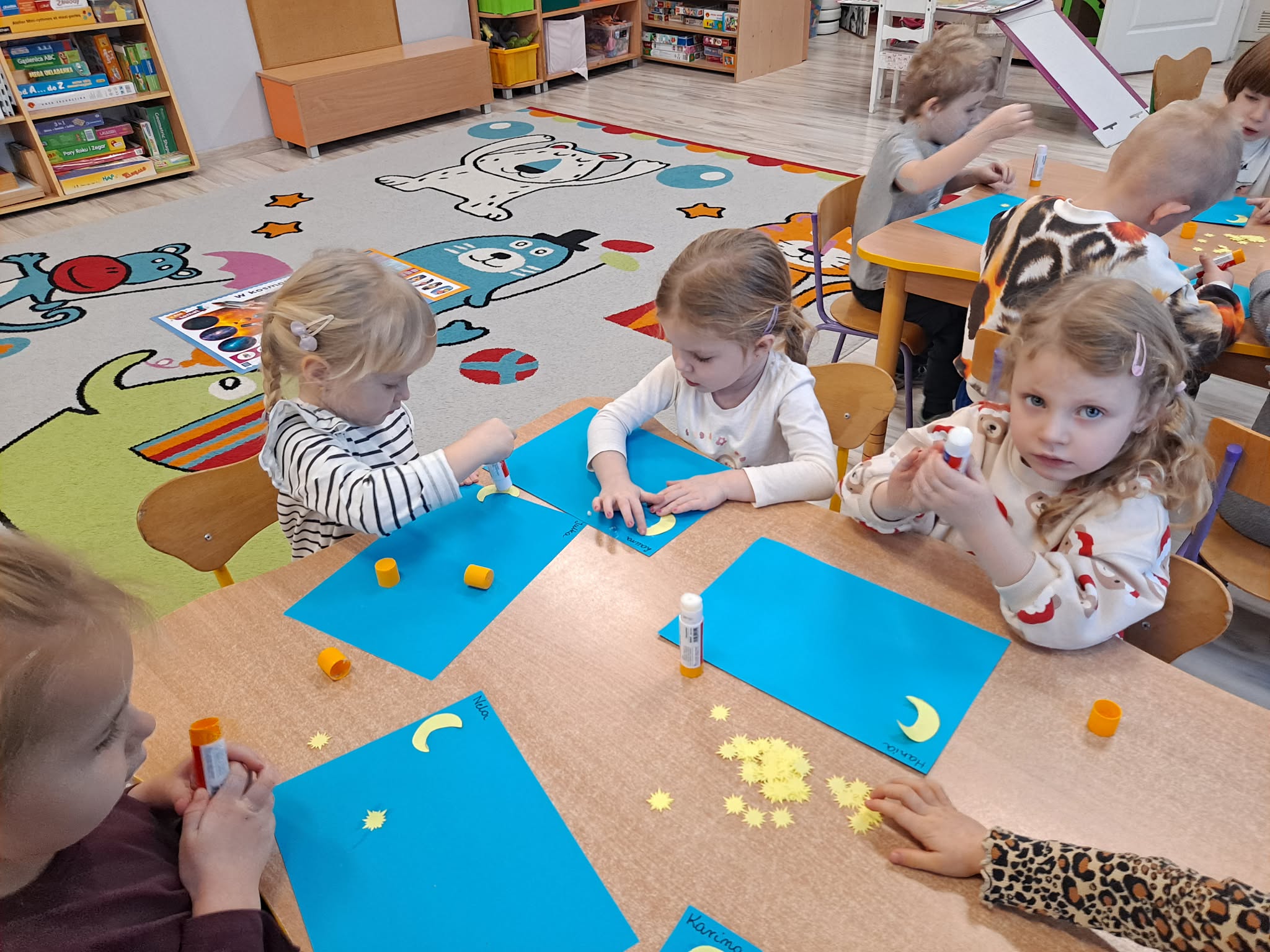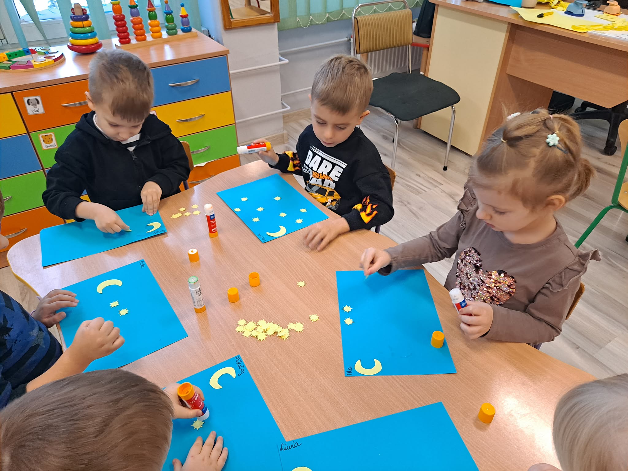 Zwieńczeniem zajęć była praca plastyczna, podczas której dzieci z dużym zaangażowaniem przyklejały gwiazdki oraz księżyc na niebieską kartkę, tworząc własny, niepowtarzalny układ gwiazd.