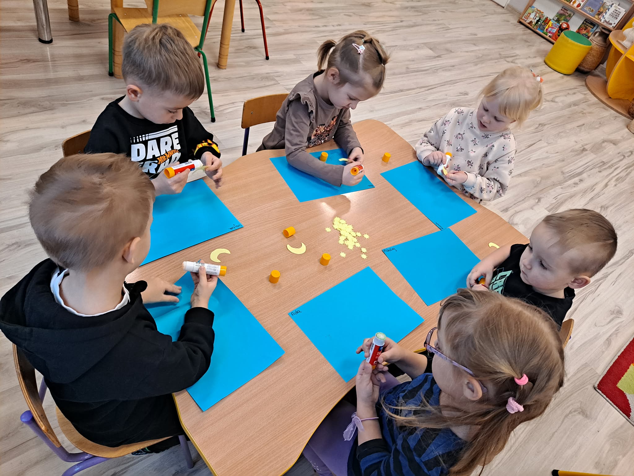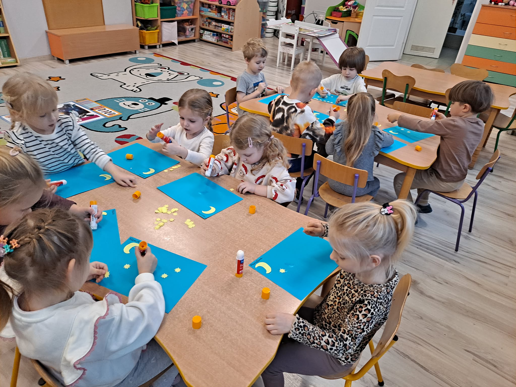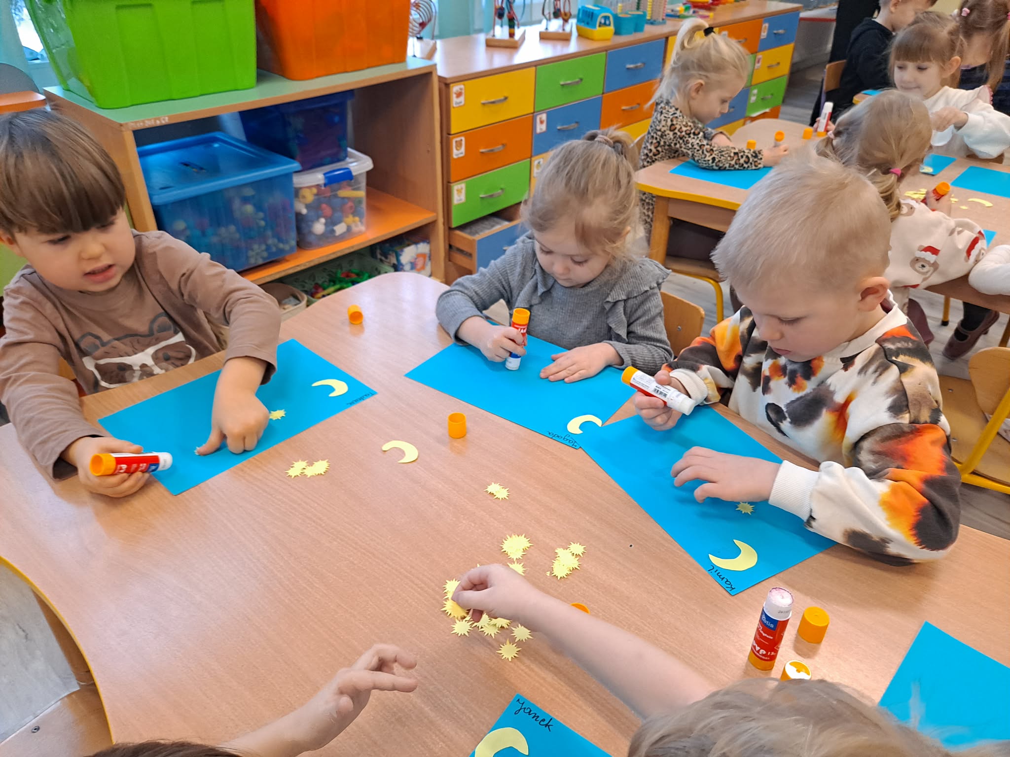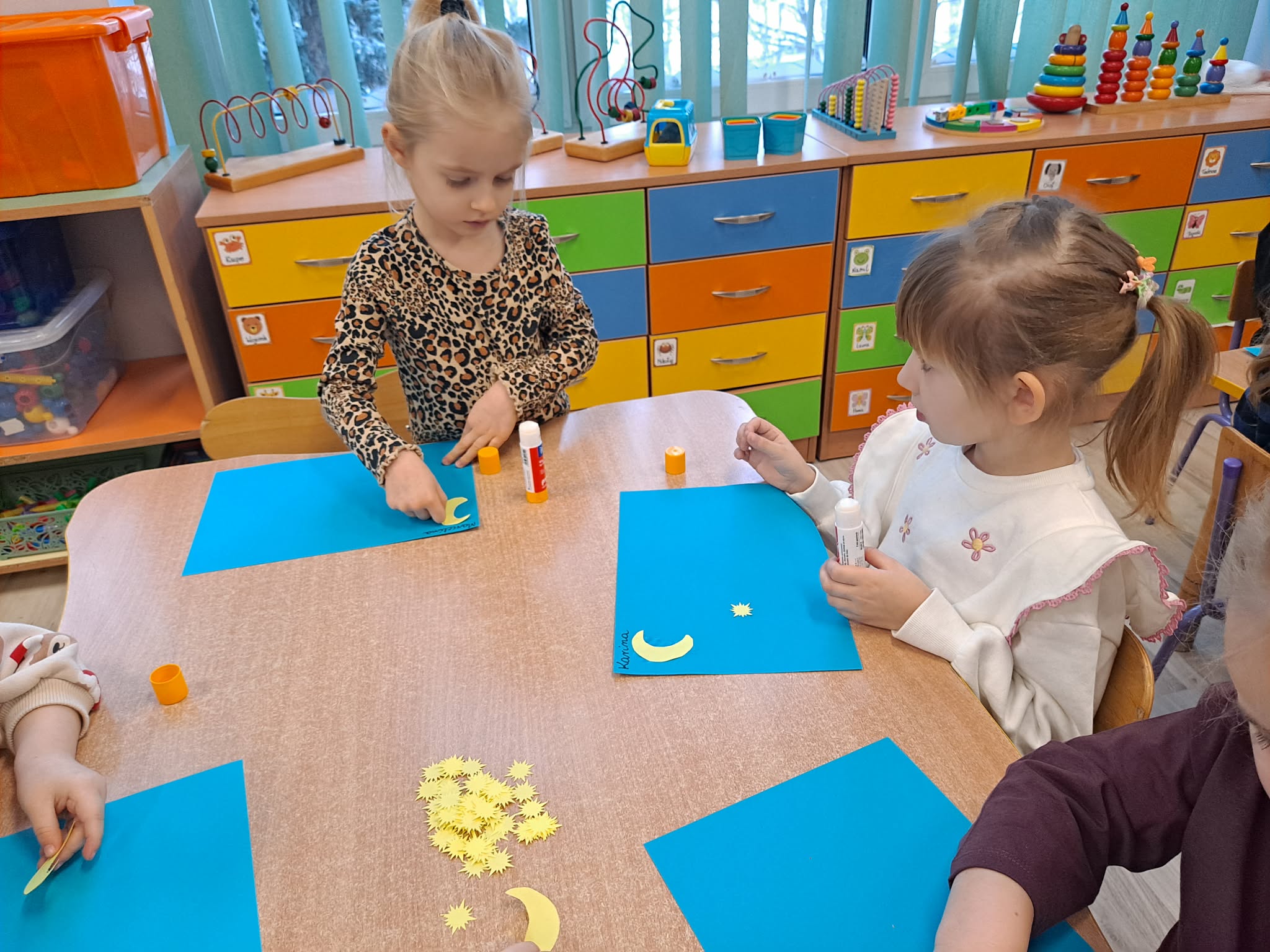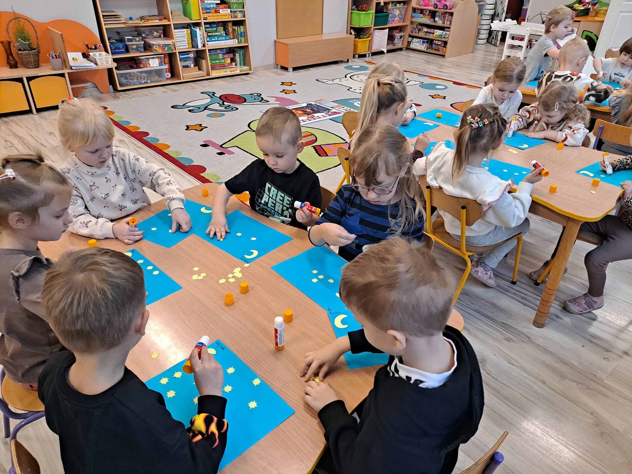 Zwieńczeniem zajęć była praca plastyczna, podczas której dzieci z dużym zaangażowaniem przyklejały gwiazdki oraz księżyc na niebieską kartkę, tworząc własny, niepowtarzalny układ gwiazd.