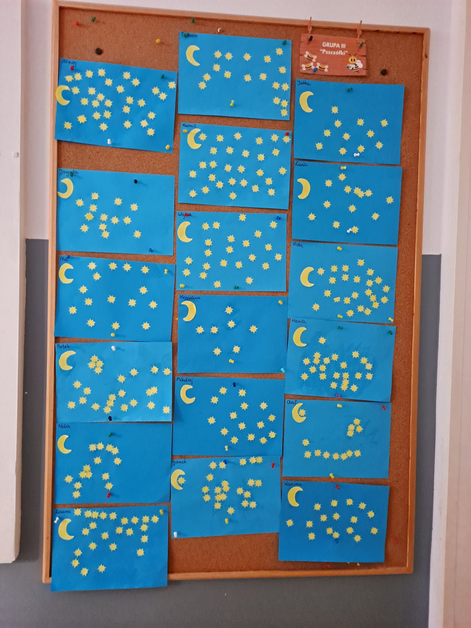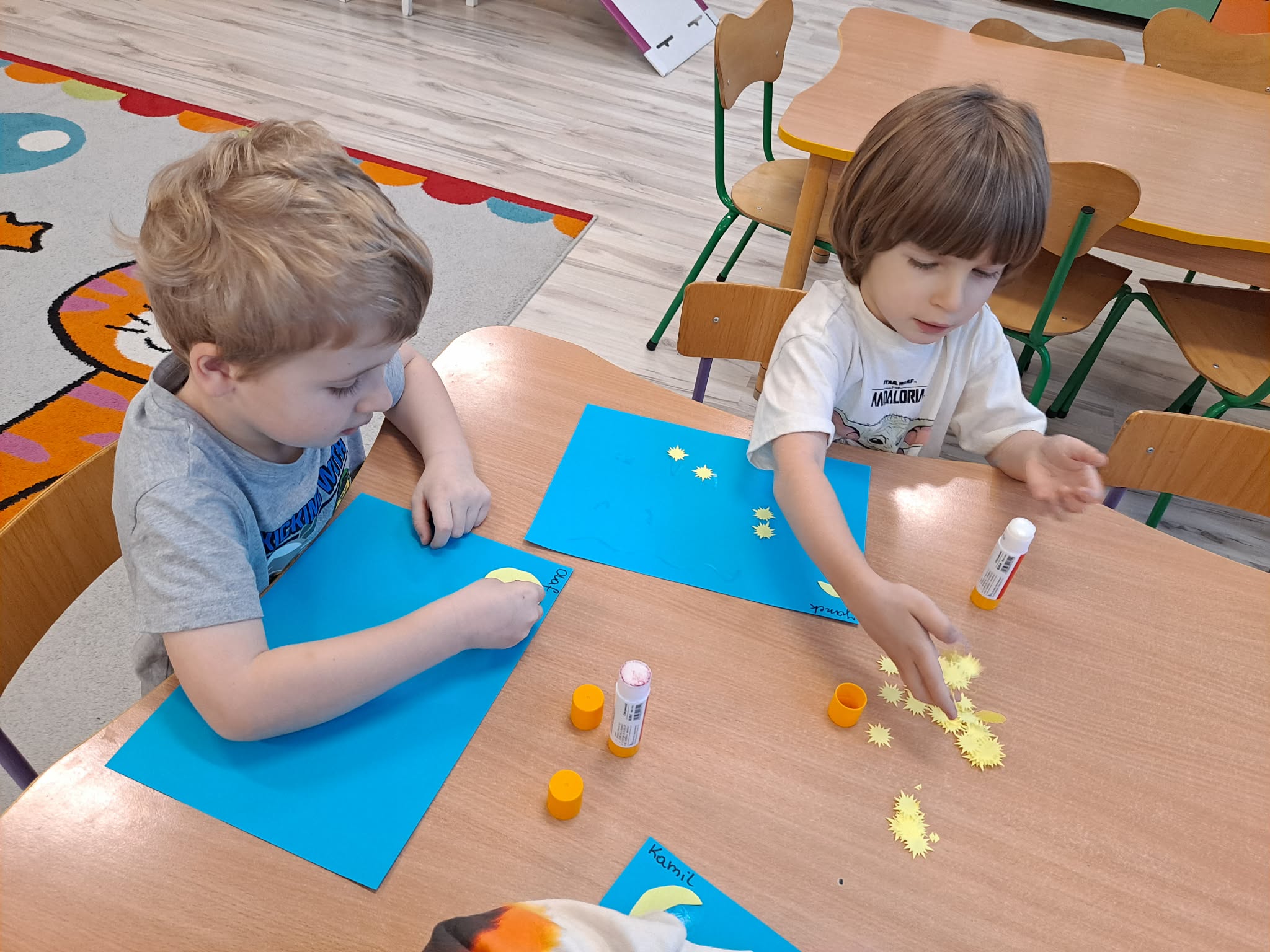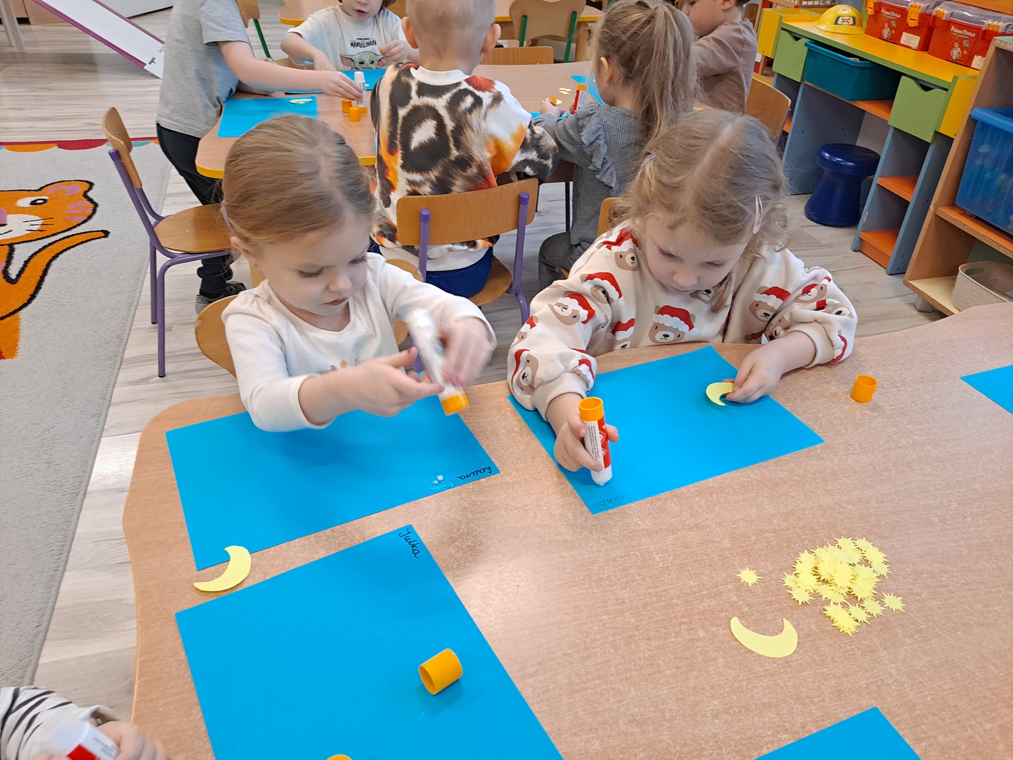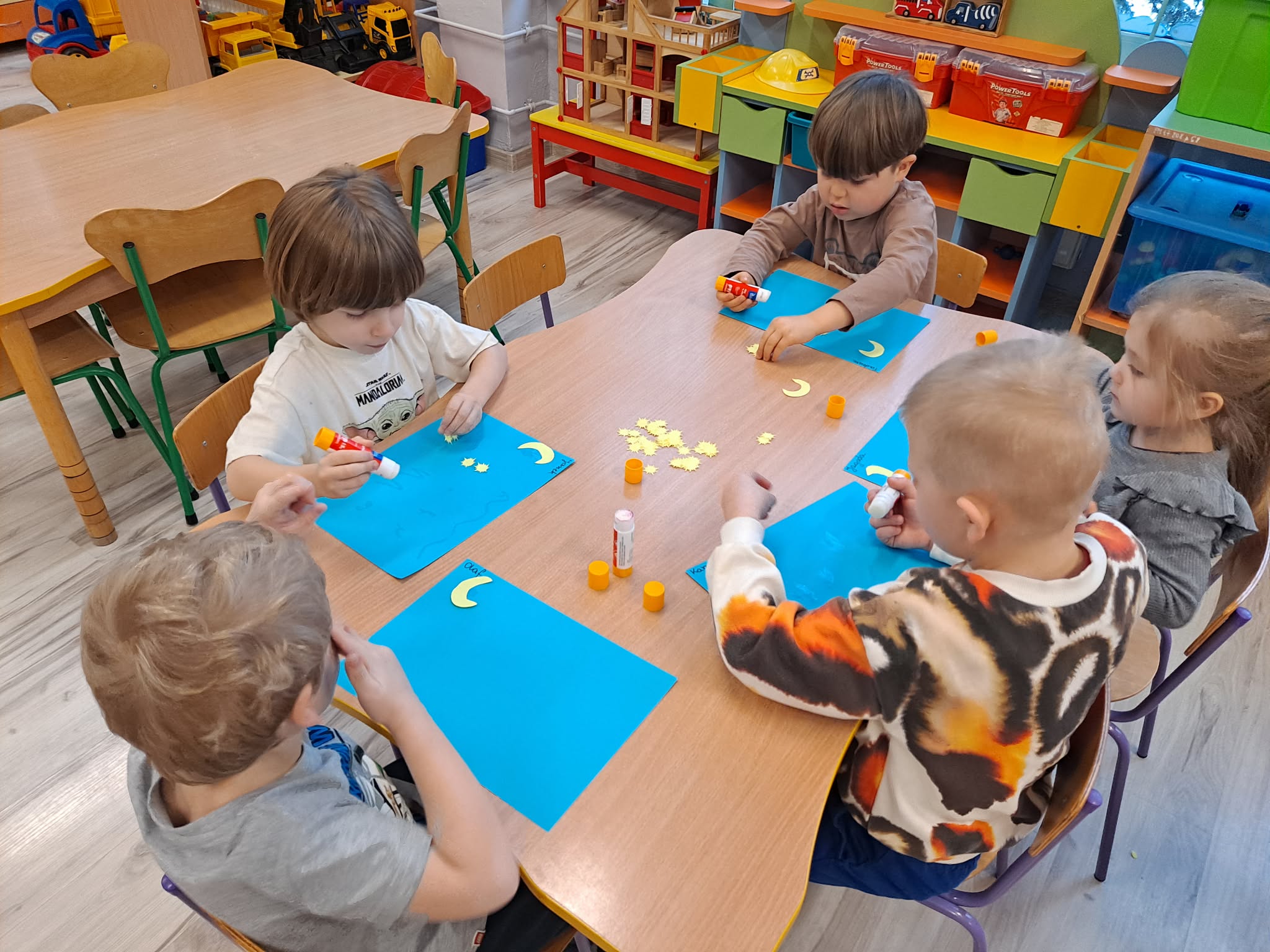 Zwieńczeniem zajęć była praca plastyczna, podczas której dzieci z dużym zaangażowaniem przyklejały gwiazdki oraz księżyc na niebieską kartkę, tworząc własny, niepowtarzalny układ gwiazd.
