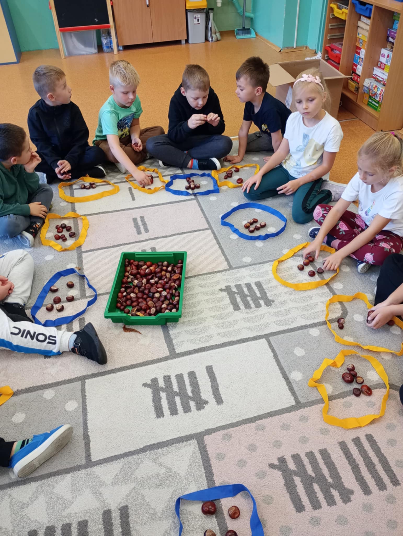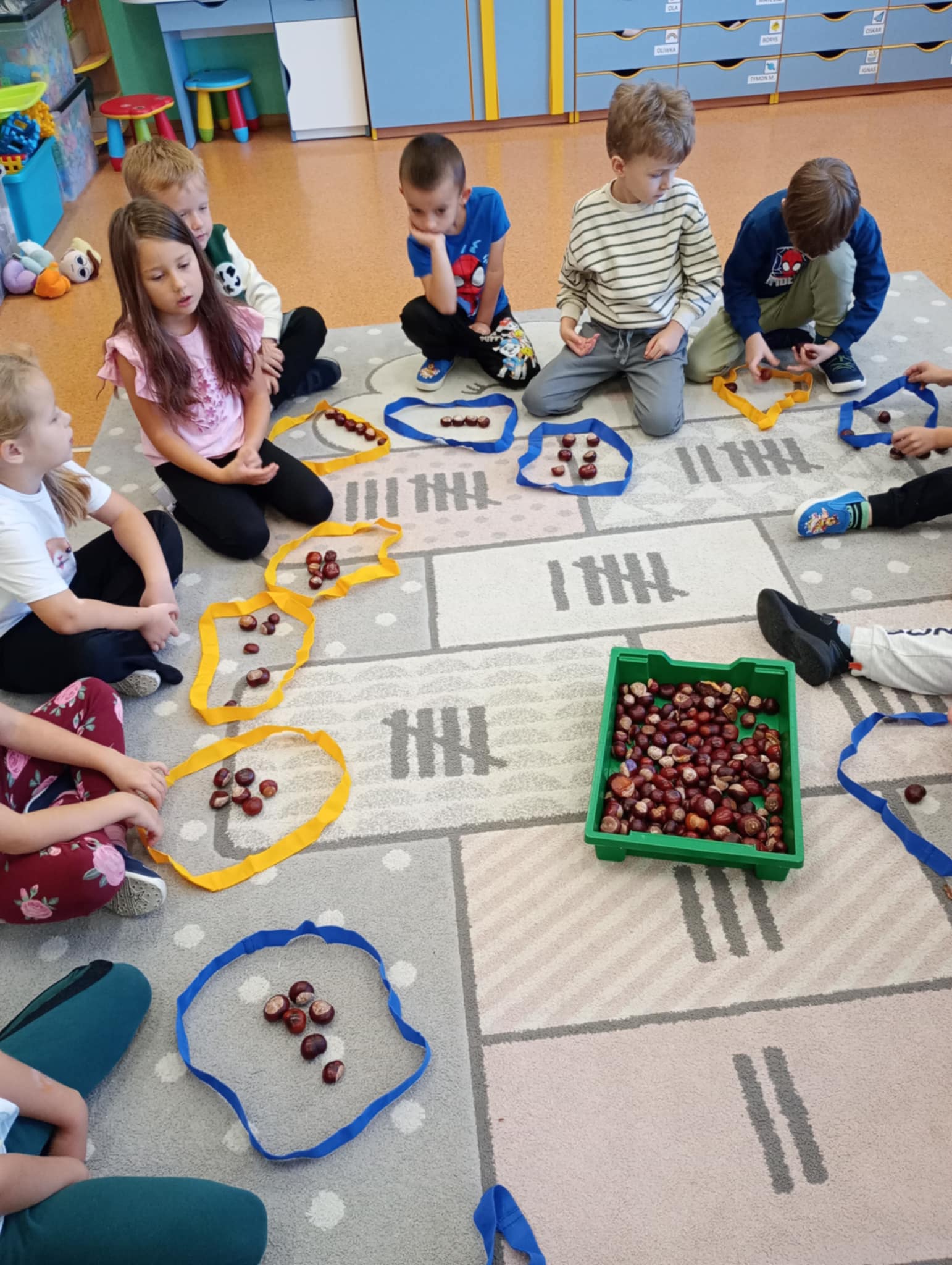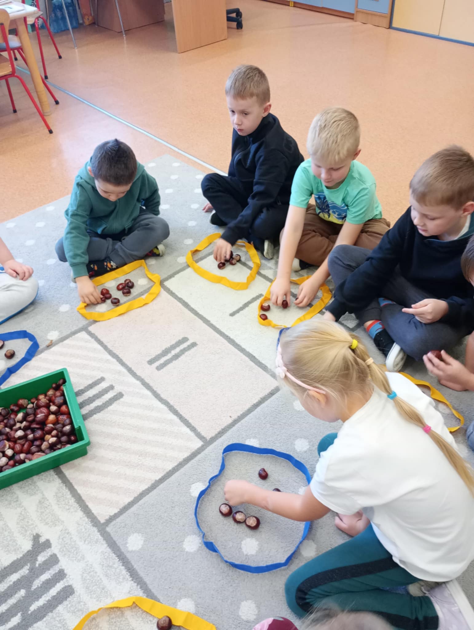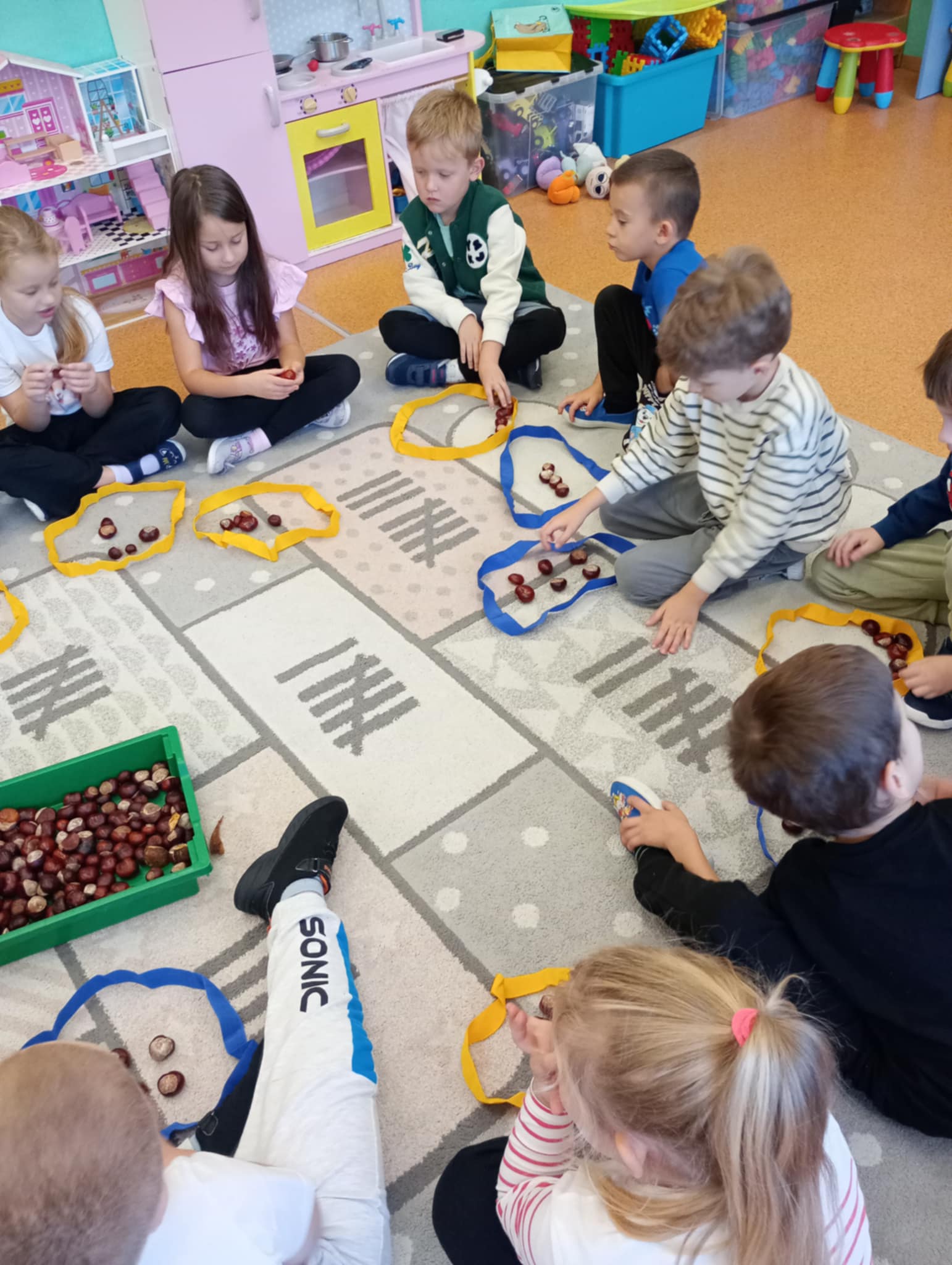 Dzieci podczas zabawy matematycznej wykorzystywały kasztany do tworzenia zbiorów. Przeliczały liczebnikami głównymi oraz zapoznały się z obrazem graficznym liczby 3, cyfry 3.