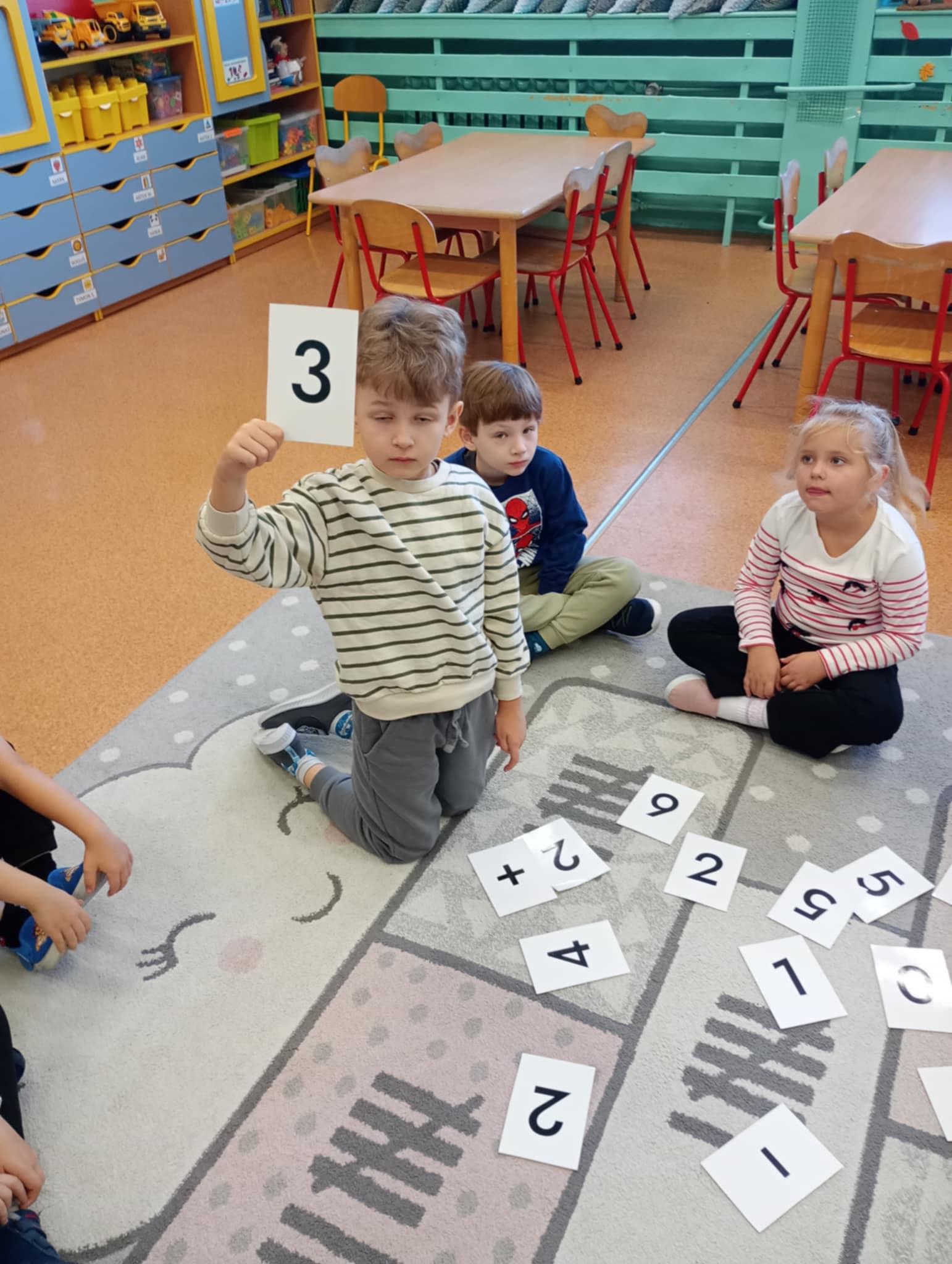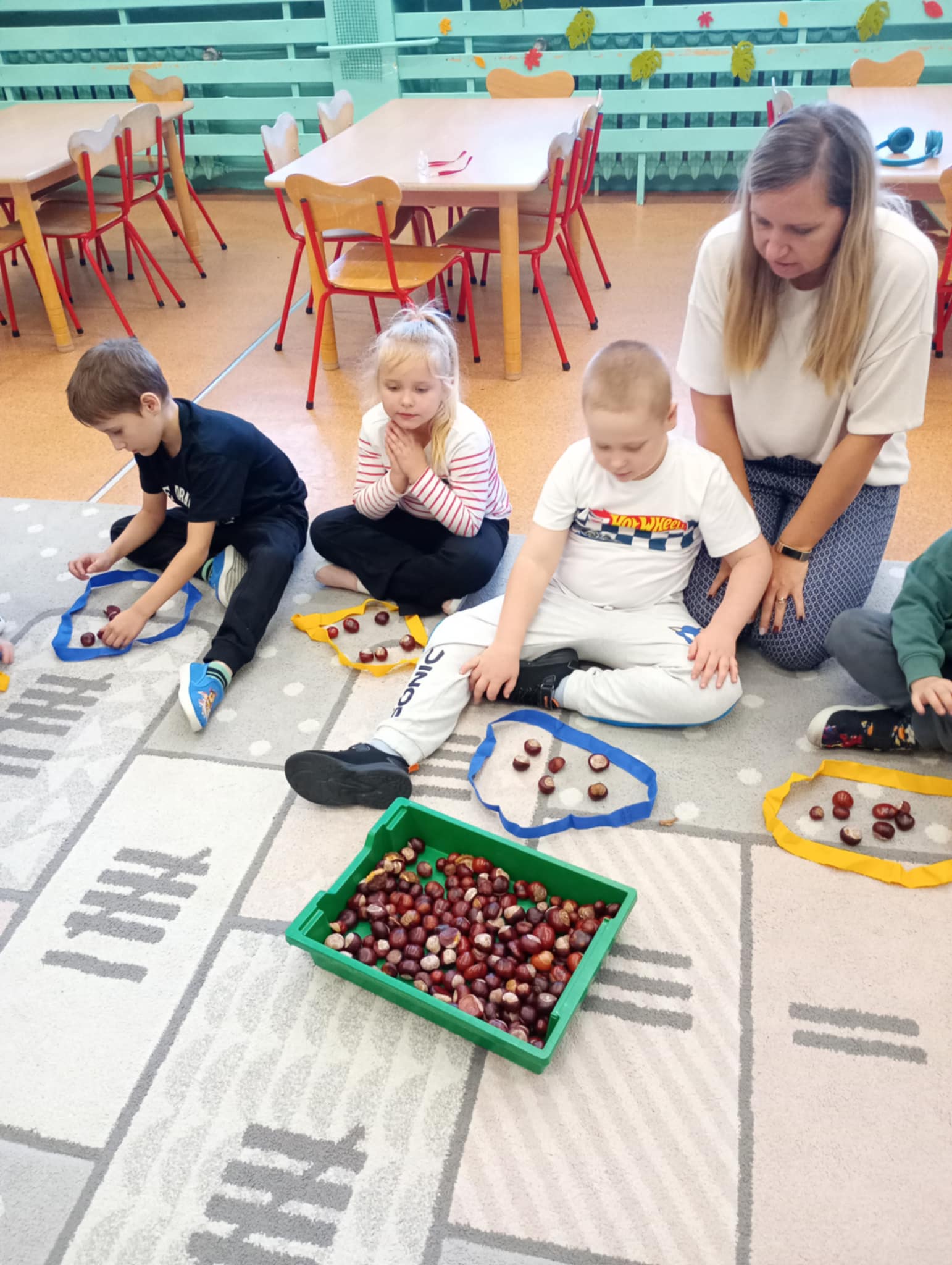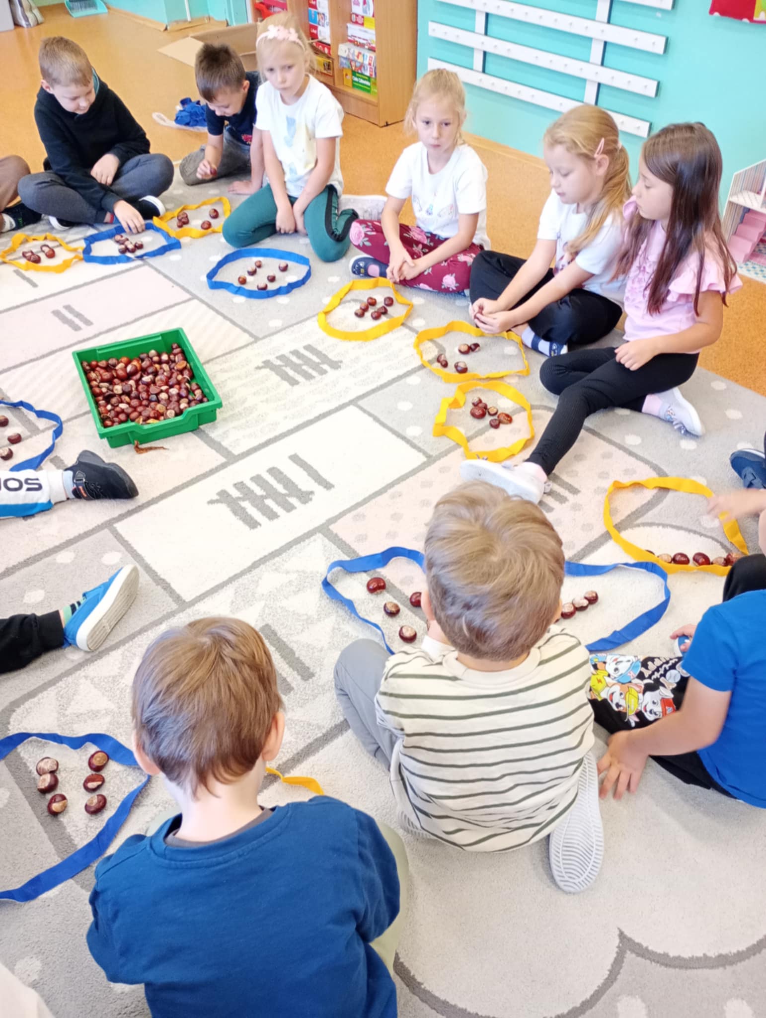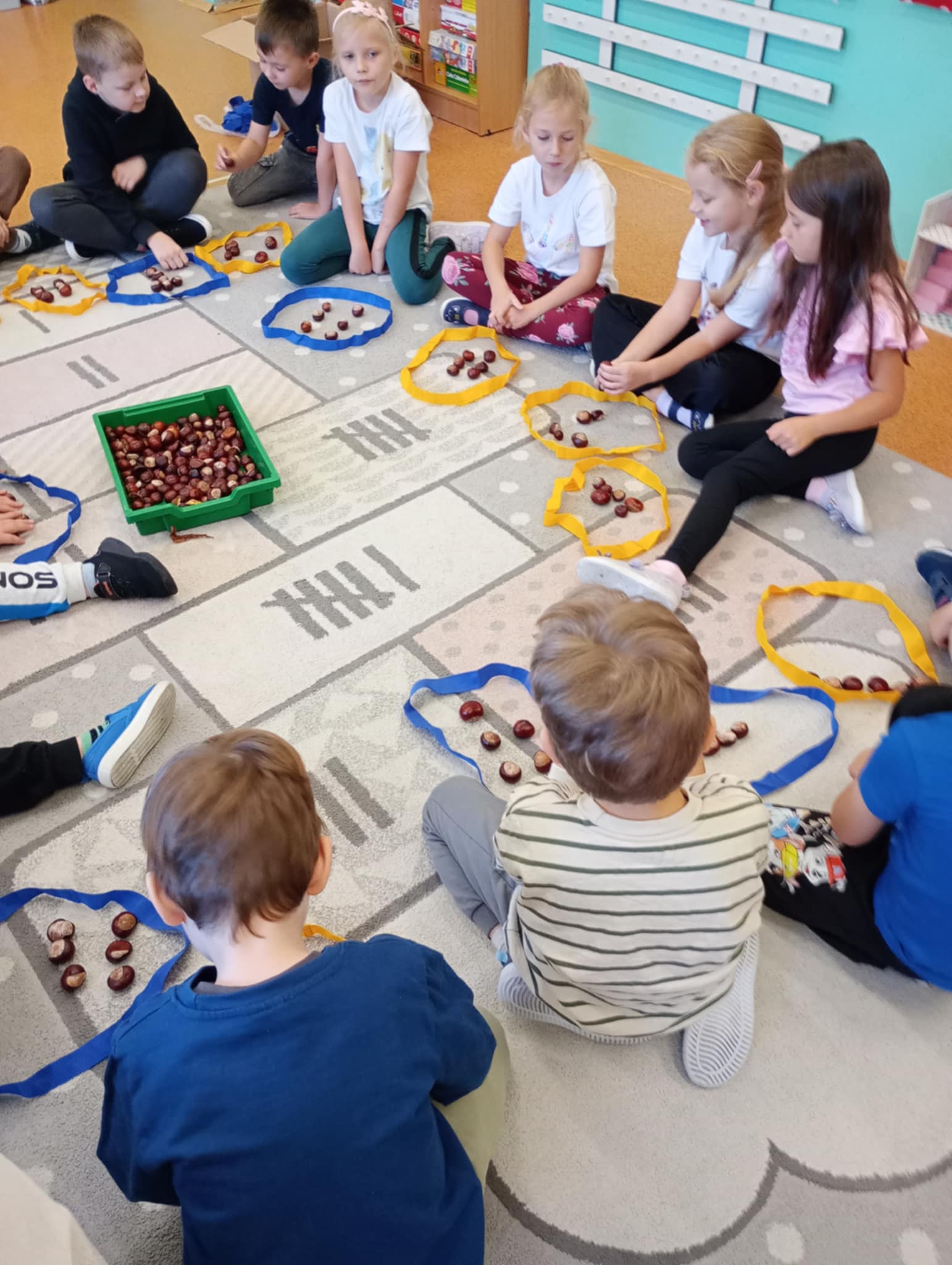 Dzieci podczas zabawy matematycznej wykorzystywały kasztany do tworzenia zbiorów. Przeliczały liczebnikami głównymi oraz zapoznały się z obrazem graficznym liczby 3, cyfry 3.