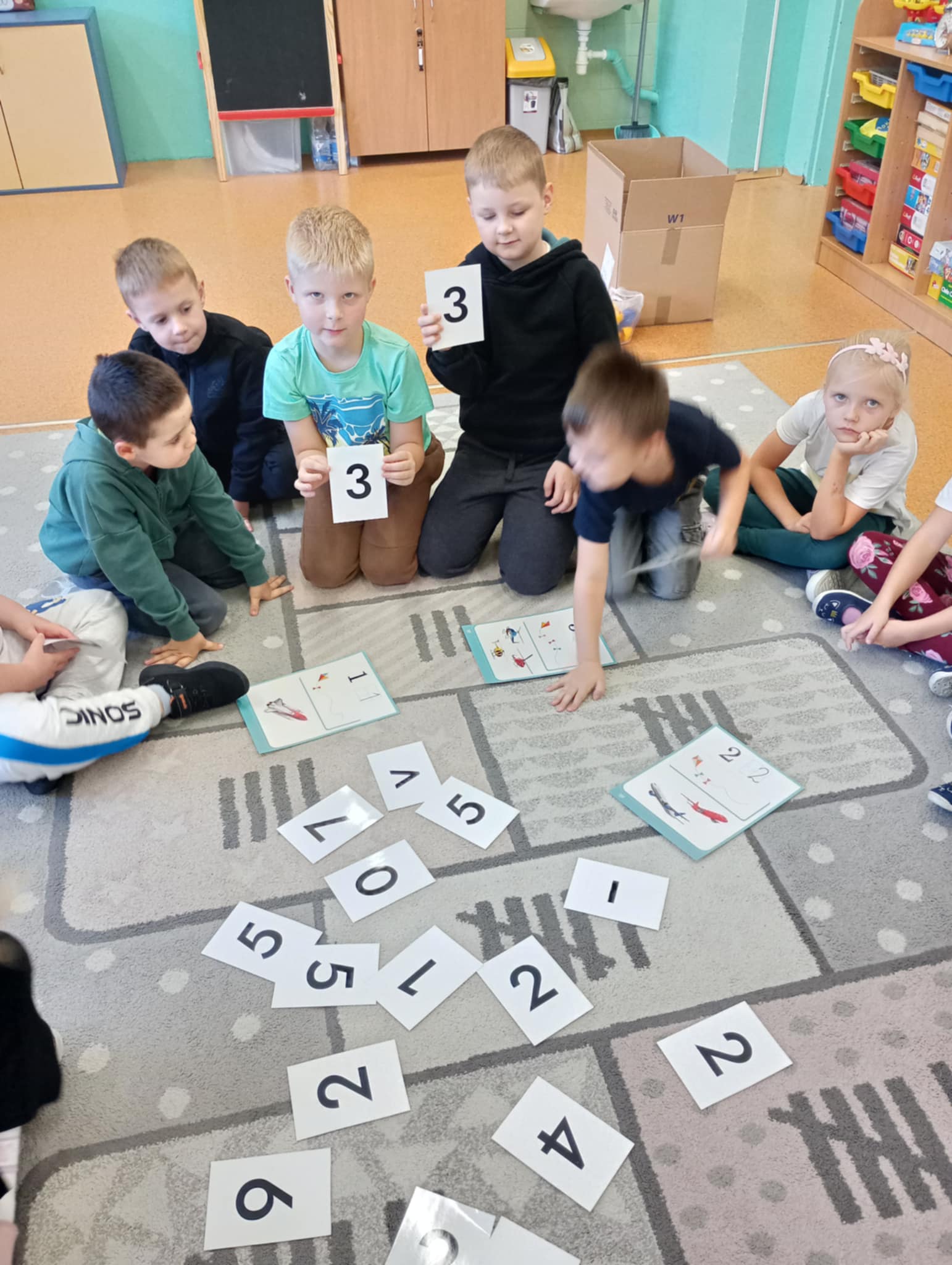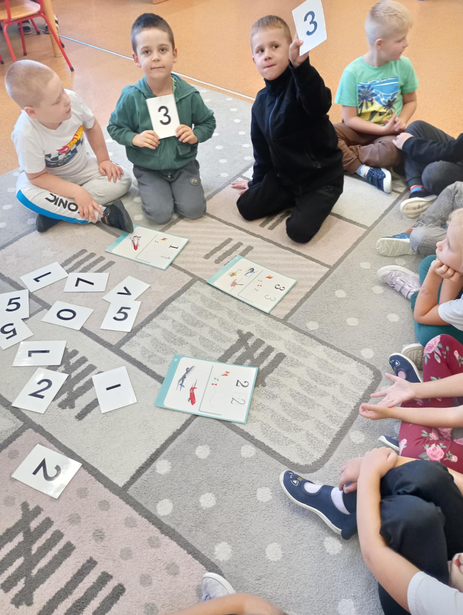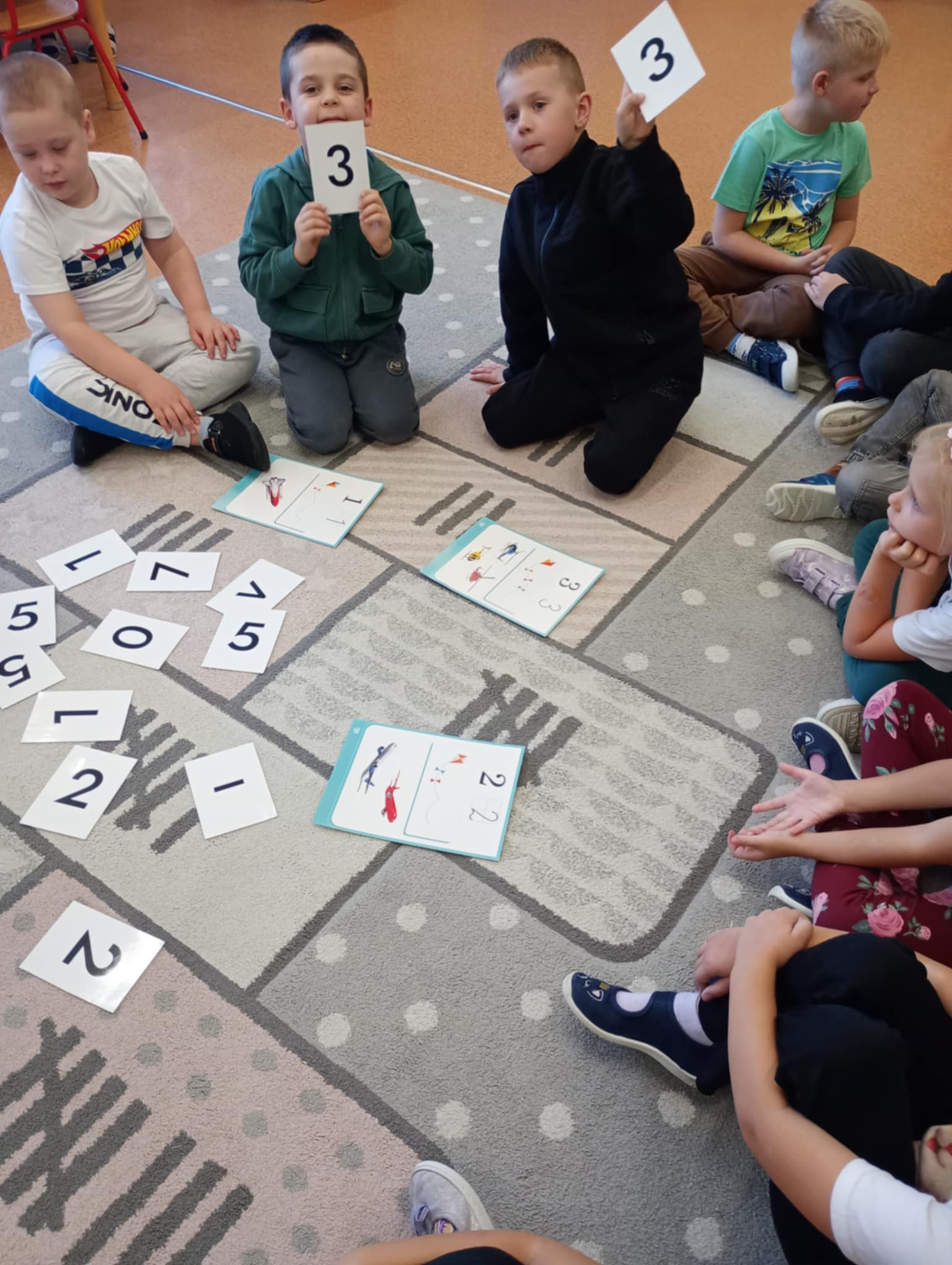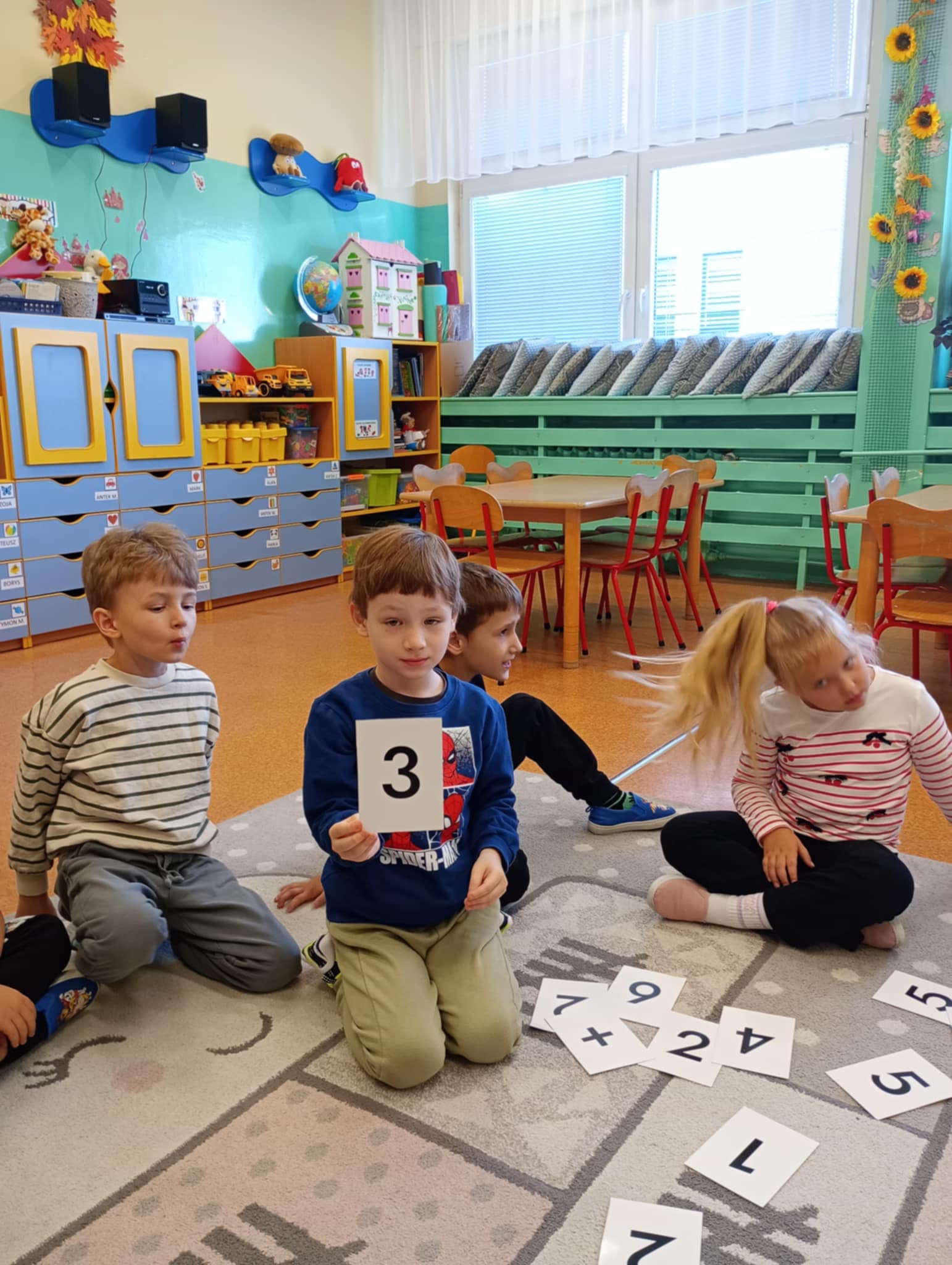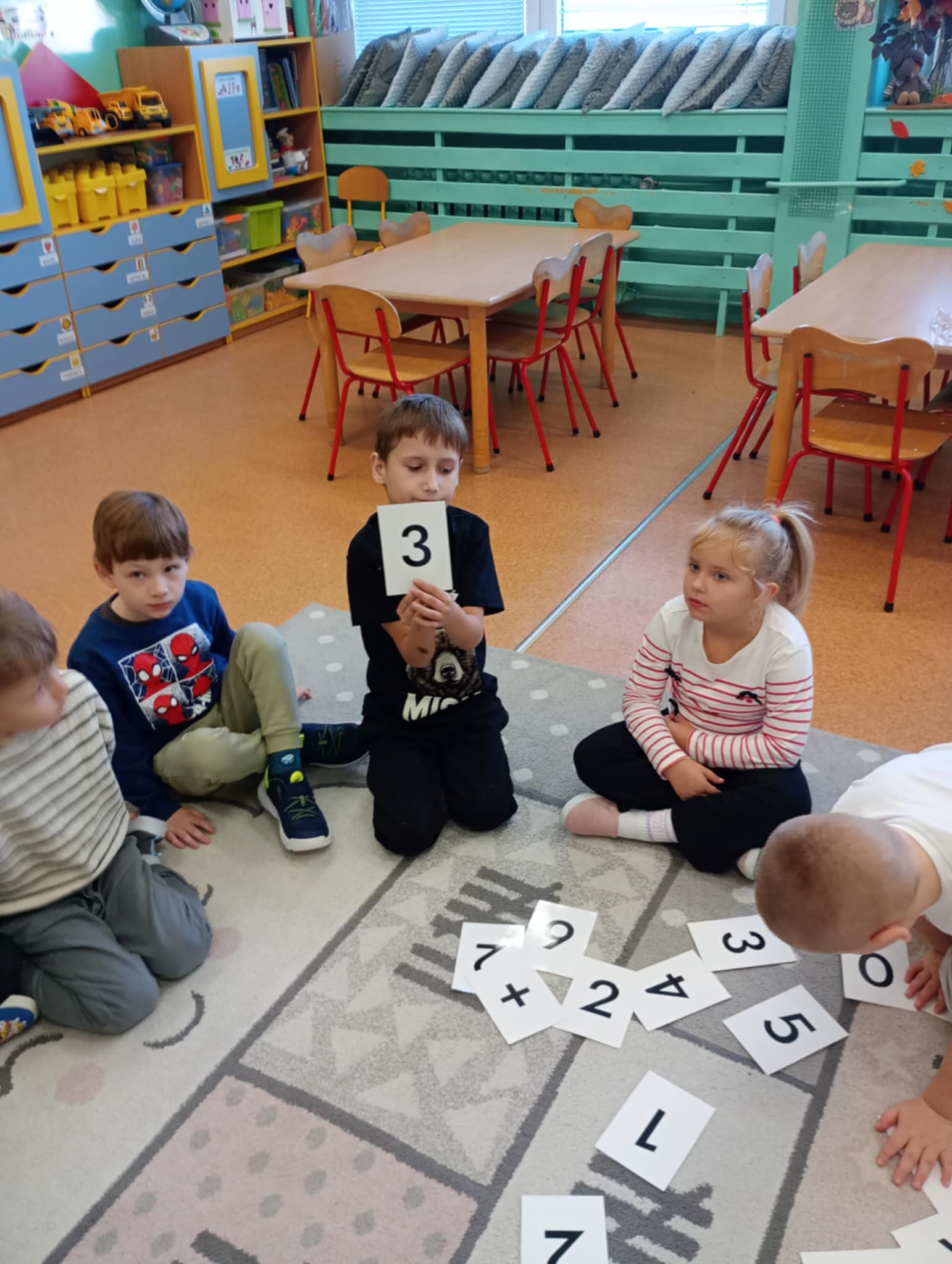 Dzieci podczas zabawy matematycznej wykorzystywały kasztany do tworzenia zbiorów. Przeliczały liczebnikami głównymi oraz zapoznały się z obrazem graficznym liczby 3, cyfry 3.