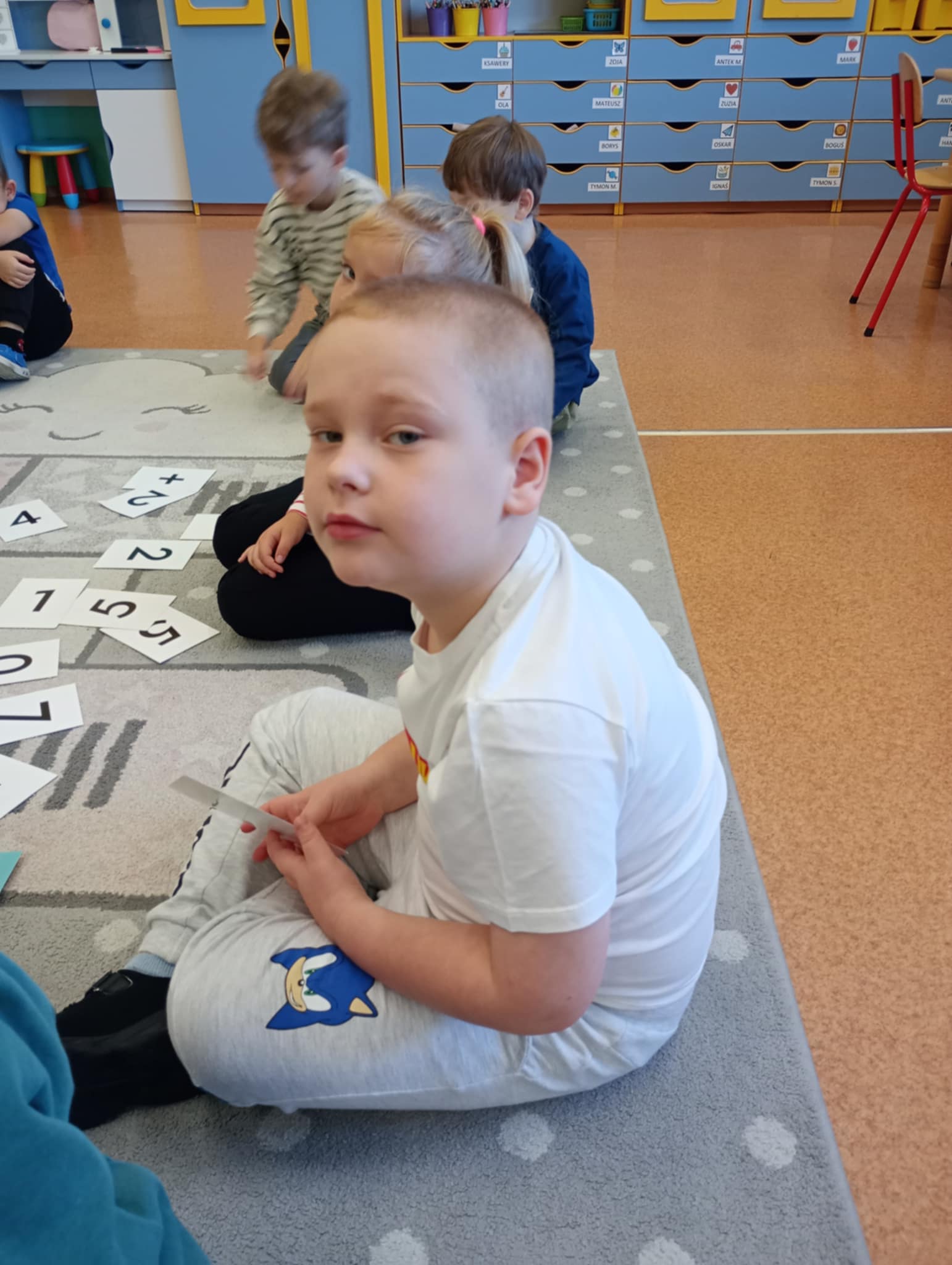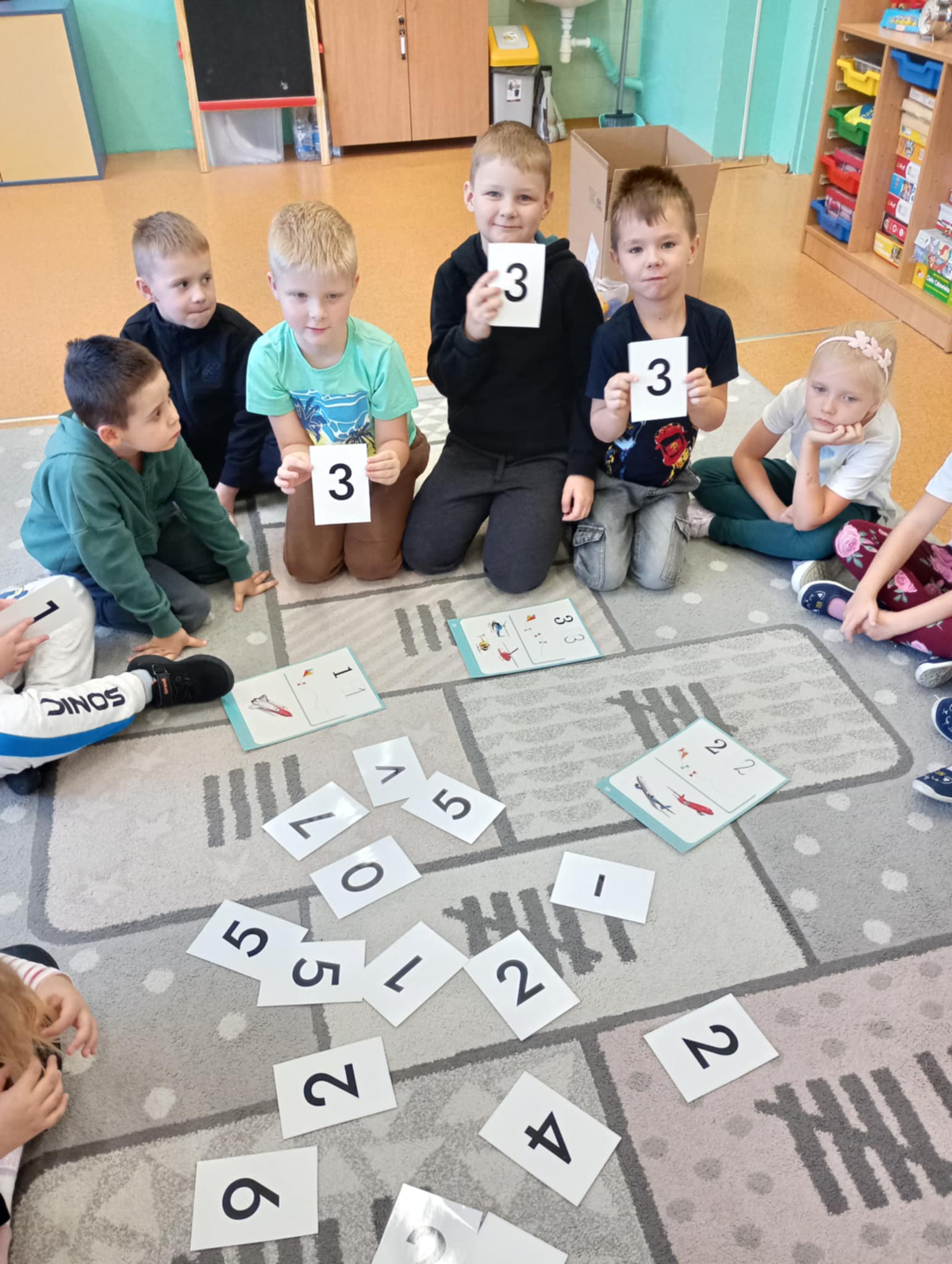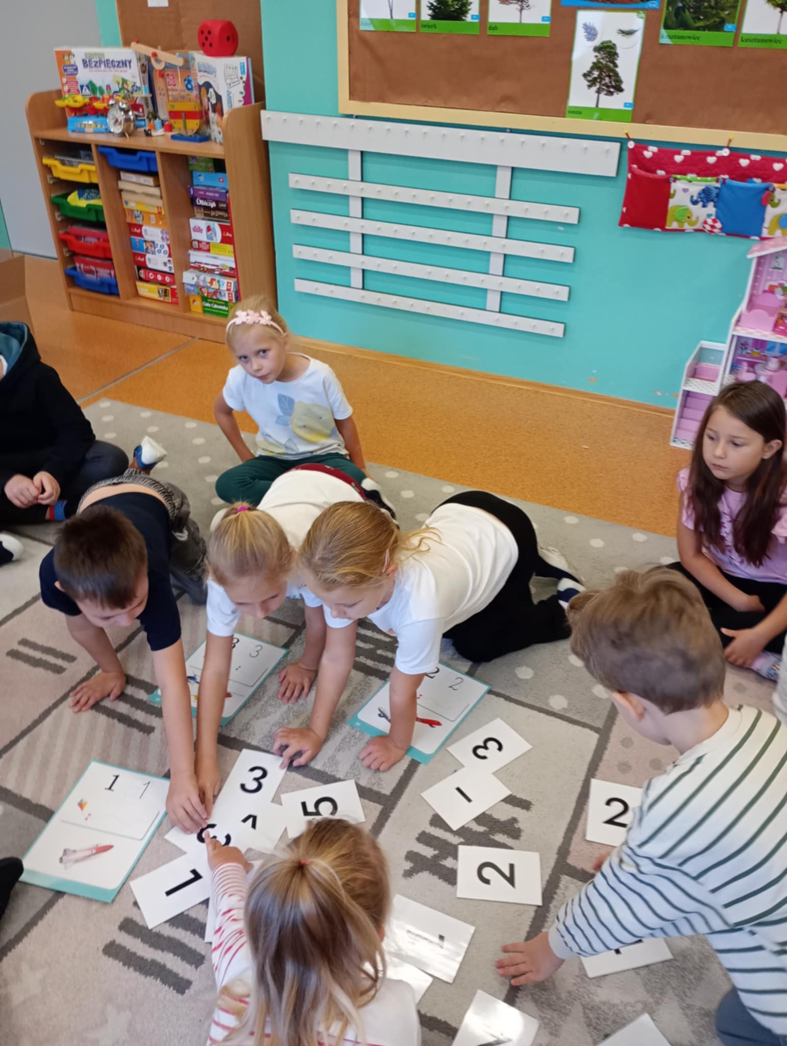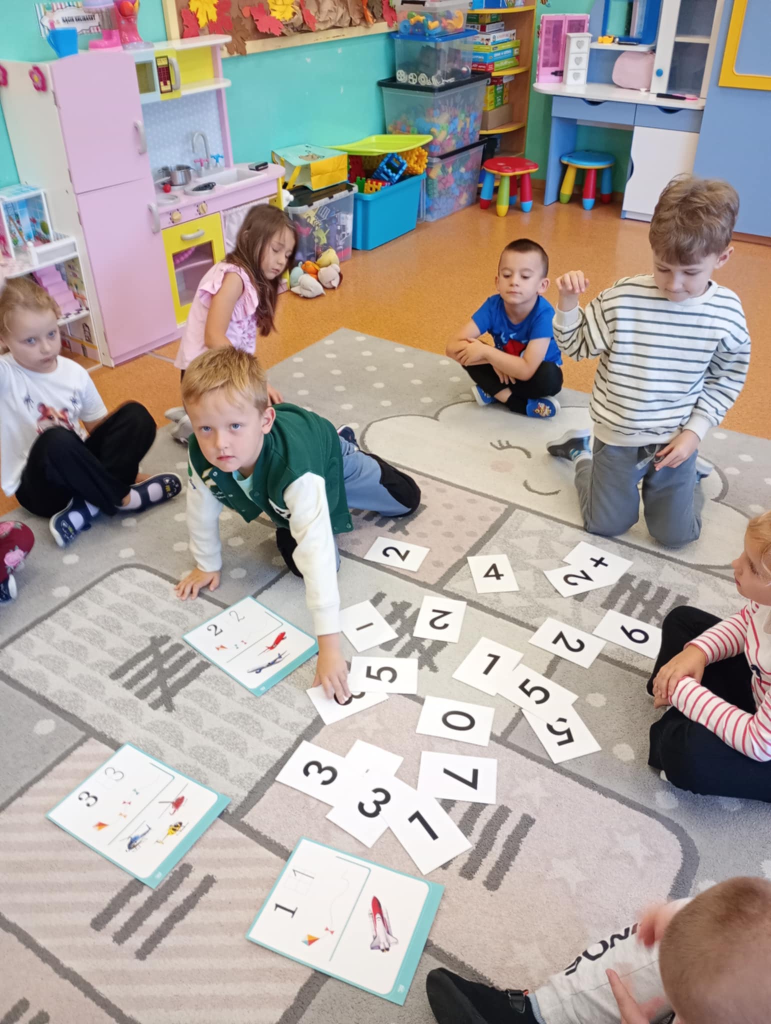 Dzieci podczas zabawy matematycznej wykorzystywały kasztany do tworzenia zbiorów. Przeliczały liczebnikami głównymi oraz zapoznały się z obrazem graficznym liczby 3, cyfry 3.