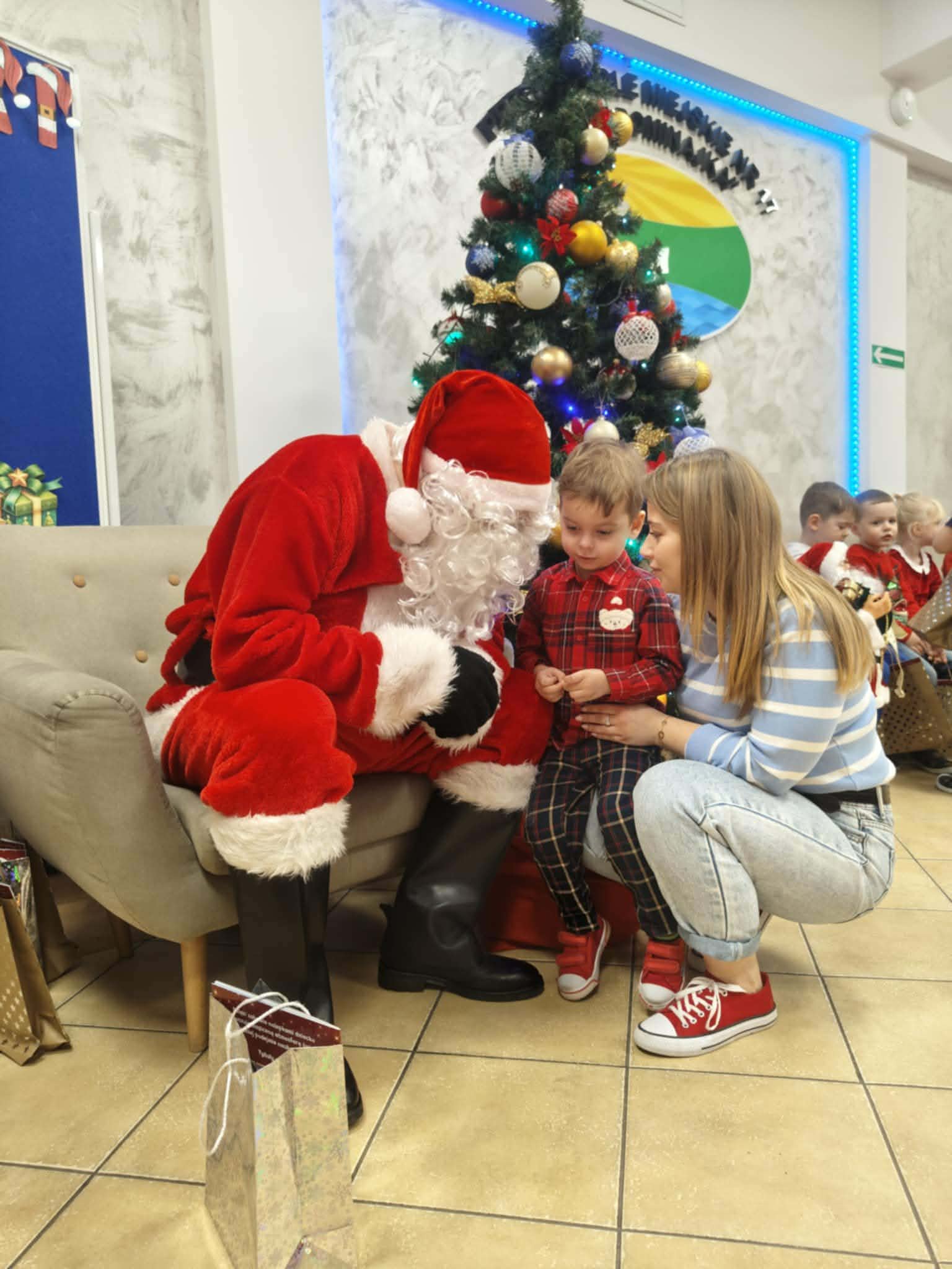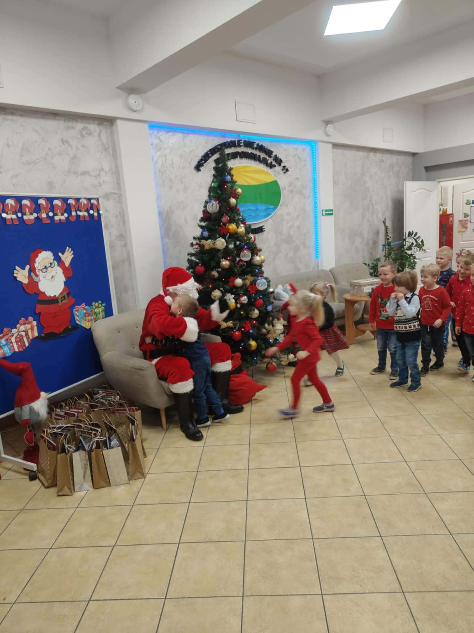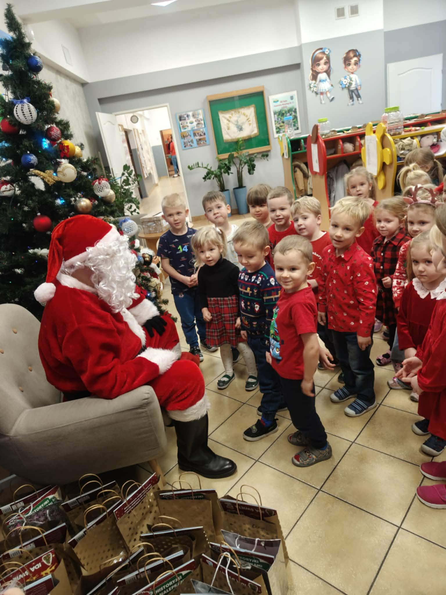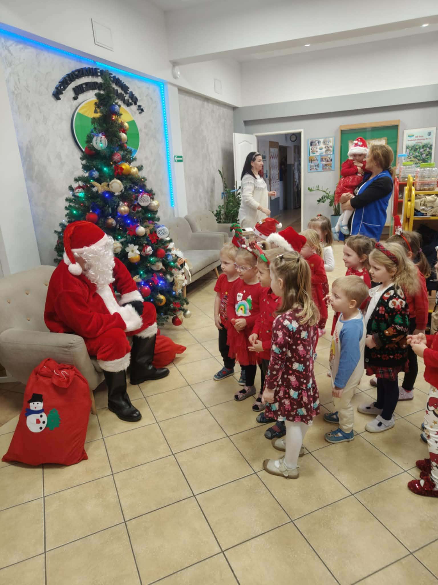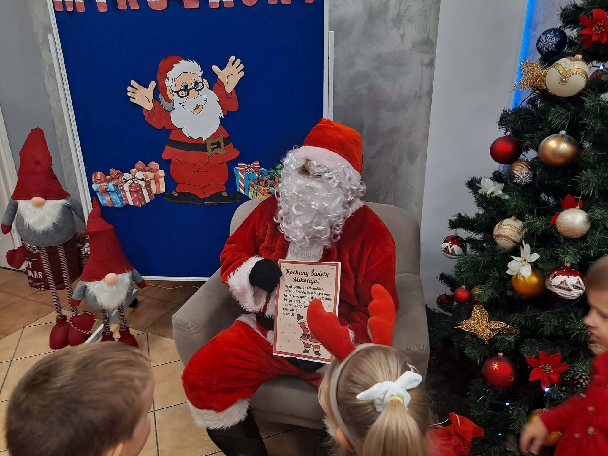 Zasiadł w holu, tuż obok pięknie przystrojonej choinki, gdzie w świątecznej atmosferze czekał na wszystkie przedszkolne grupy. Każde dziecko mogło podejść, serdecznie się przywitać, chwilę porozmawiać z Mikołajem oraz odebrać wyjątkowy prezent. Radość, zaciekawienie i świąteczny nastrój wypełniły cały budynek.