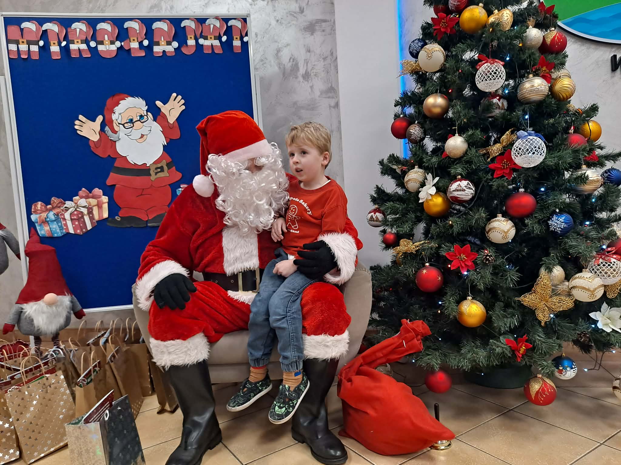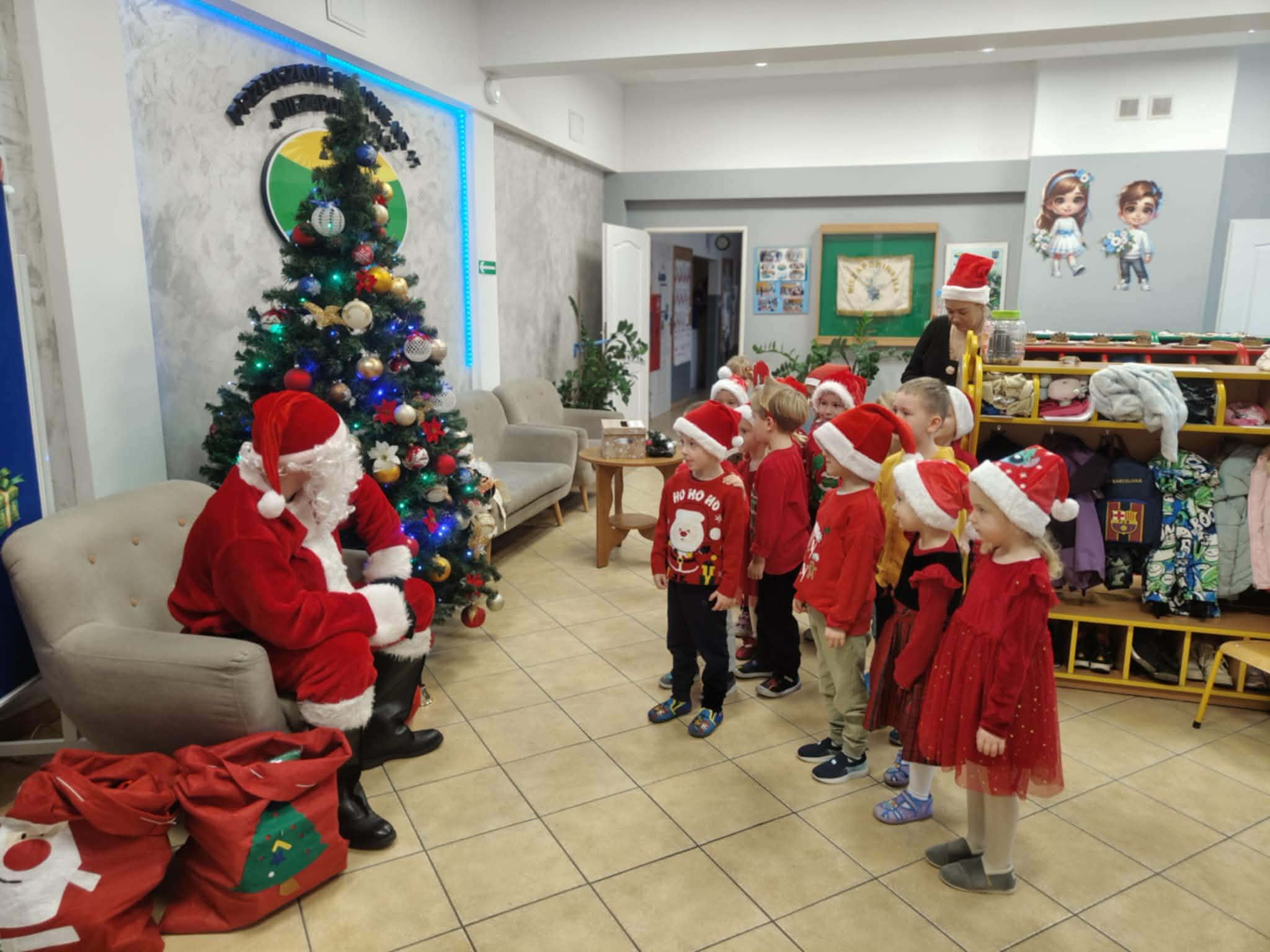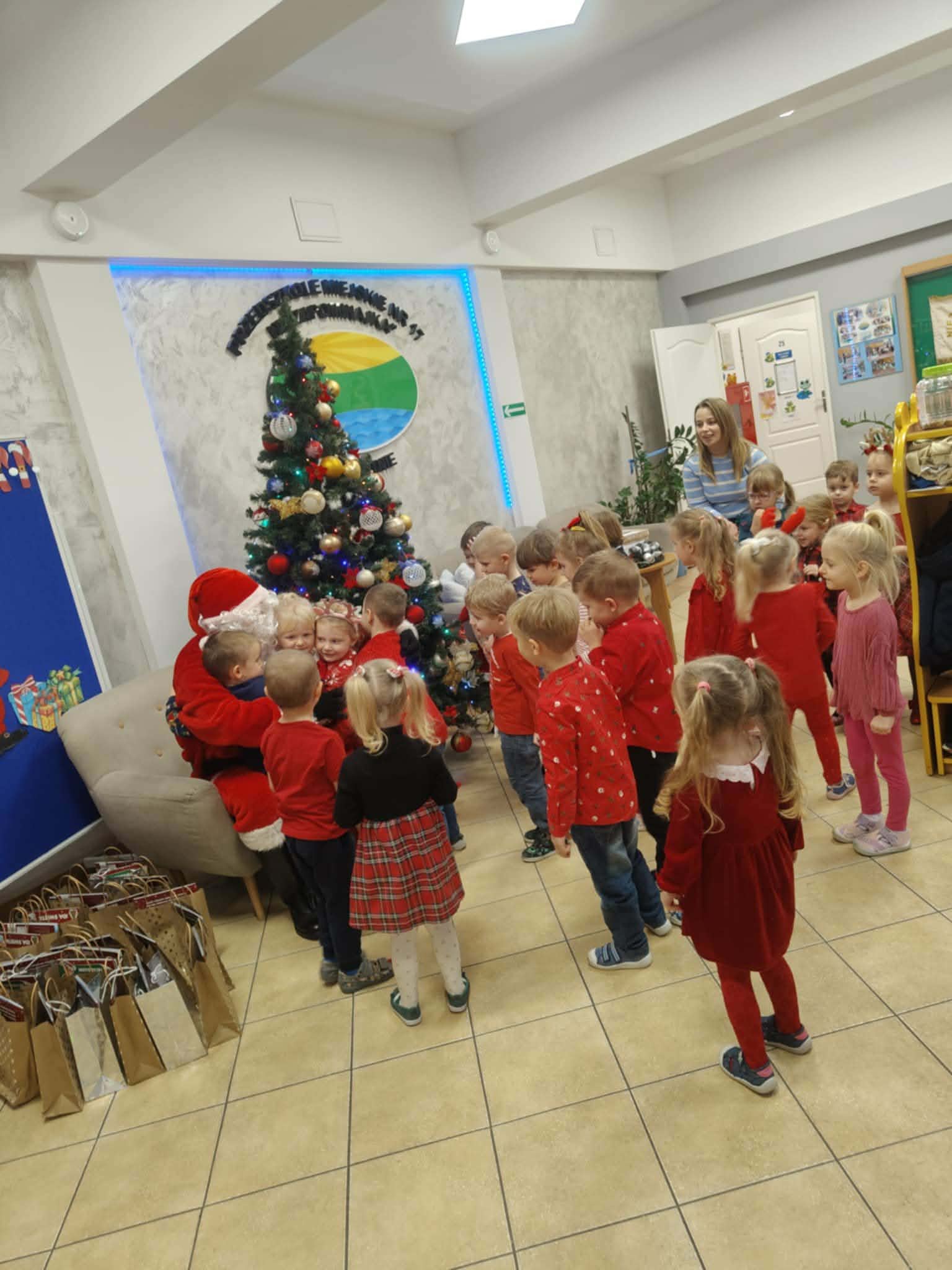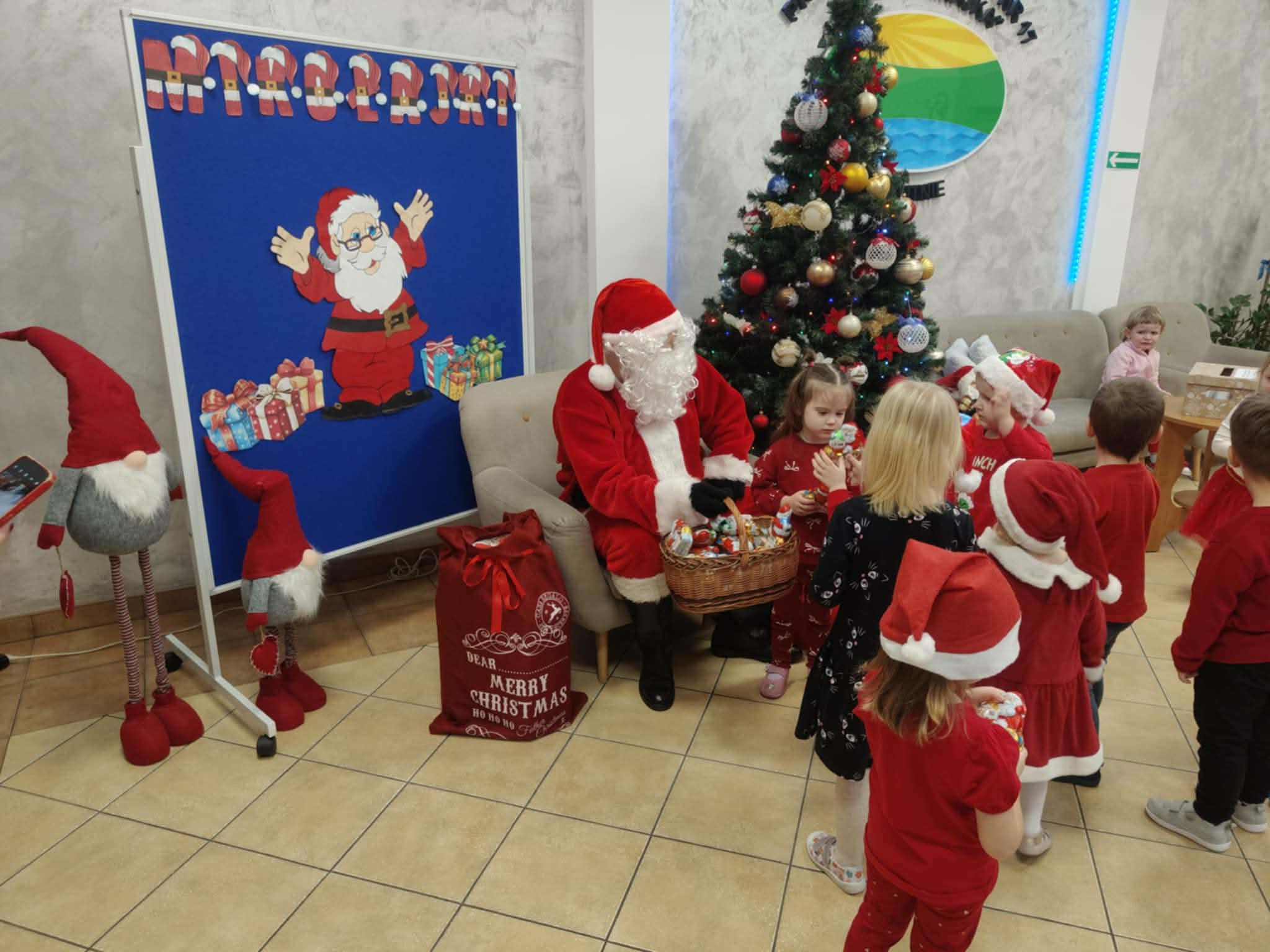 Zasiadł w holu, tuż obok pięknie przystrojonej choinki, gdzie w świątecznej atmosferze czekał na wszystkie przedszkolne grupy. Każde dziecko mogło podejść, serdecznie się przywitać, chwilę porozmawiać z Mikołajem oraz odebrać wyjątkowy prezent. Radość, zaciekawienie i świąteczny nastrój wypełniły cały budynek.